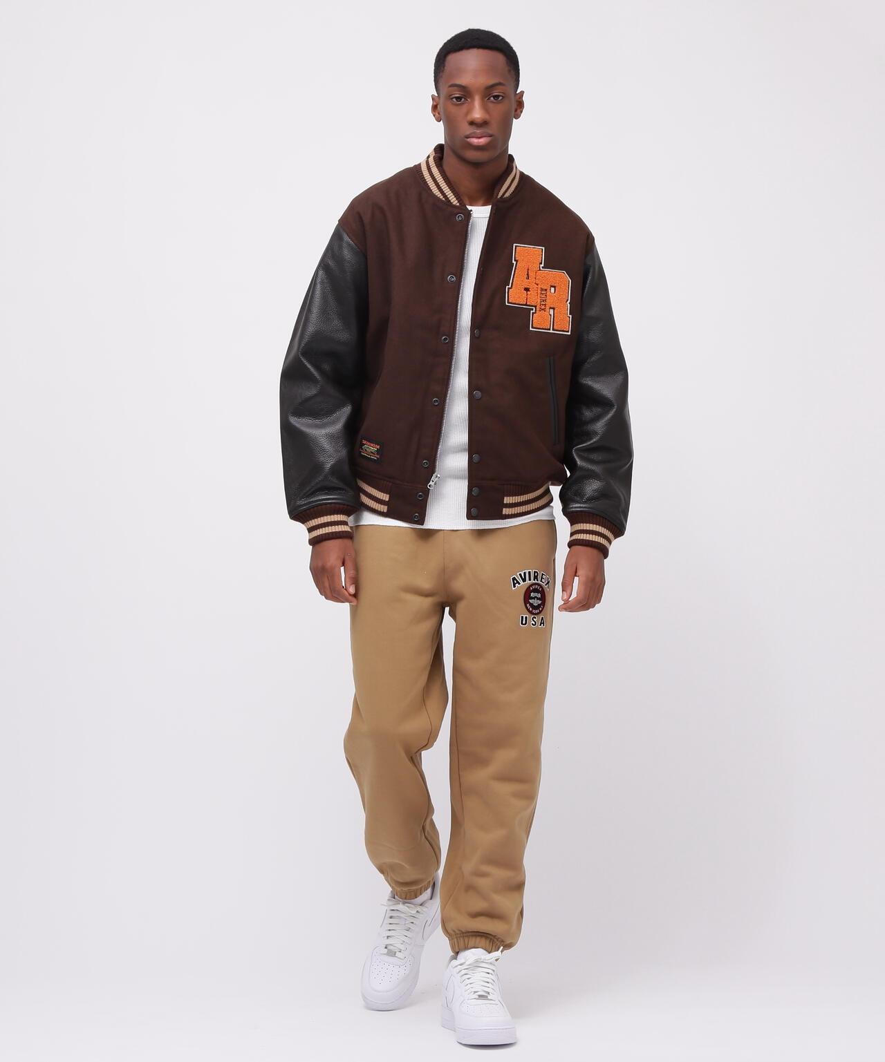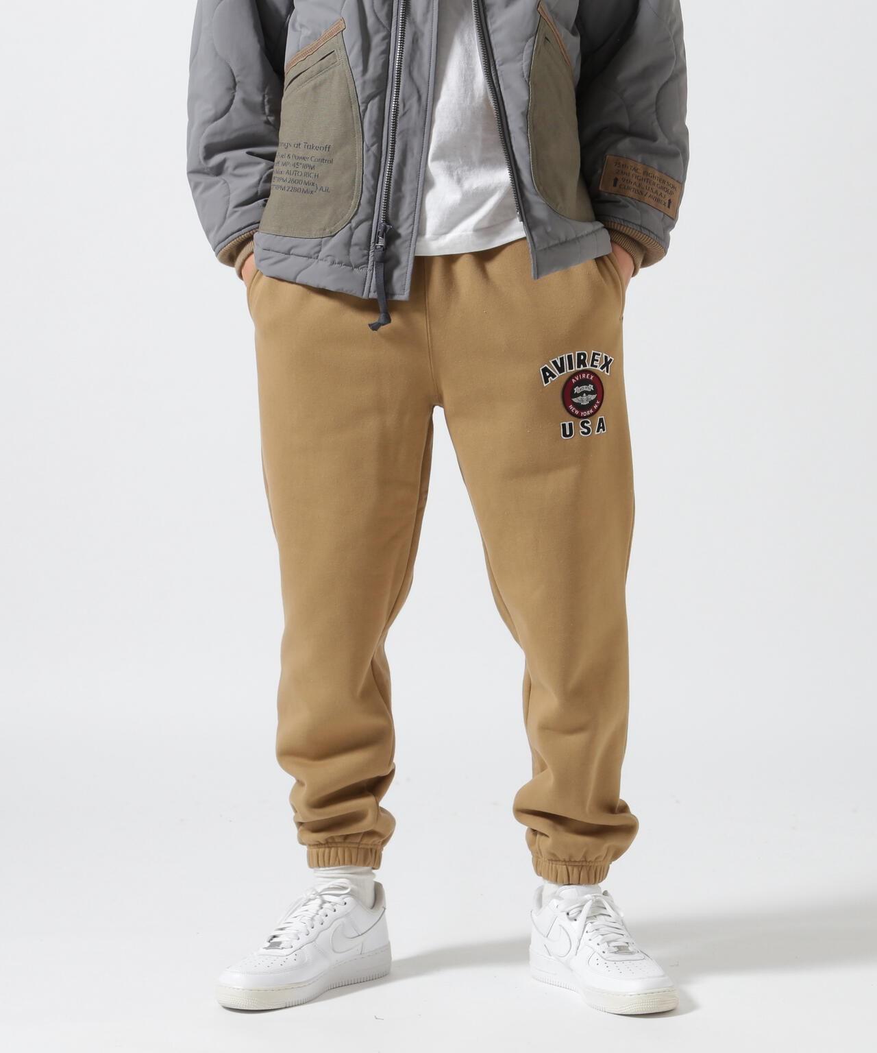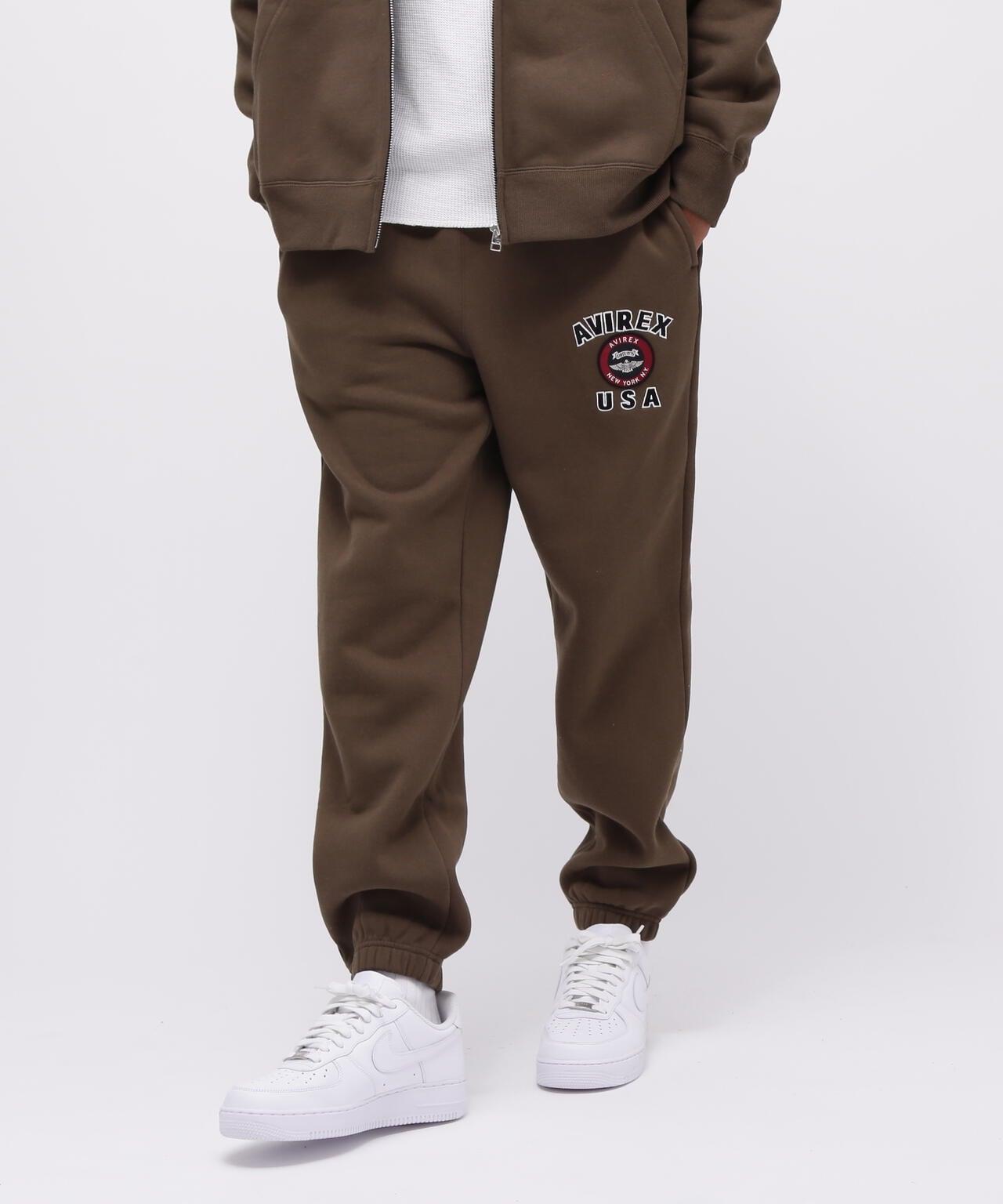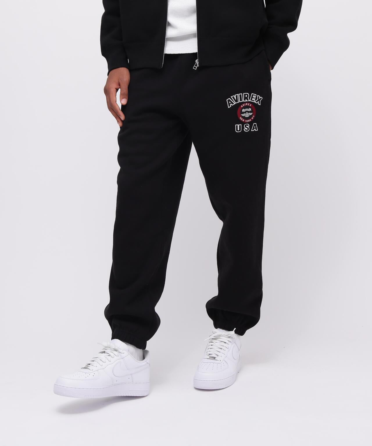 AVIREX VARSITY "是一個以 "美好的老美 "為主題的運動系列,其獨特的色彩和原創的圖案設計受到以 HIPHOP 圈為主的當紅藝術家和運動員的青睞。在美國,它已發展成為年輕人的時尚品牌。AVIREX VARSITY 服裝經典而不褪色,不分性別和國籍,繼續受到所有崇尚美國英雄精神的人們的支持。<產品詳情> - 厚度適中,65% 棉,35% 滌綸面料運動褲,左前方繡有標誌性品牌徽標,黑色,駝色。