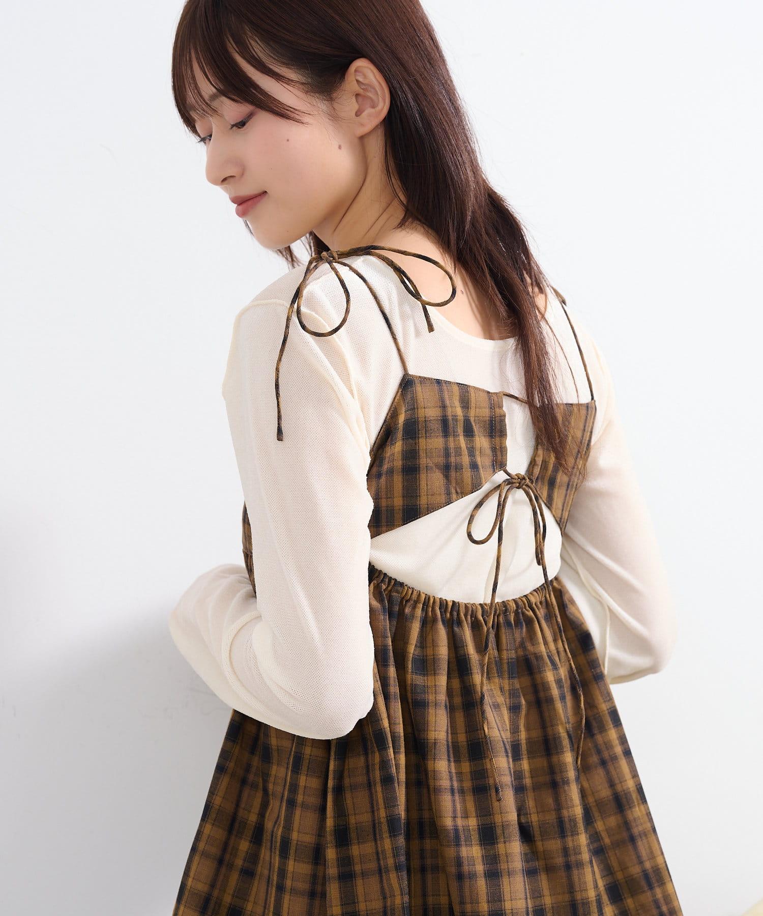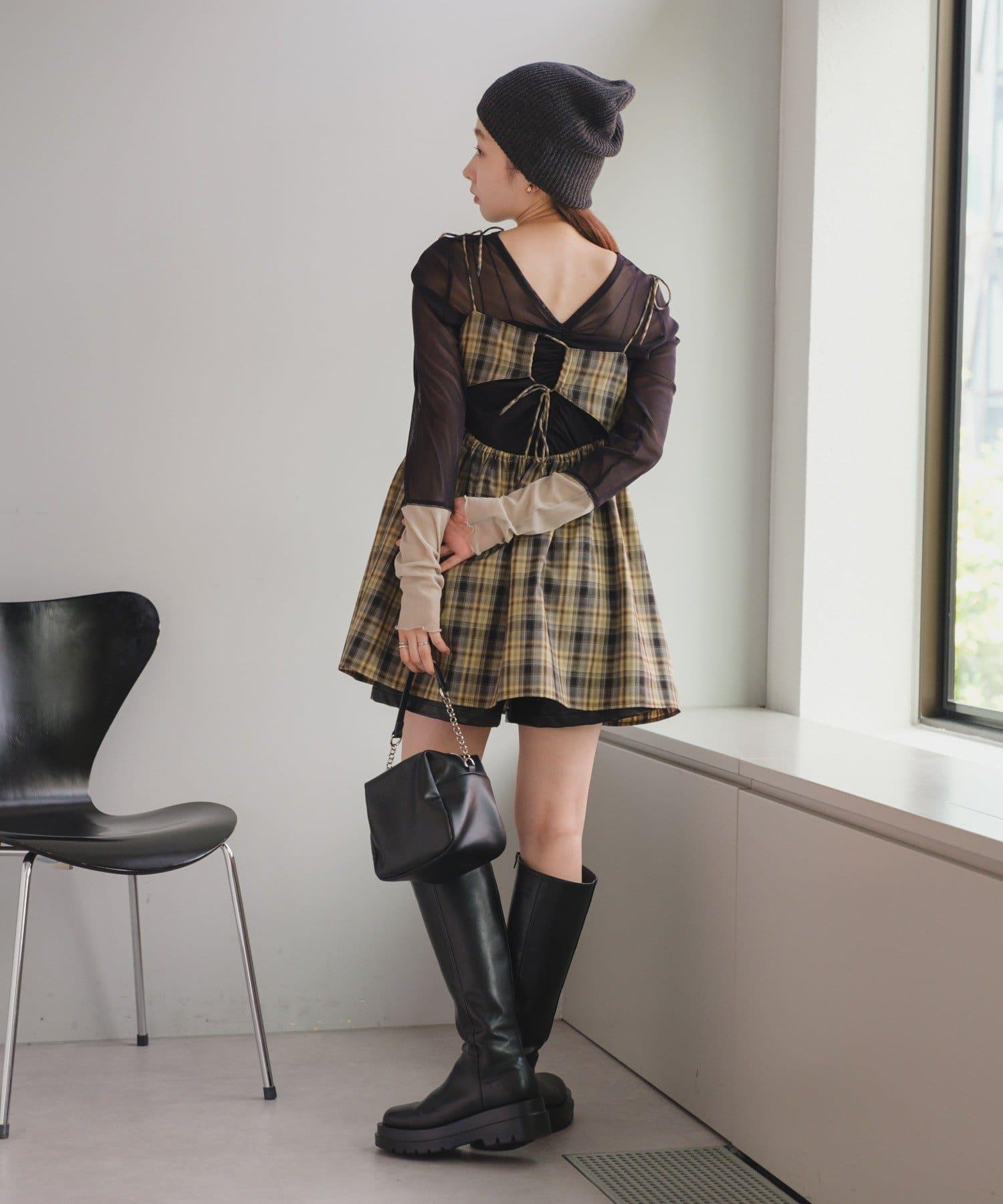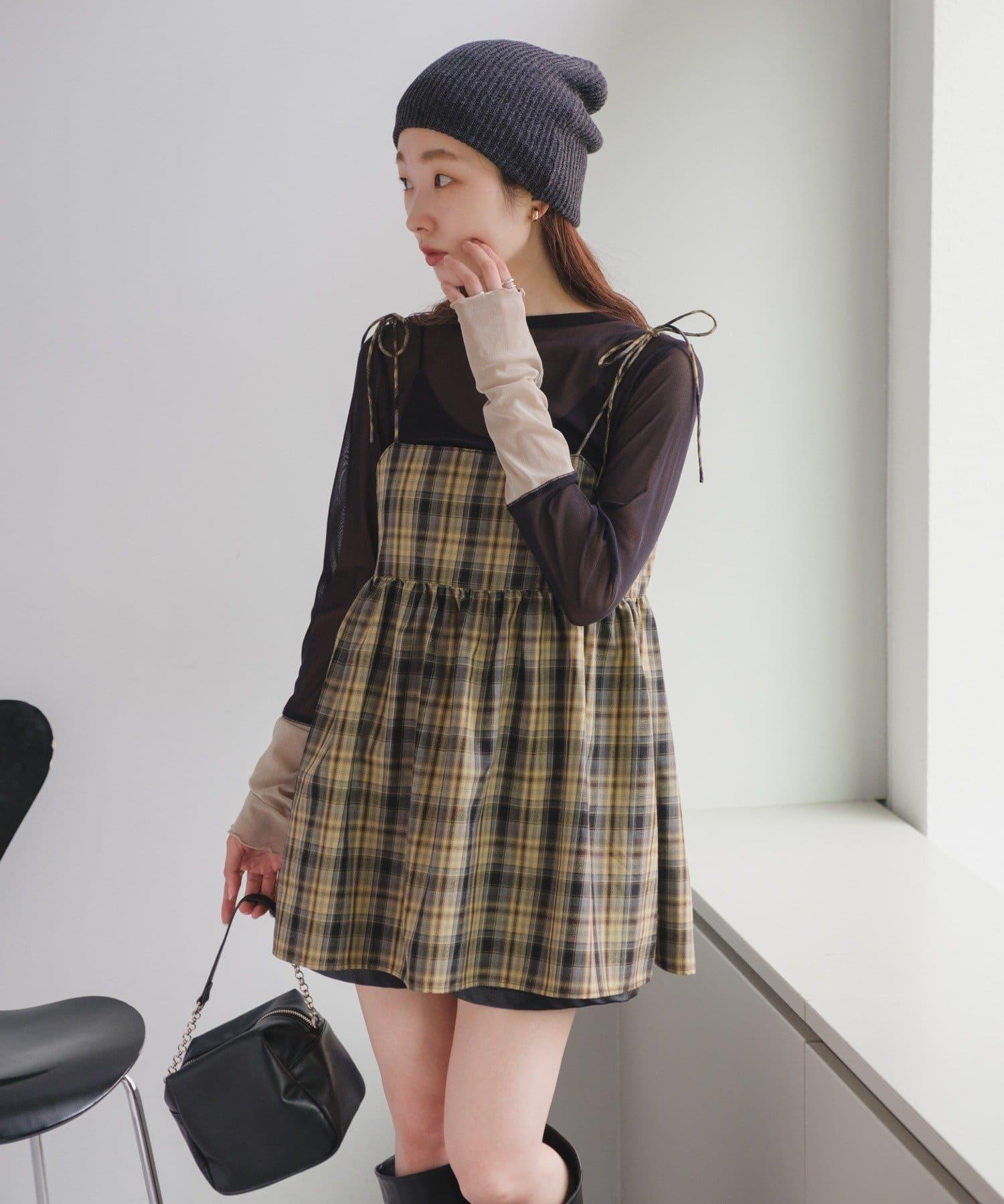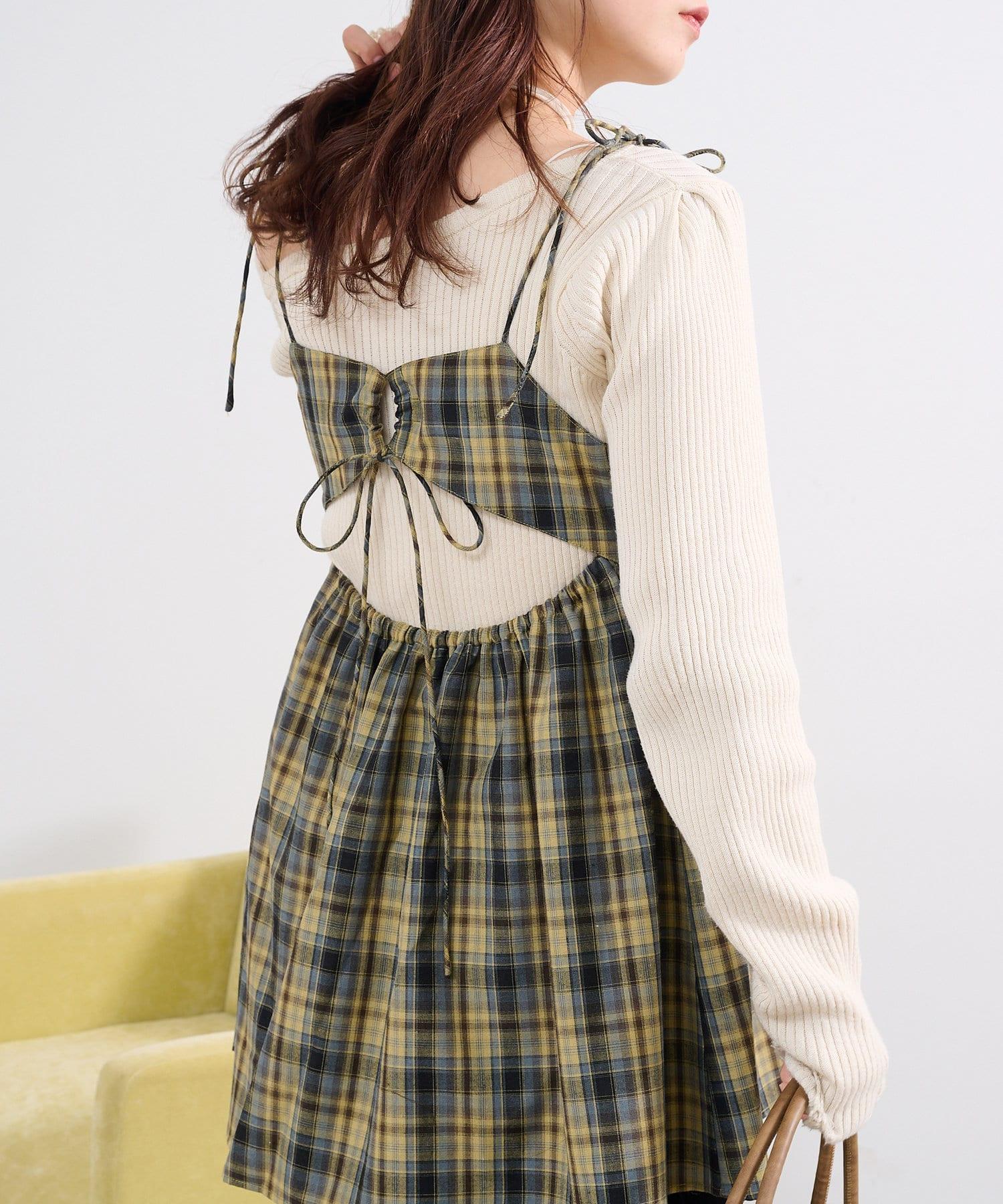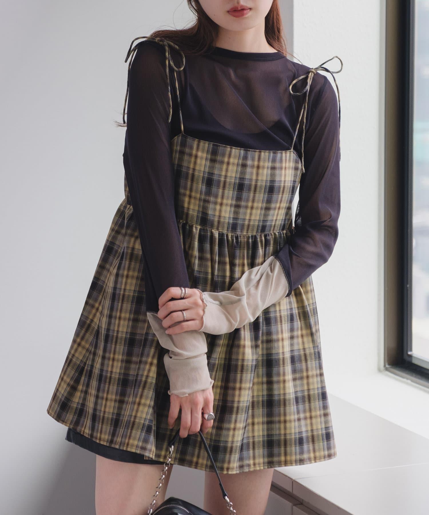 格紋吊帶半身裙,肩帶上有絲帶裝飾