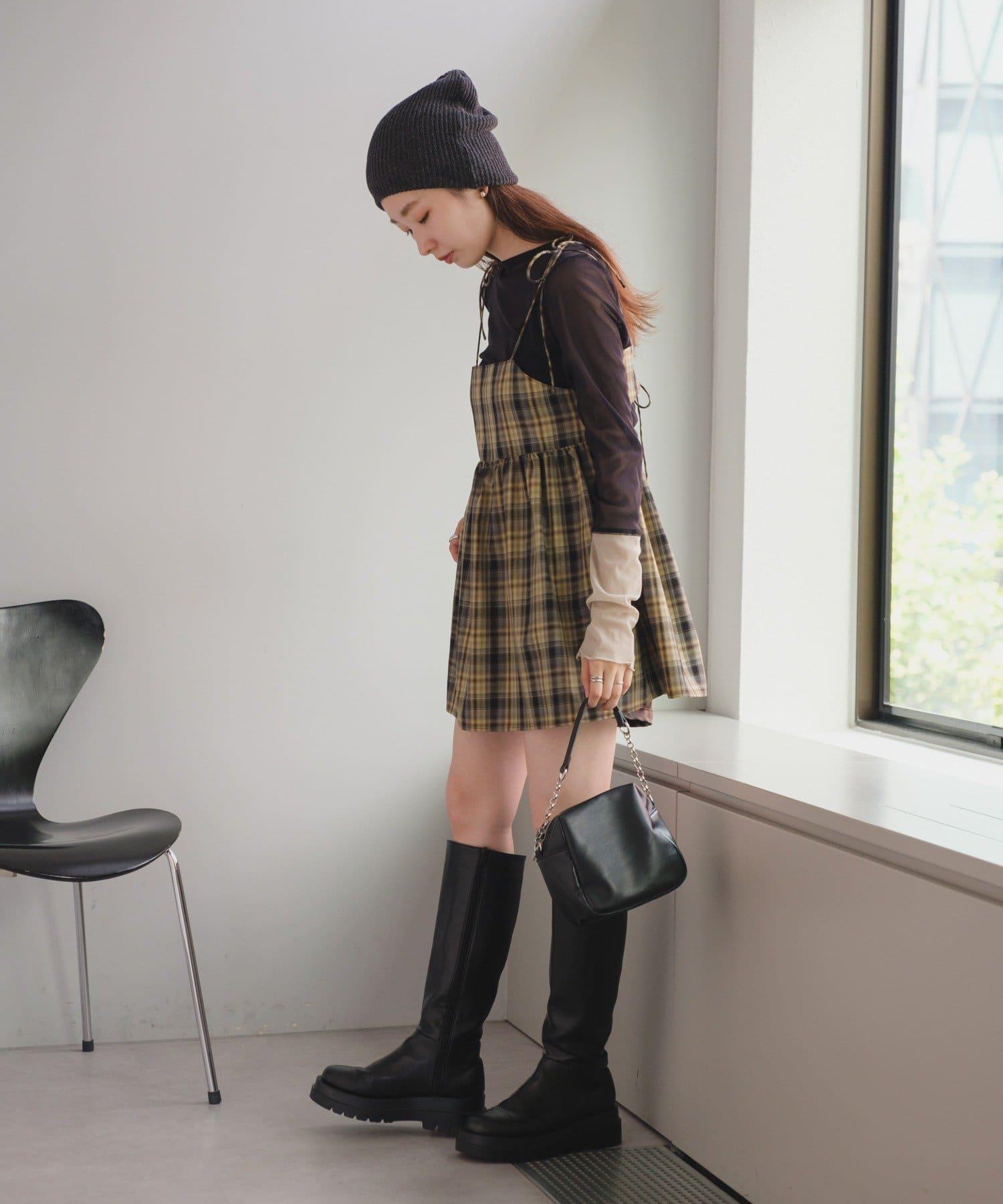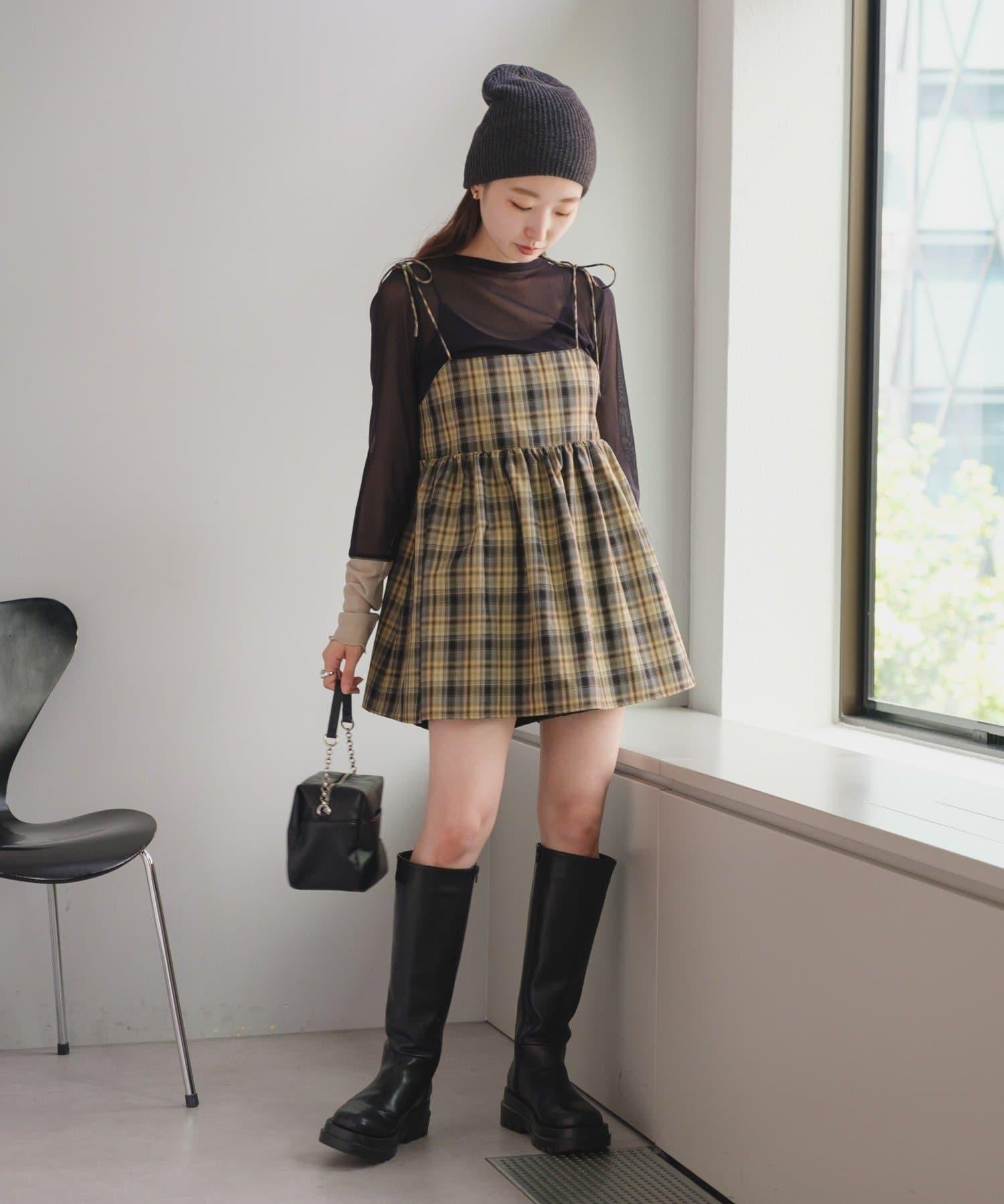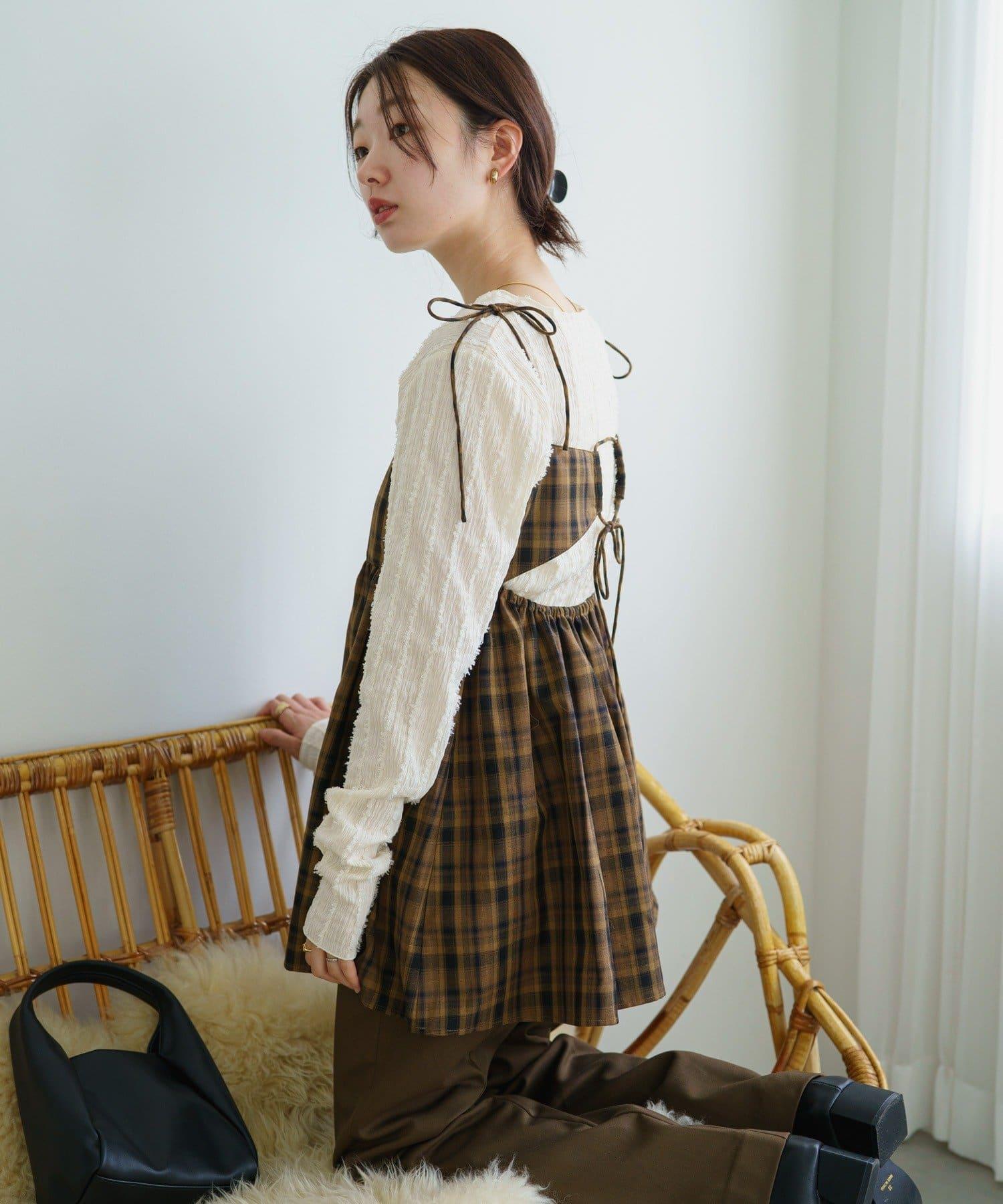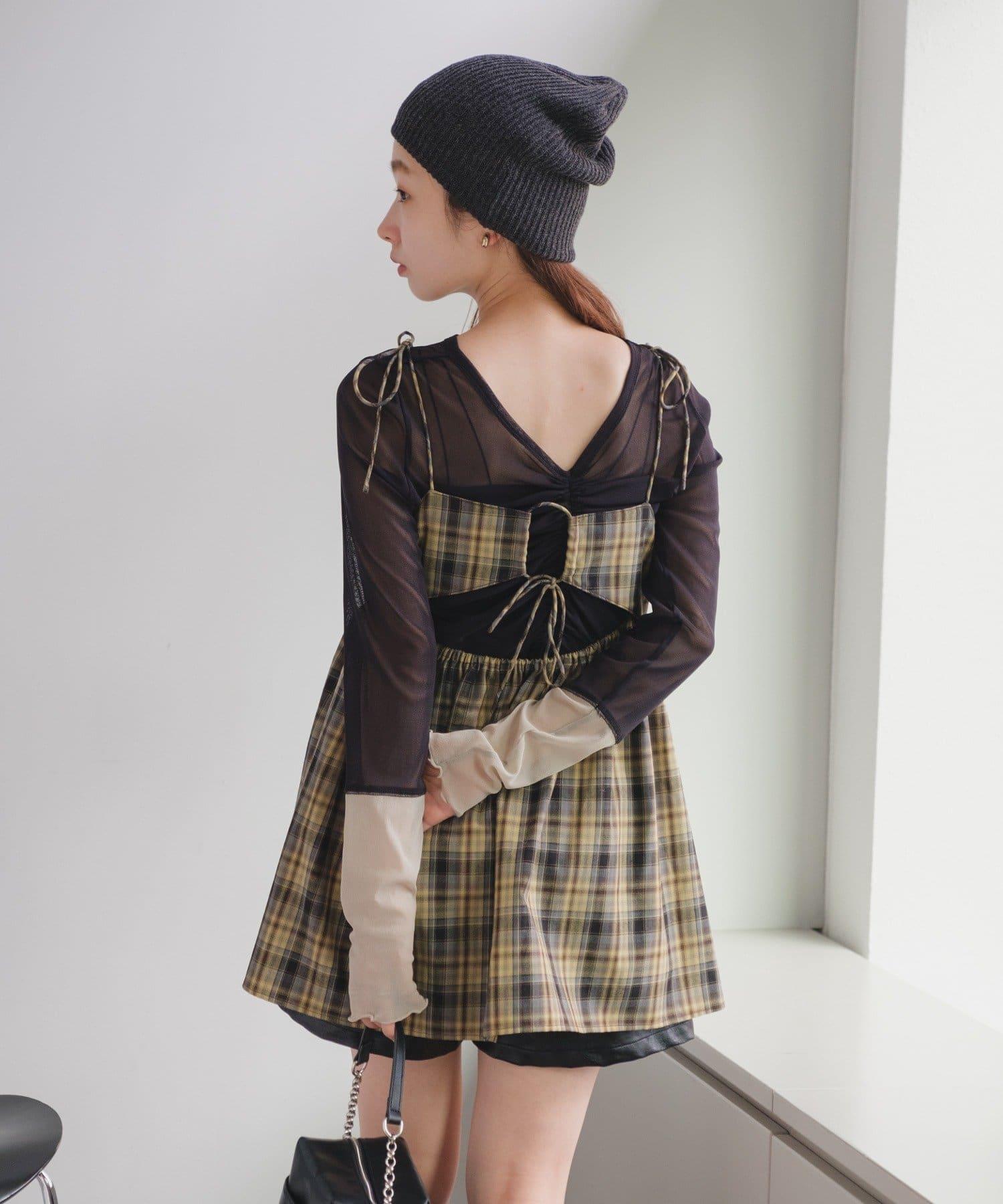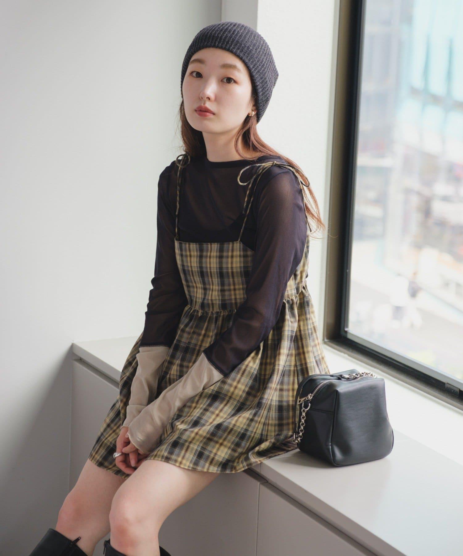 格紋吊帶半身裙,肩帶上有絲帶裝飾