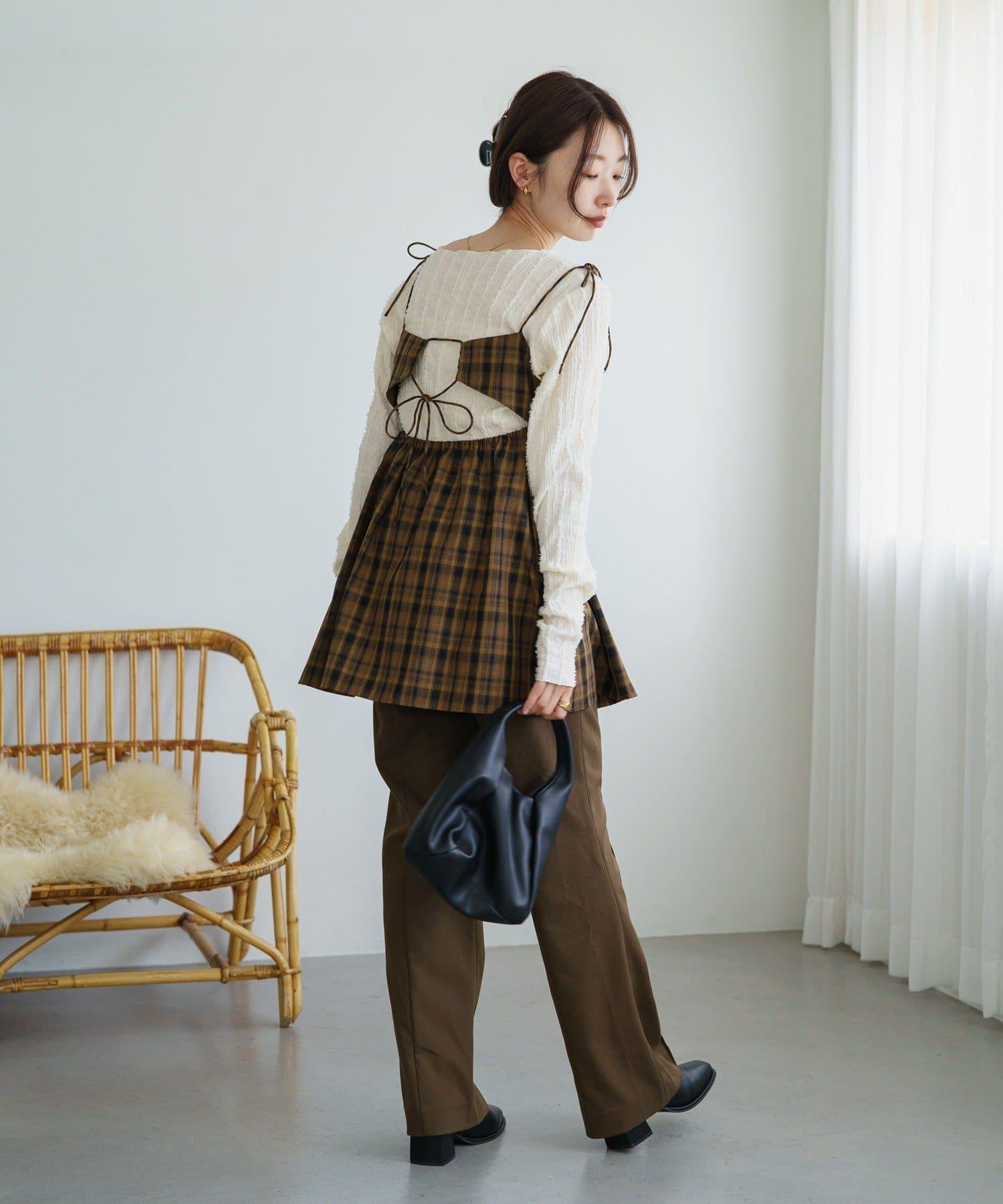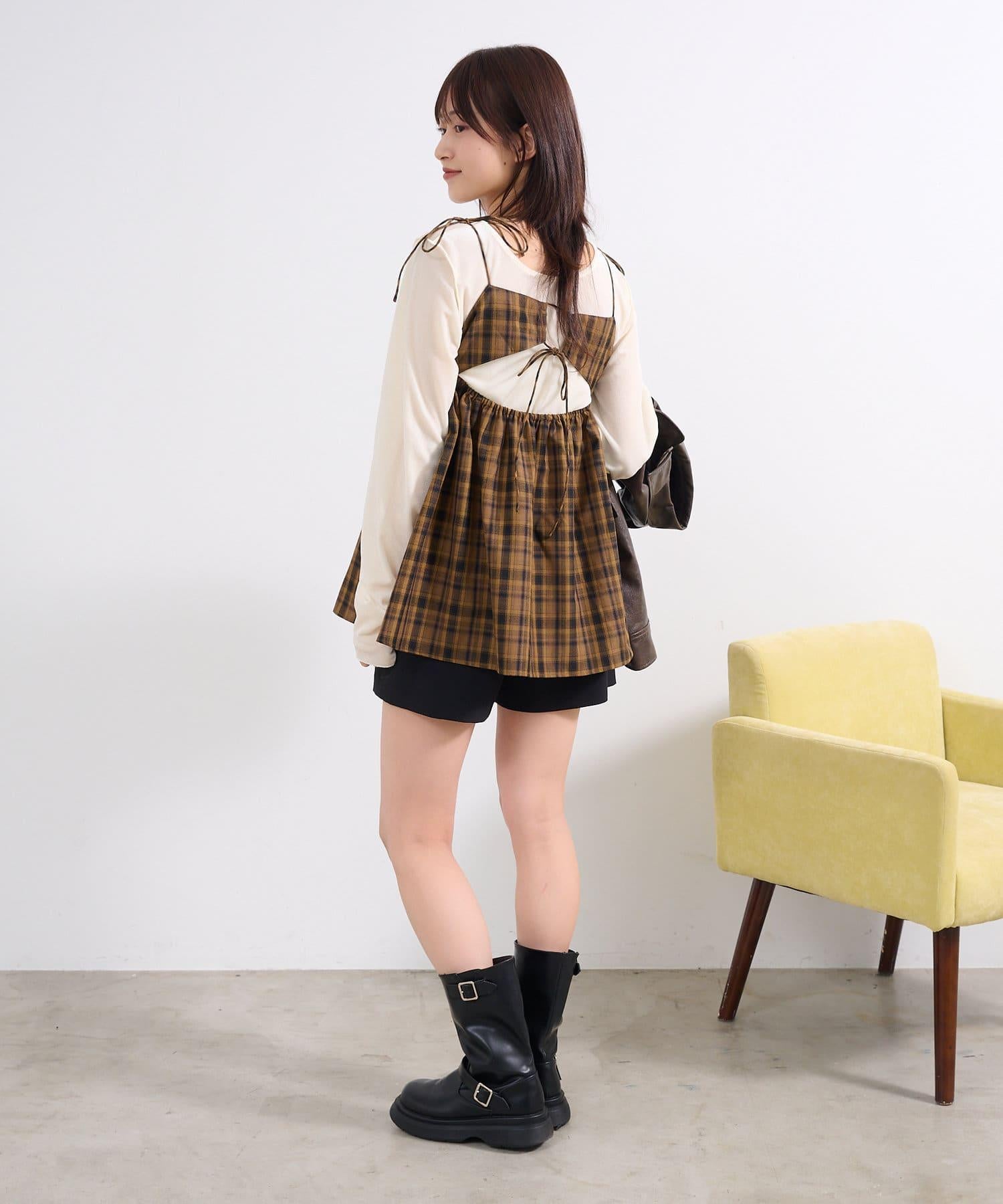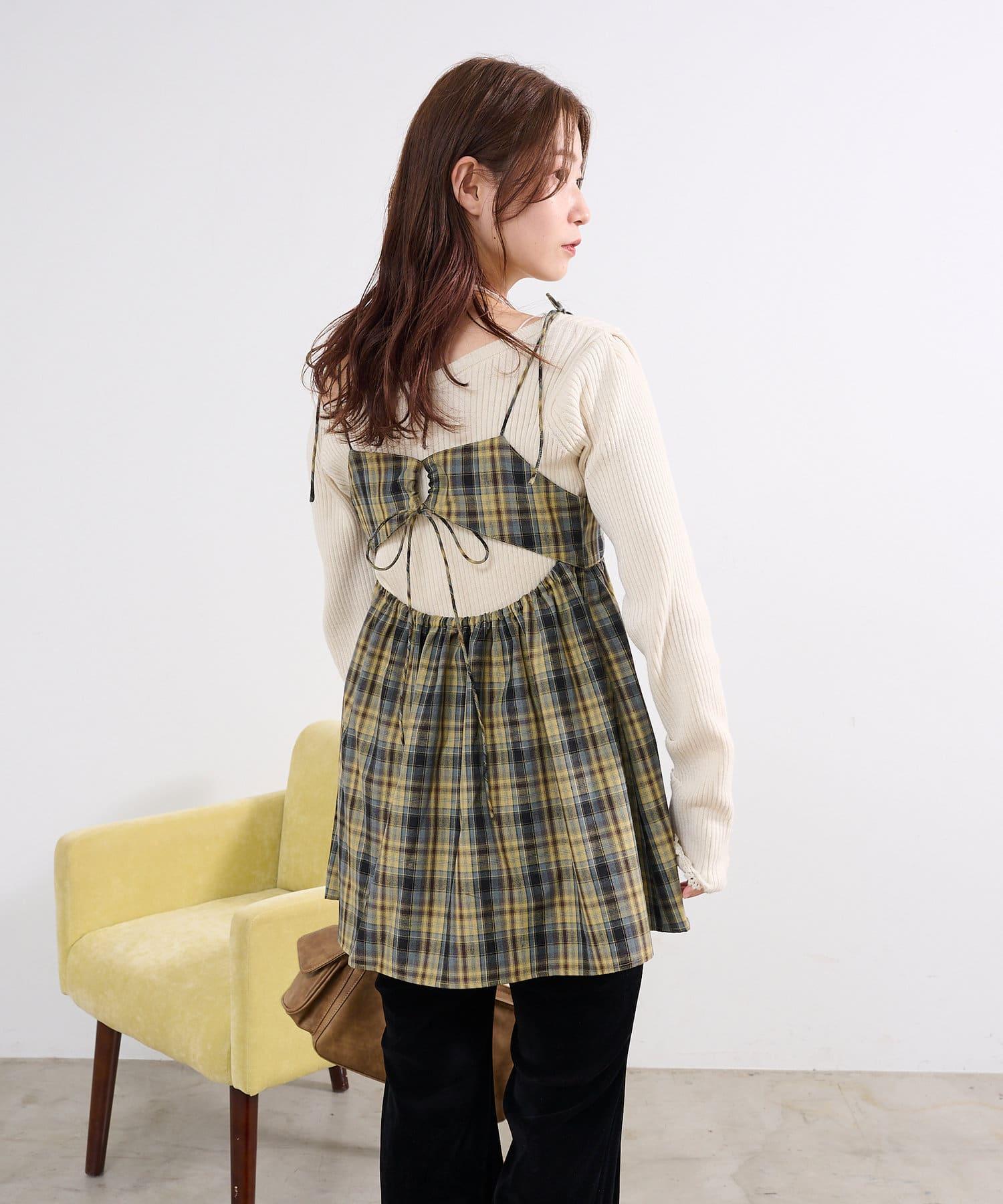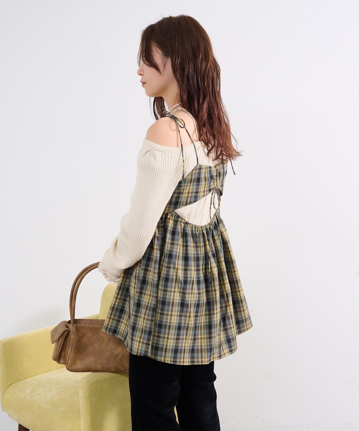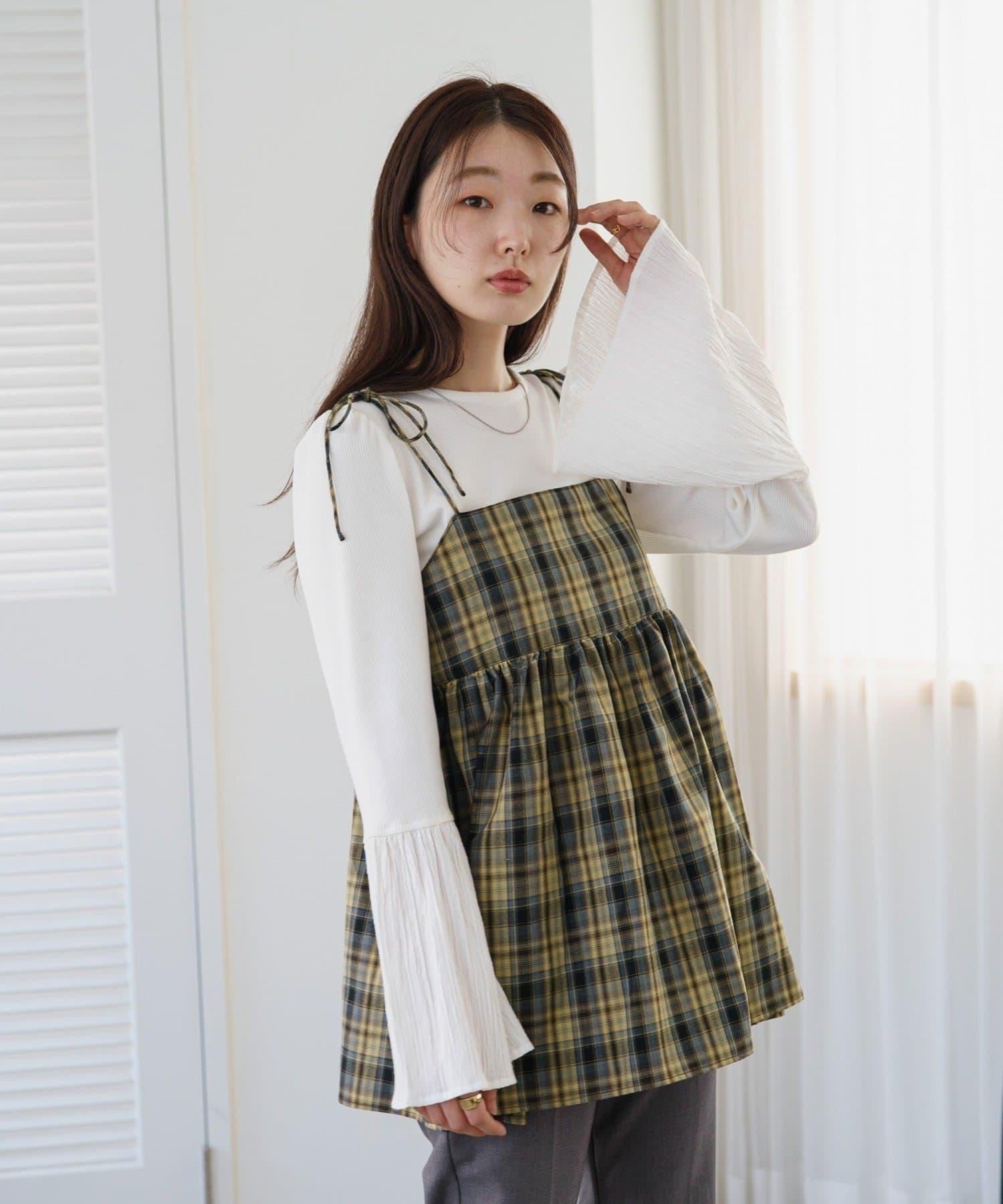 格紋吊帶半身裙,肩帶上有絲帶裝飾