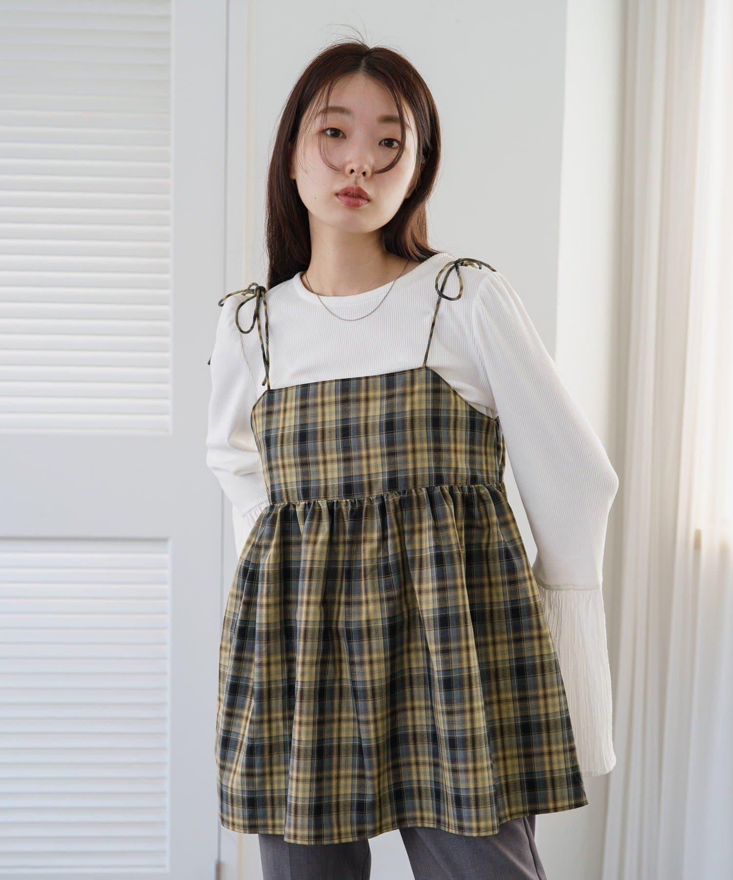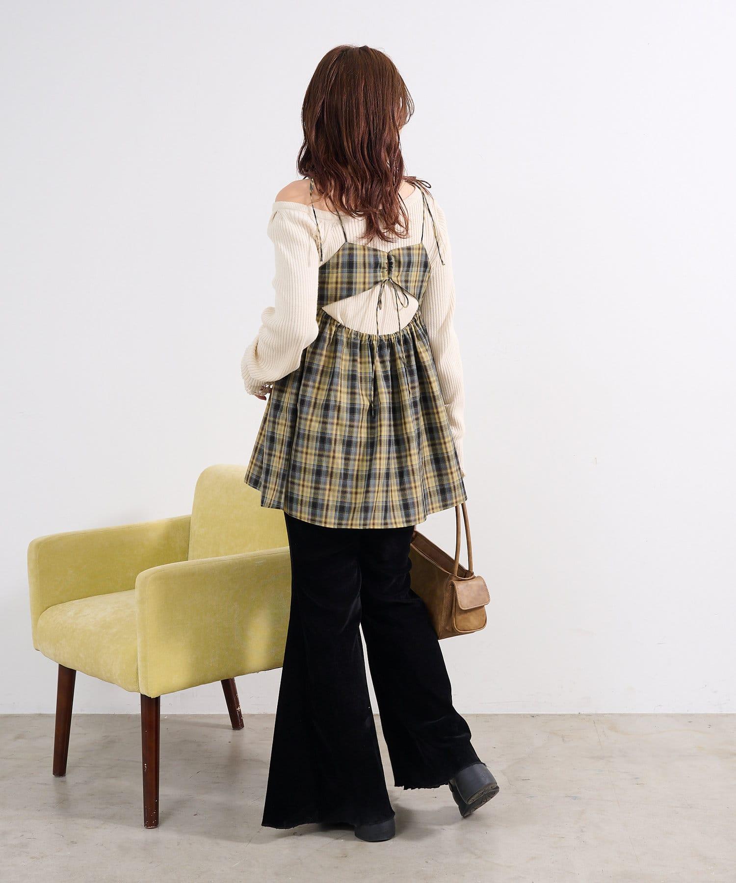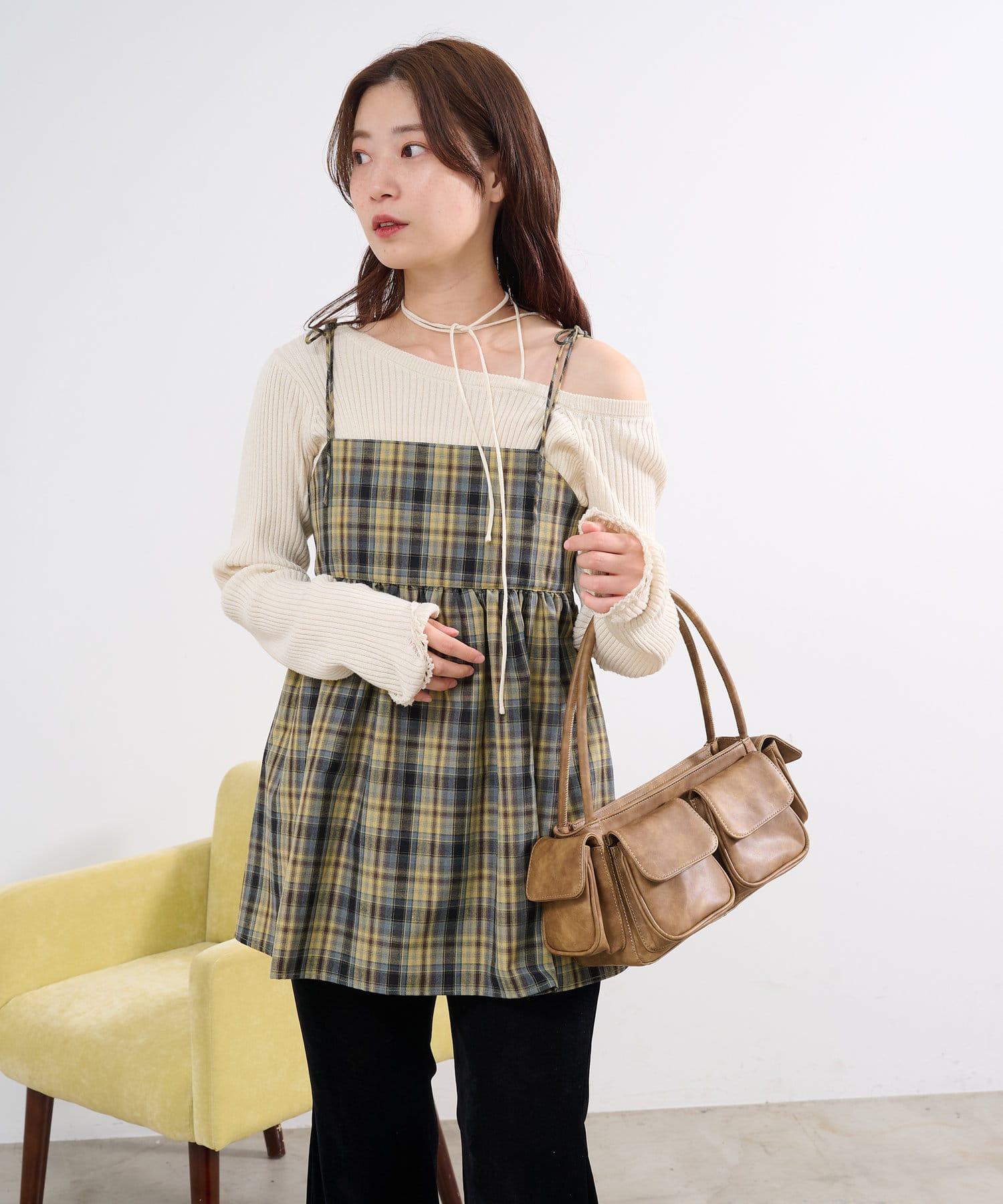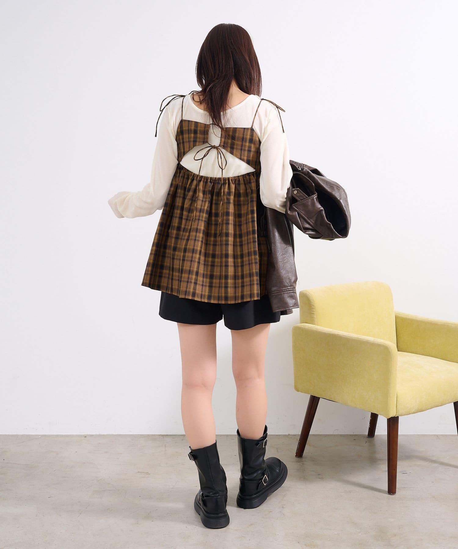 格紋吊帶半身裙,肩帶上有絲帶裝飾