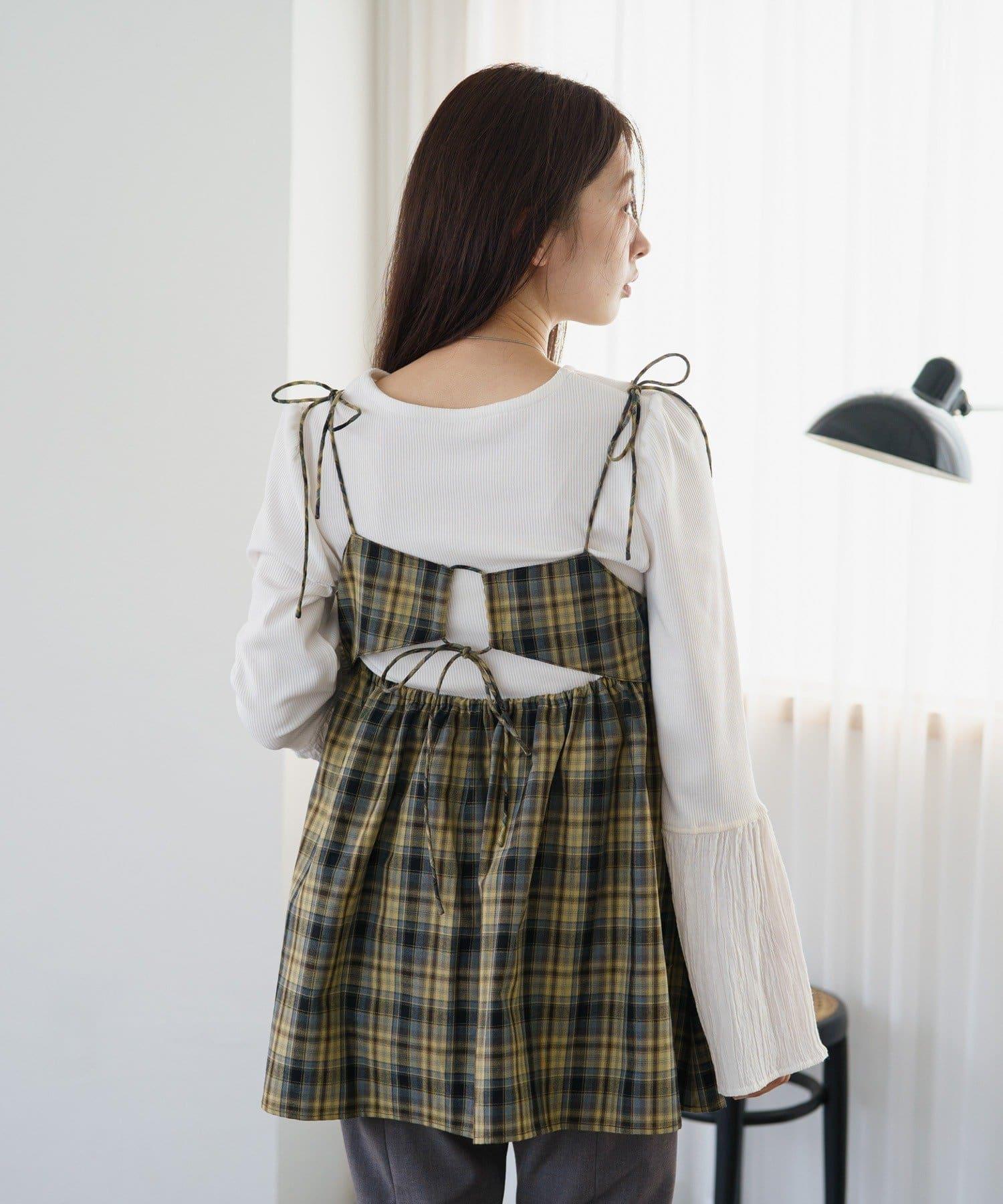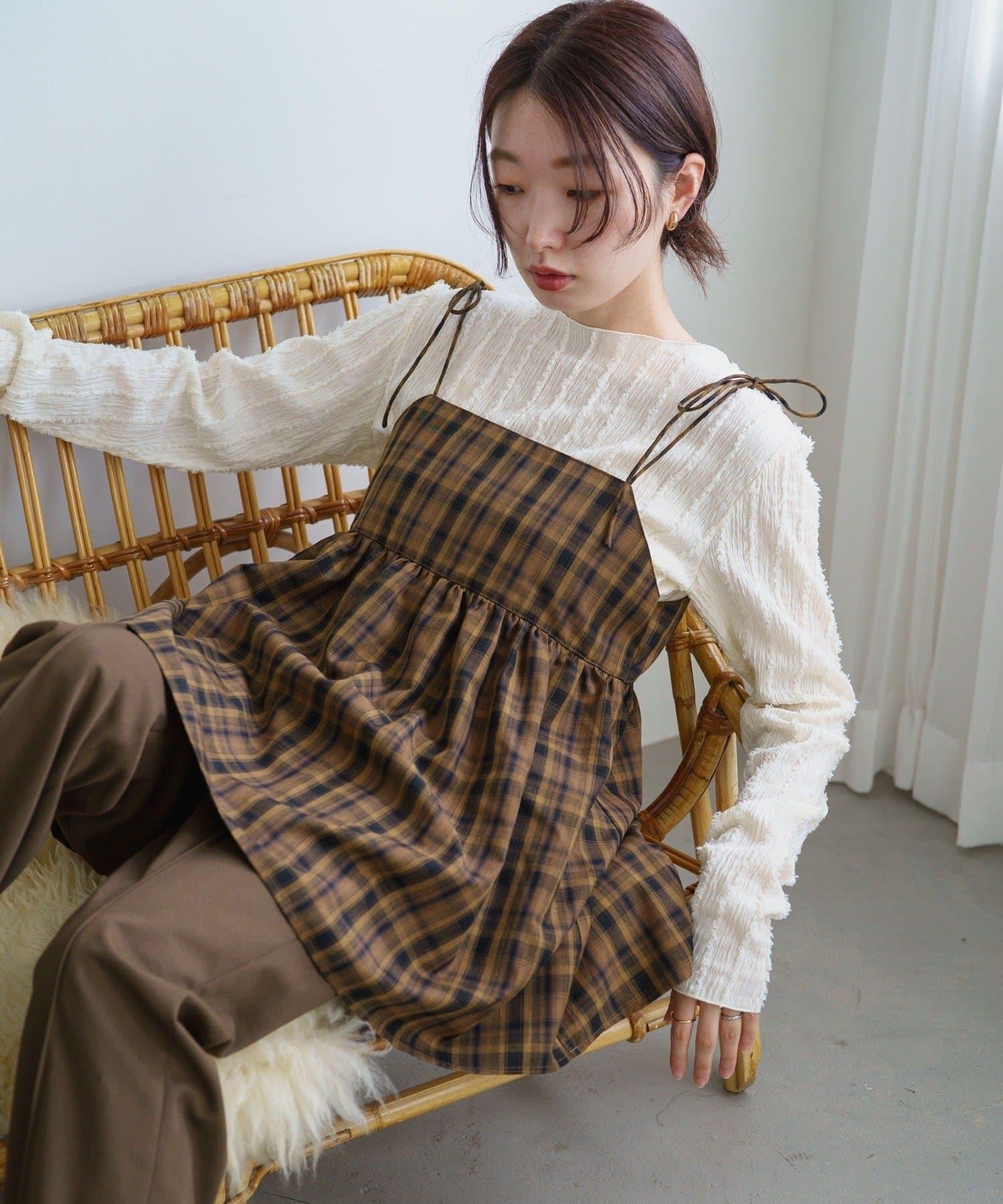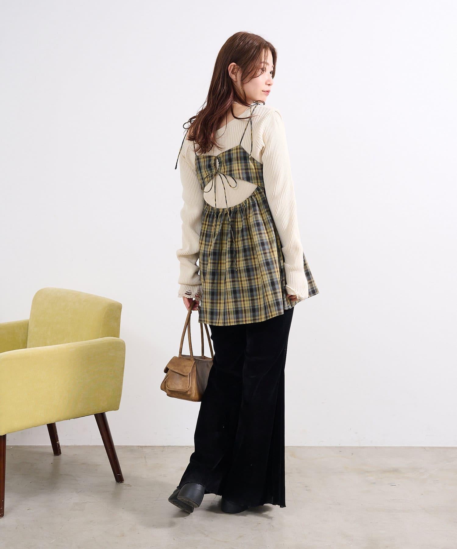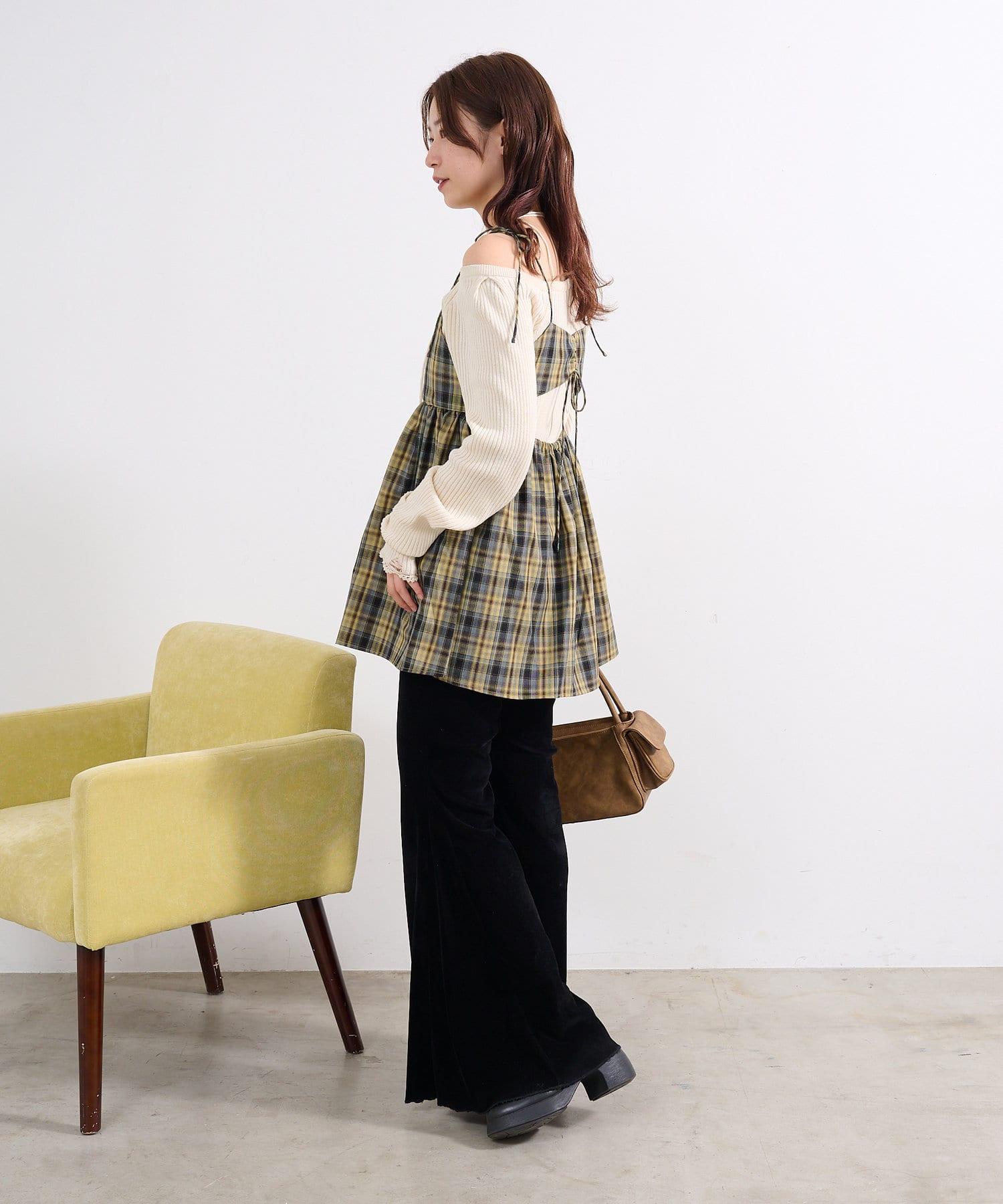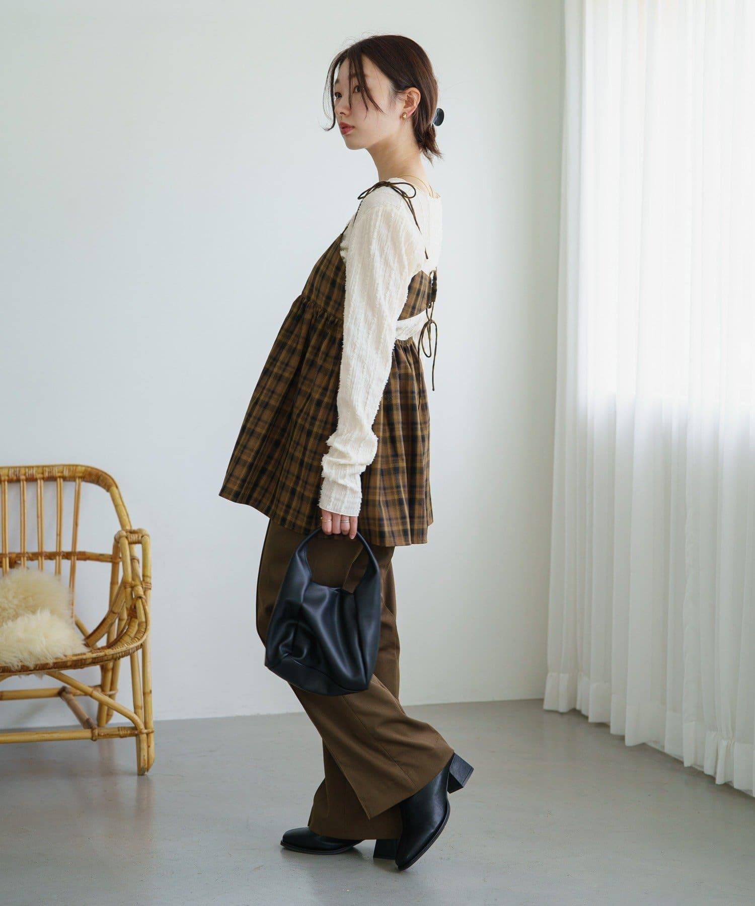 格紋吊帶半身裙,肩帶上有絲帶裝飾