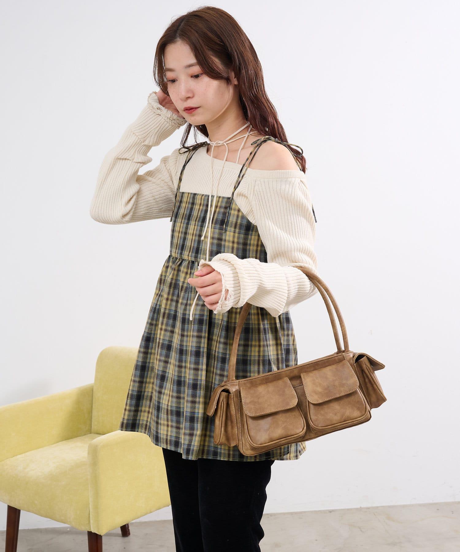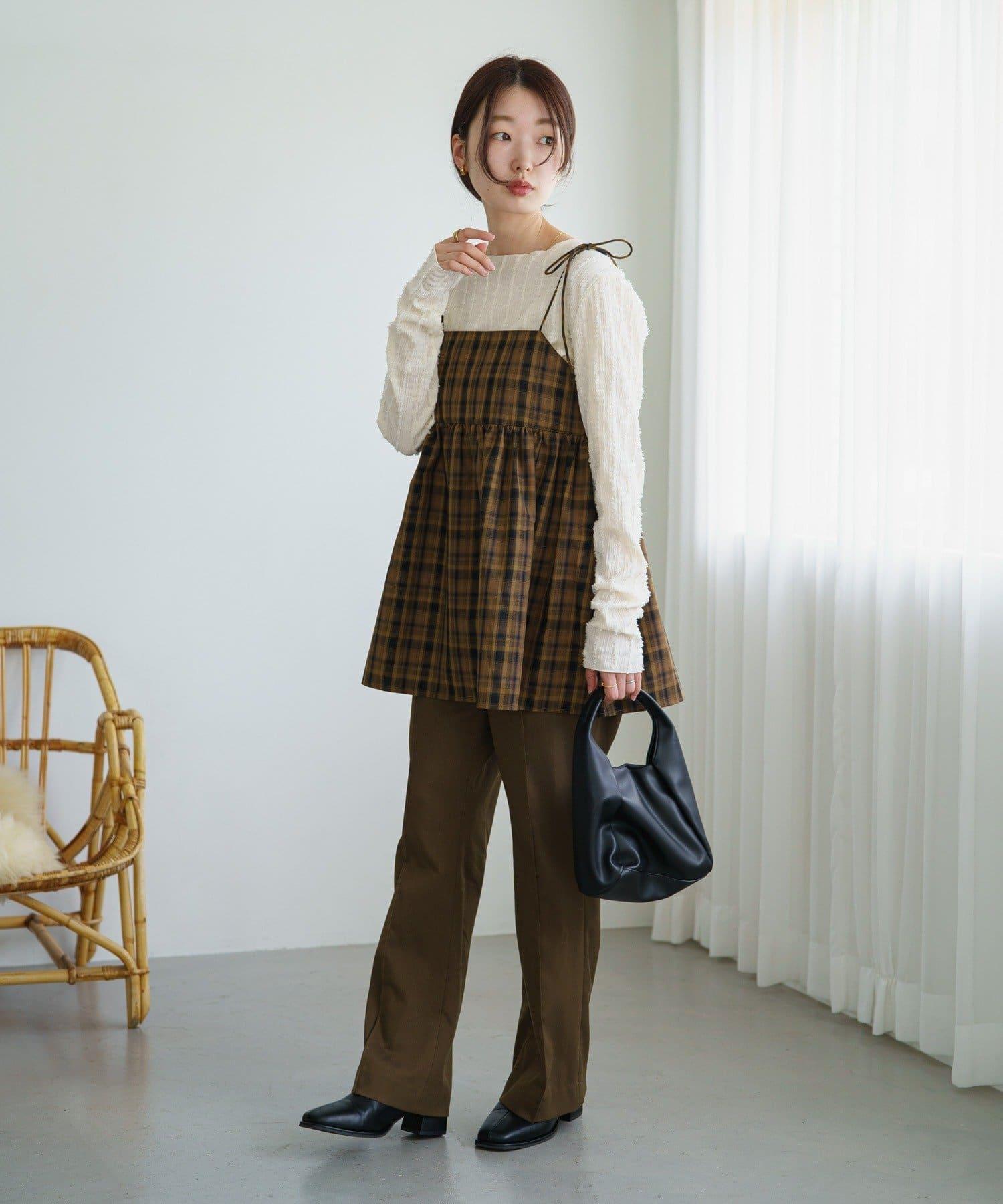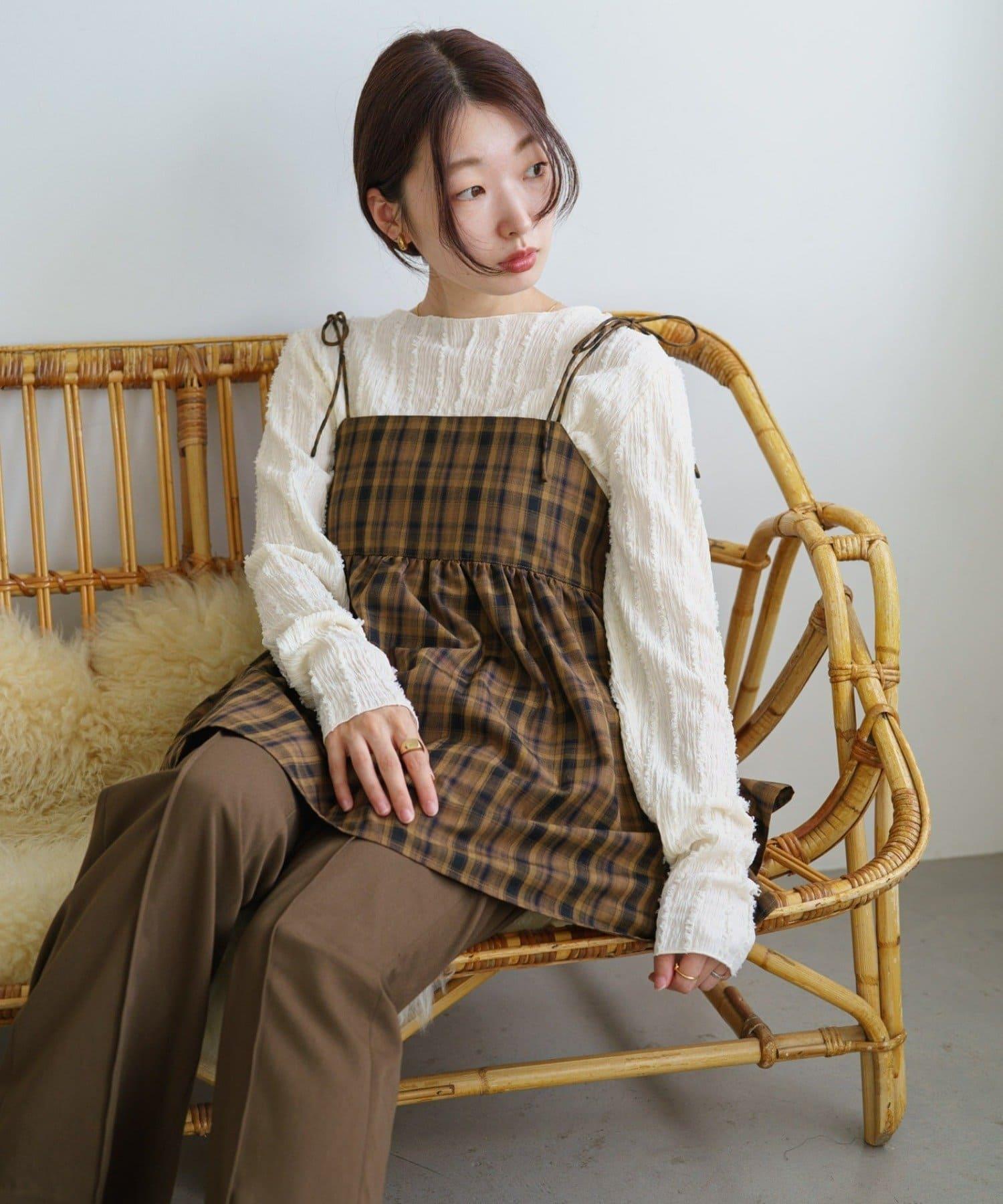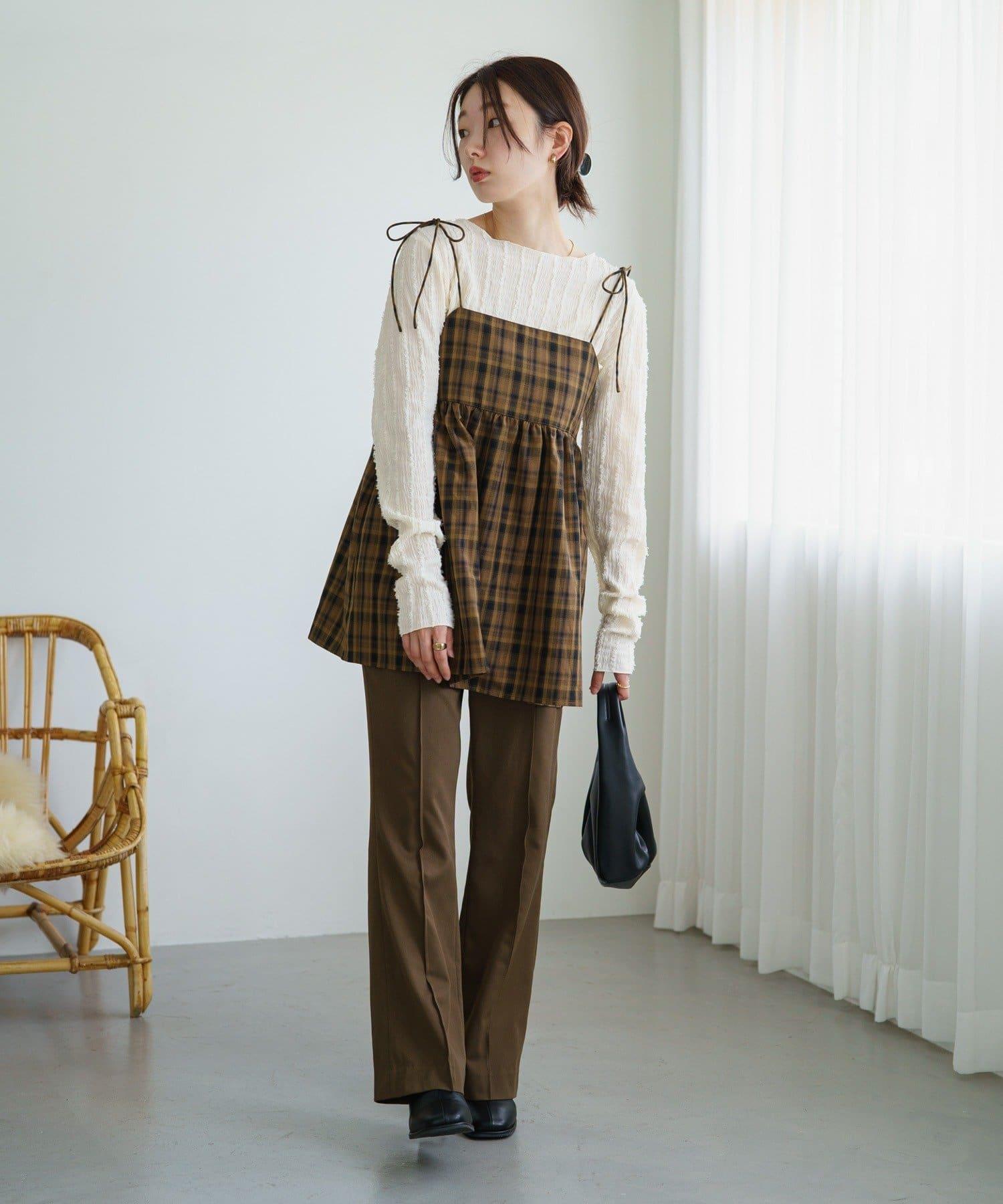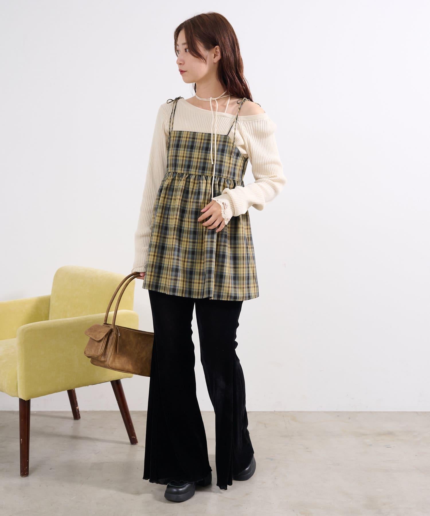 格紋吊帶半身裙,肩帶上有絲帶裝飾