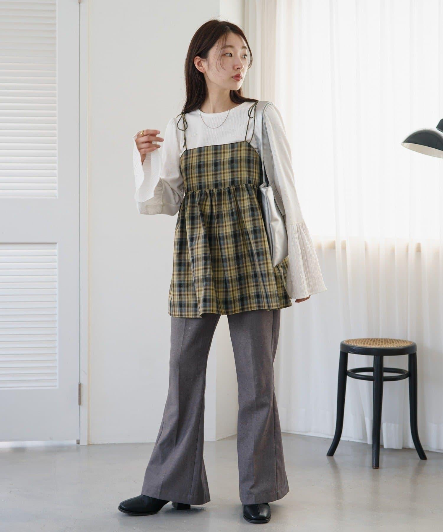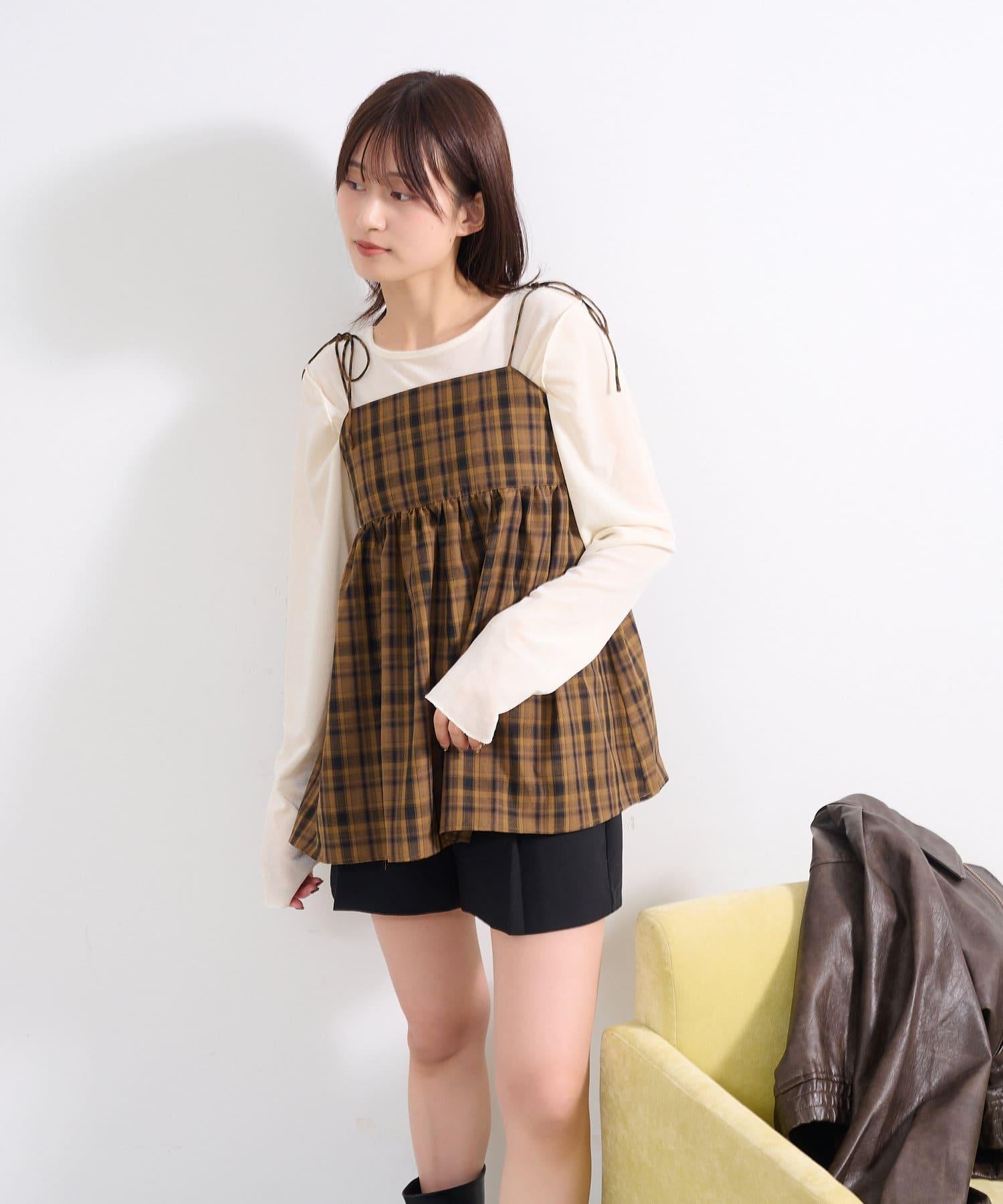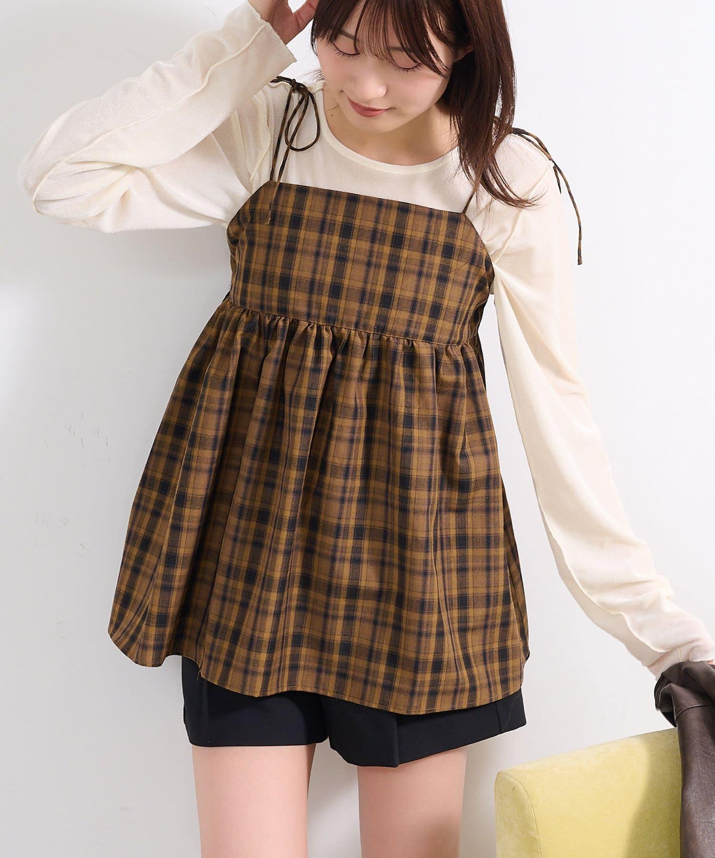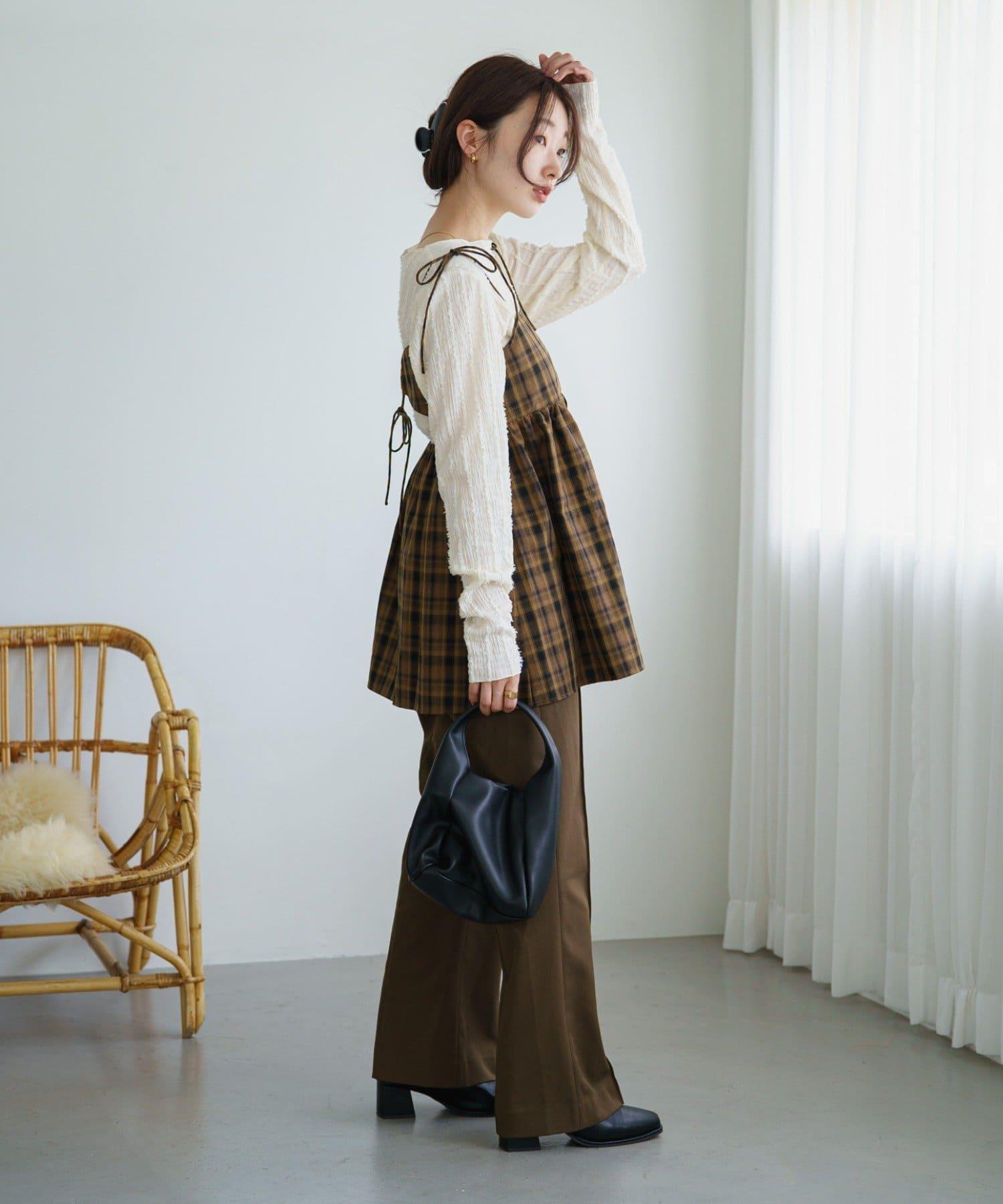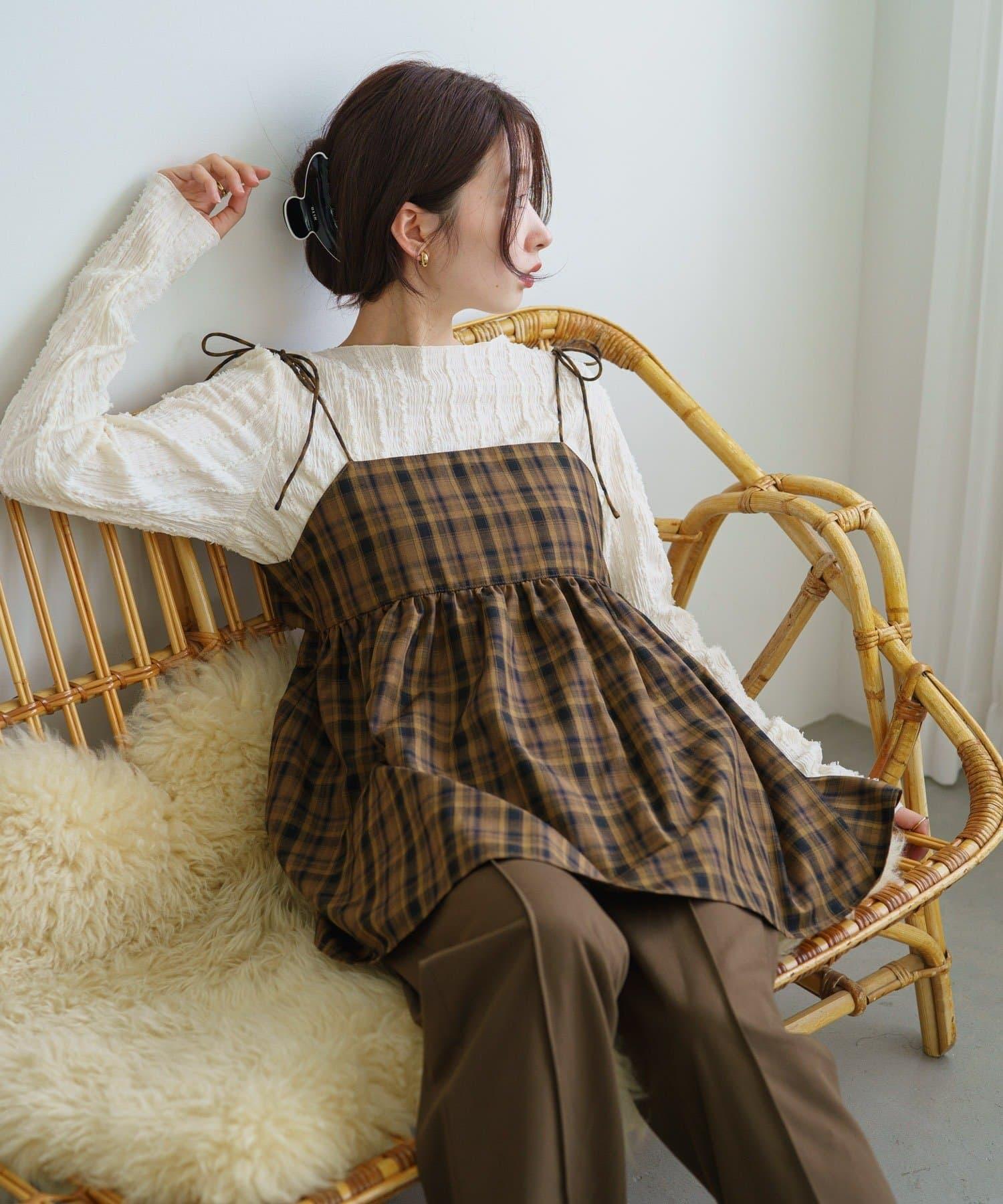 格紋吊帶半身裙,肩帶上有絲帶裝飾