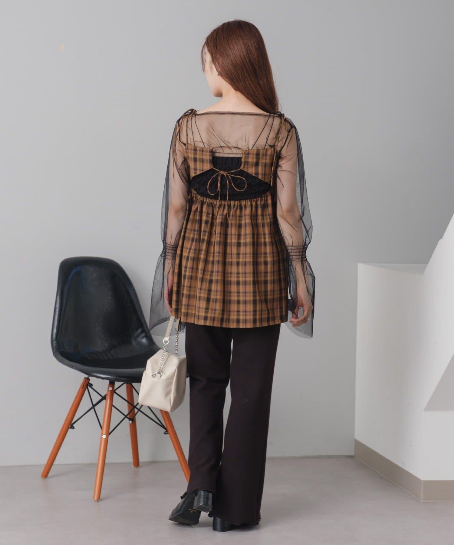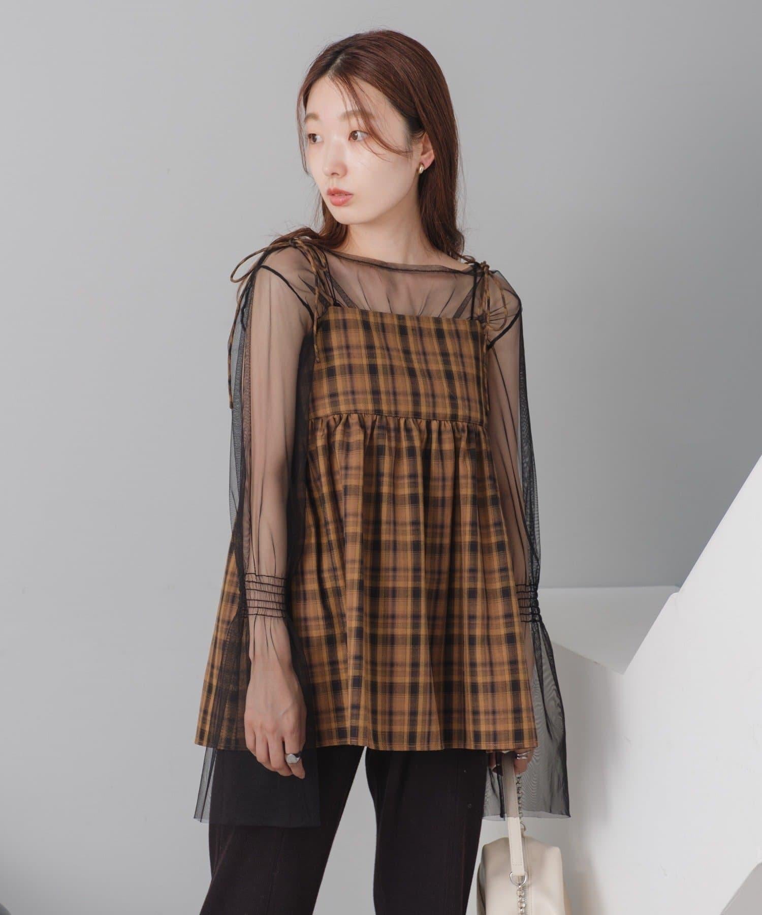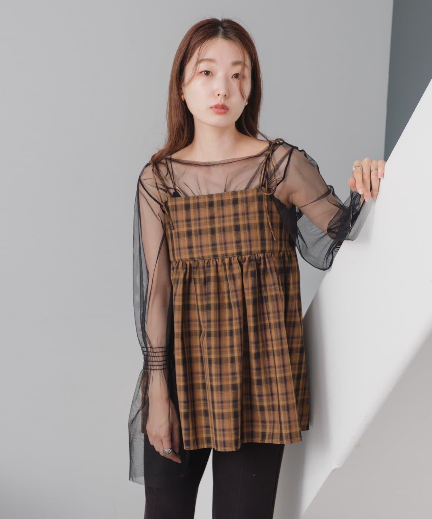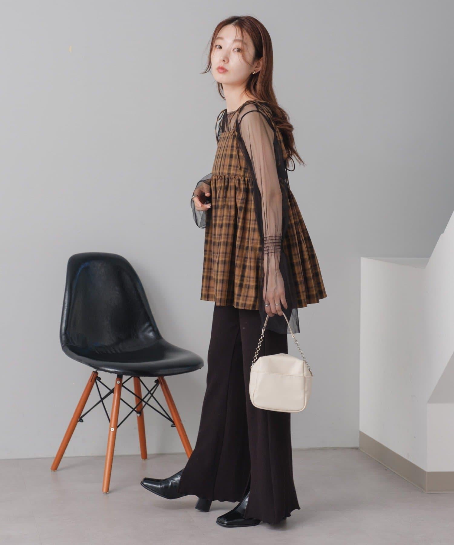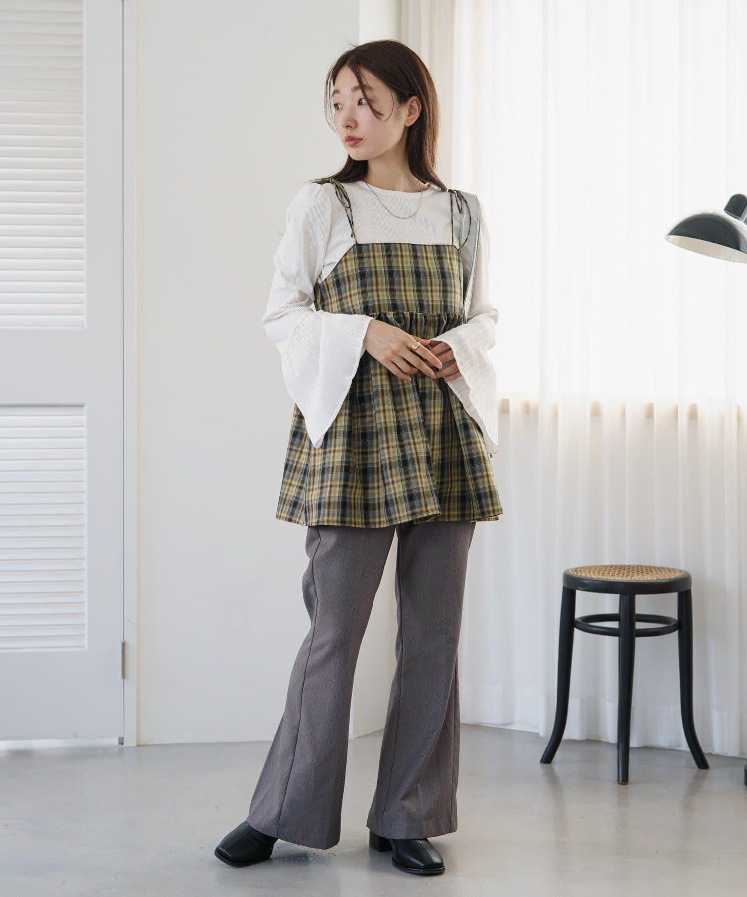 格紋吊帶半身裙,肩帶上有絲帶裝飾