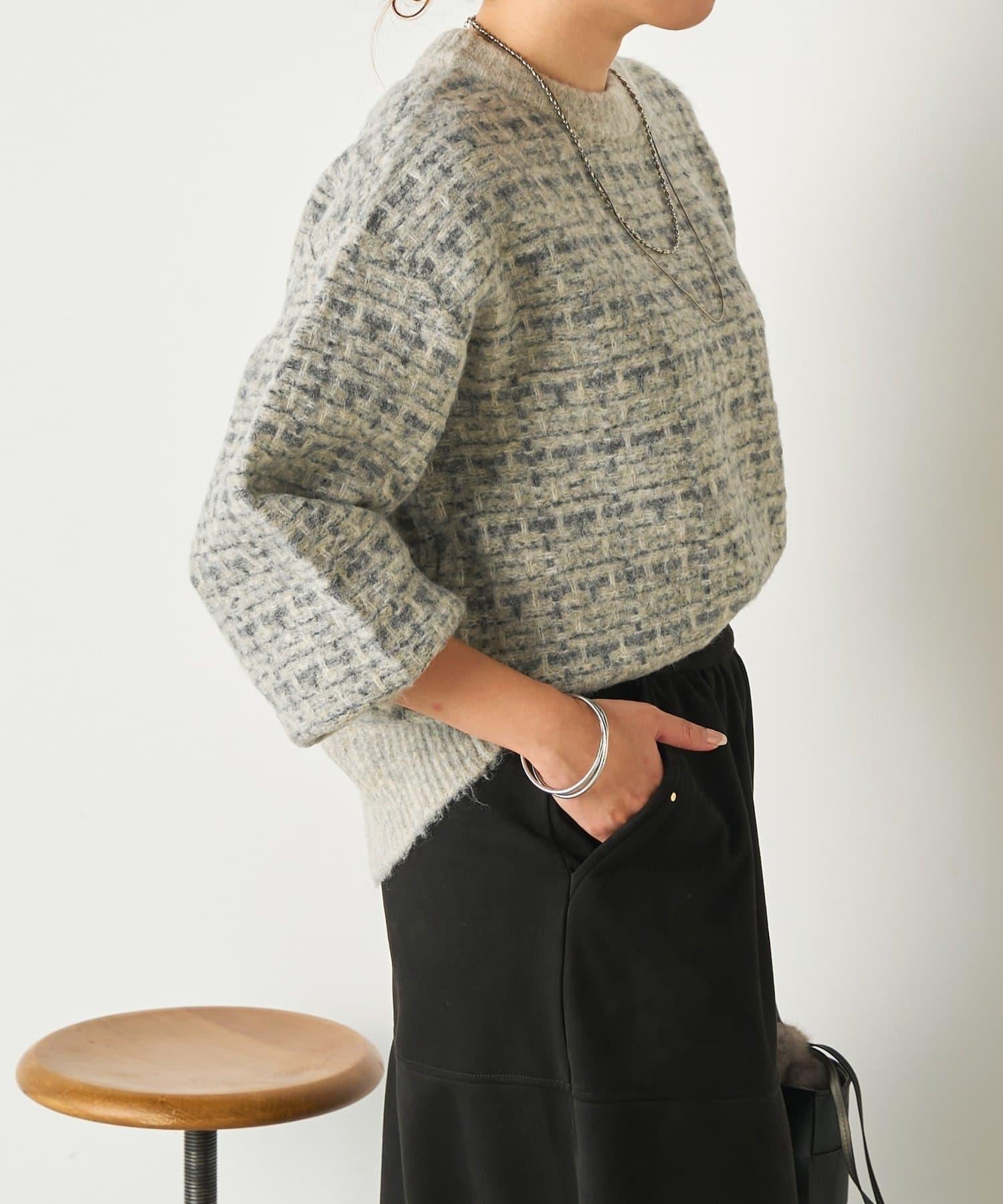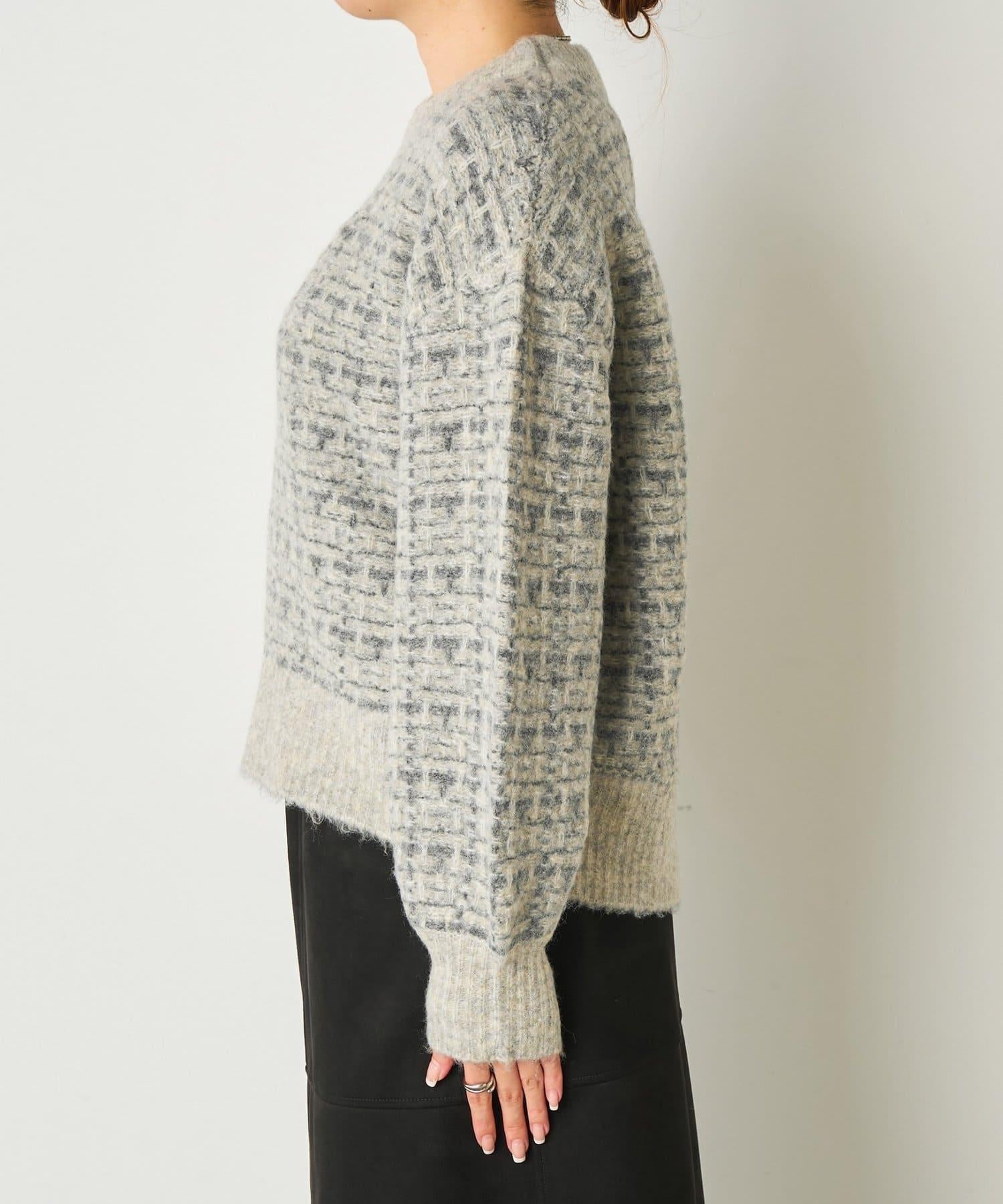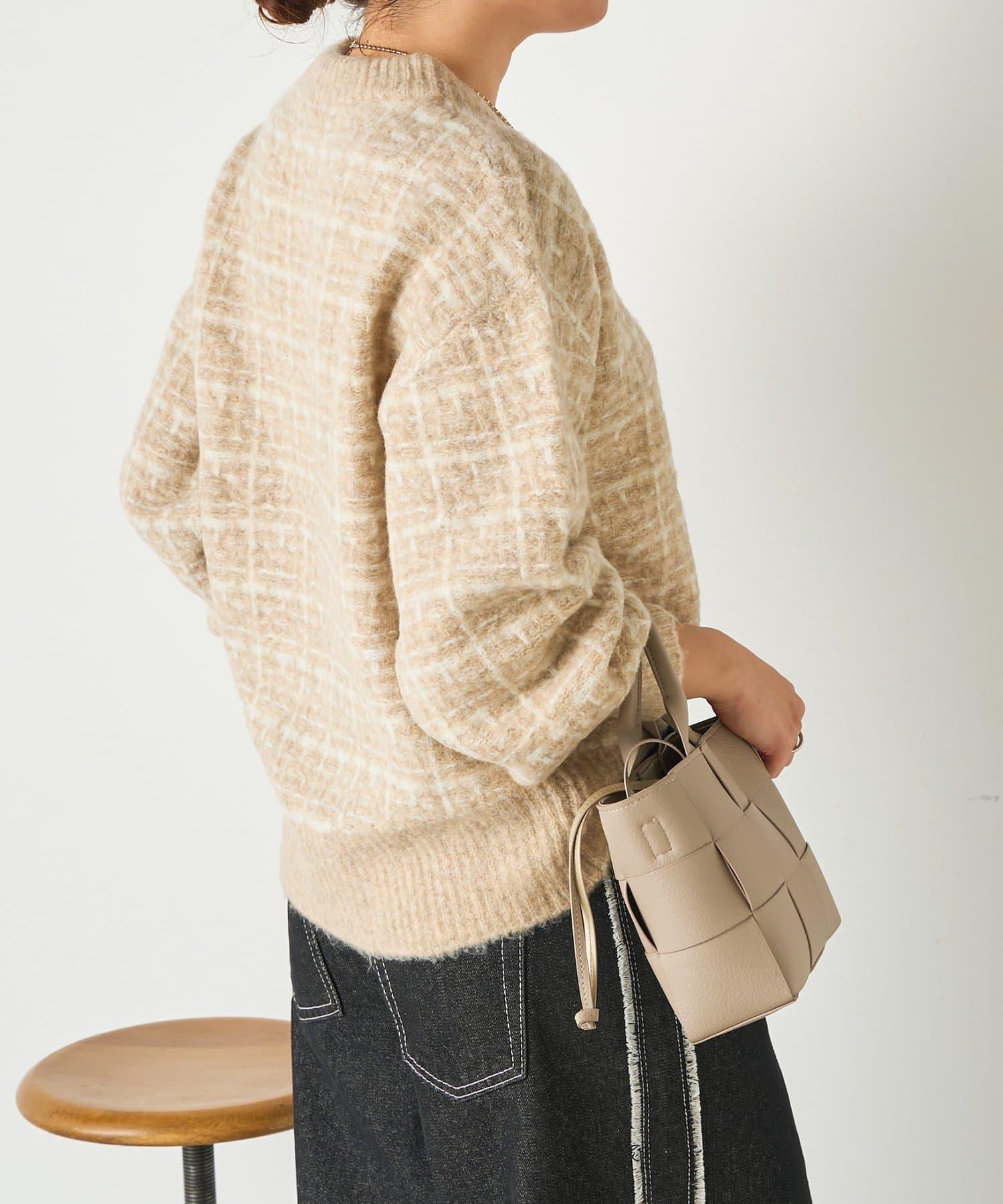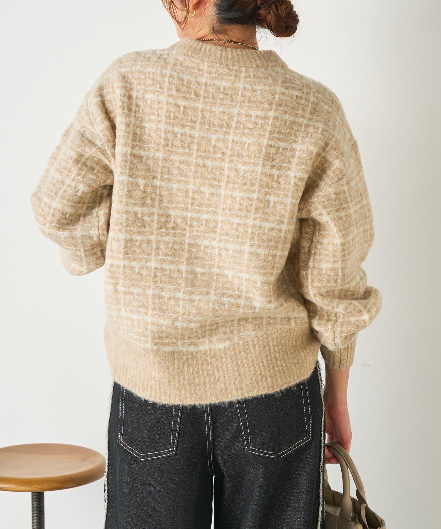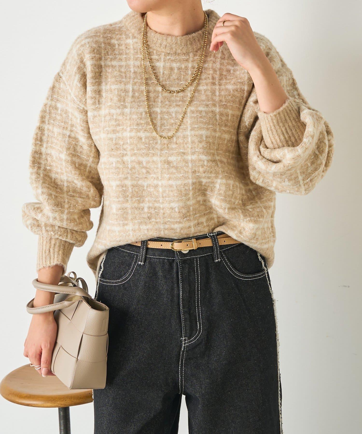 質地不均勻的針織面料非常搶眼,格子圓領針織面料。