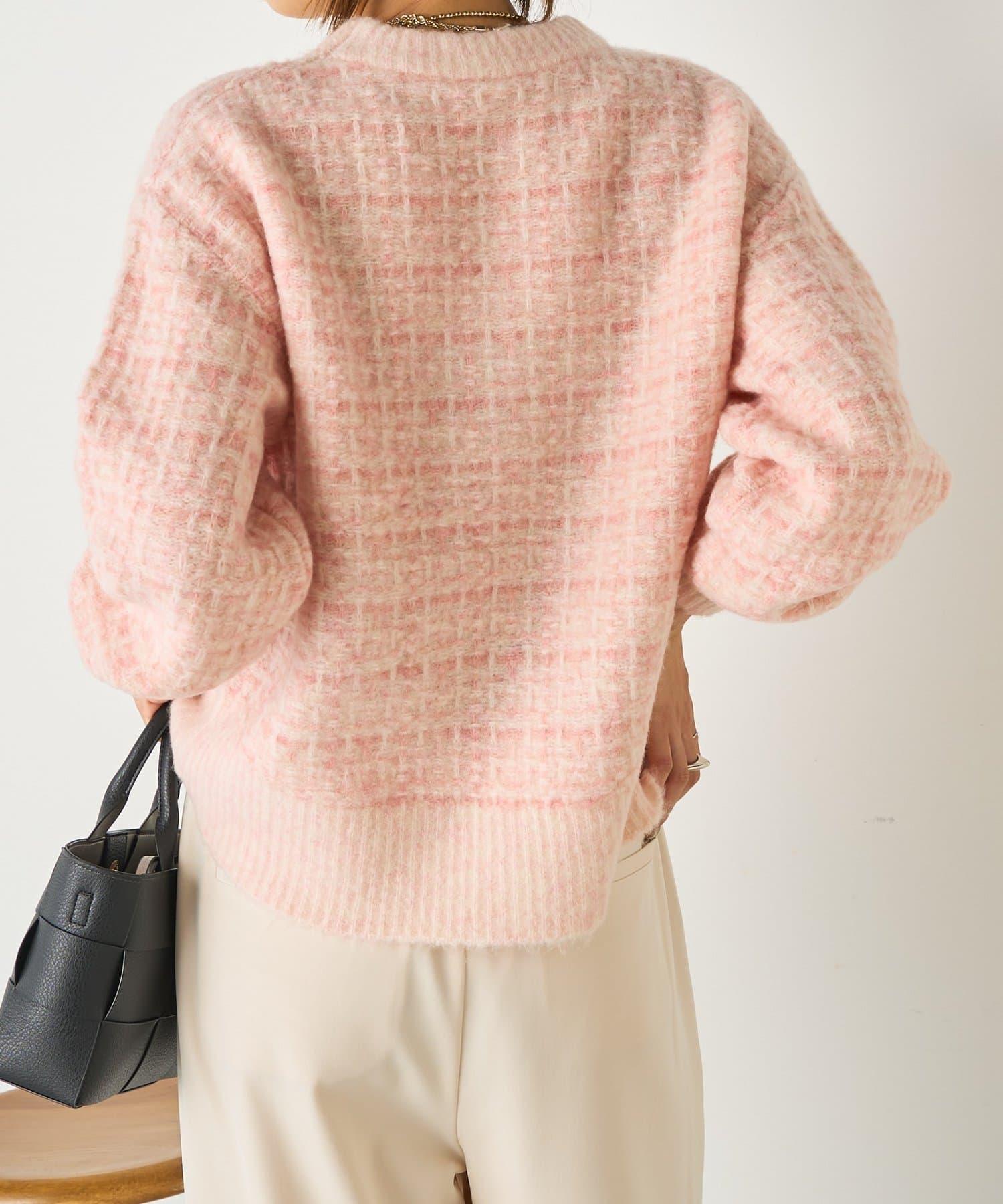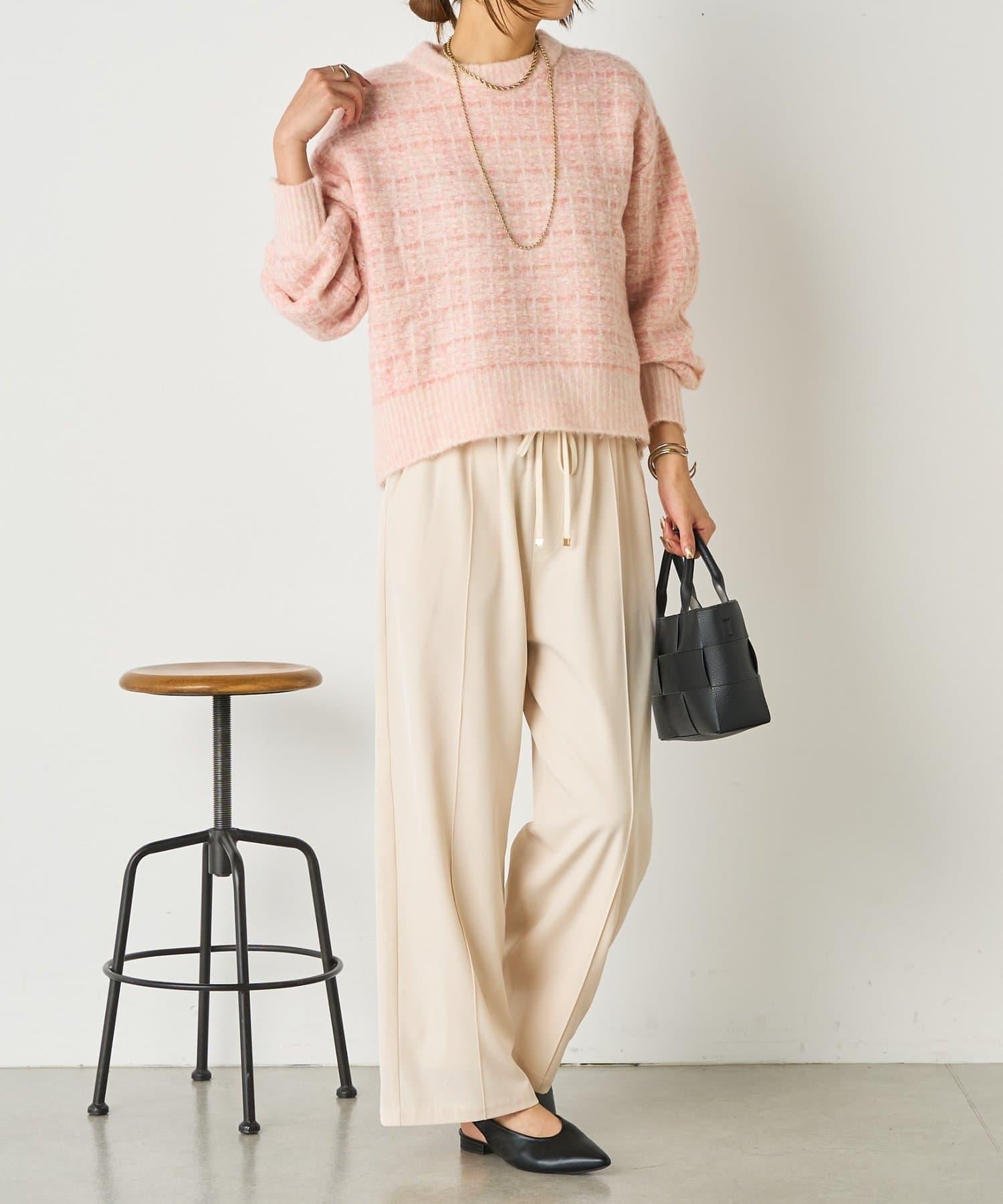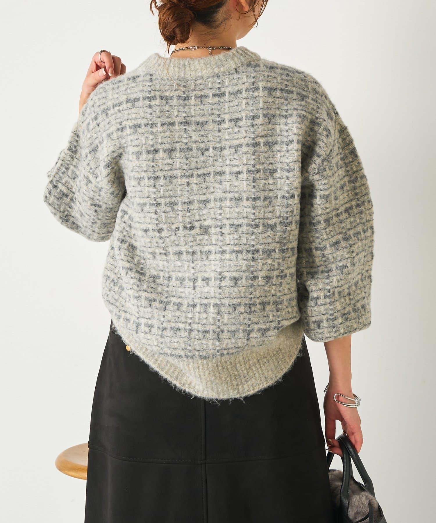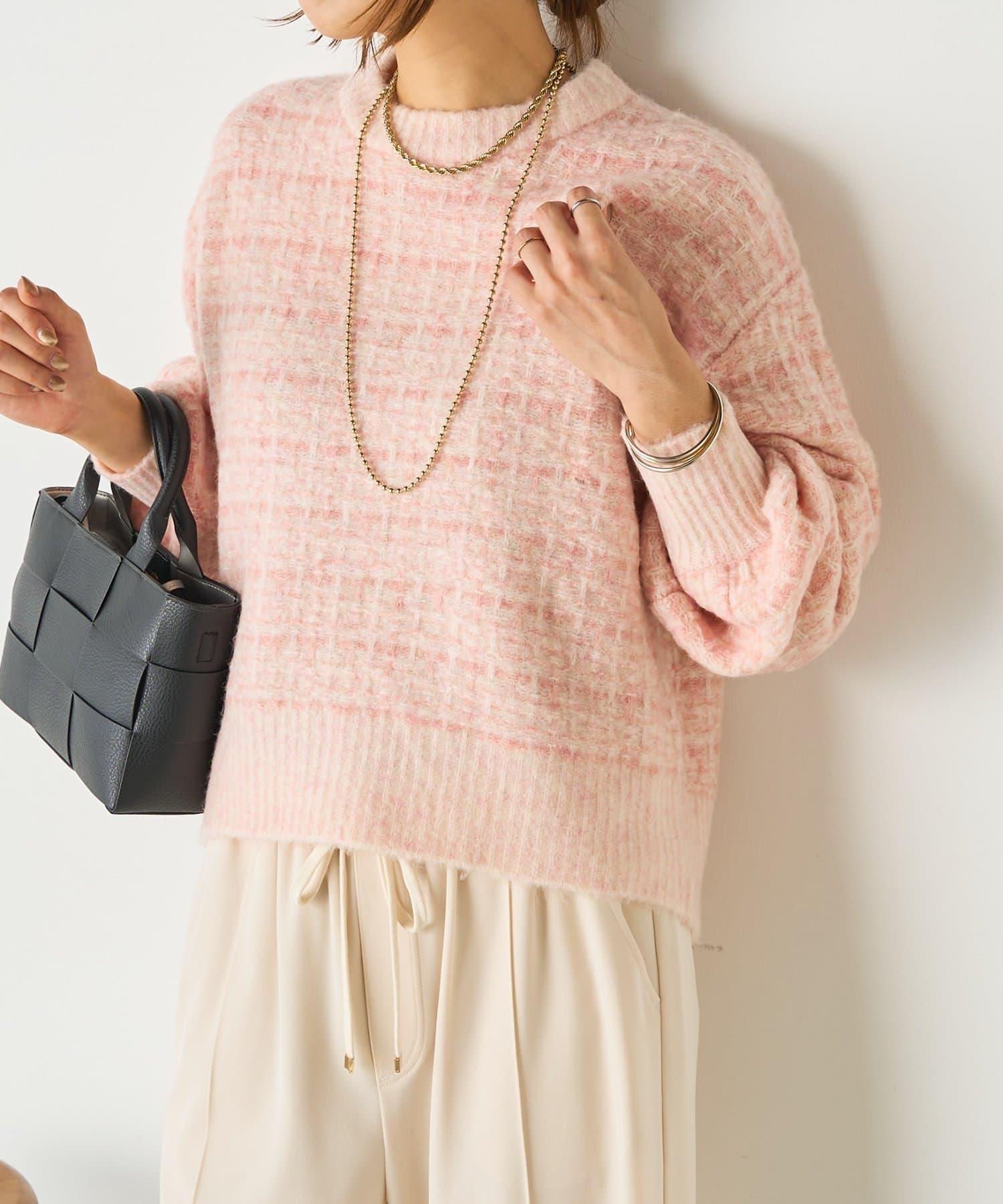 質地不均勻的針織面料非常搶眼,格子圓領針織面料。