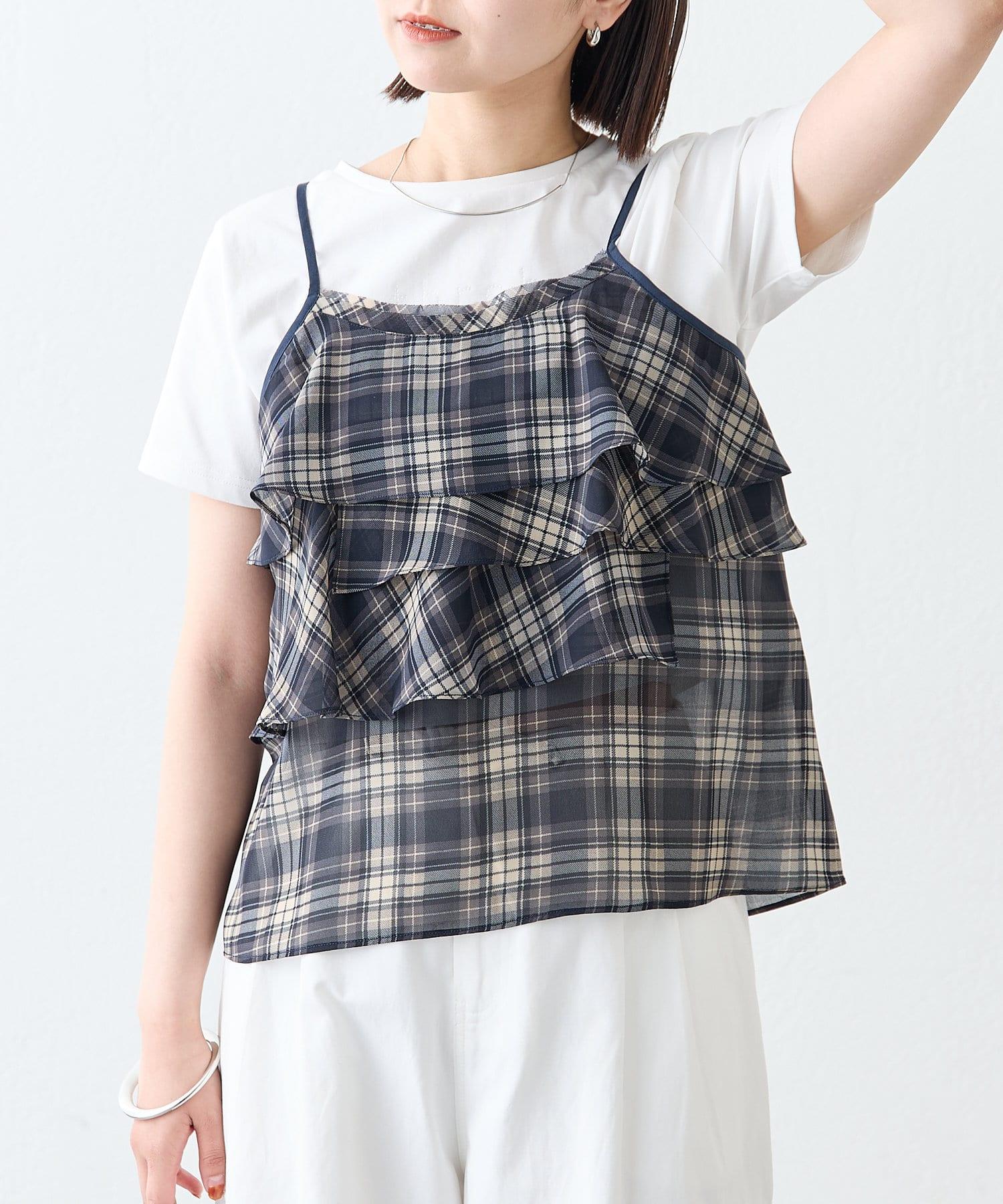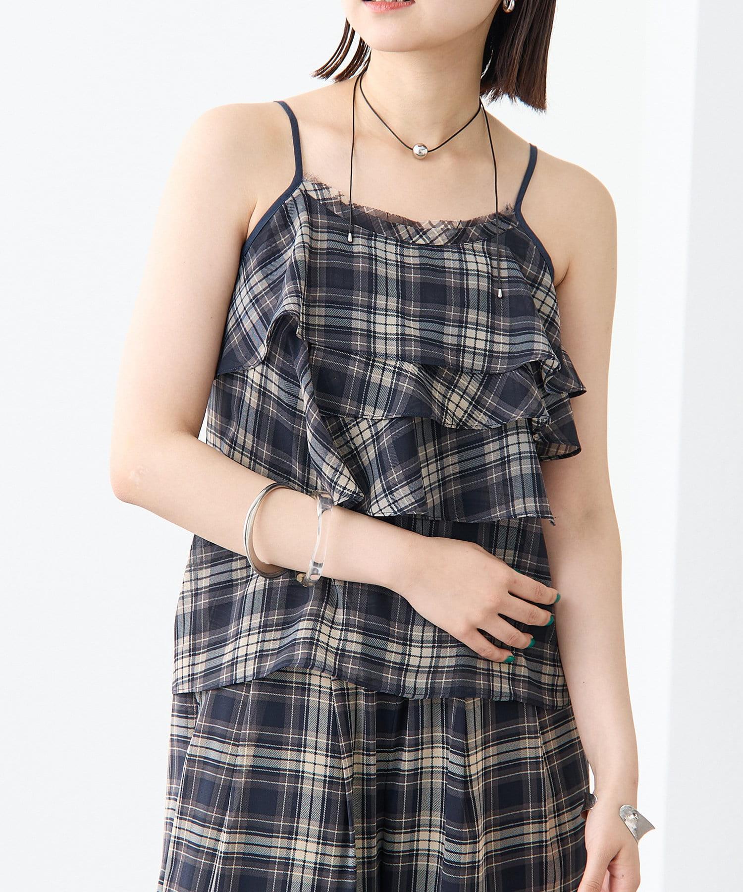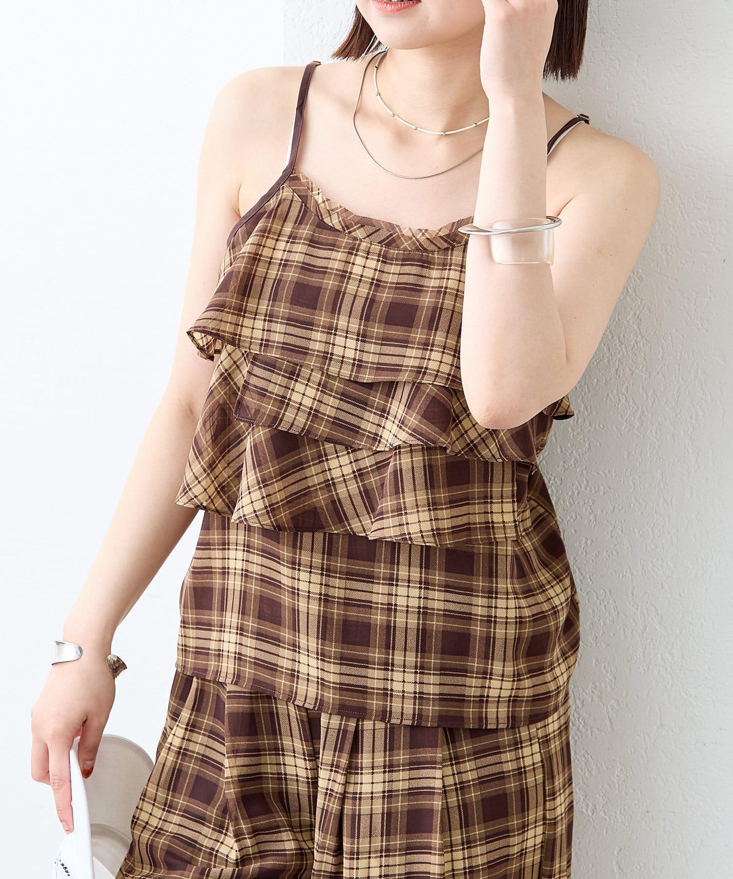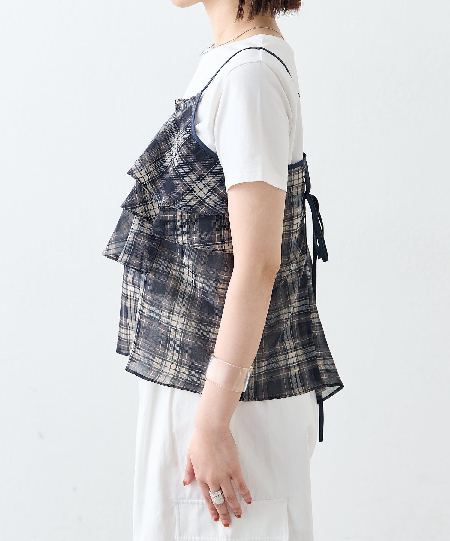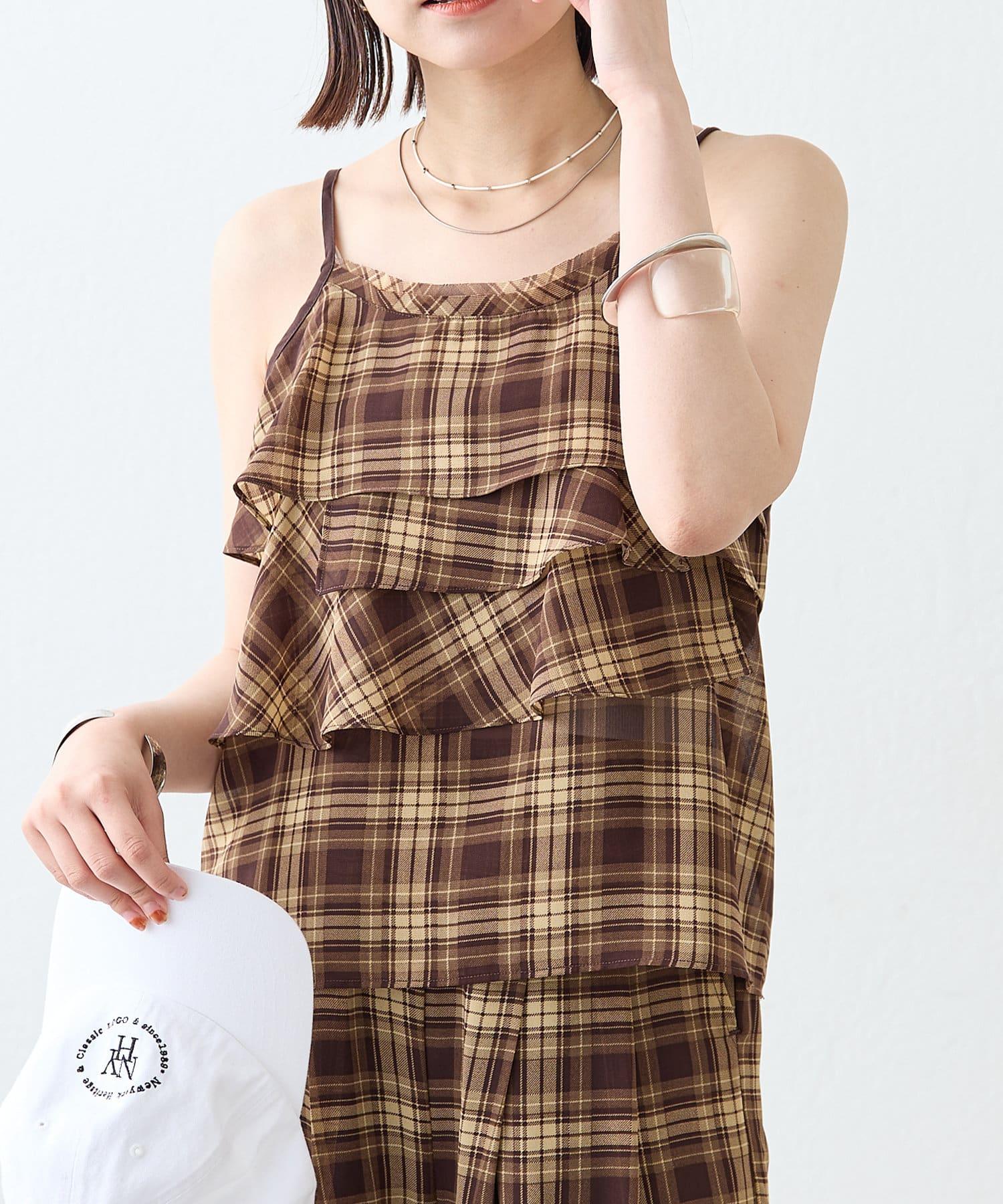 這是一款可愛的吊帶衫,結合了適度蓬鬆的荷葉邊和棋盤格圖案!
