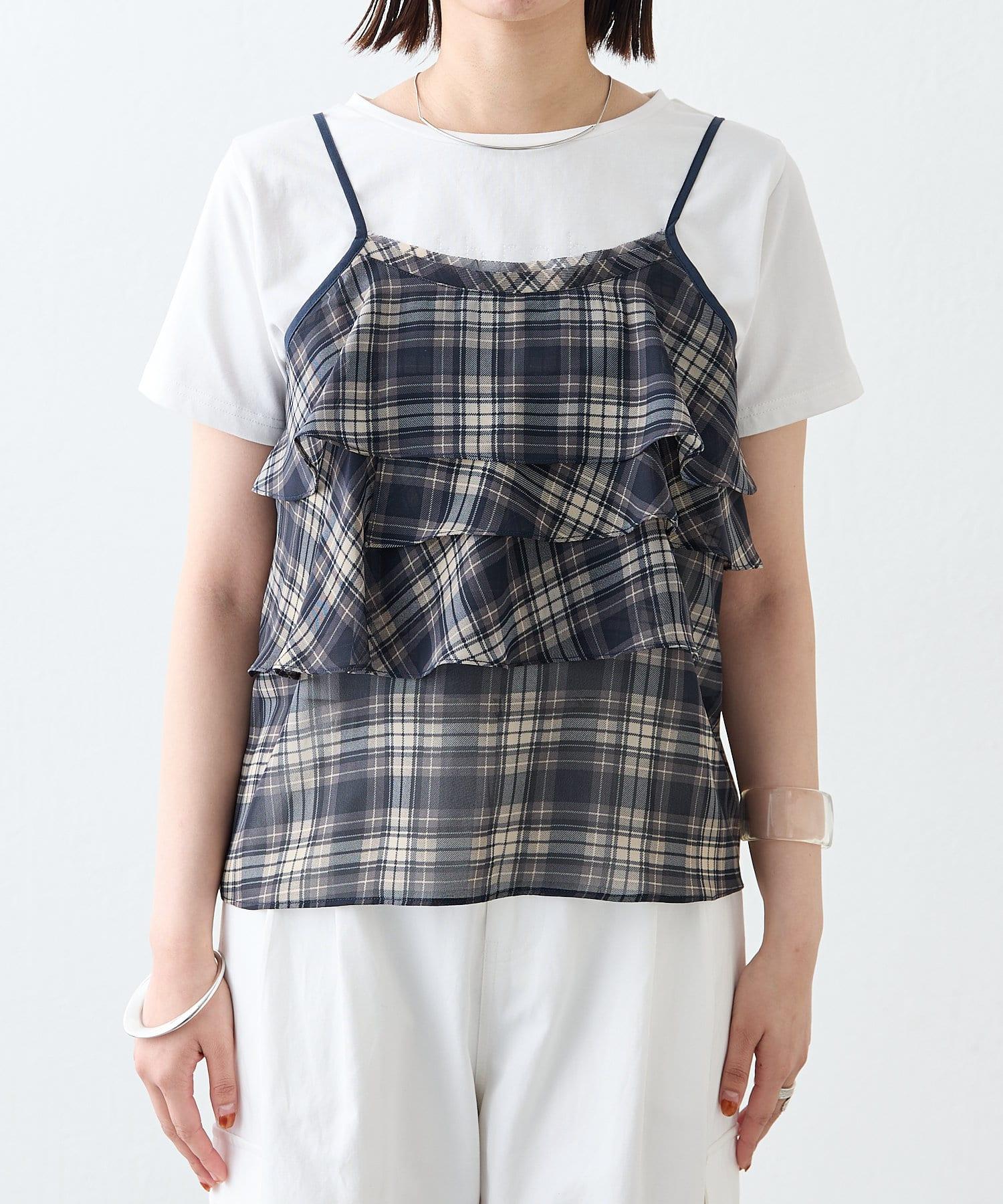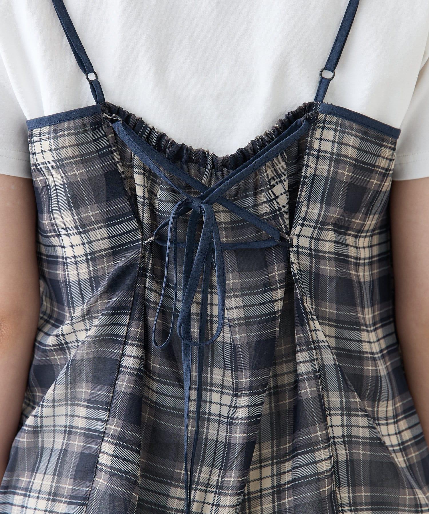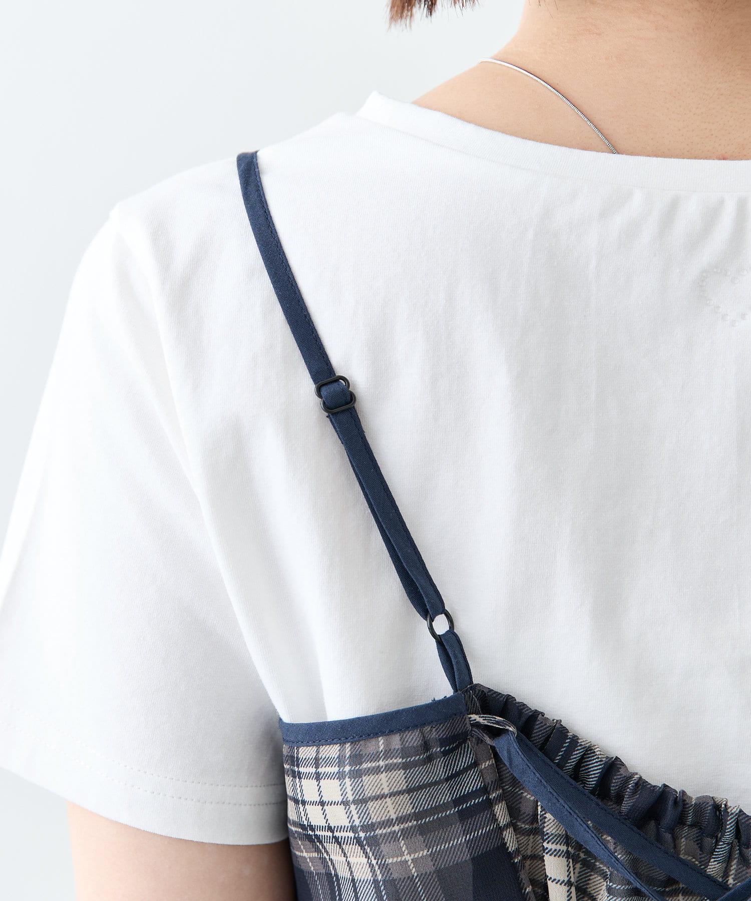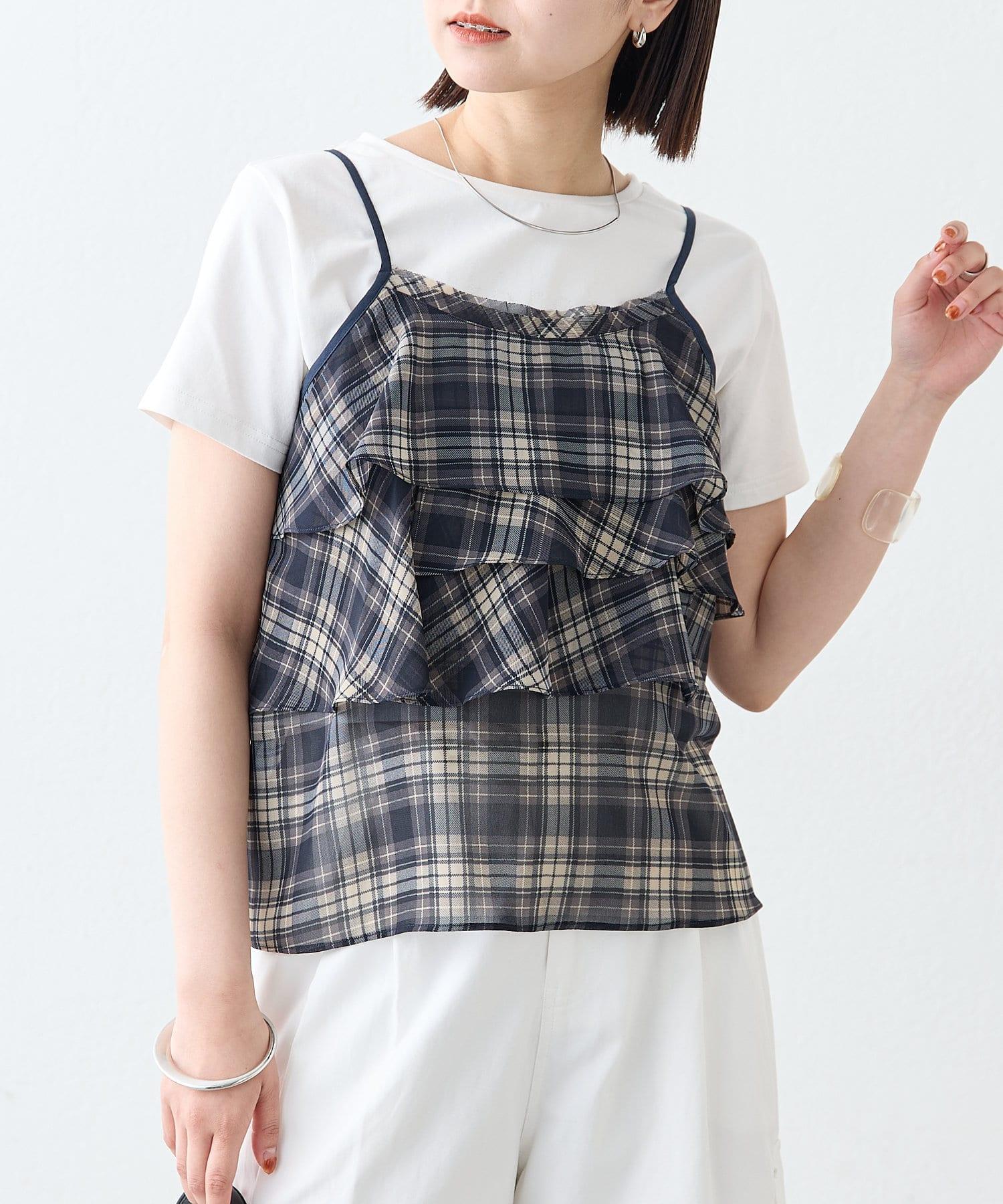 這是一款可愛的吊帶衫,結合了適度蓬鬆的荷葉邊和棋盤格圖案!