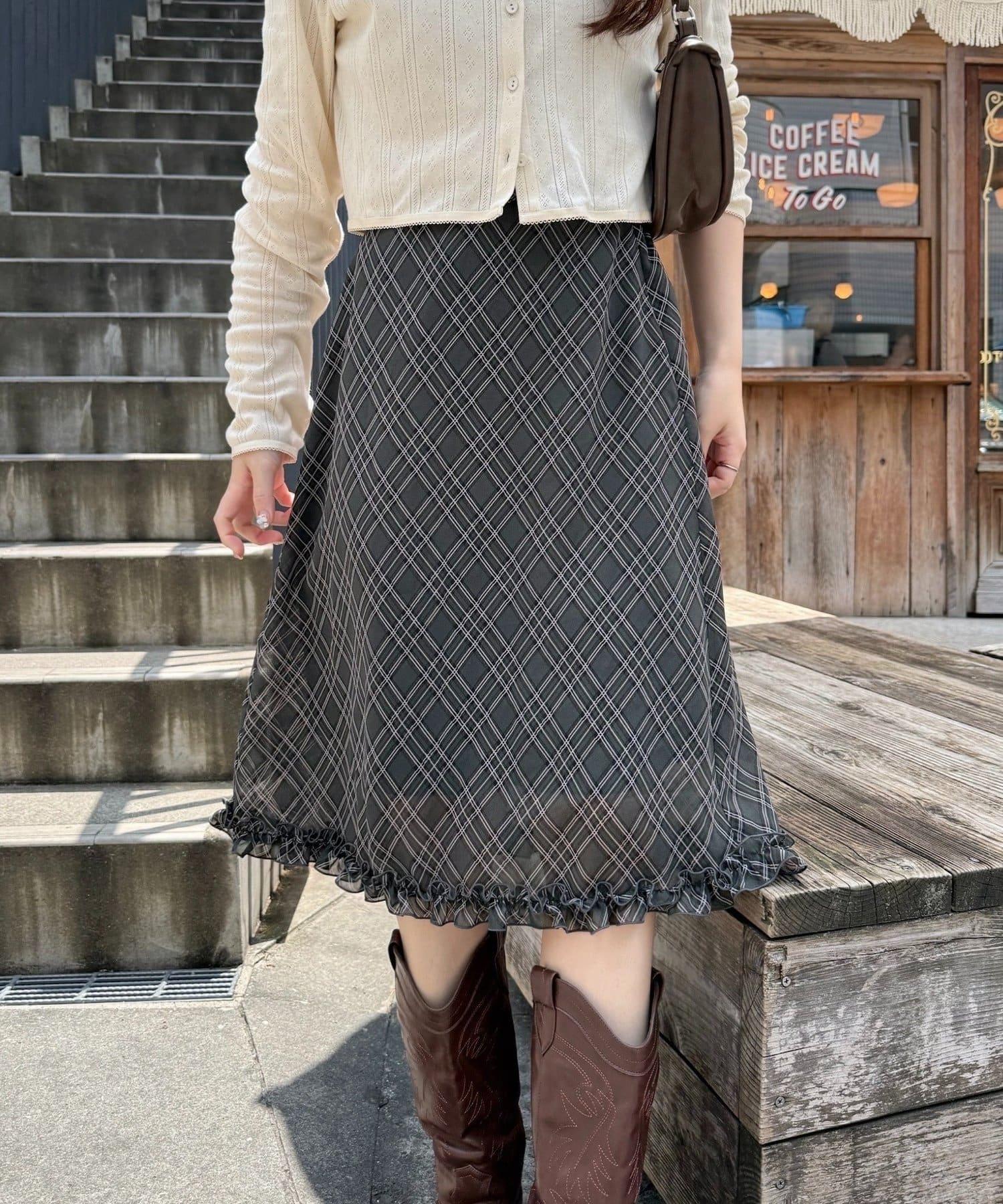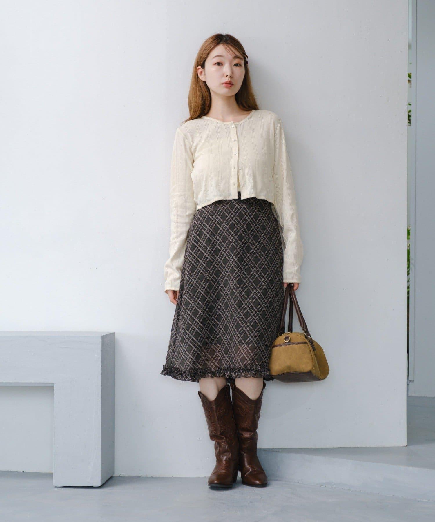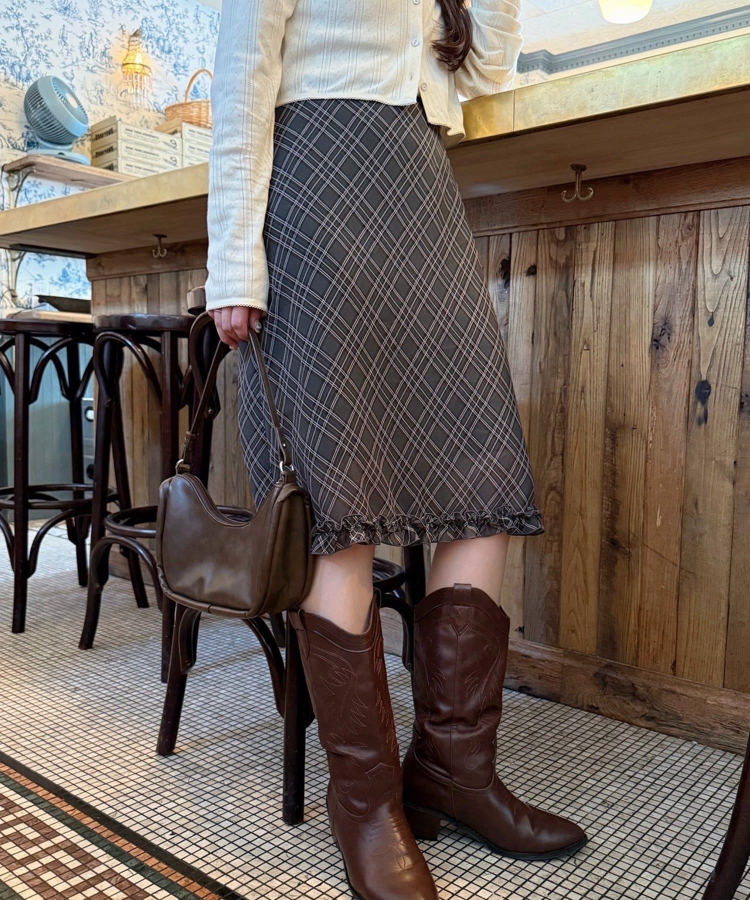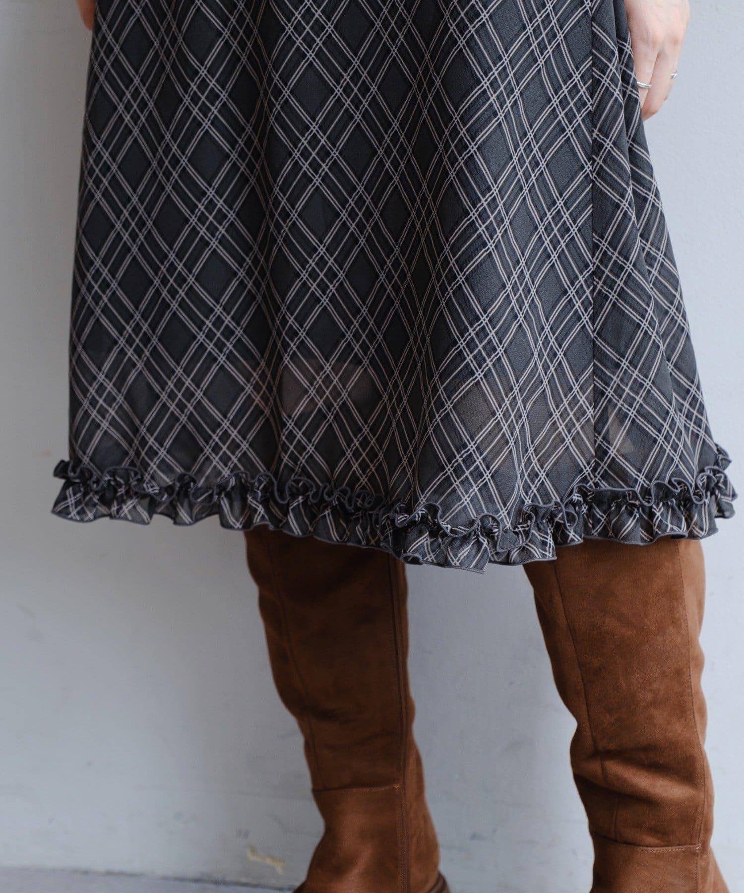 下襬的荷葉邊為色彩沉穩的格紋圖案增添了恰到好處的甜美感。