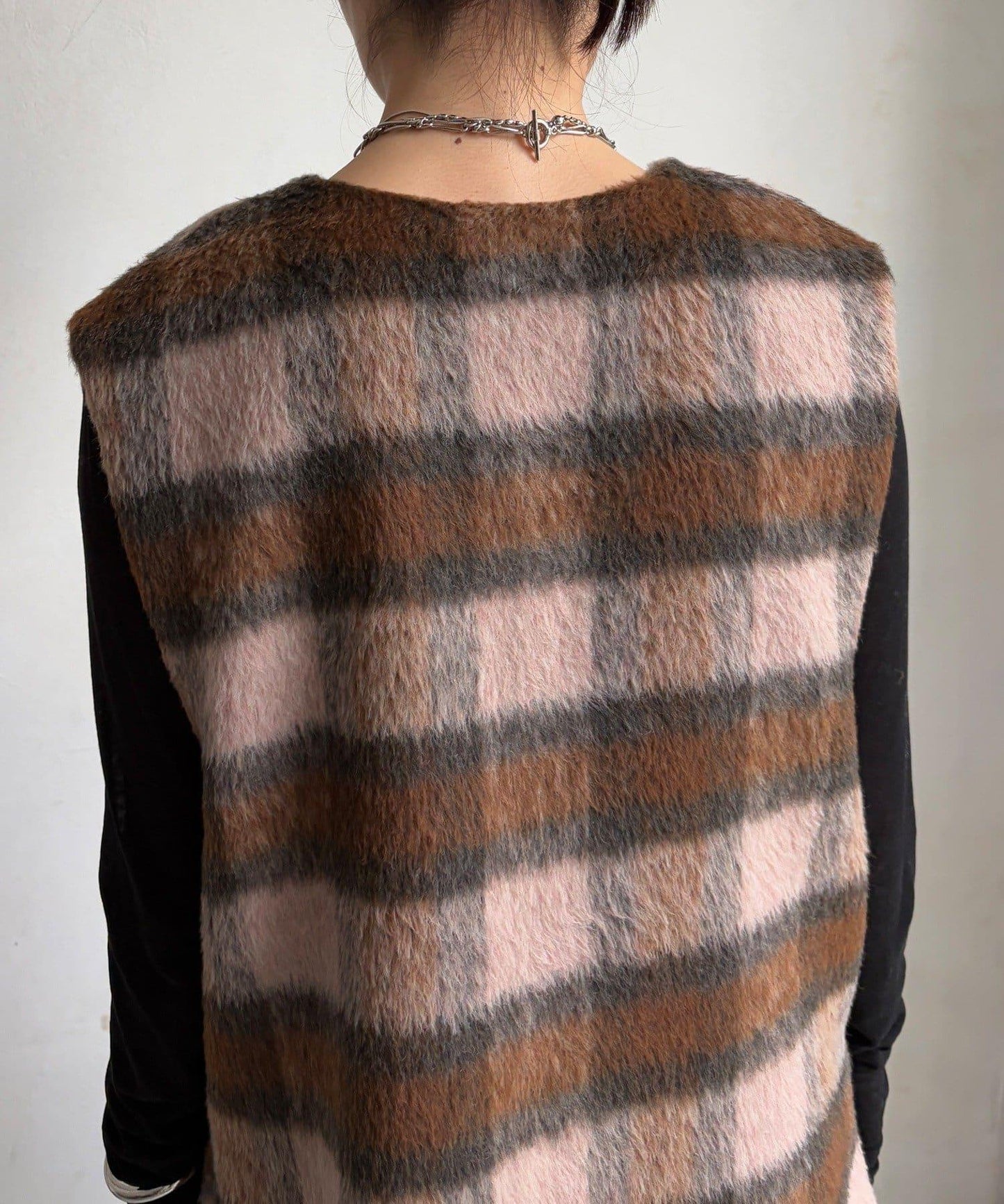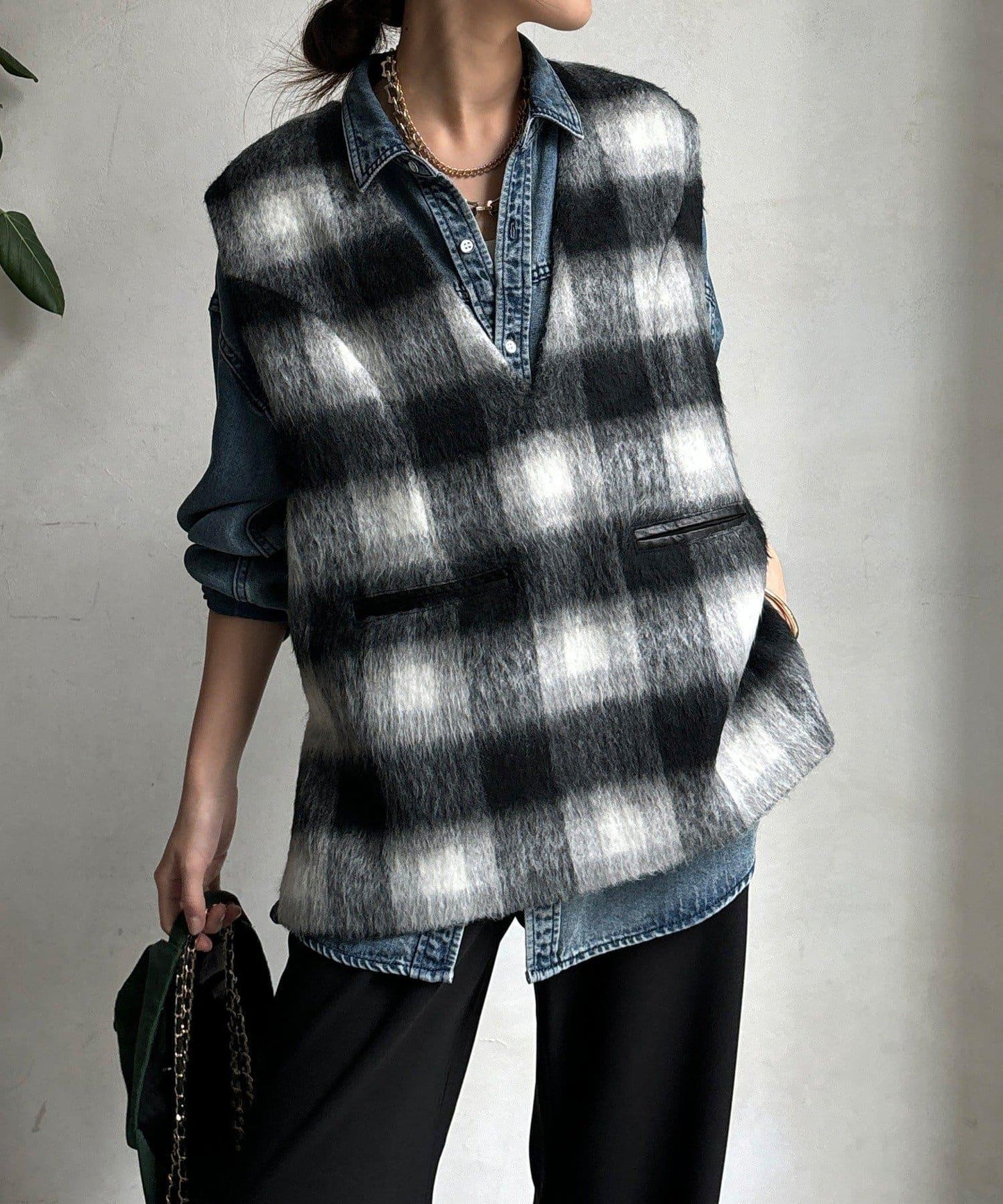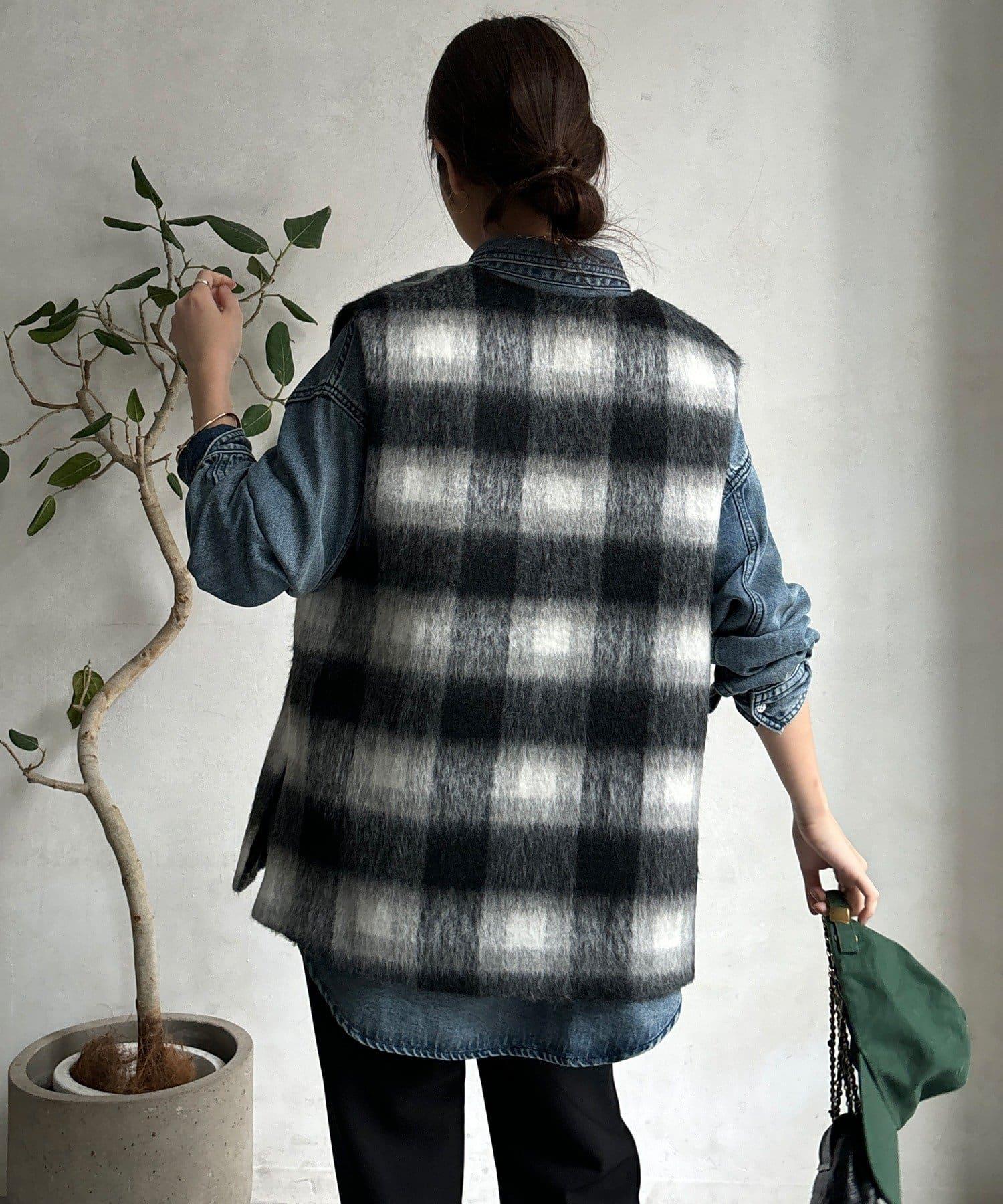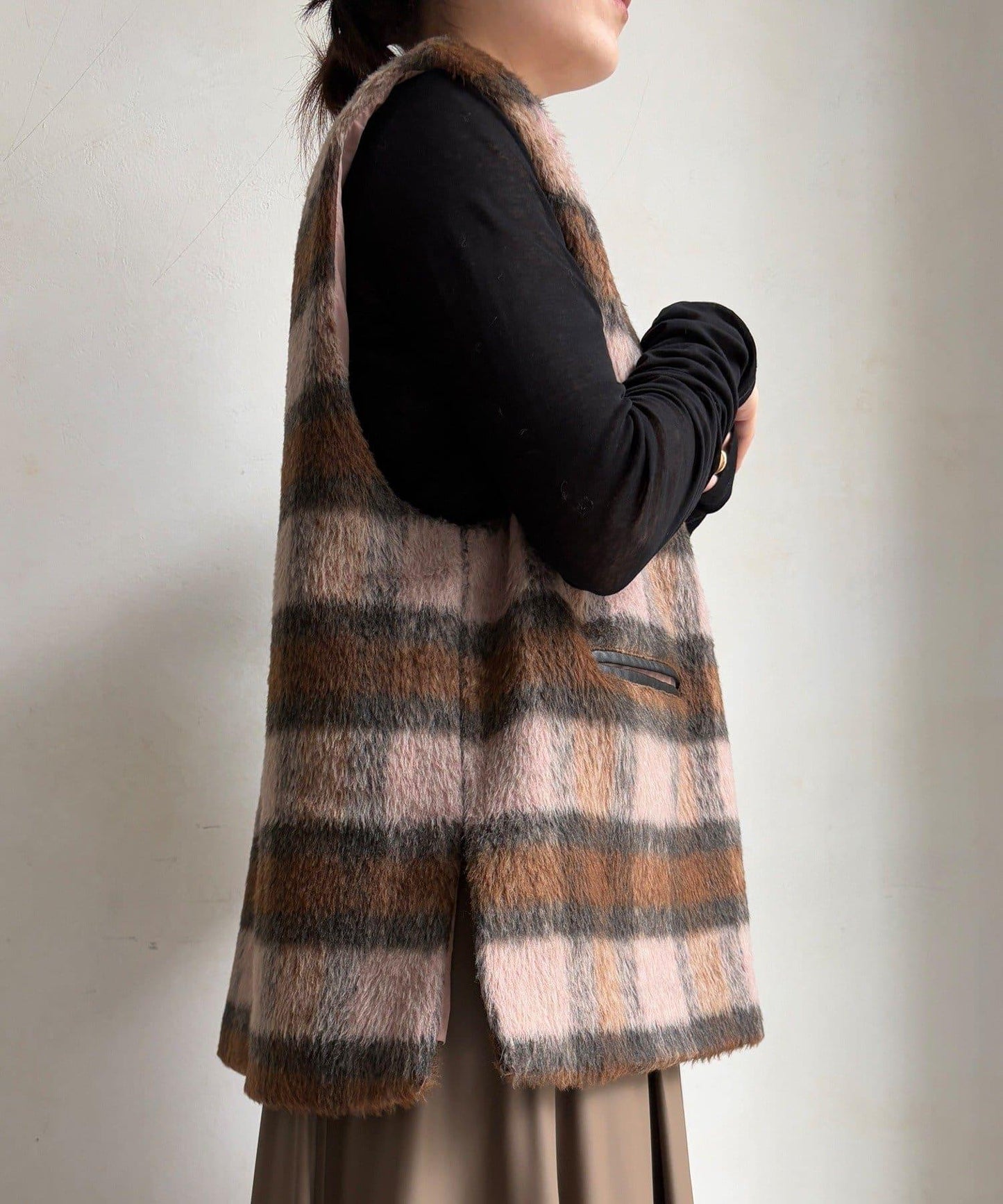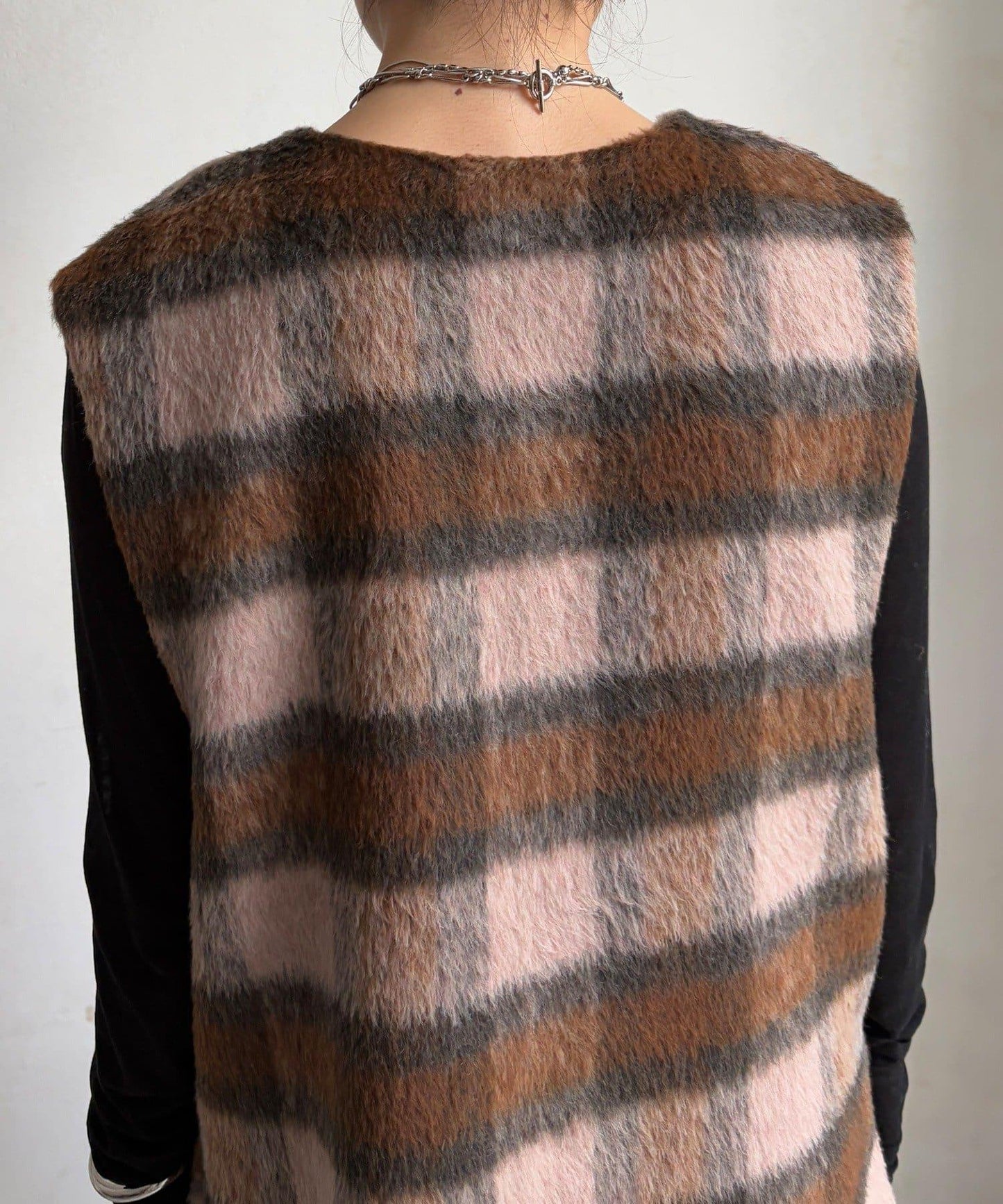 格紋馬甲採用毛茸茸的面料製成,手感蓬鬆舒適。