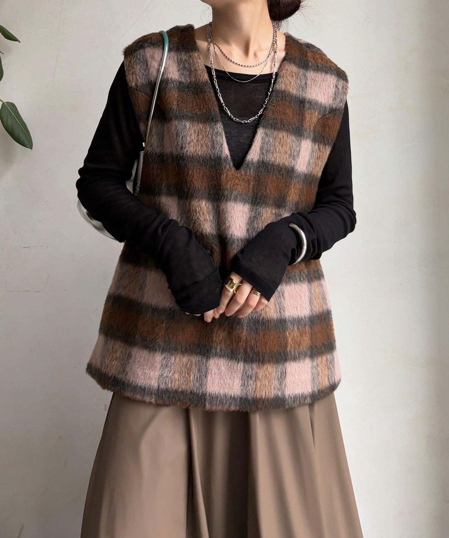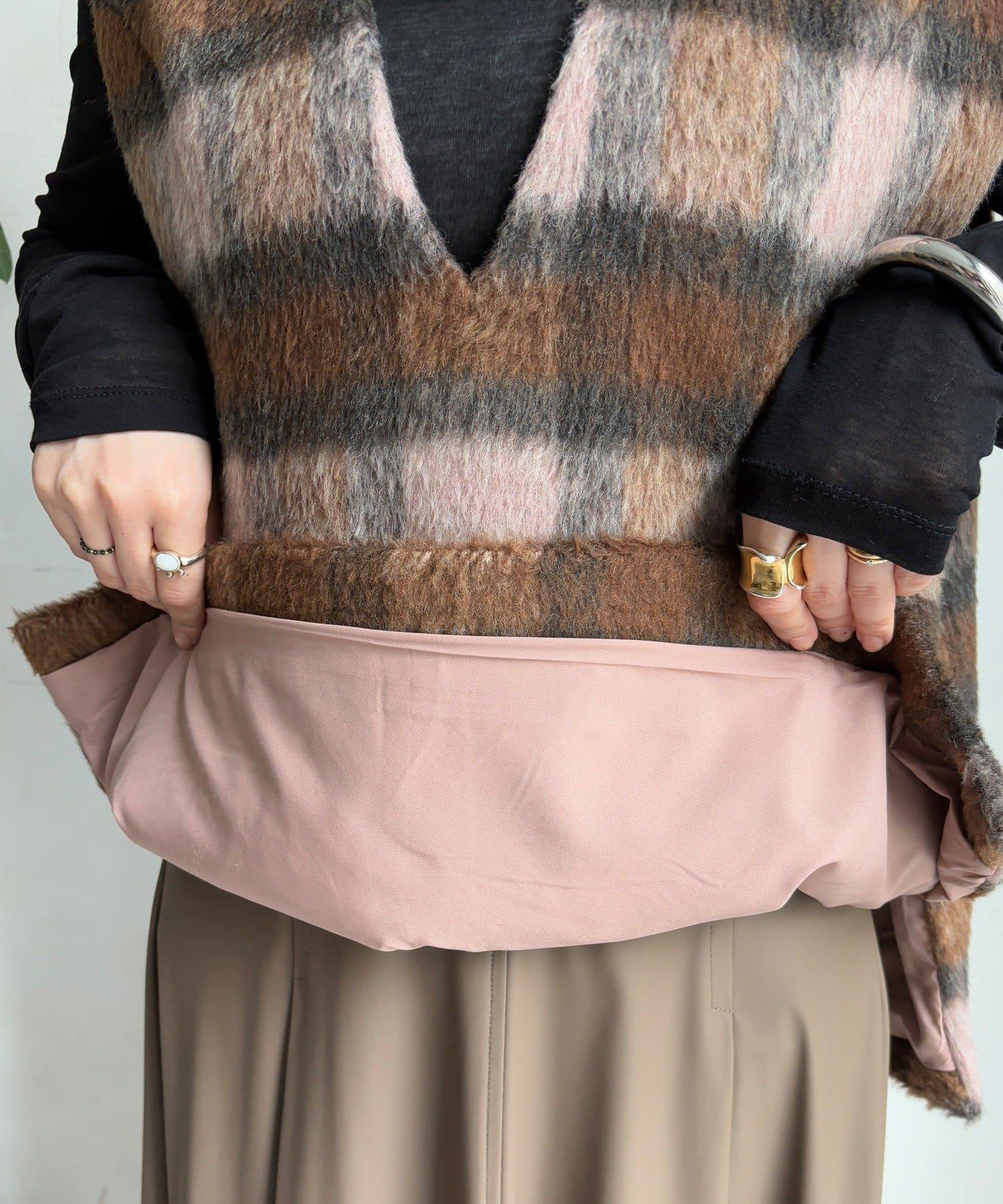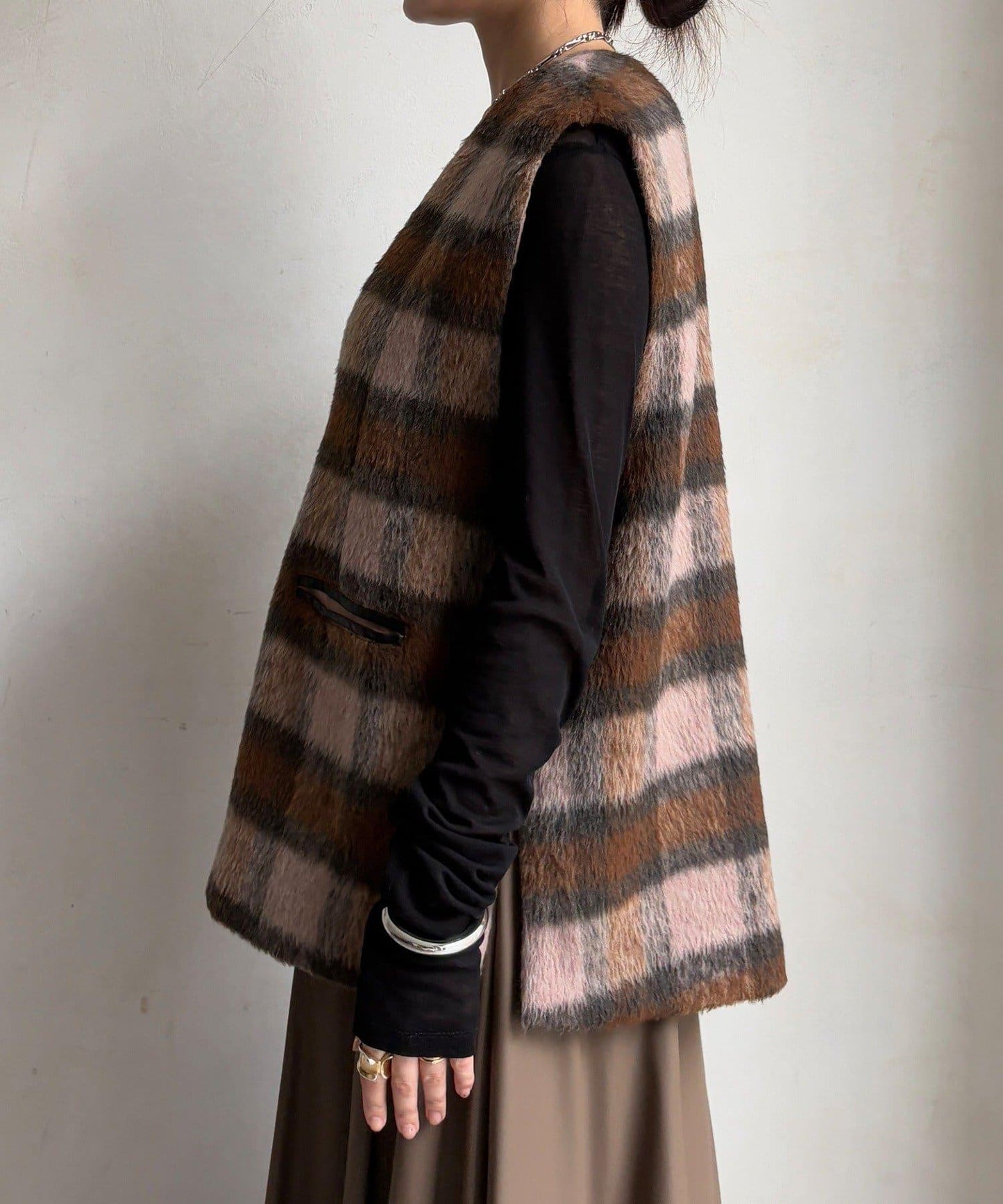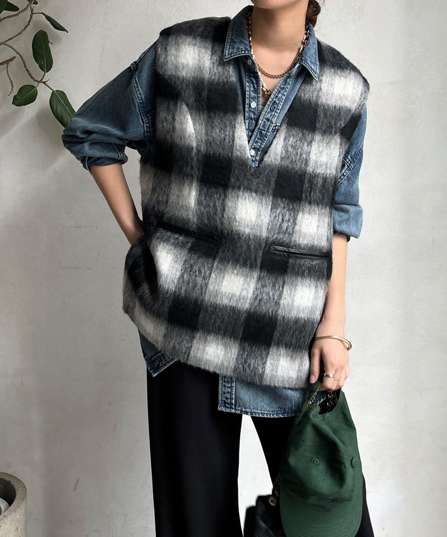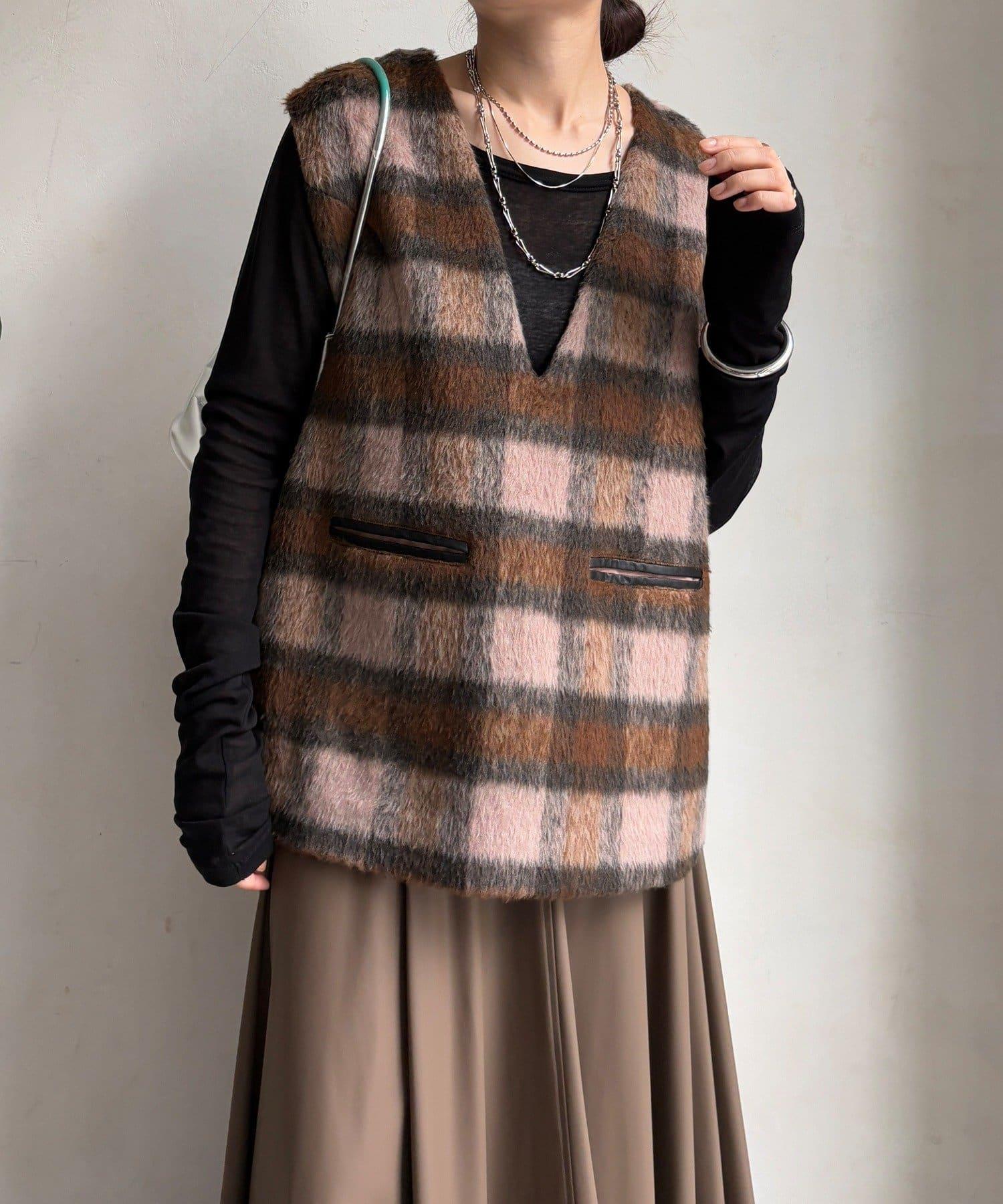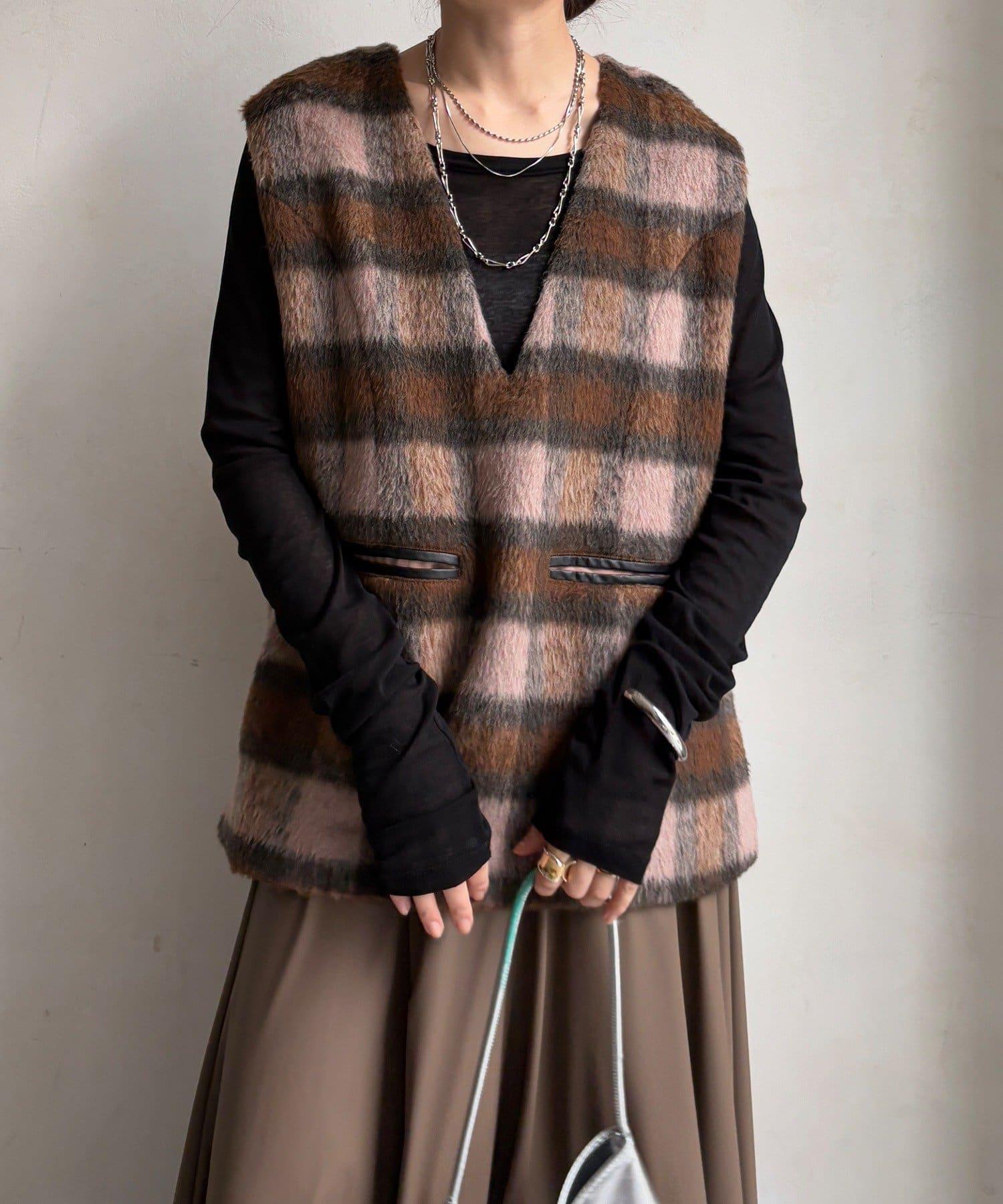 格紋馬甲採用毛茸茸的面料製成,手感蓬鬆舒適。