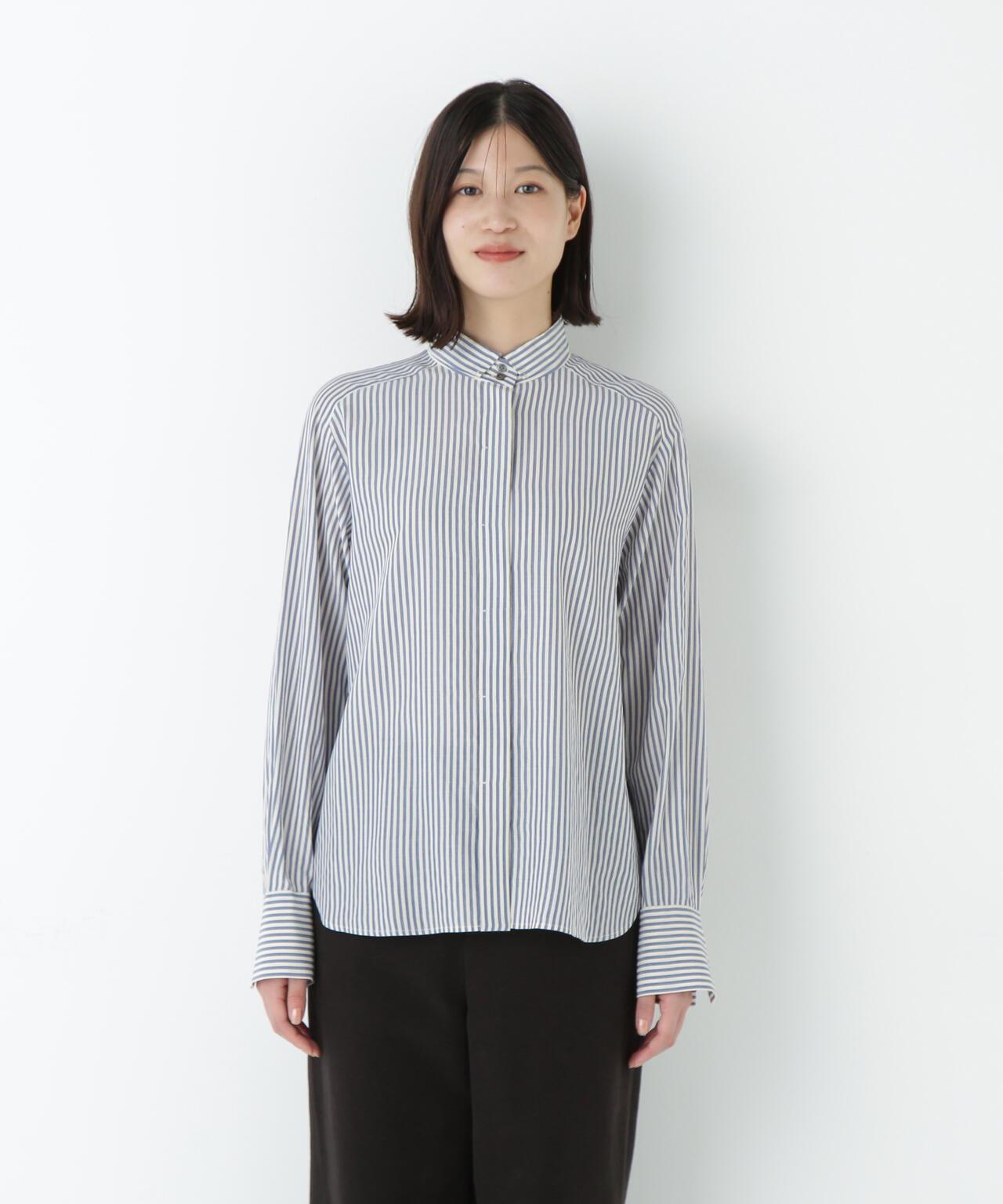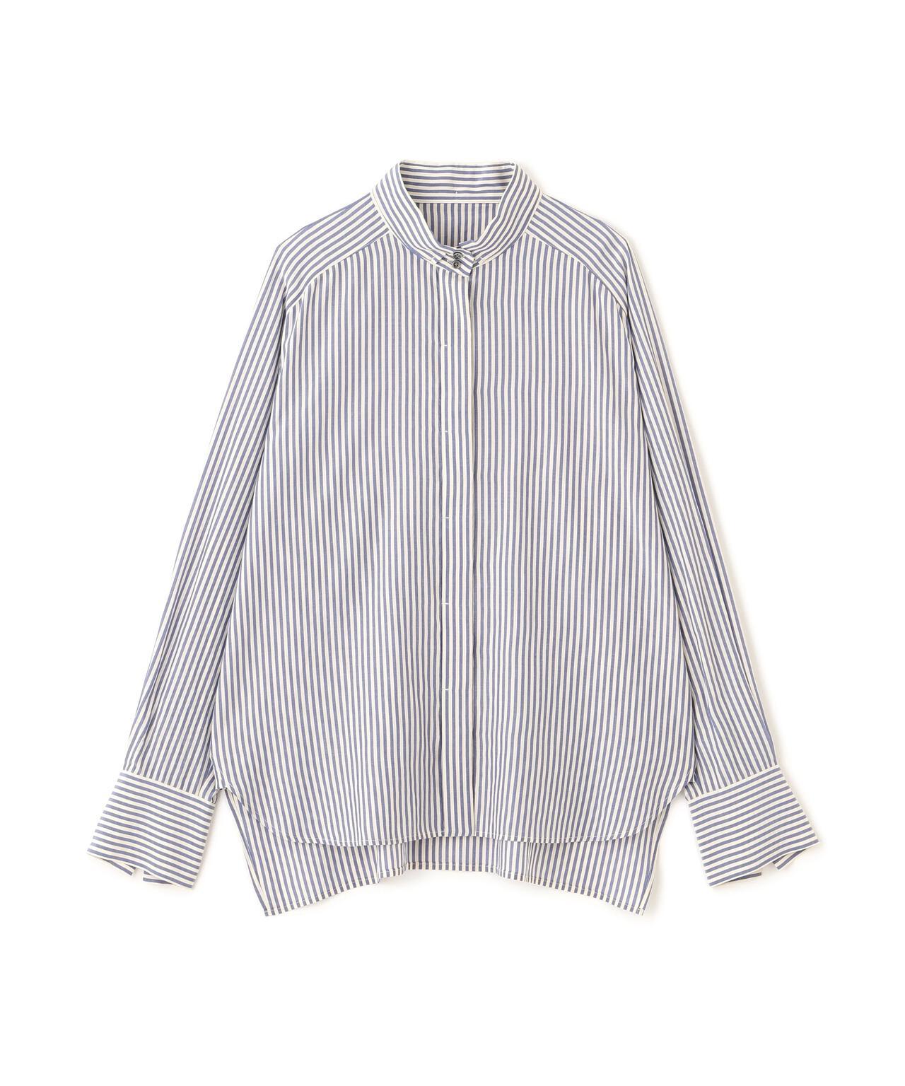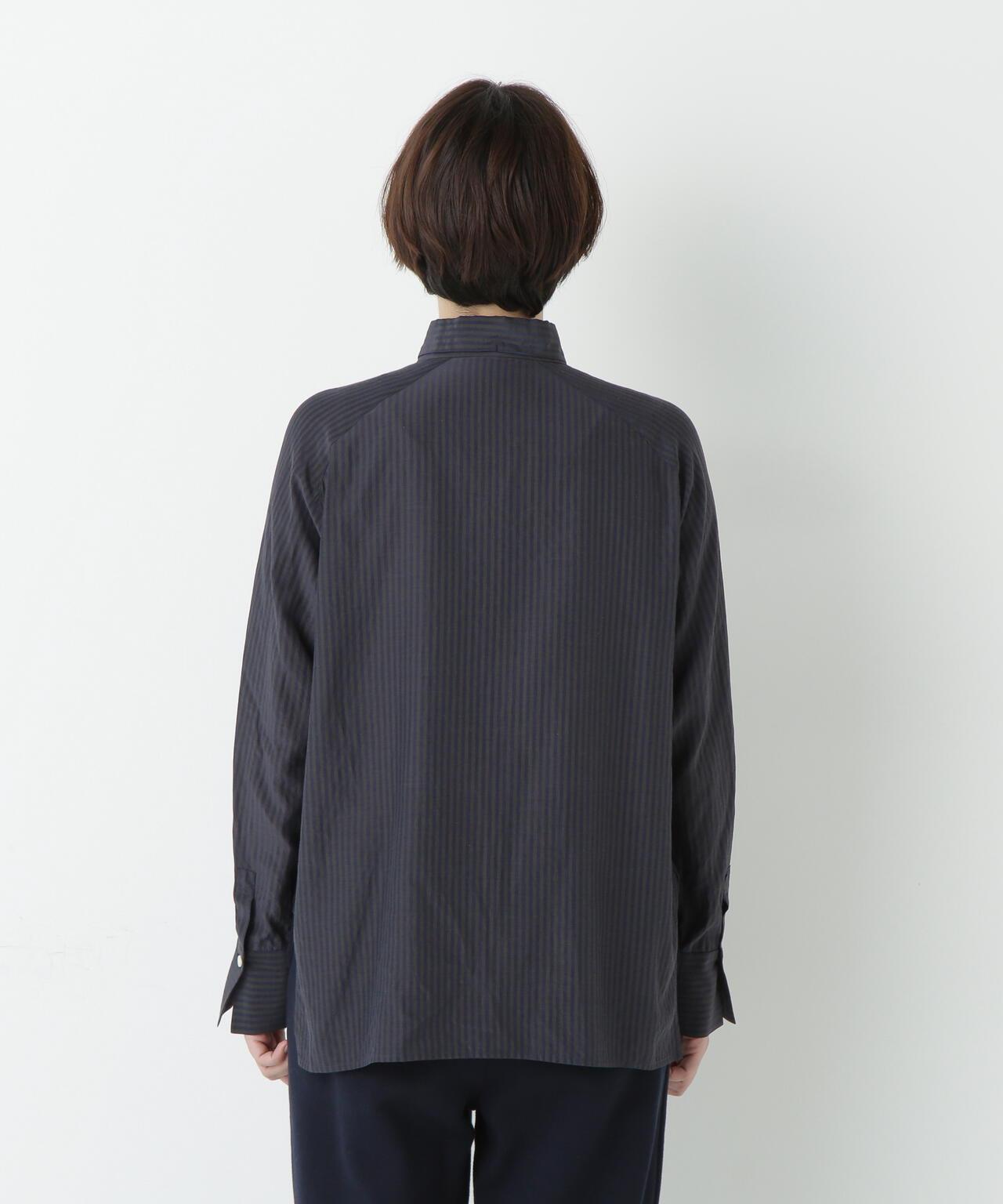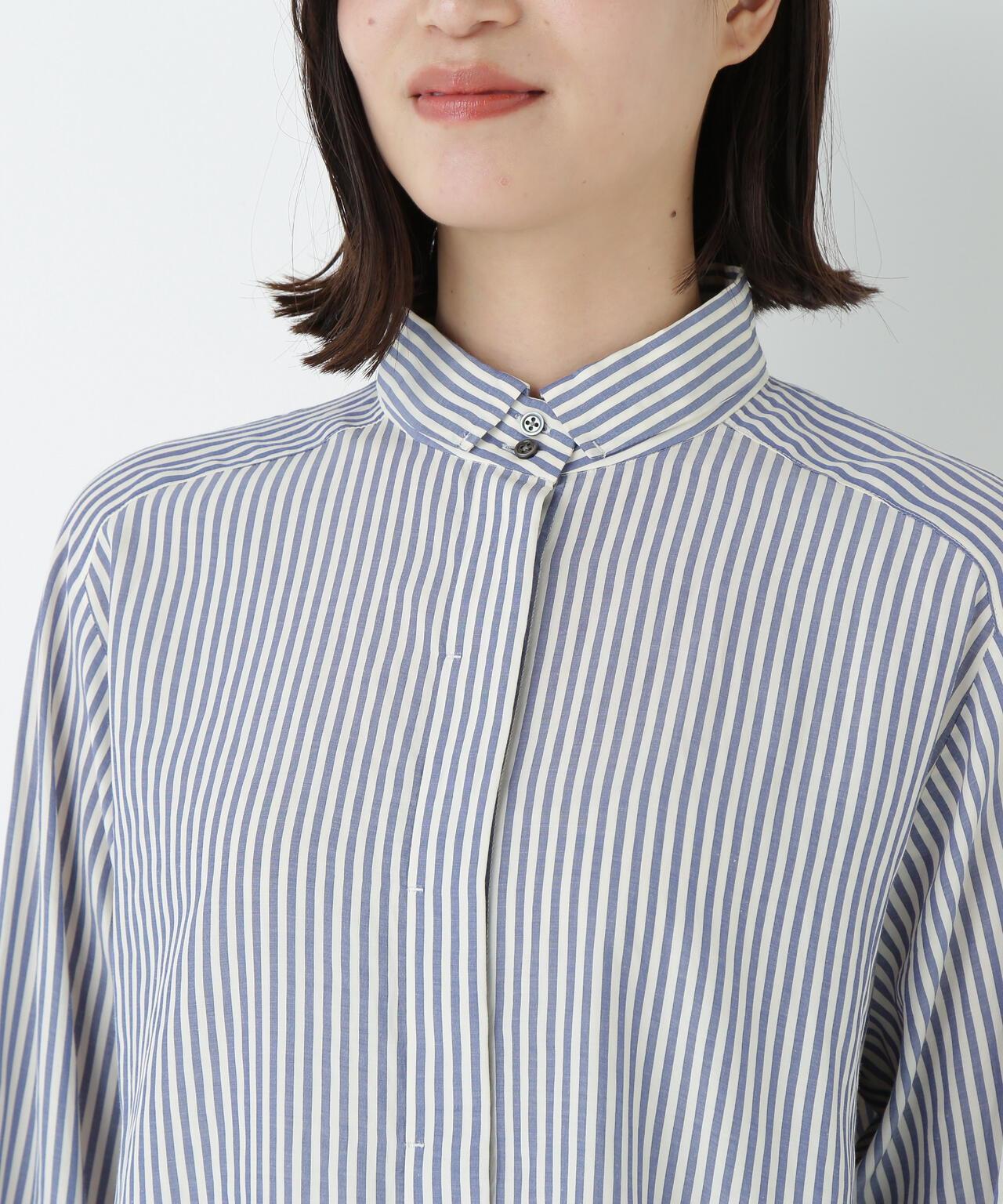 條紋襯衫,自然整潔 [設計要點] 條紋卷邊高領襯衫,寬鬆適度。肩章式插肩袖也是一大亮點。襯衫後背的長度可以遮住臀部。條紋面料既有有機棉的天然質感,又有醋酸纖維的涼爽和人造絲的飄逸。推薦座標] 柔軟的面料既可以單穿,也可以作為針織套頭衫和其他服裝的內層。這款上衣四季皆宜。