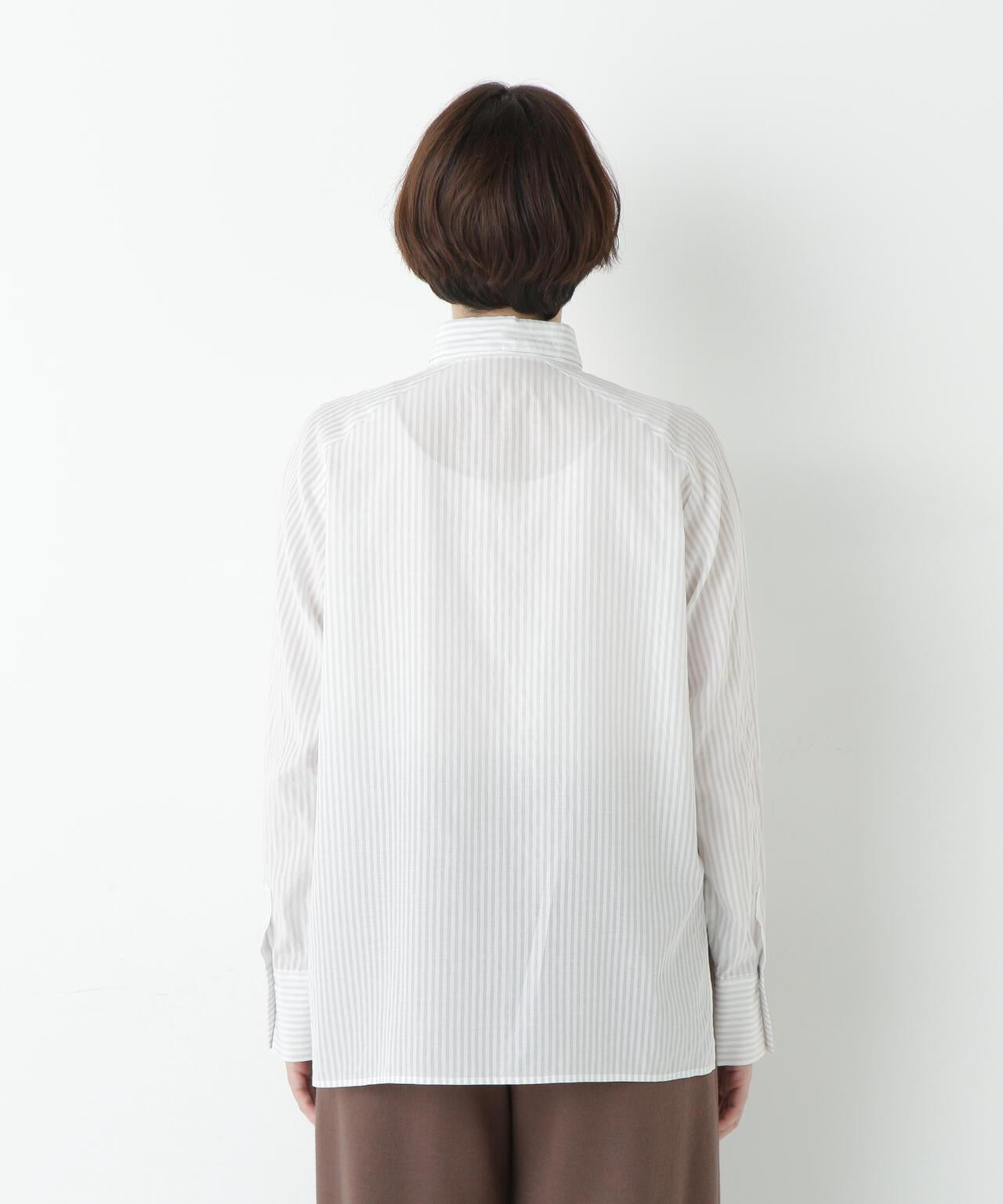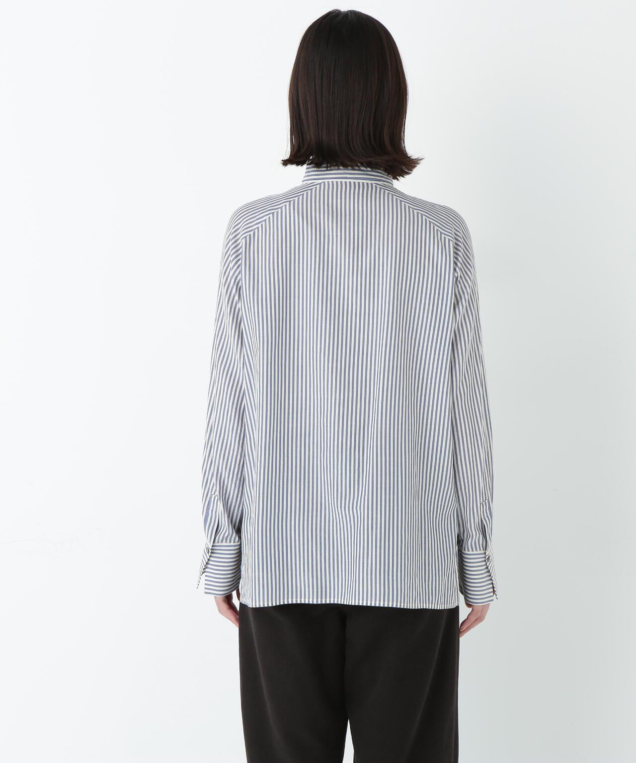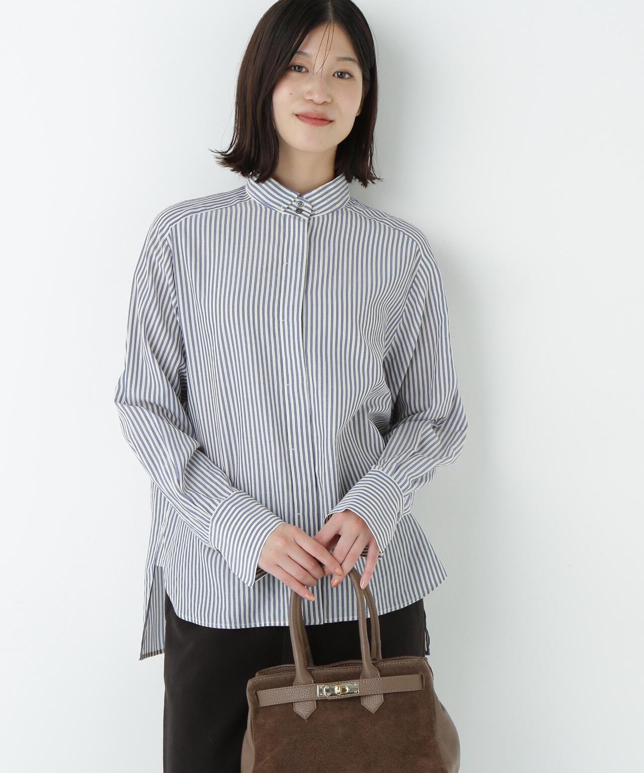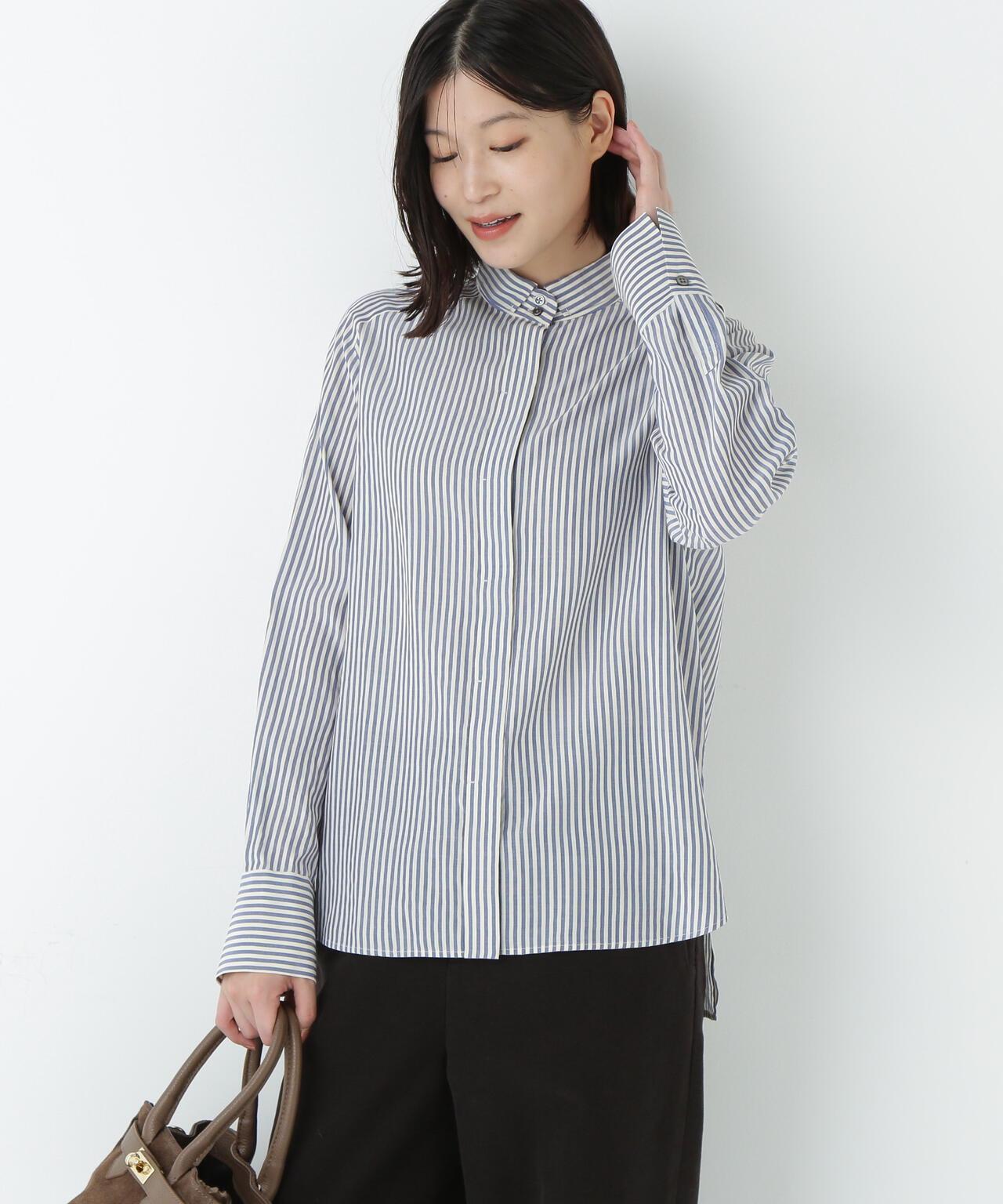 條紋襯衫,自然整潔 [設計要點] 條紋卷邊高領襯衫,寬鬆適度。肩章式插肩袖也是一大亮點。襯衫後背的長度可以遮住臀部。條紋面料既有有機棉的天然質感,又有醋酸纖維的涼爽和人造絲的飄逸。推薦座標] 柔軟的面料既可以單穿,也可以作為針織套頭衫和其他服裝的內層。這款上衣四季皆宜。