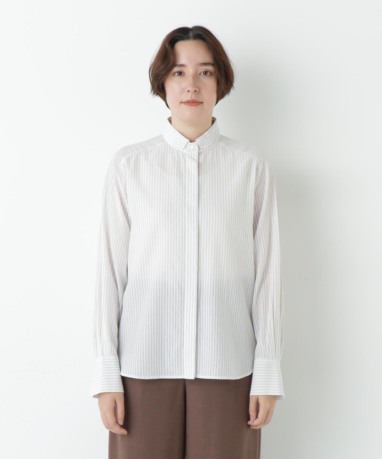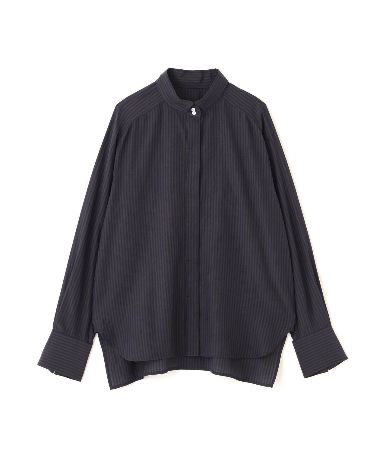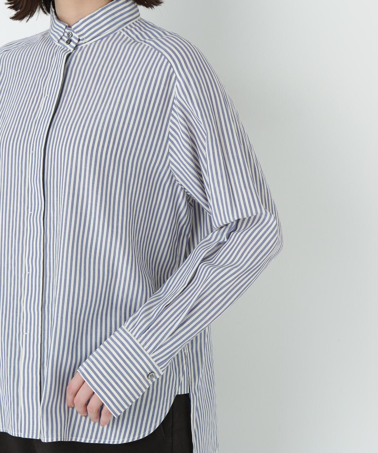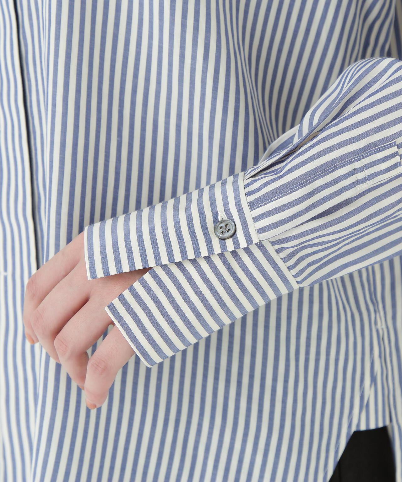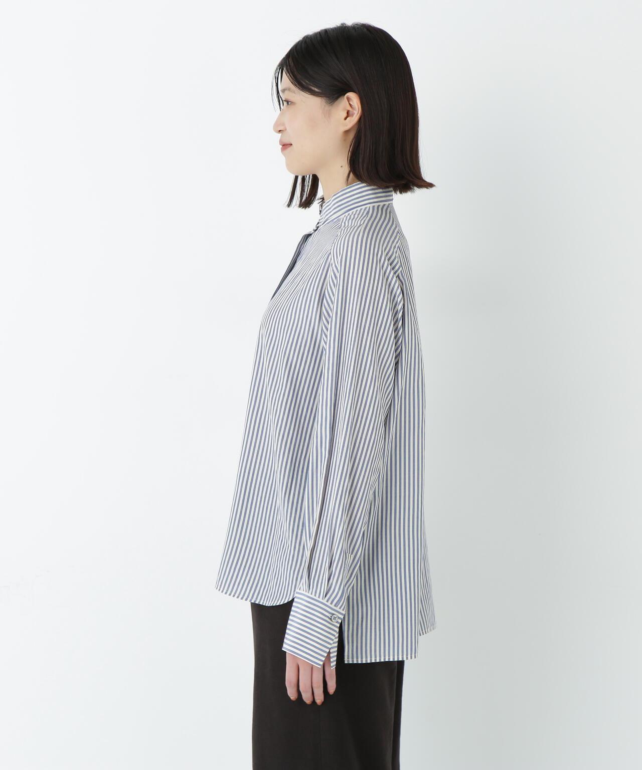 條紋襯衫,自然整潔 [設計要點] 條紋卷邊高領襯衫,寬鬆適度。肩章式插肩袖也是一大亮點。襯衫後背的長度可以遮住臀部。條紋面料既有有機棉的天然質感,又有醋酸纖維的涼爽和人造絲的飄逸。推薦座標] 柔軟的面料既可以單穿,也可以作為針織套頭衫和其他服裝的內層。這款上衣四季皆宜。