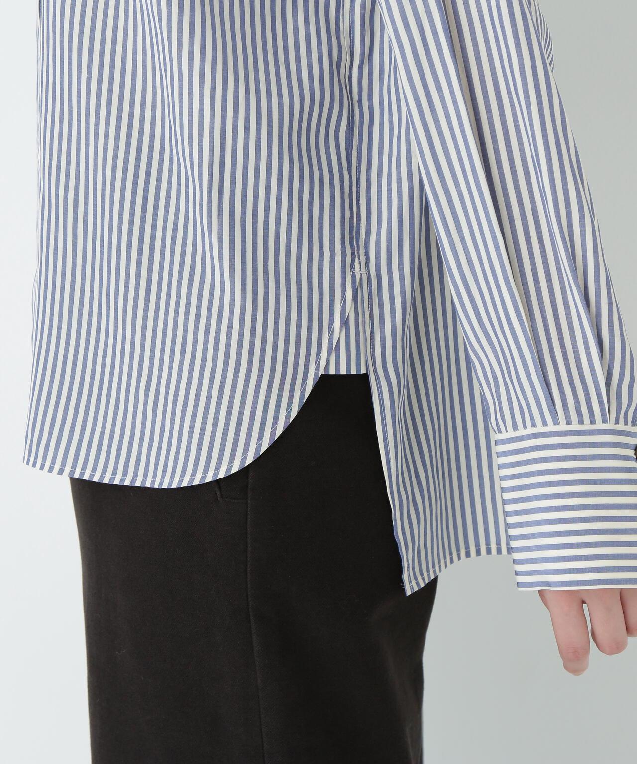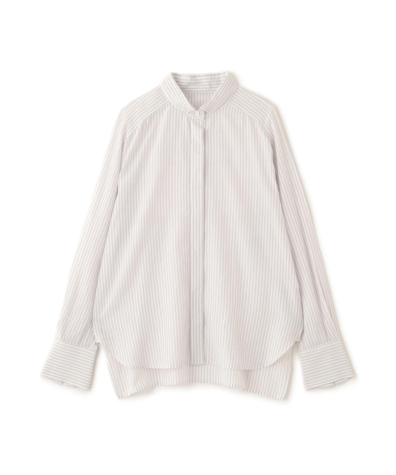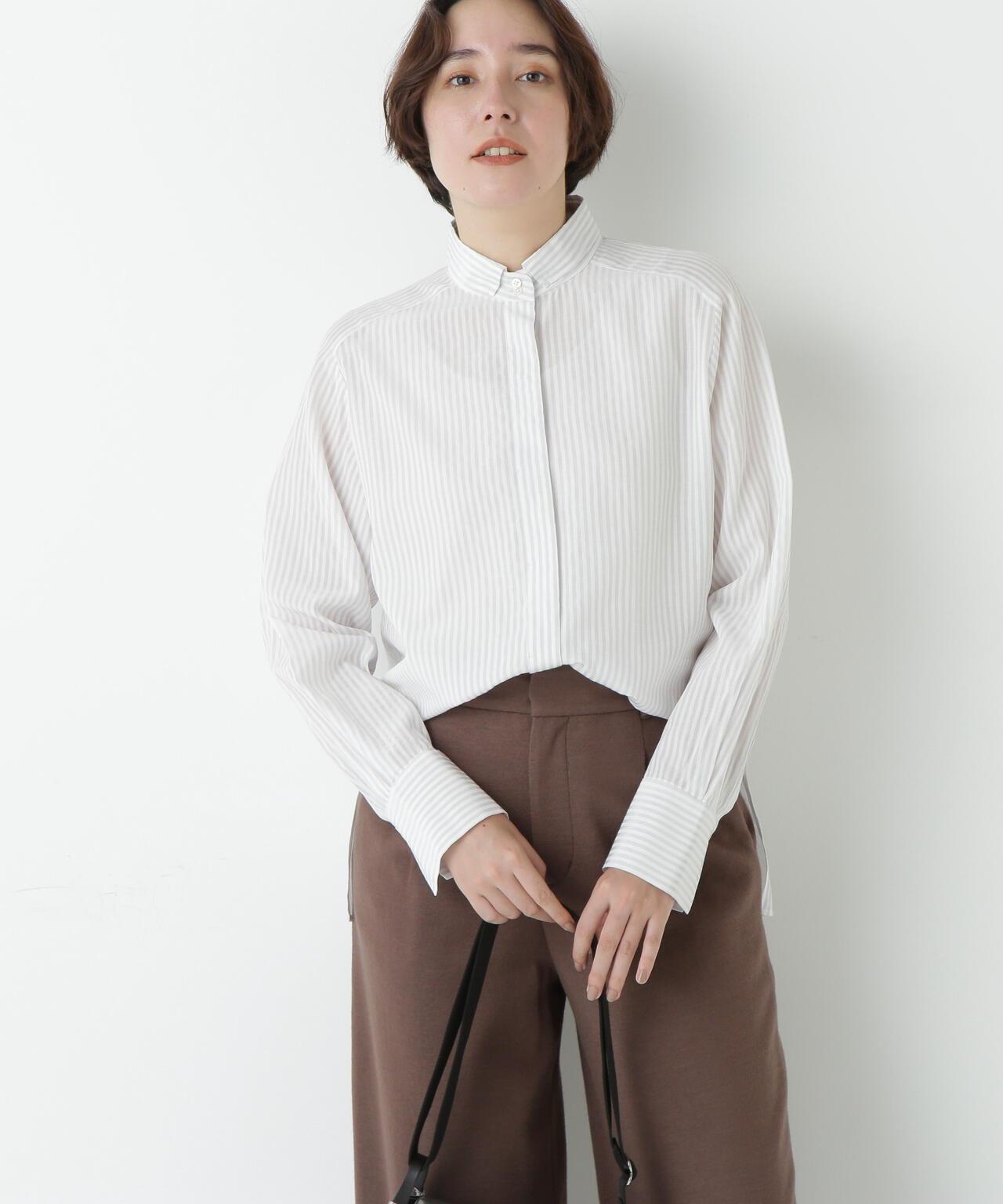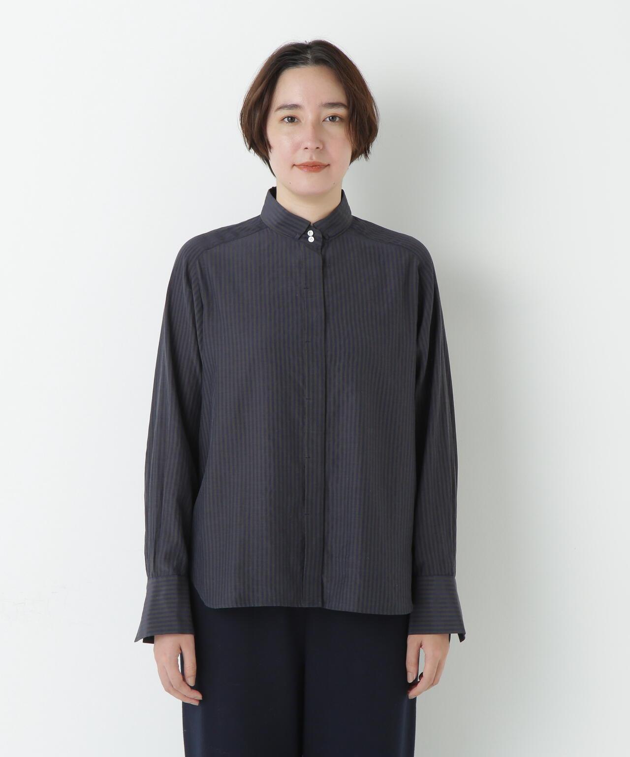 條紋襯衫,自然整潔 [設計要點] 條紋卷邊高領襯衫,寬鬆適度。肩章式插肩袖也是一大亮點。襯衫後背的長度可以遮住臀部。條紋面料既有有機棉的天然質感,又有醋酸纖維的涼爽和人造絲的飄逸。推薦座標] 柔軟的面料既可以單穿,也可以作為針織套頭衫和其他服裝的內層。這款上衣四季皆宜。