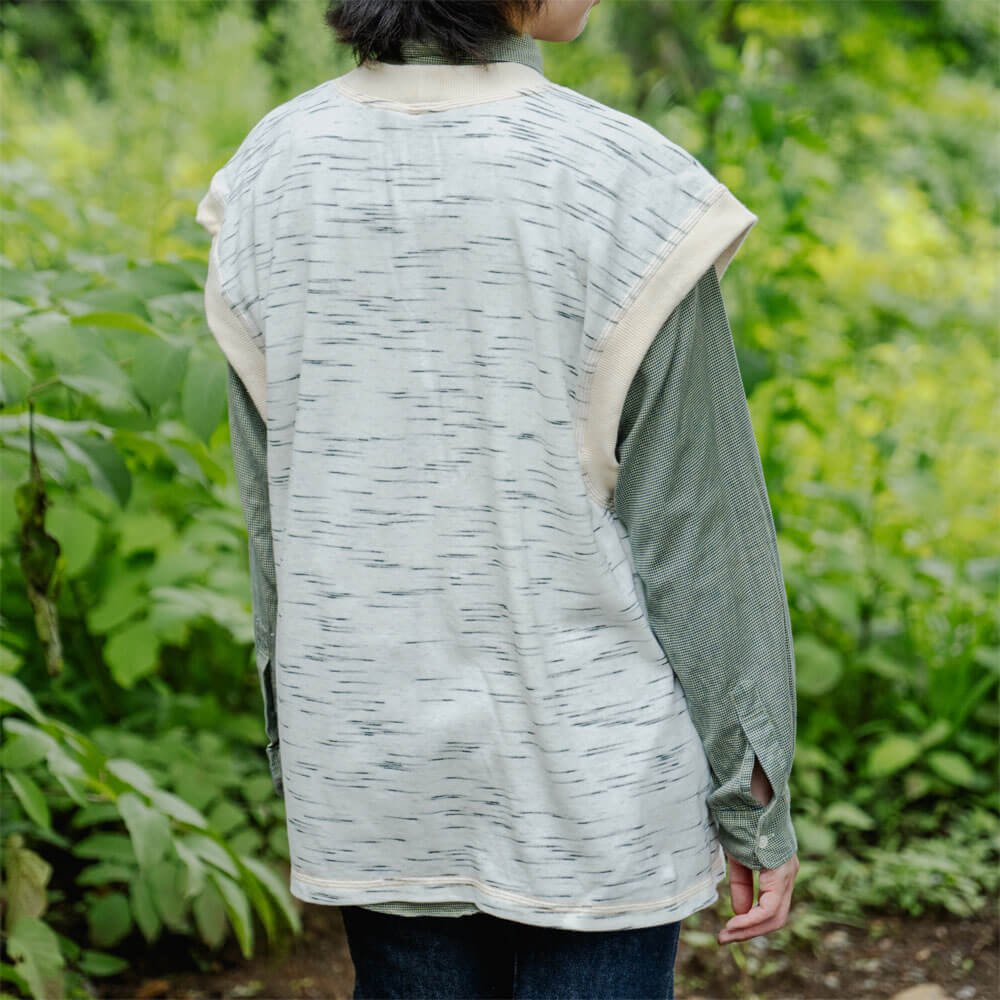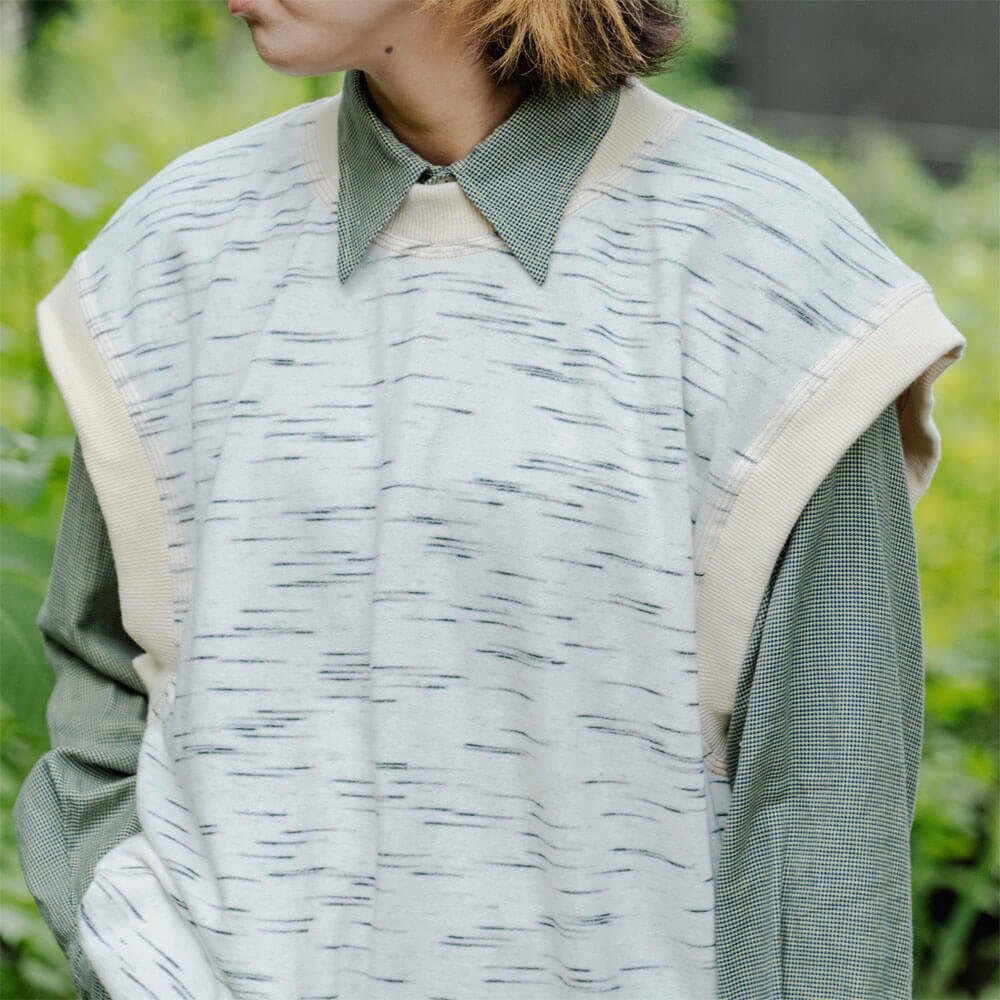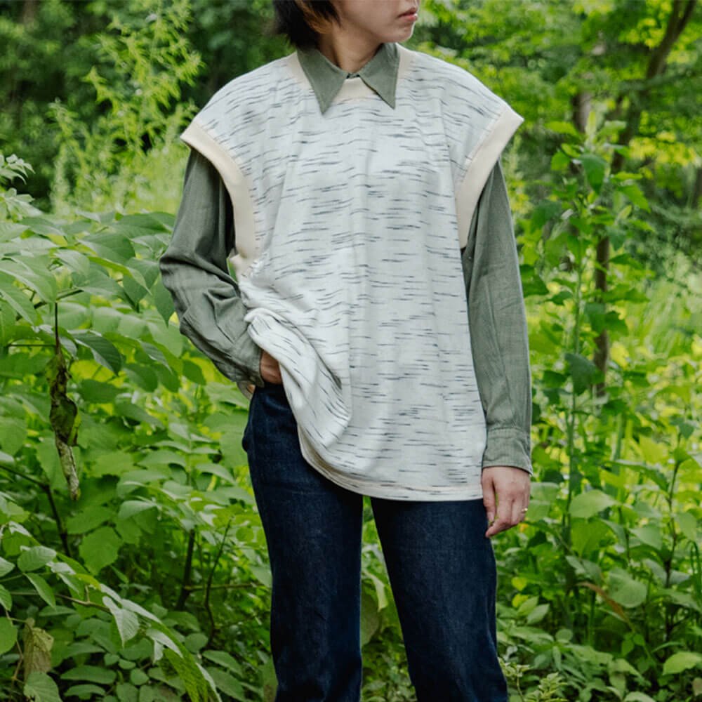 針織面料採用愛知縣一宮市生產的 100%柔軟棉針織而成。反面的起絨材料貼膚感非常好,穿著涼爽。面料的厚度可以使用很長時間。