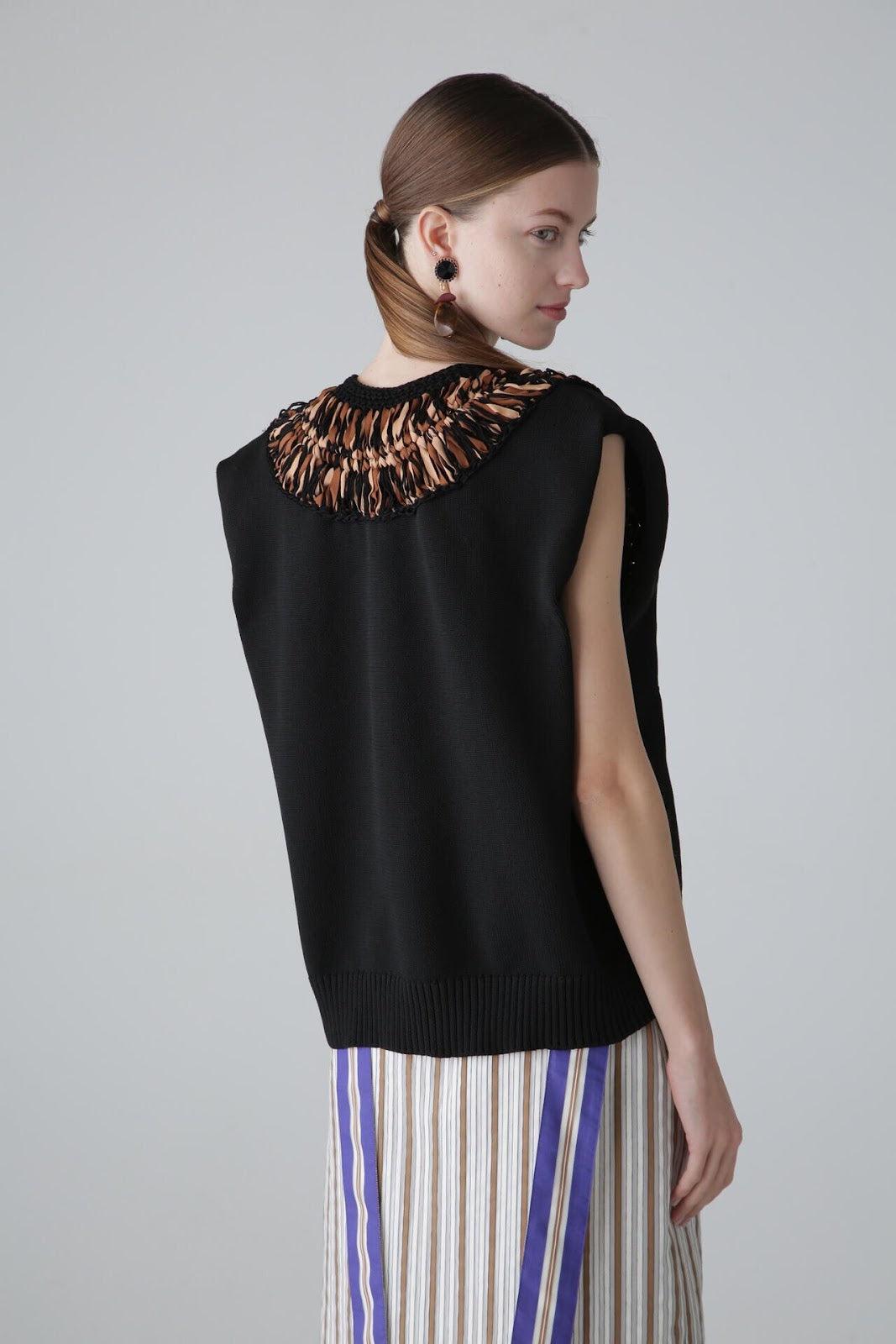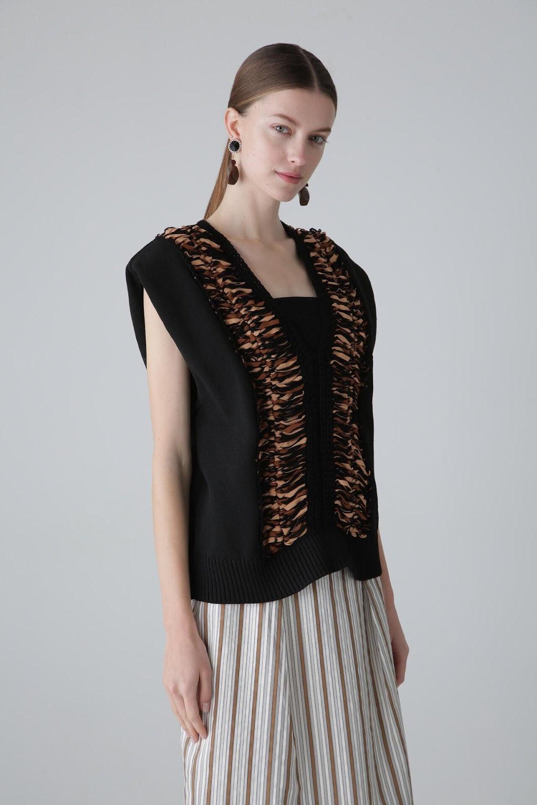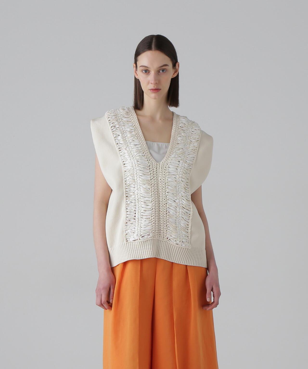 織帶紗編織的針織馬甲令人印象深刻。這款針織馬甲的前襟和衣領處採用織帶紗編織而成,令人印象深刻,既可單穿,也可疊加穿出各種造型。👍後,它還採用了一種特殊的蕾絲編織方法,將帶狀紗線和繩狀紗線拉在一起。*請小心不要卡住。