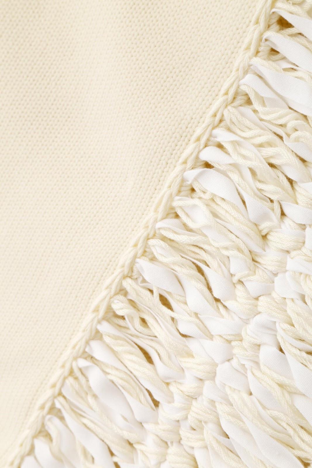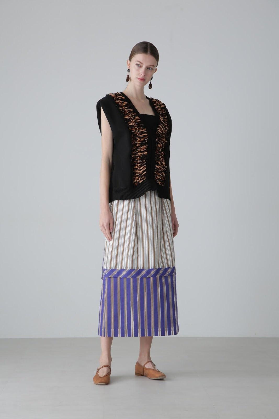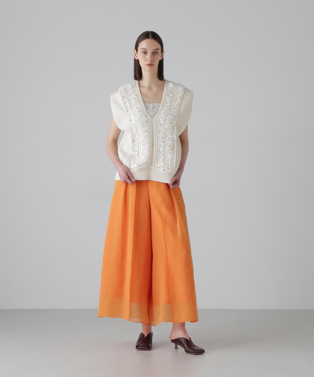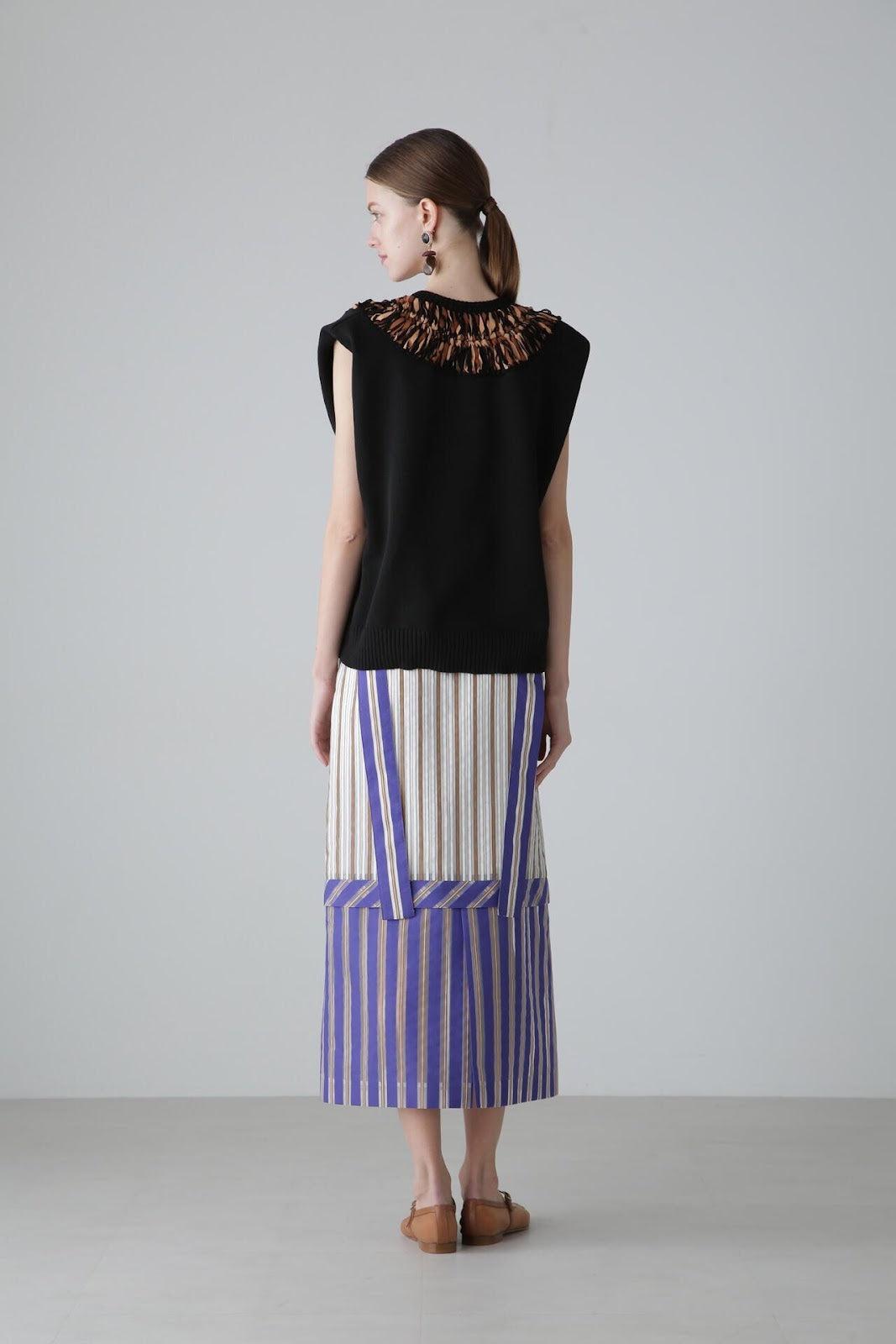 織帶紗編織的針織馬甲令人印象深刻。這款針織馬甲的前襟和衣領處採用織帶紗編織而成,令人印象深刻,既可單穿,也可疊加穿出各種造型。👍後,它還採用了一種特殊的蕾絲編織方法,將帶狀紗線和繩狀紗線拉在一起。*請小心不要卡住。