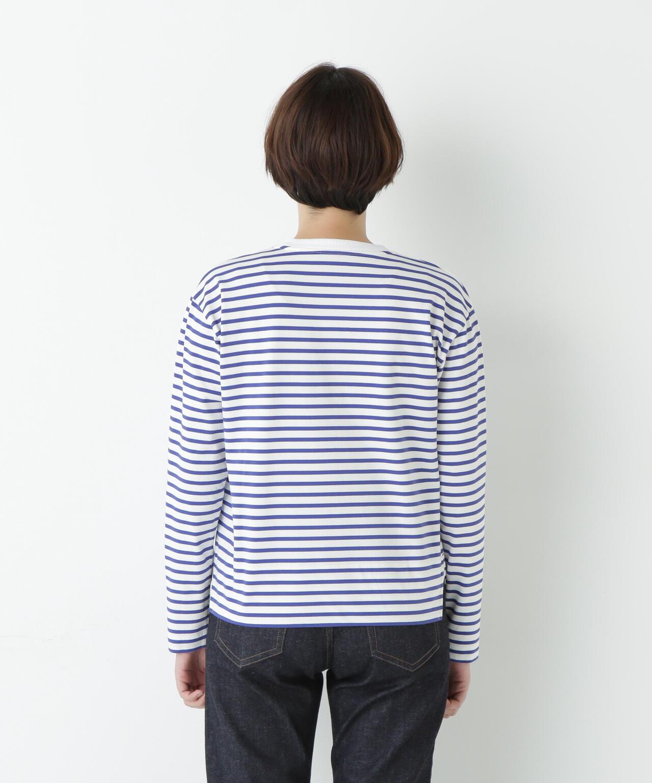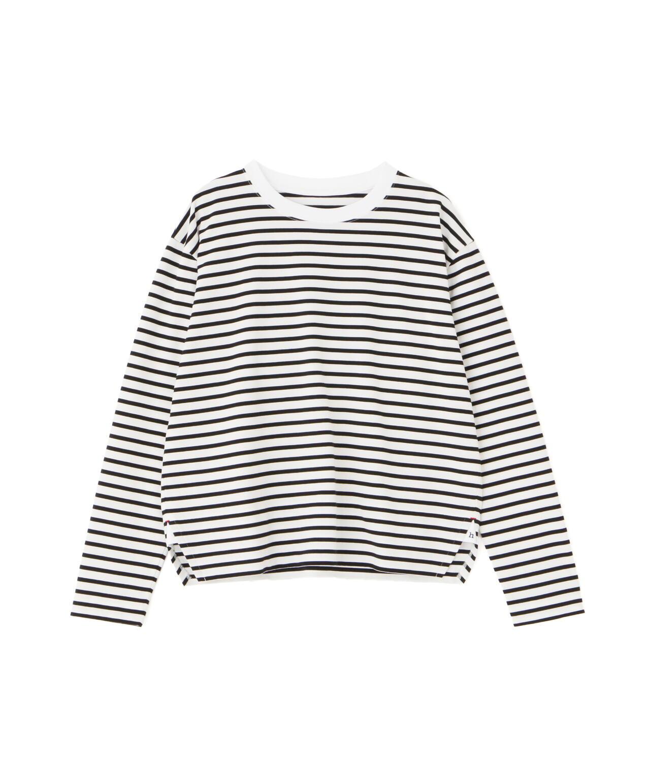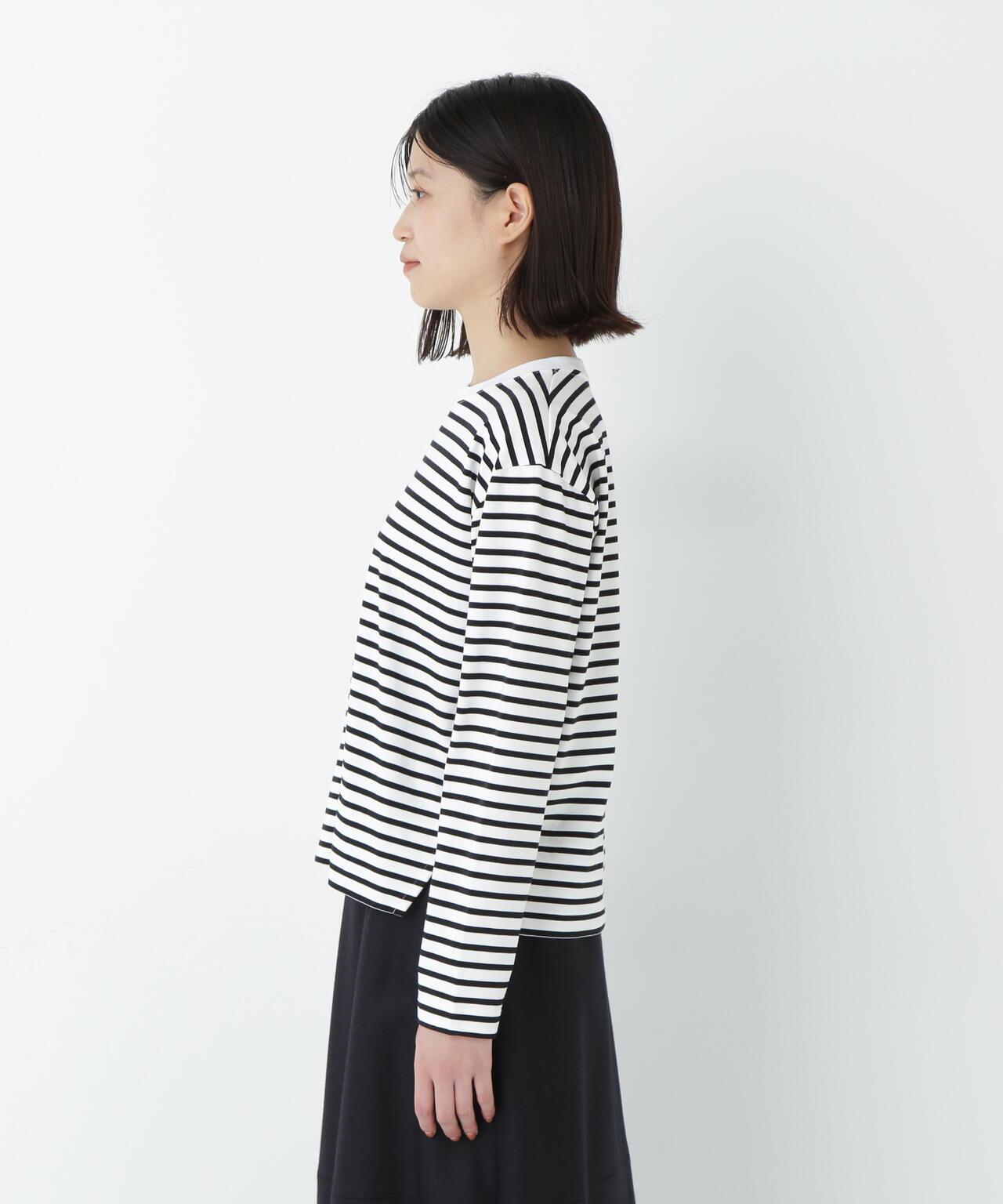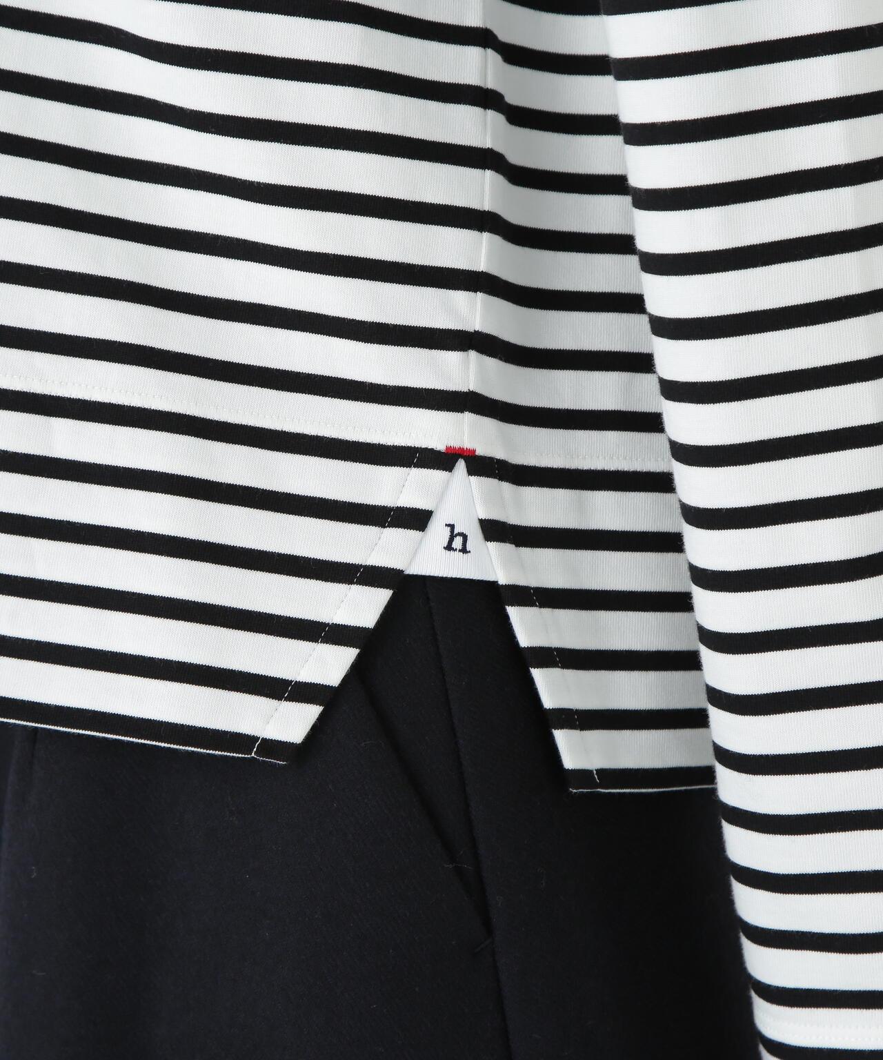 傳統風格必備條紋 T 恤 [設計特色] 條紋長袖剪裁縫製,廓形適中,是典型的人類女性風格。左側下襬袼褙上的刺繡 "h "也是一大亮點。面料採用棉質針織邊料,通過細捻紗線的拉捻,以極高的針數編織出漂亮的表面。面料手感柔軟而富有彈性。這款 T 恤是傳統款式中不可或缺的鑲邊 T 恤。同時,它也是一件易於穿著的上衣,可作為外衣和羊毛衫的內層。