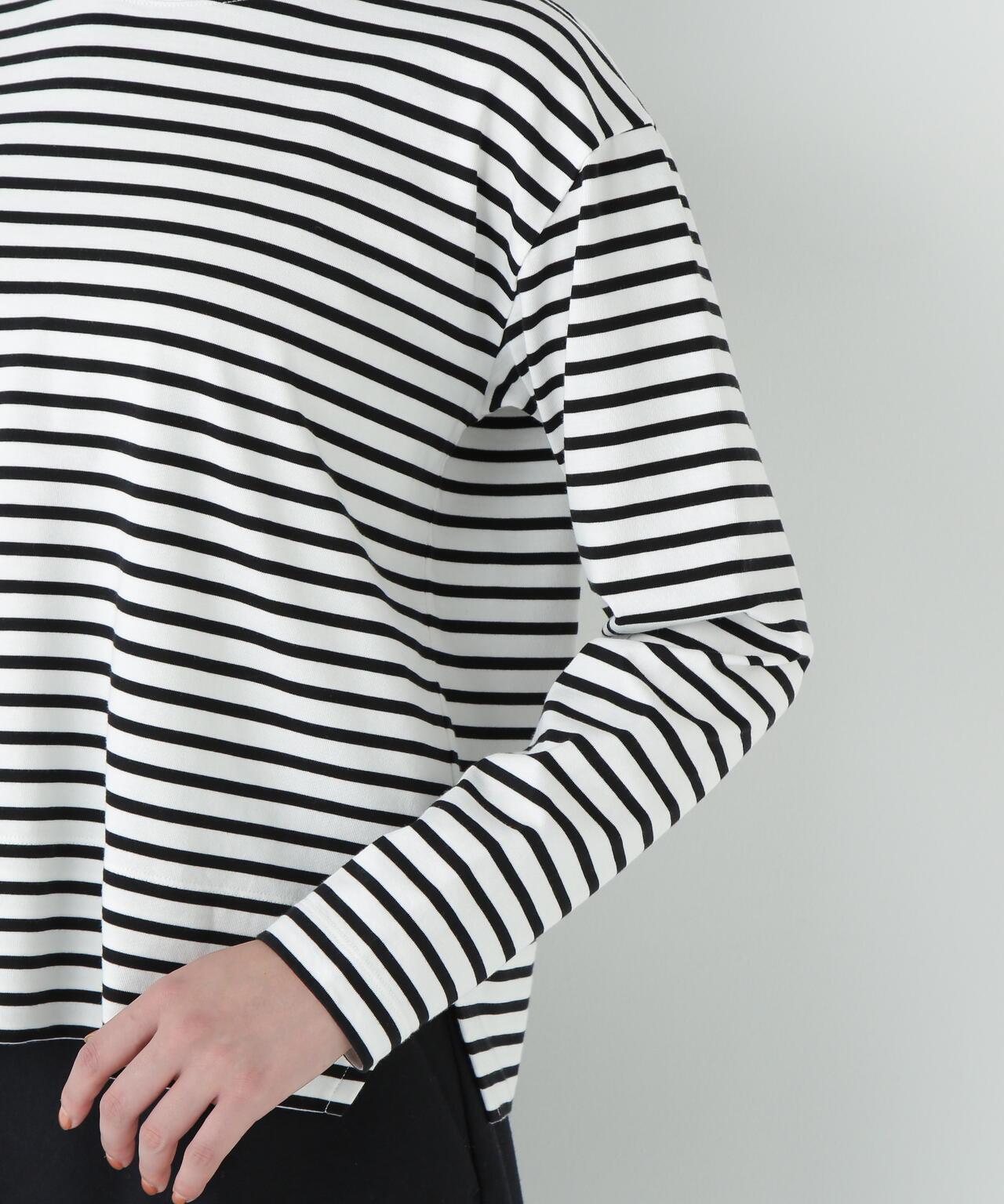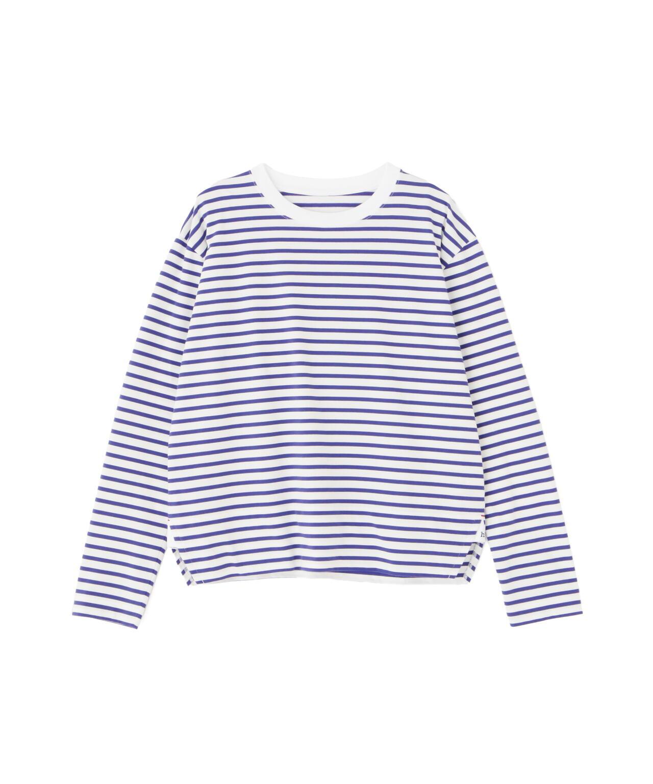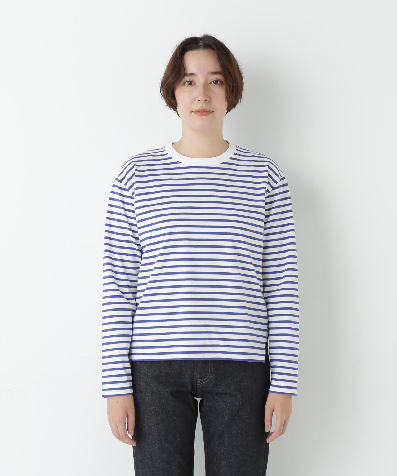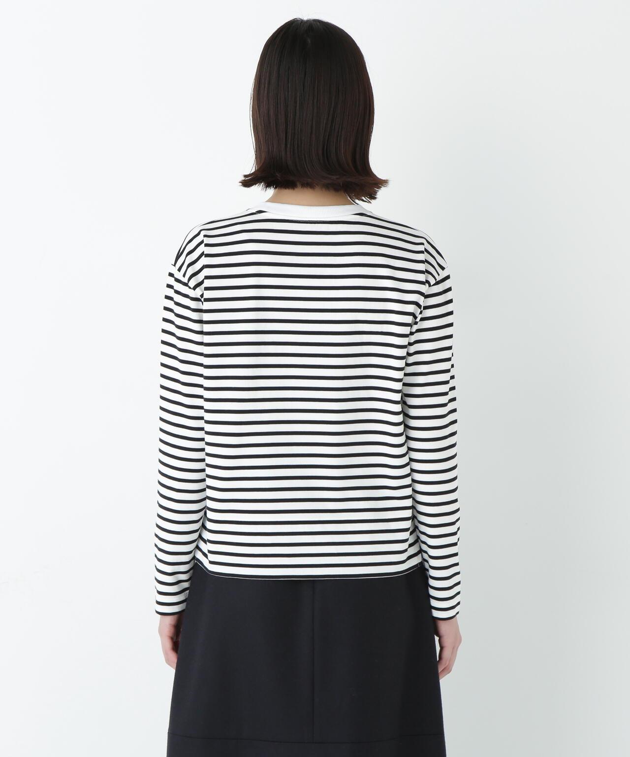 傳統風格必備條紋 T 恤 [設計特色] 條紋長袖剪裁縫製,廓形適中,是典型的人類女性風格。左側下襬袼褙上的刺繡 "h "也是一大亮點。面料採用棉質針織邊料,通過細捻紗線的拉捻,以極高的針數編織出漂亮的表面。面料手感柔軟而富有彈性。這款 T 恤是傳統款式中不可或缺的鑲邊 T 恤。同時,它也是一件易於穿著的上衣,可作為外衣和羊毛衫的內層。