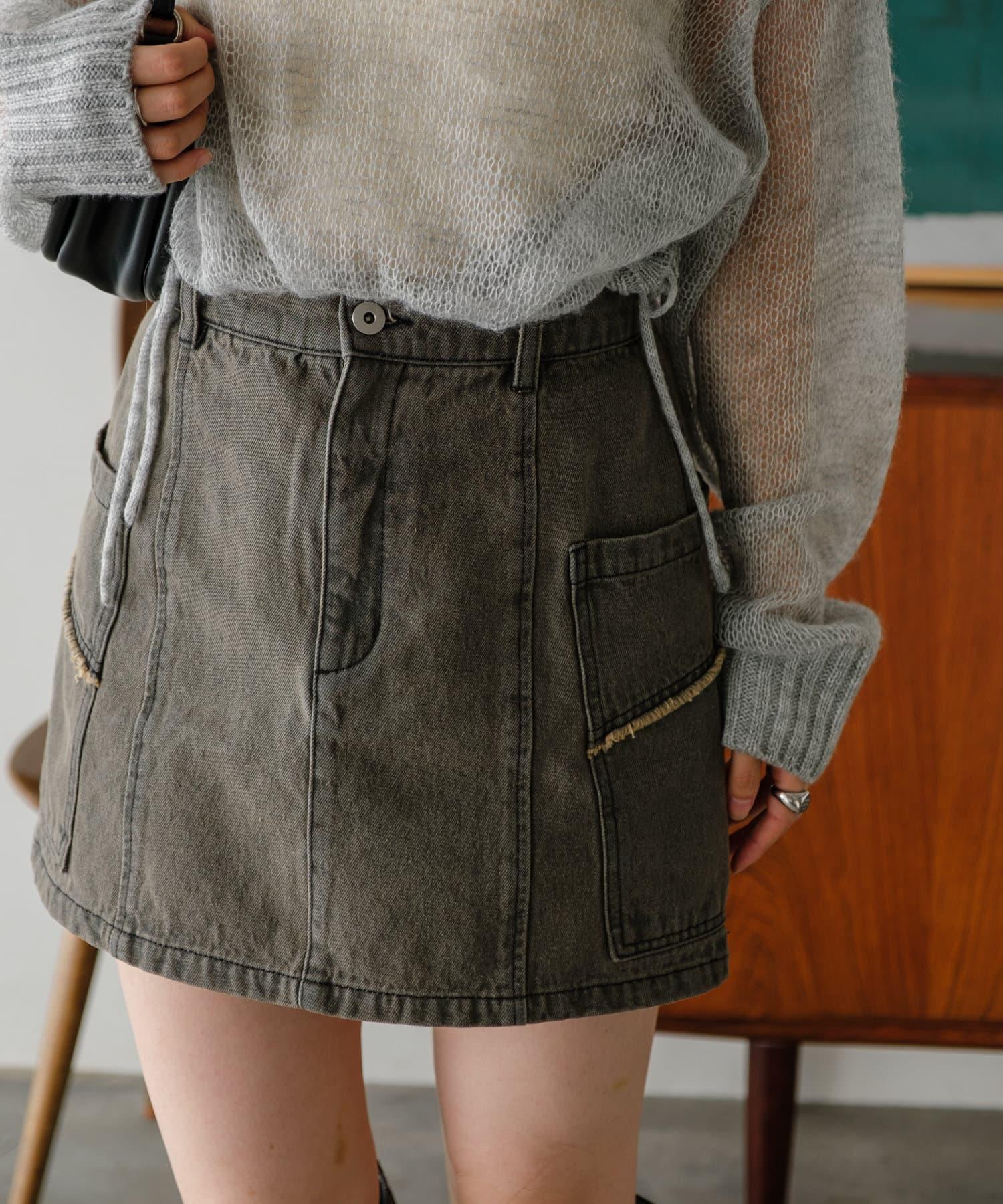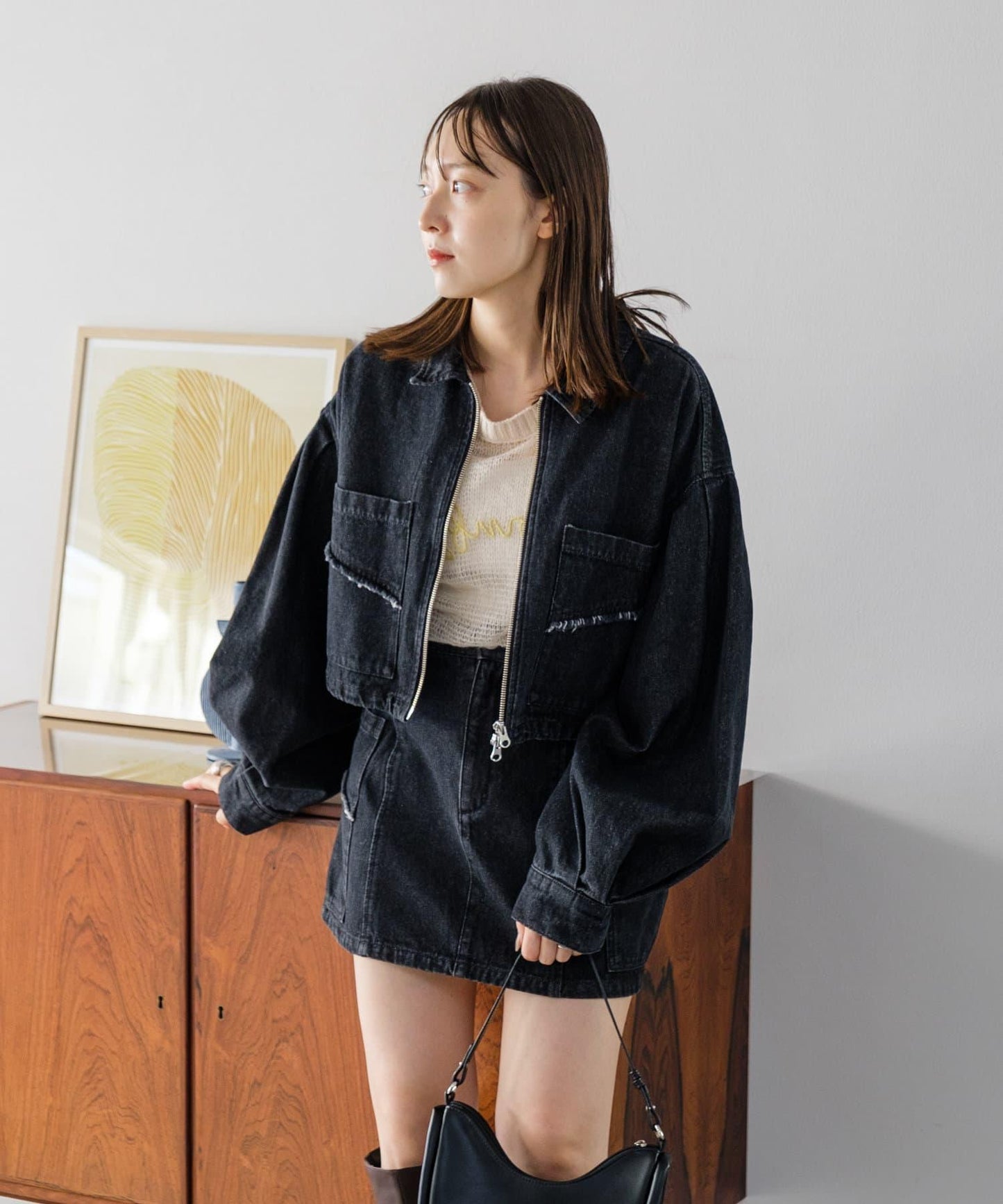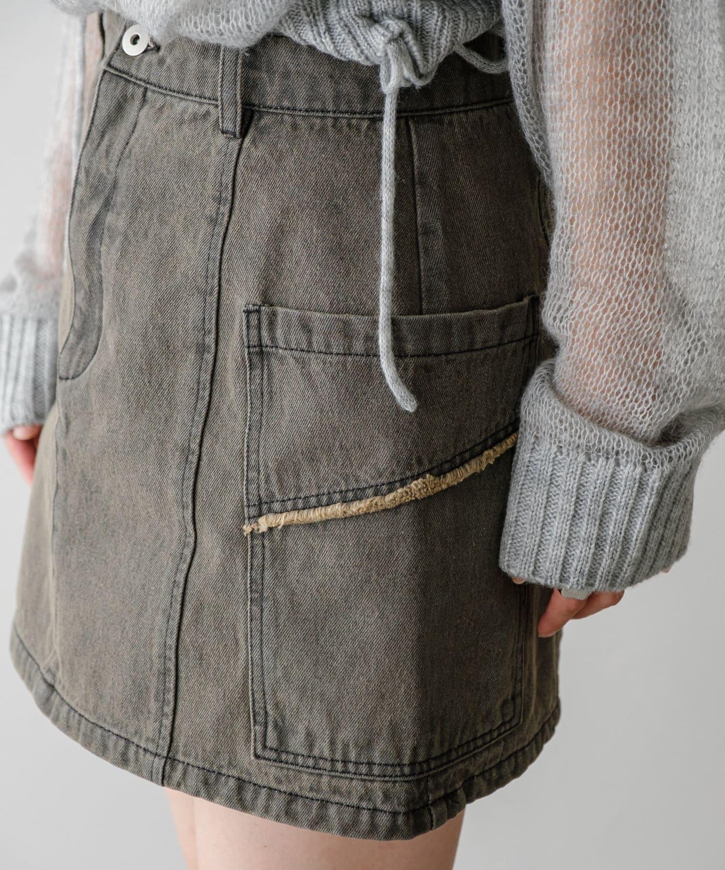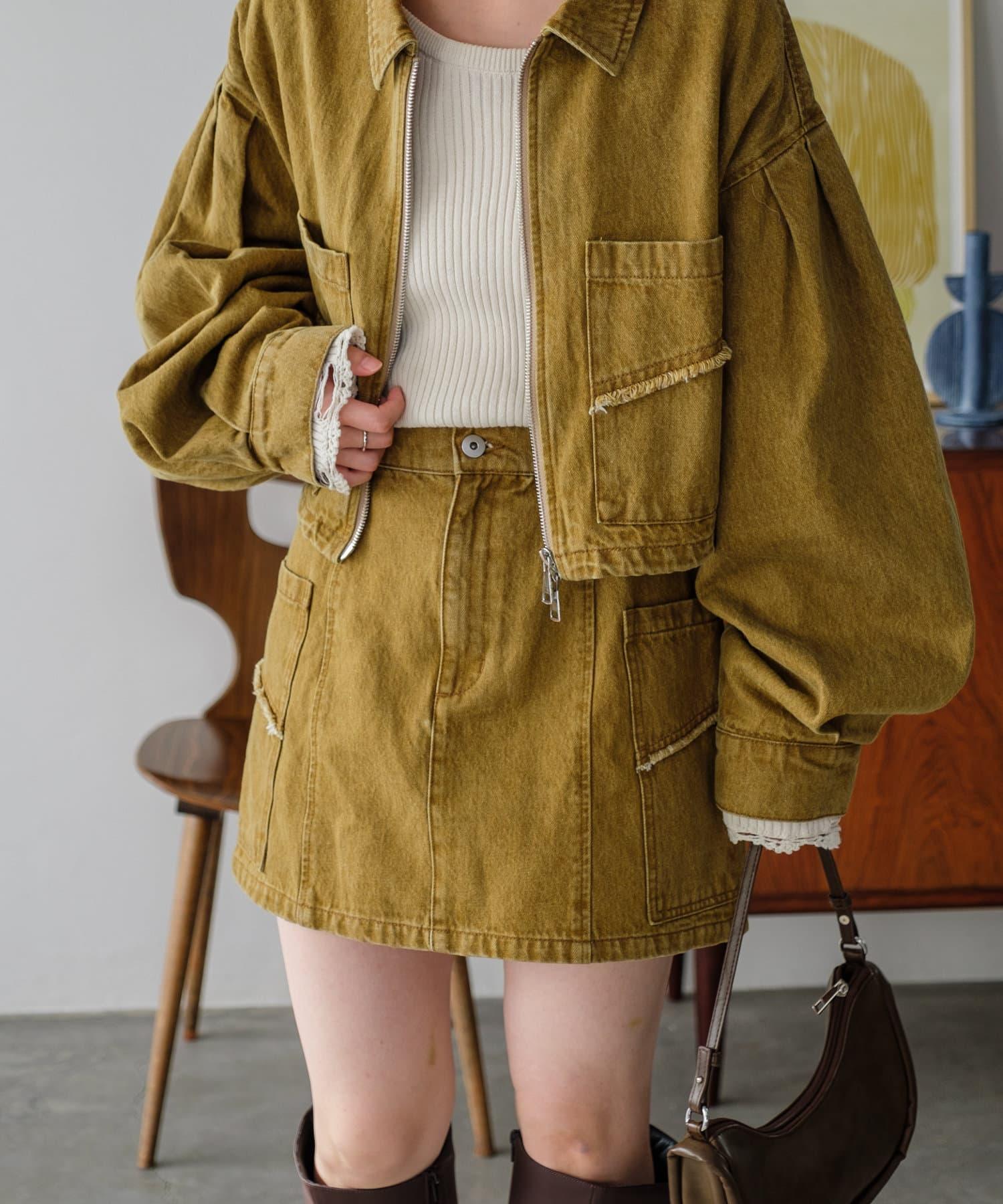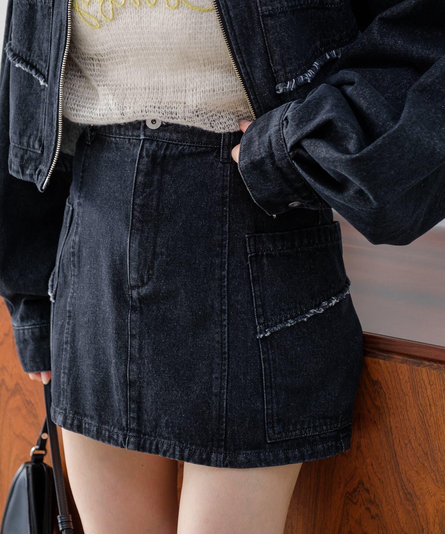 引人注目的牛仔短裙,採用剪裁設計,也可作為套裝穿著。