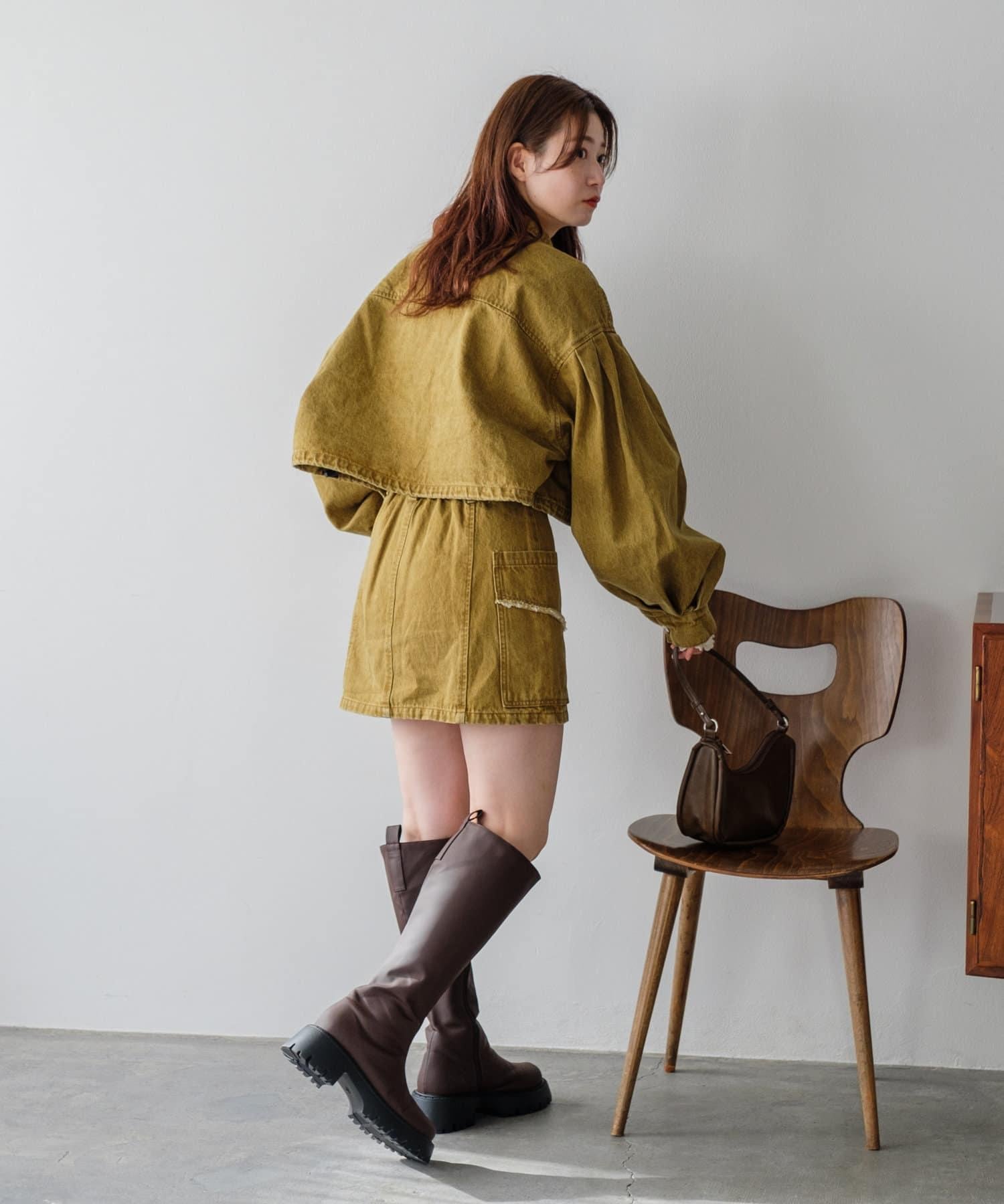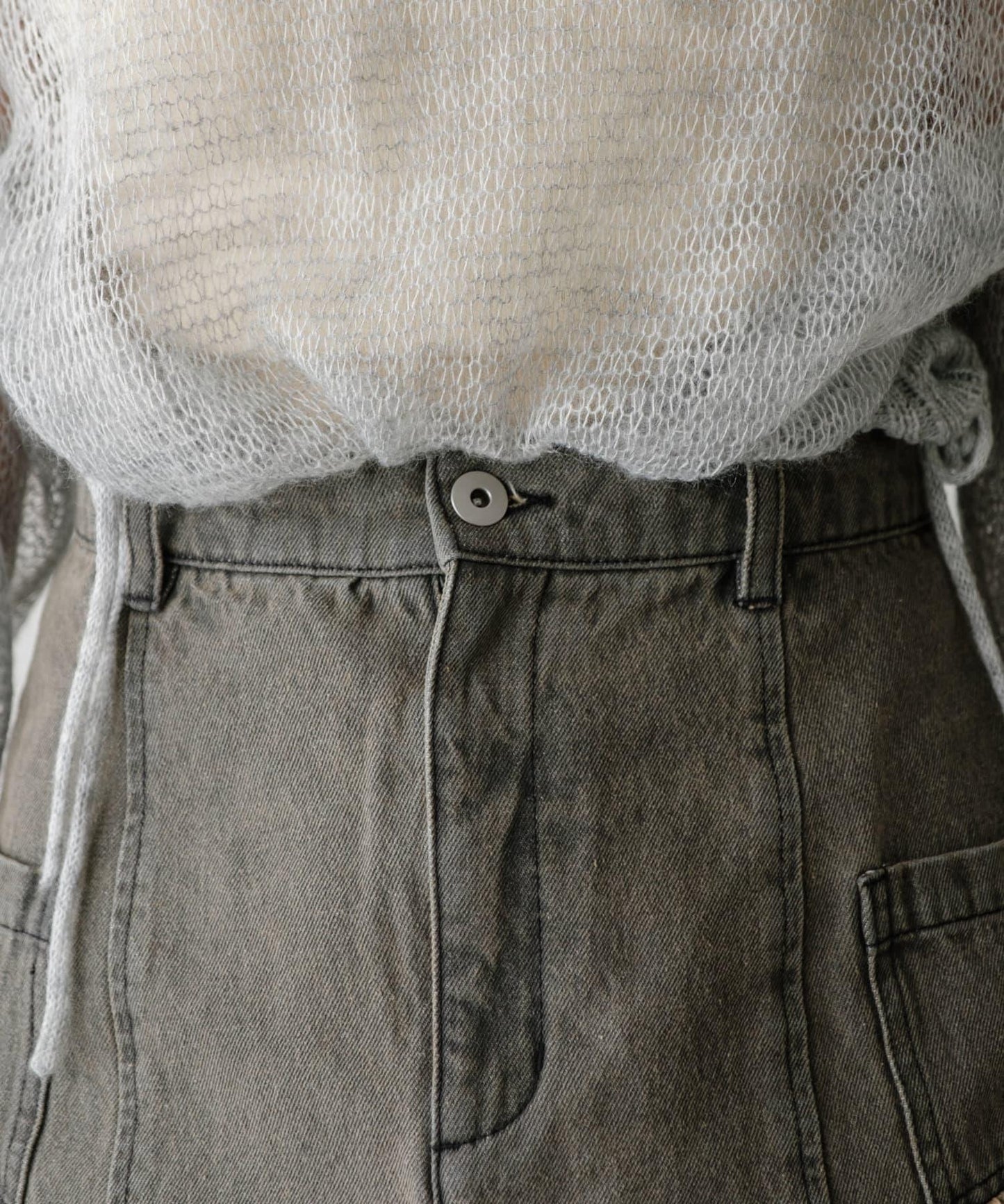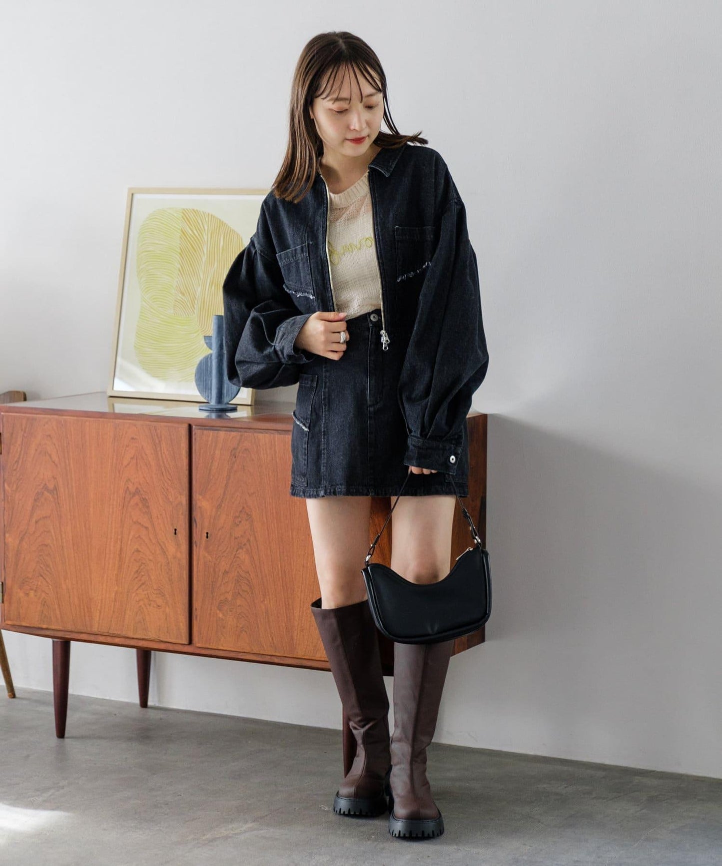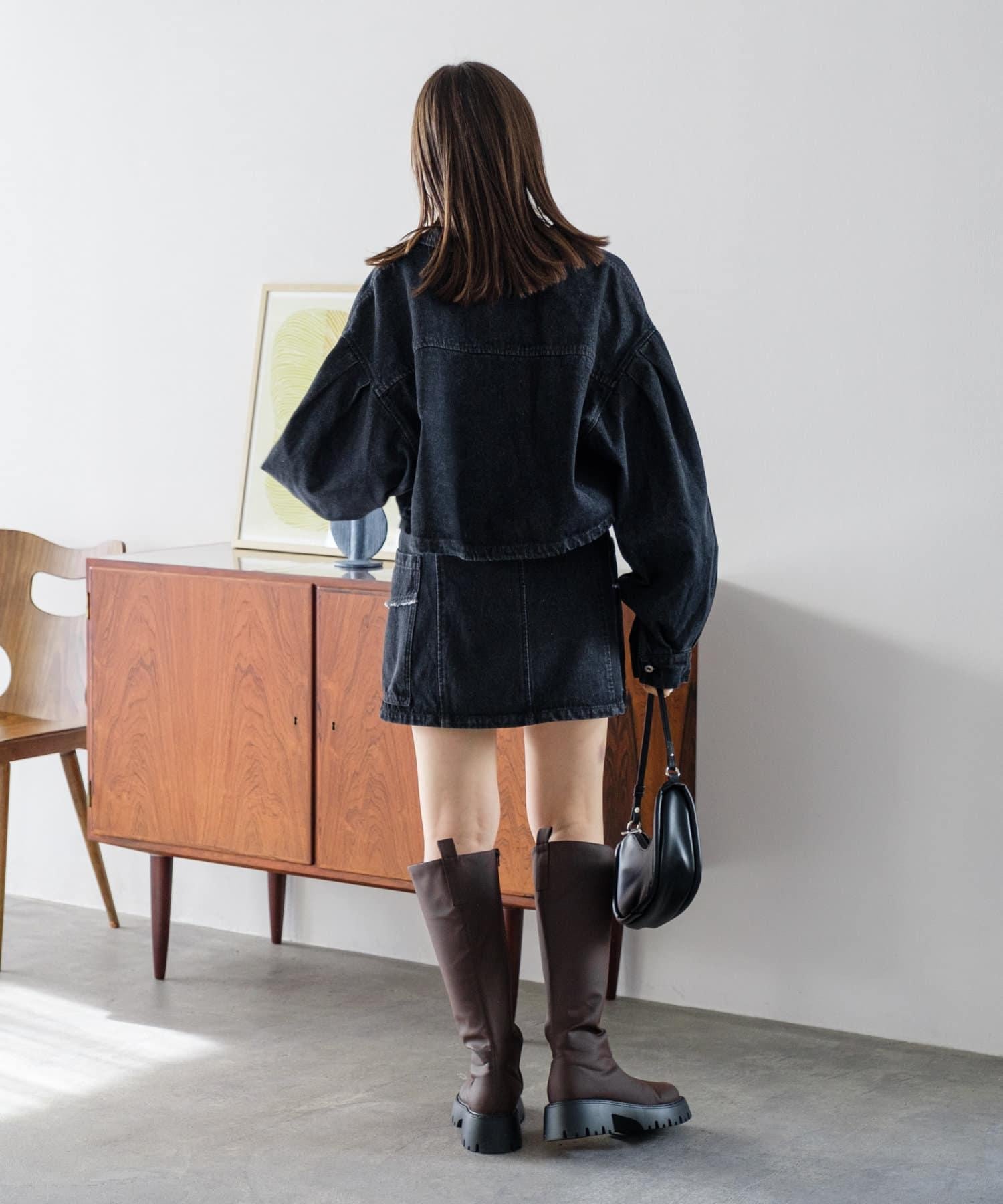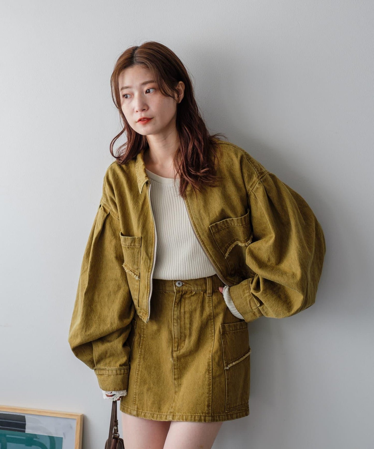 引人注目的牛仔短裙,採用剪裁設計,也可作為套裝穿著。
