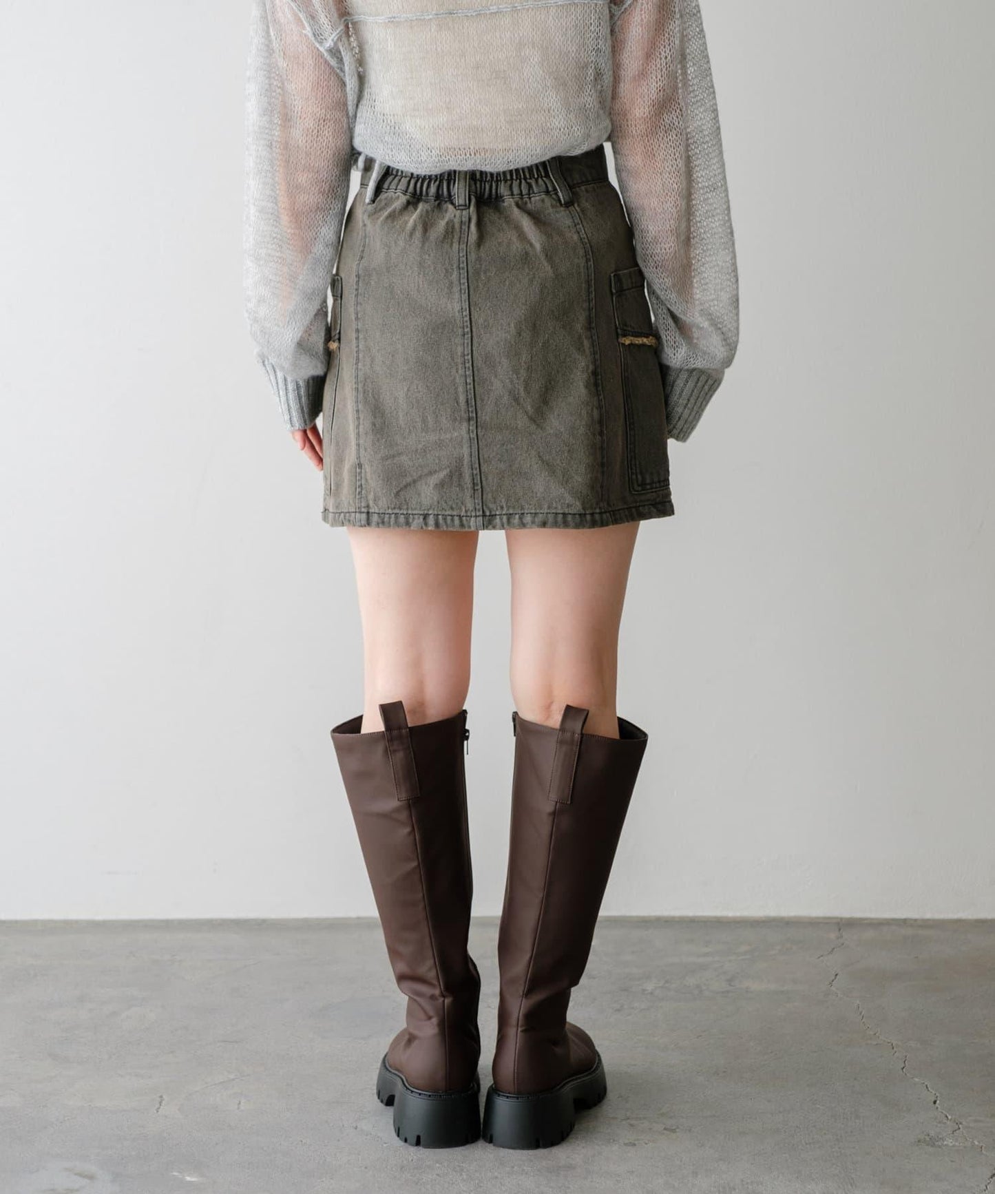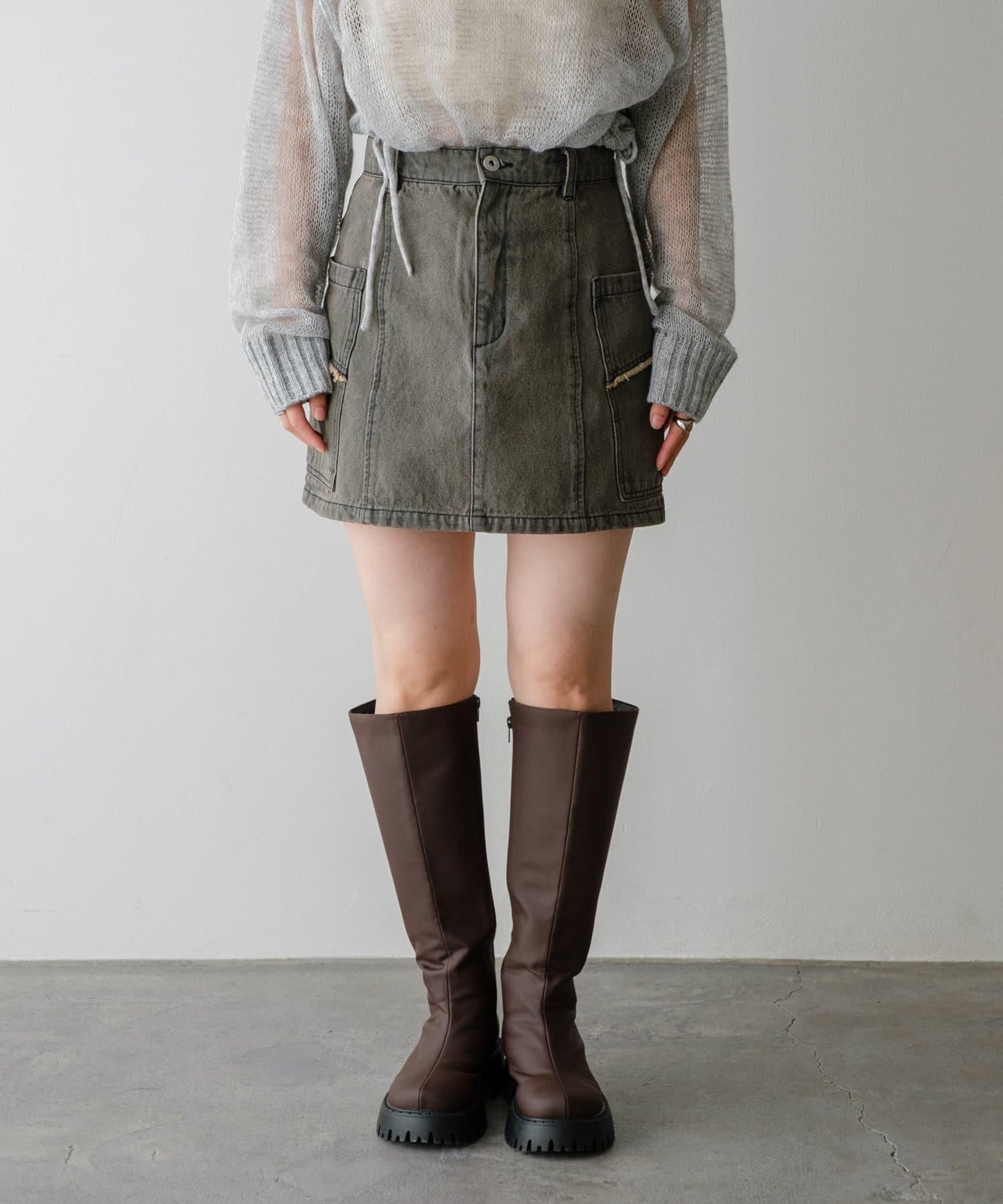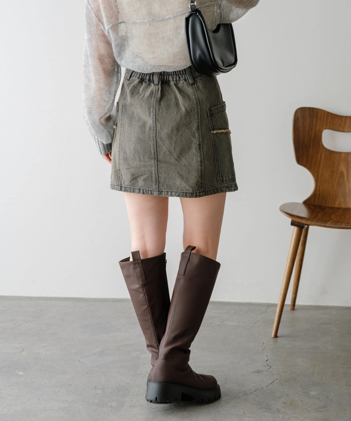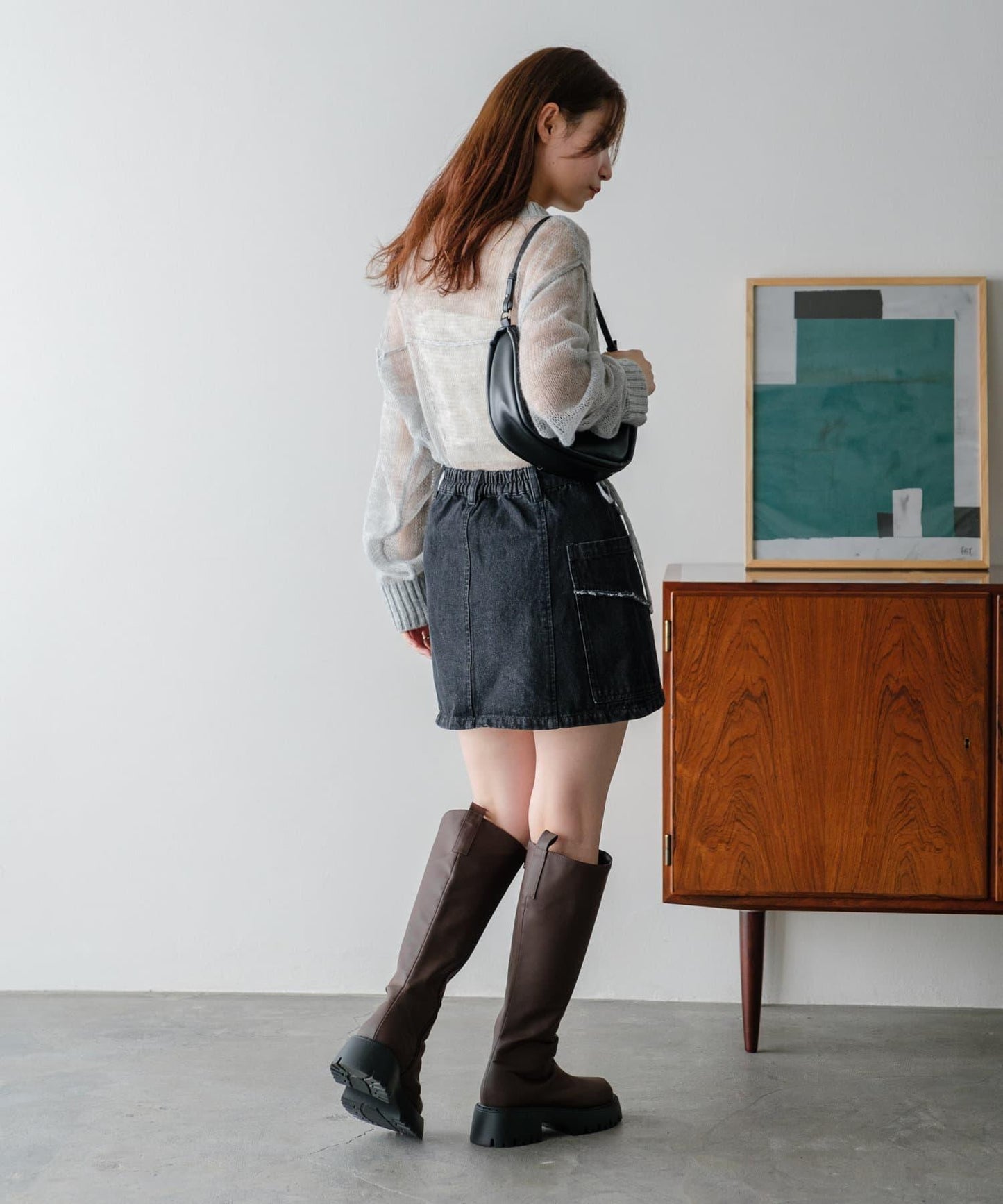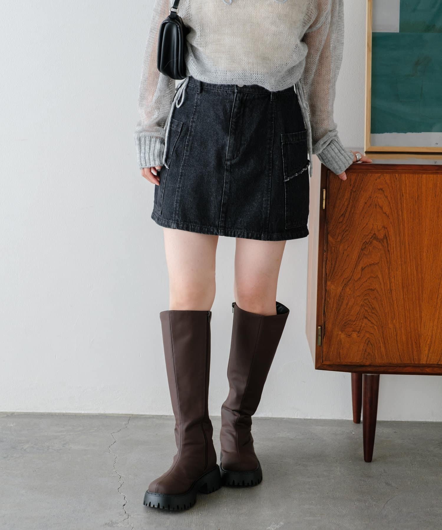 引人注目的牛仔短裙,採用剪裁設計,也可作為套裝穿著。