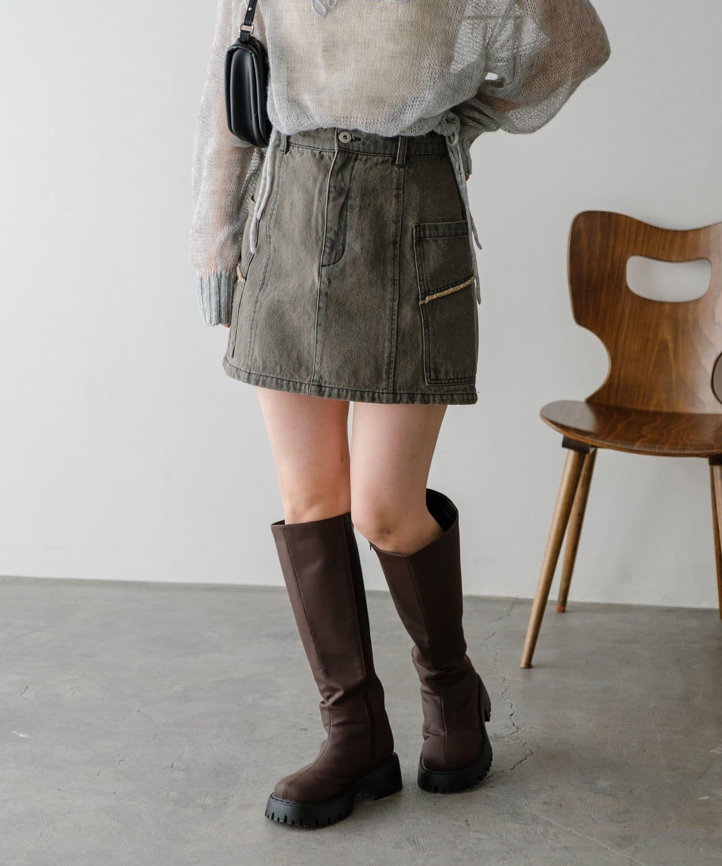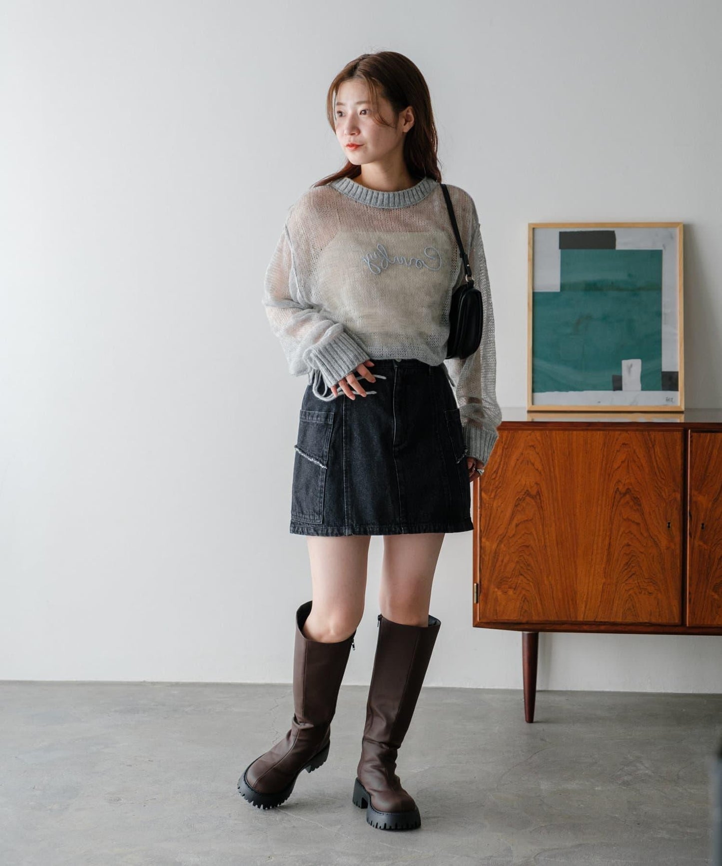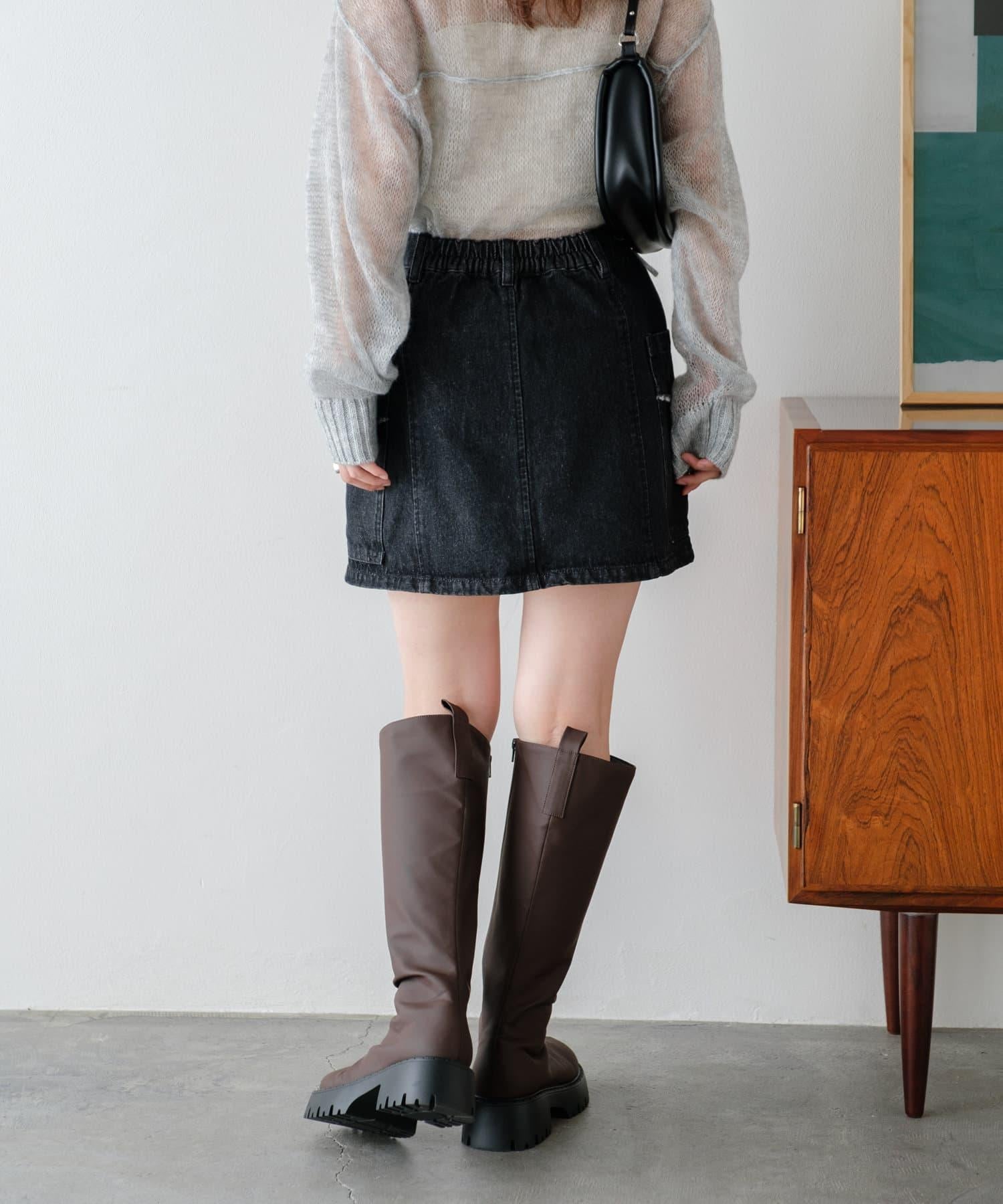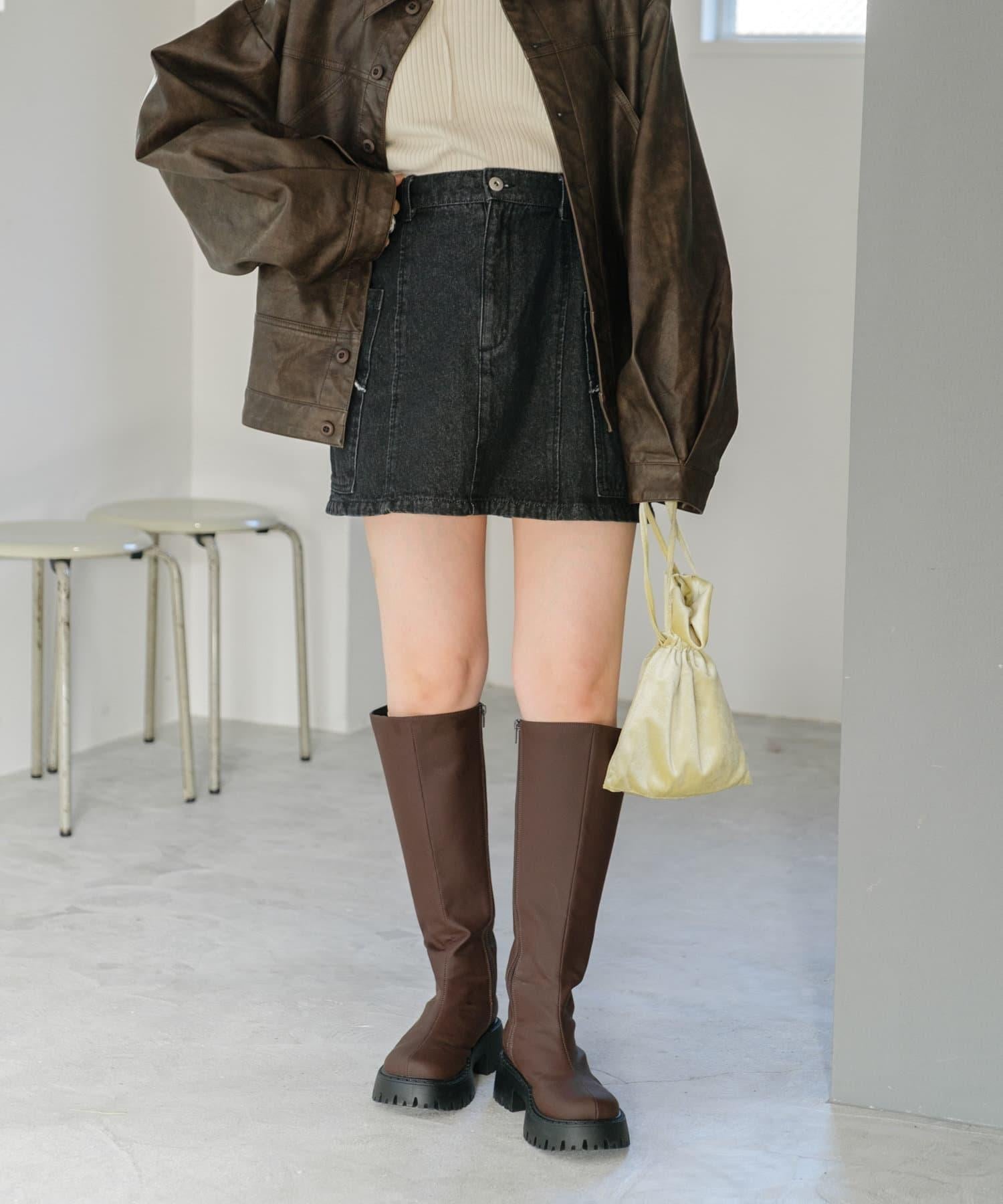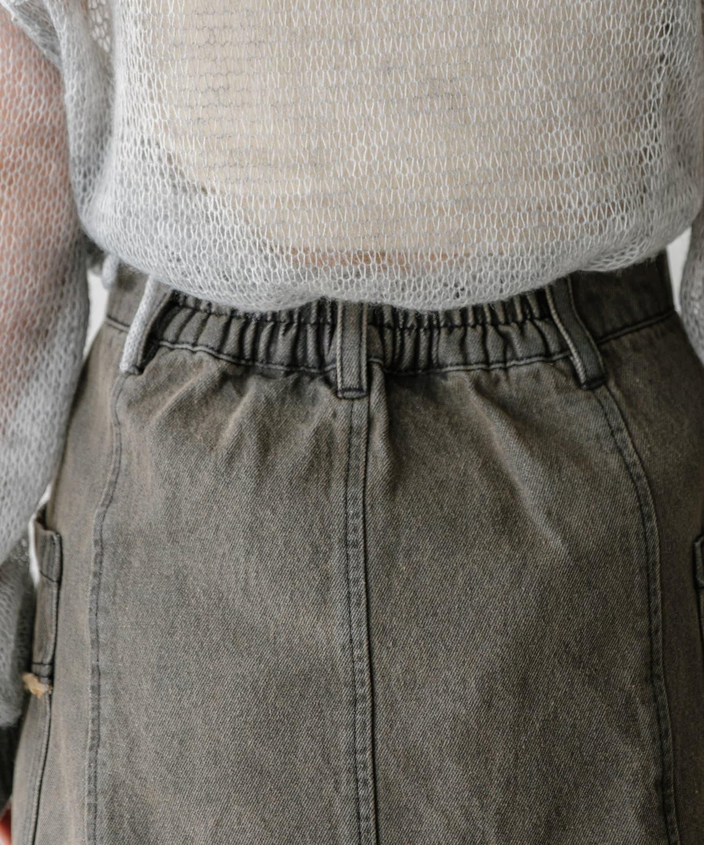 引人注目的牛仔短裙,採用剪裁設計,也可作為套裝穿著。