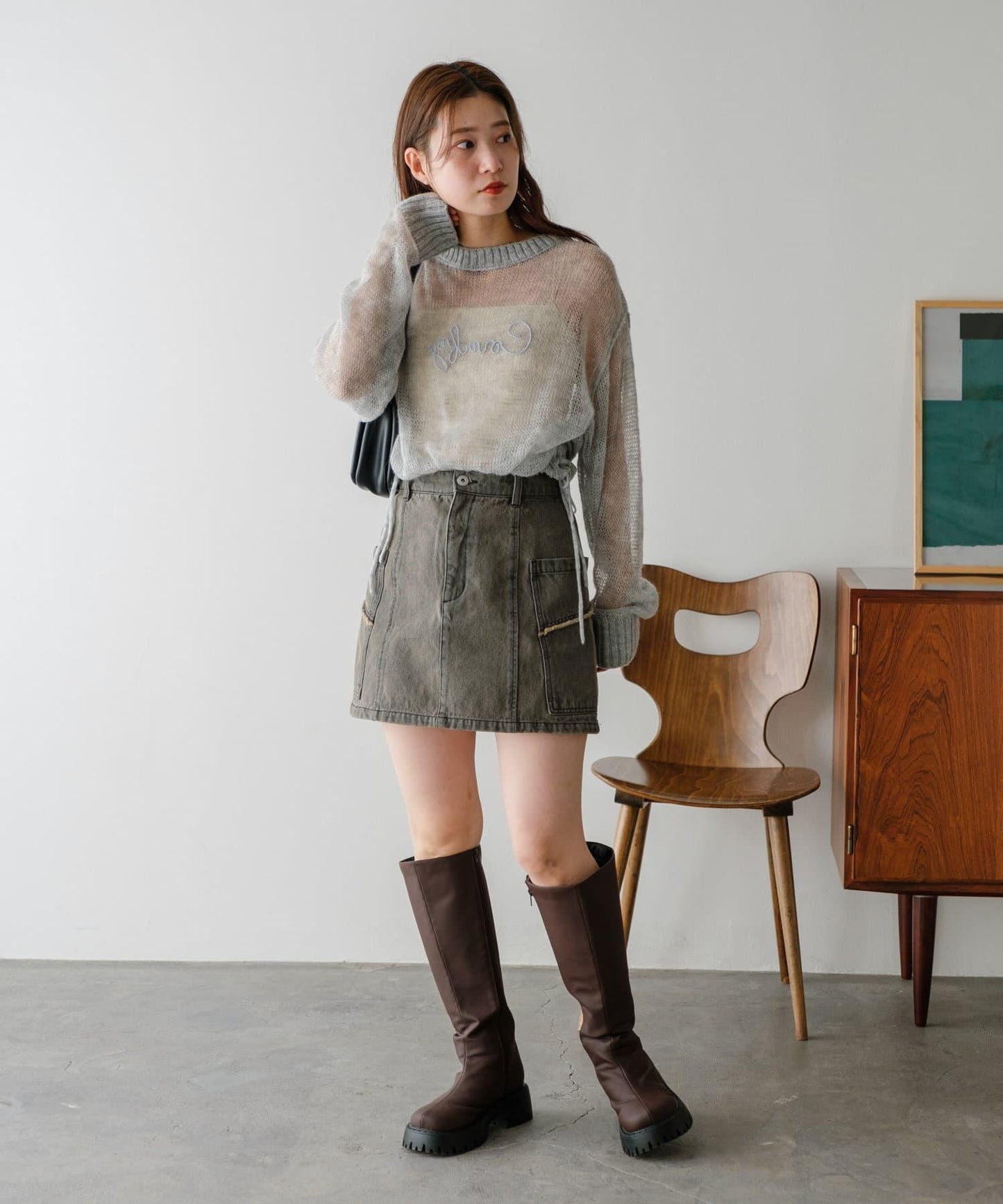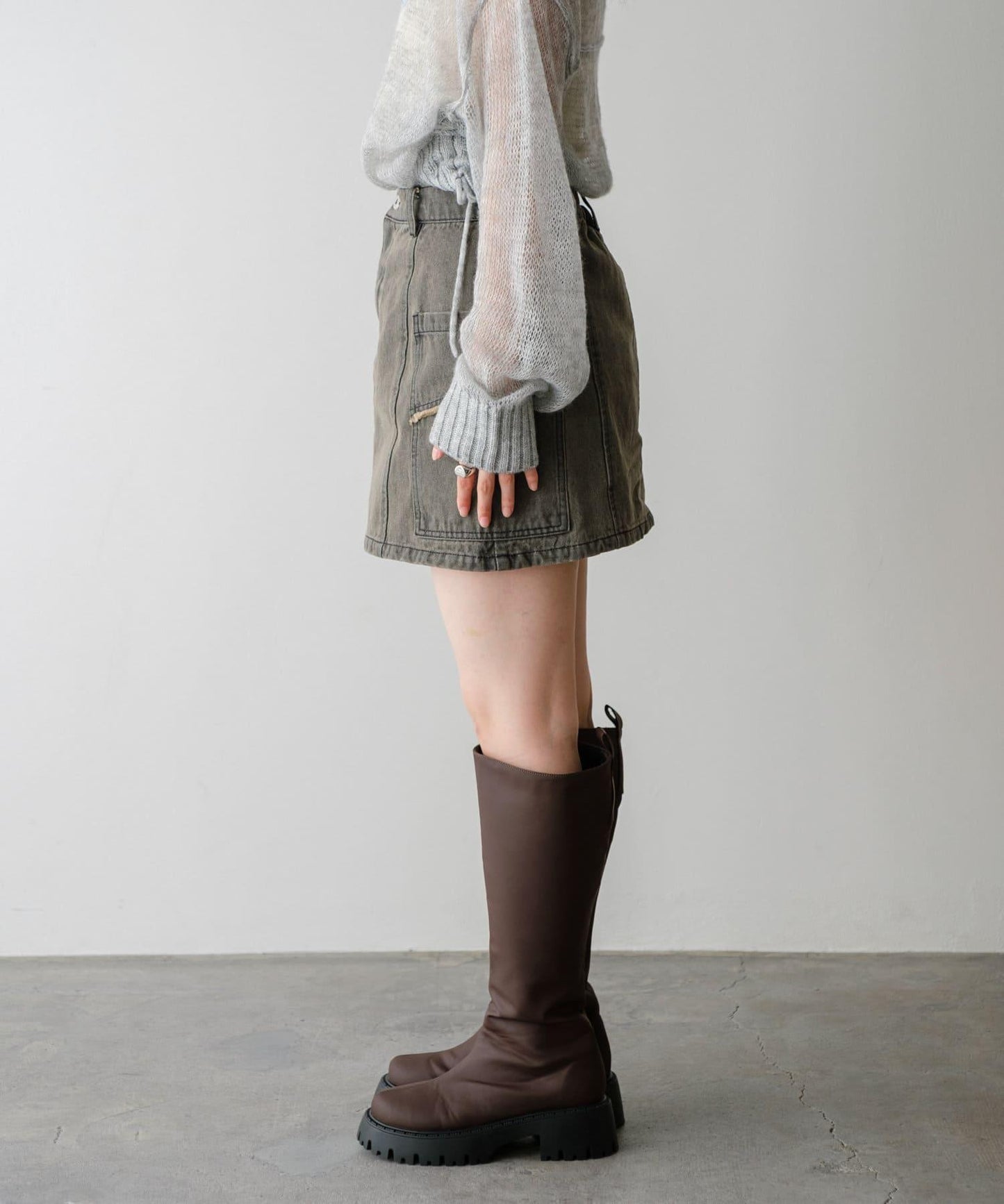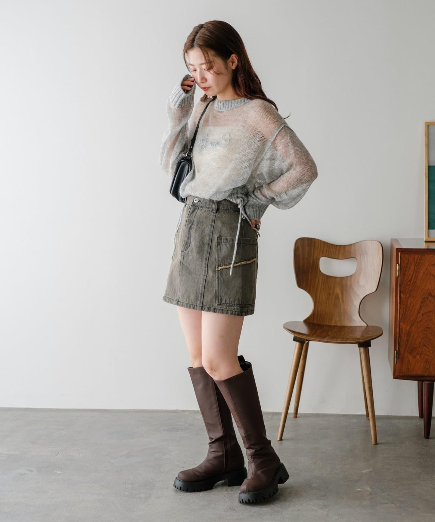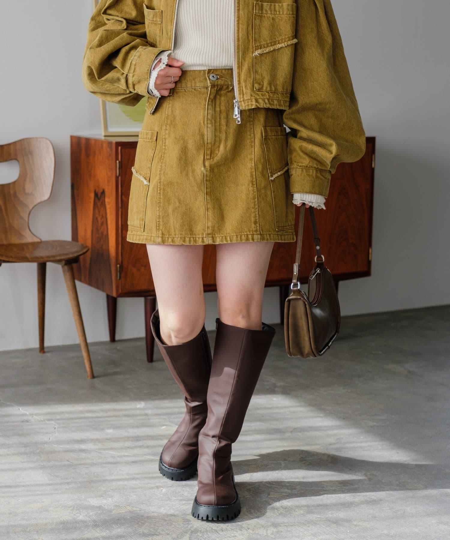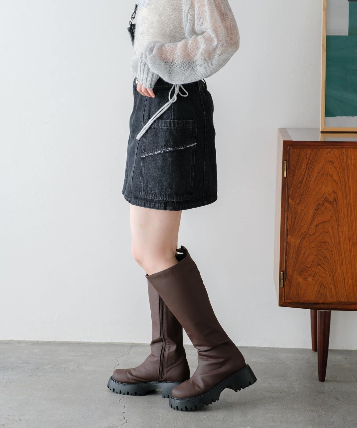 引人注目的牛仔短裙,採用剪裁設計,也可作為套裝穿著。