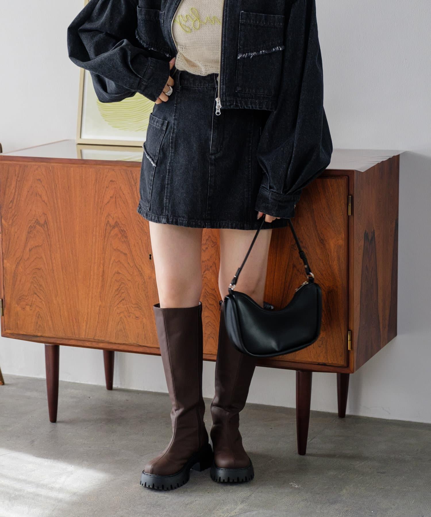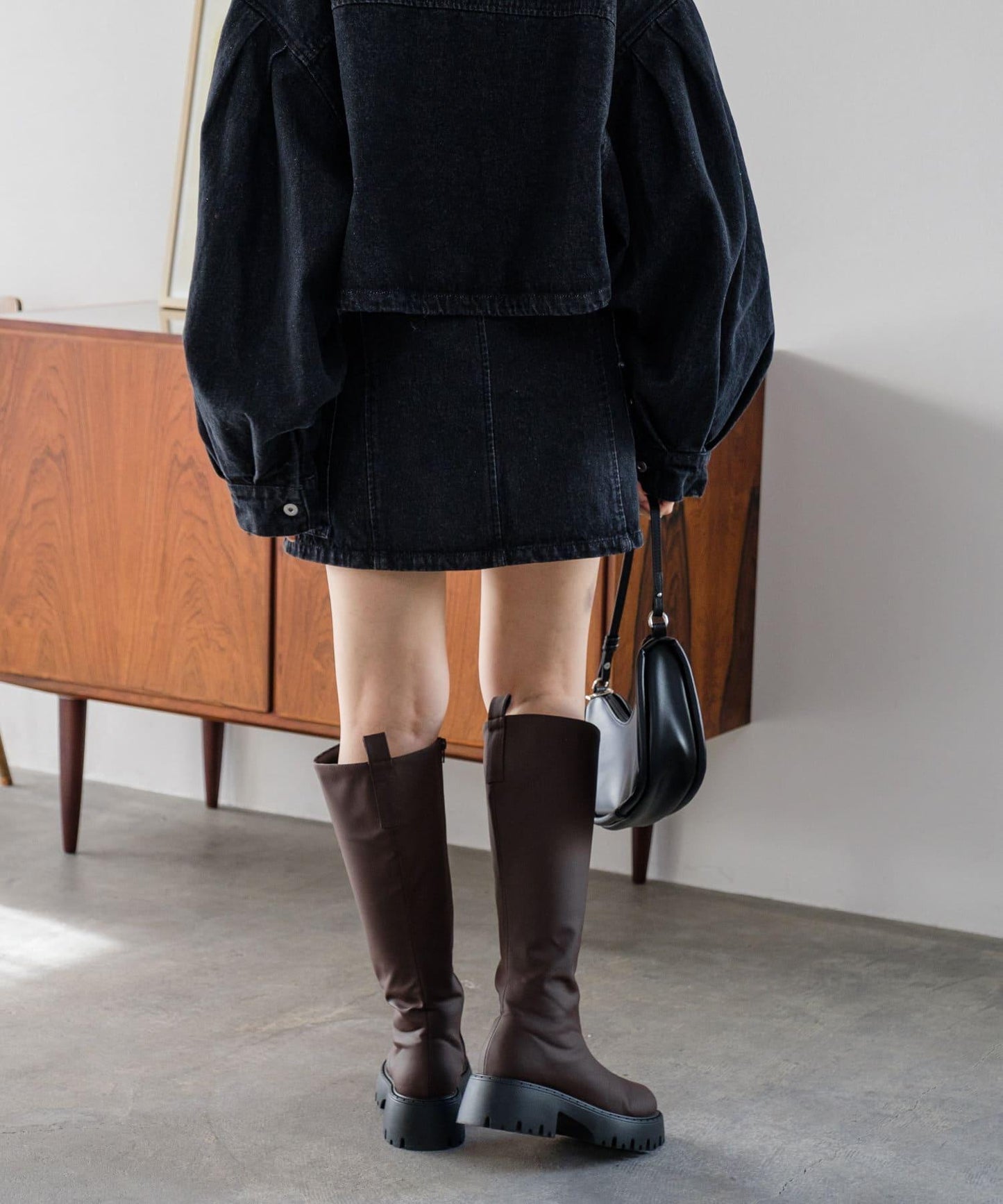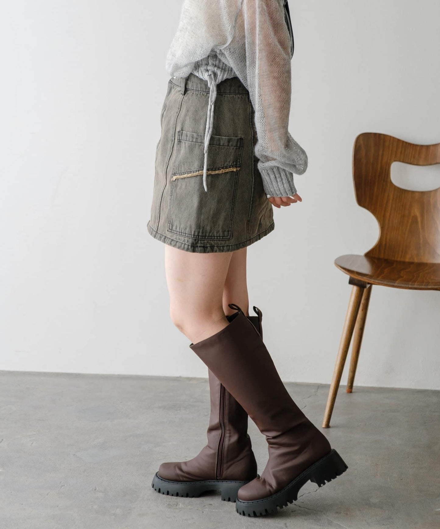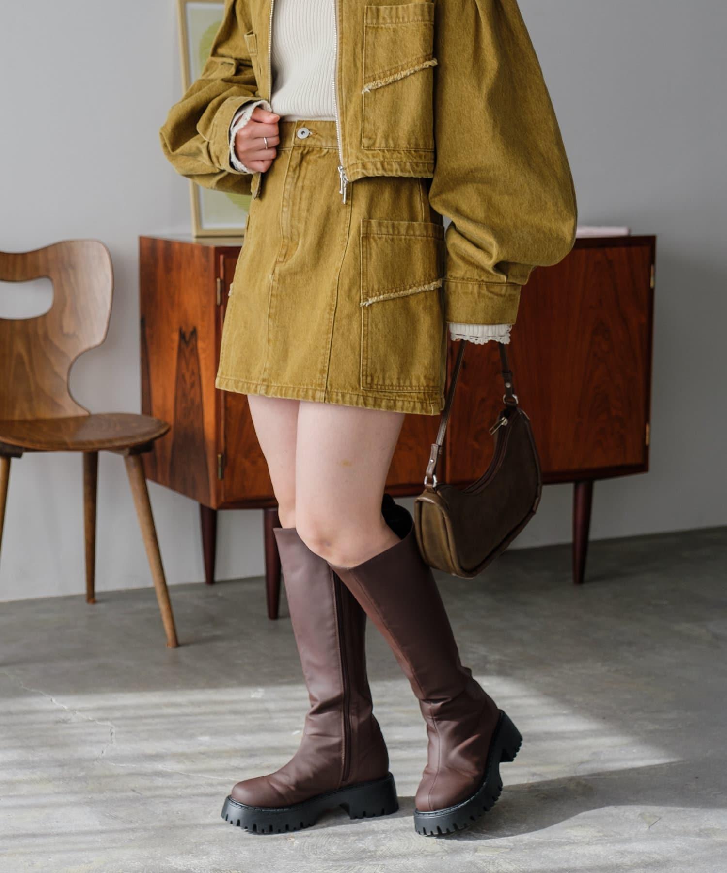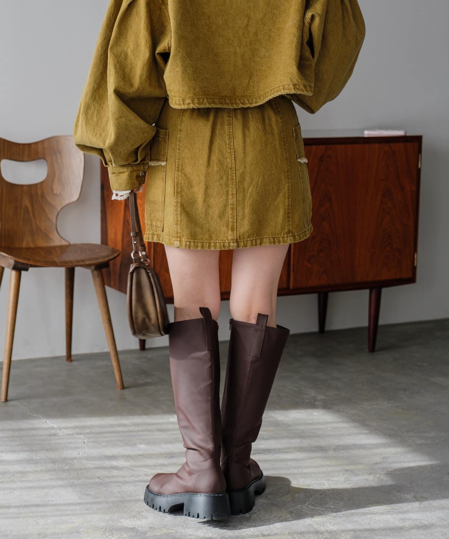 引人注目的牛仔短裙,採用剪裁設計,也可作為套裝穿著。