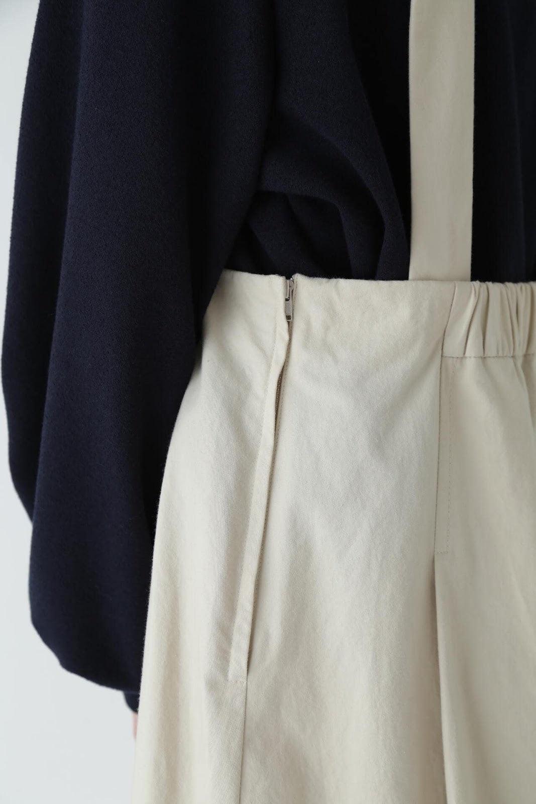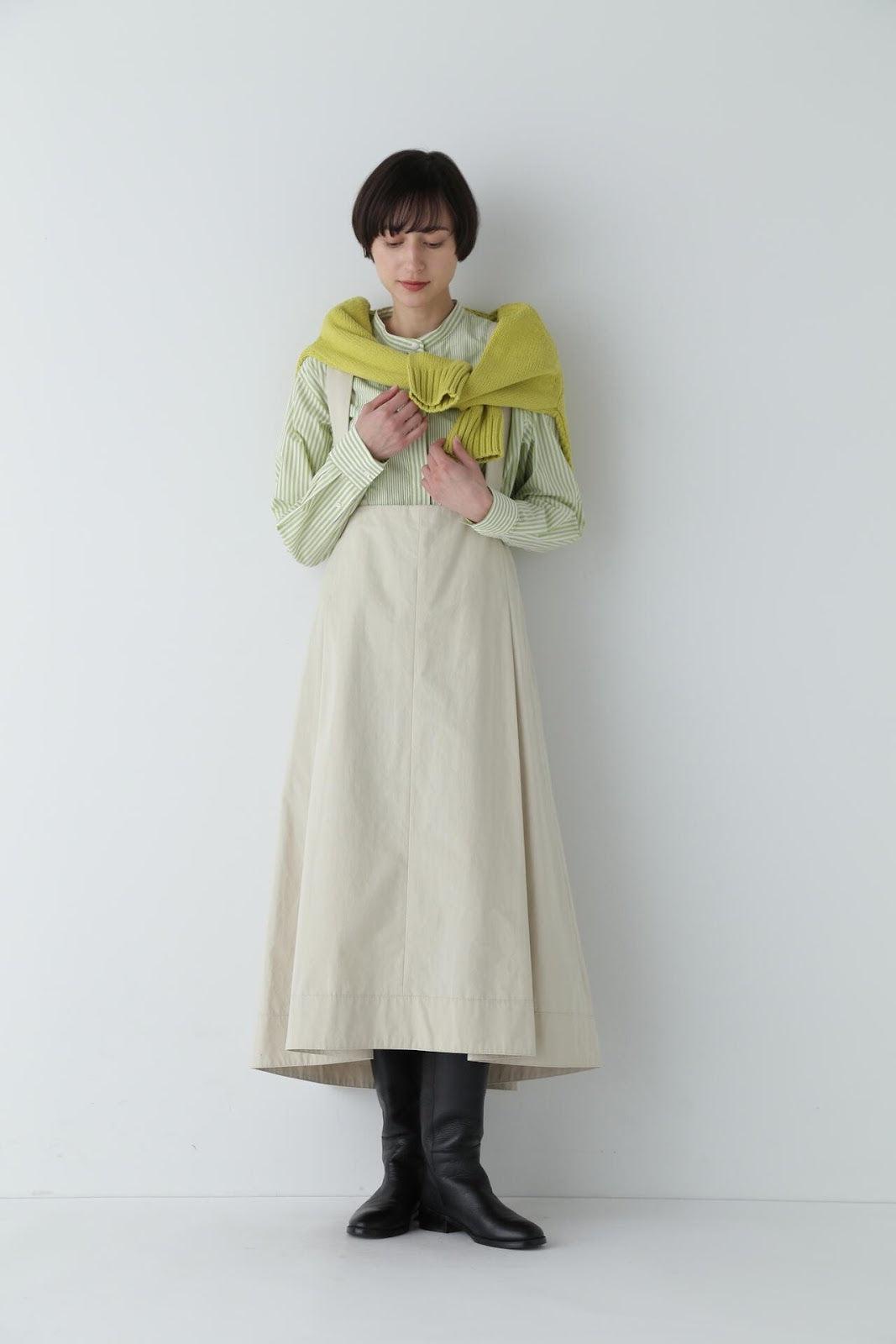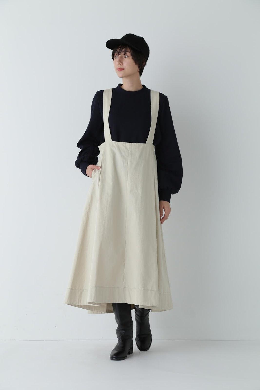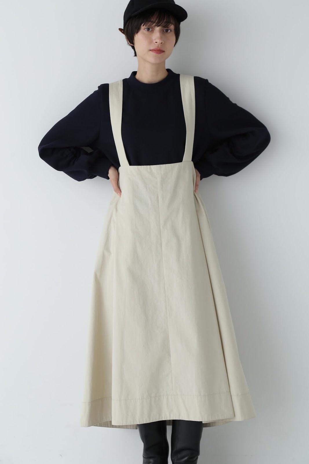 營造成人情調的吊帶喇叭裙 [設計要點] 這款喇叭裙採用了共生吊帶。大褶襉營造出奢華的體積感。裙襬前後留有空隙,便於不同身高的人搭配。面料採用高密度、緊密的天氣材料,染成復古風格,並經過水洗處理,呈現出獨特的水洗效果。這種面料可以一季又一季地使用,取決於你穿什麼作為內層。根據與內層搭配的單品不同,這種面料也可以無季節性地使用。