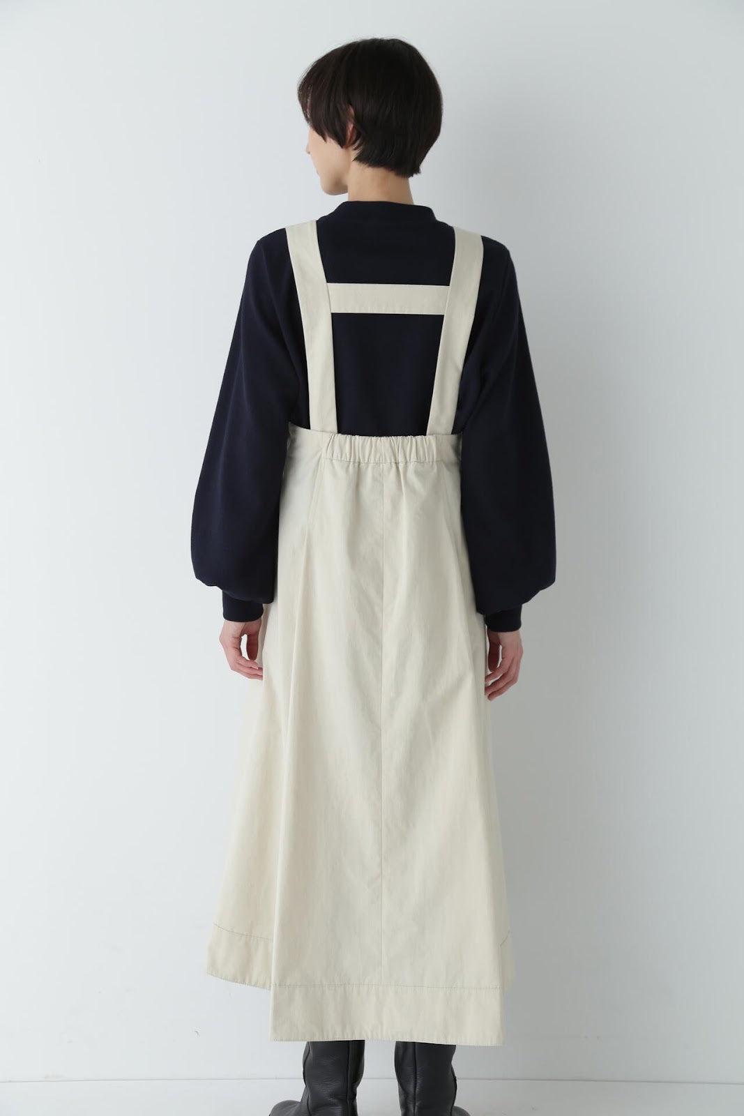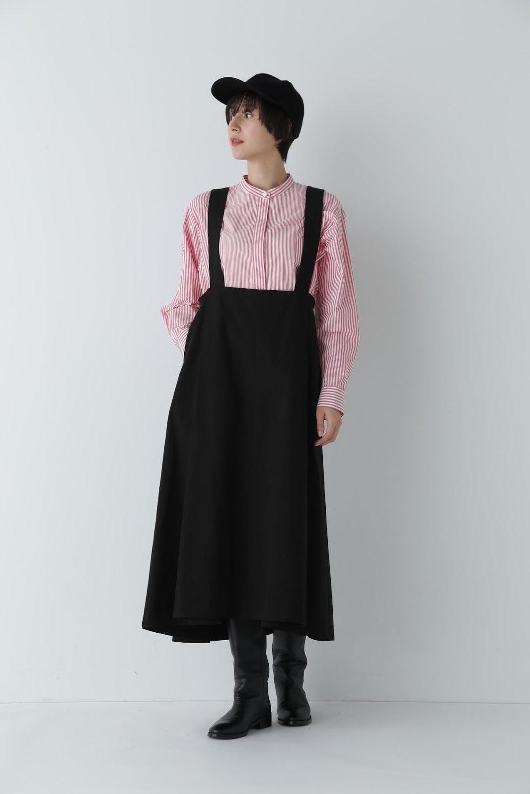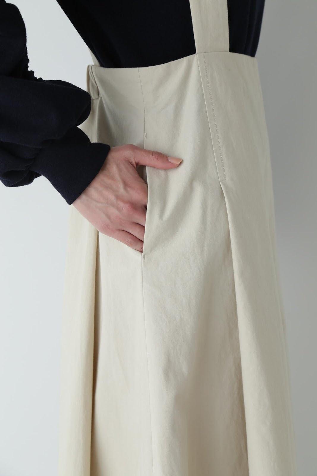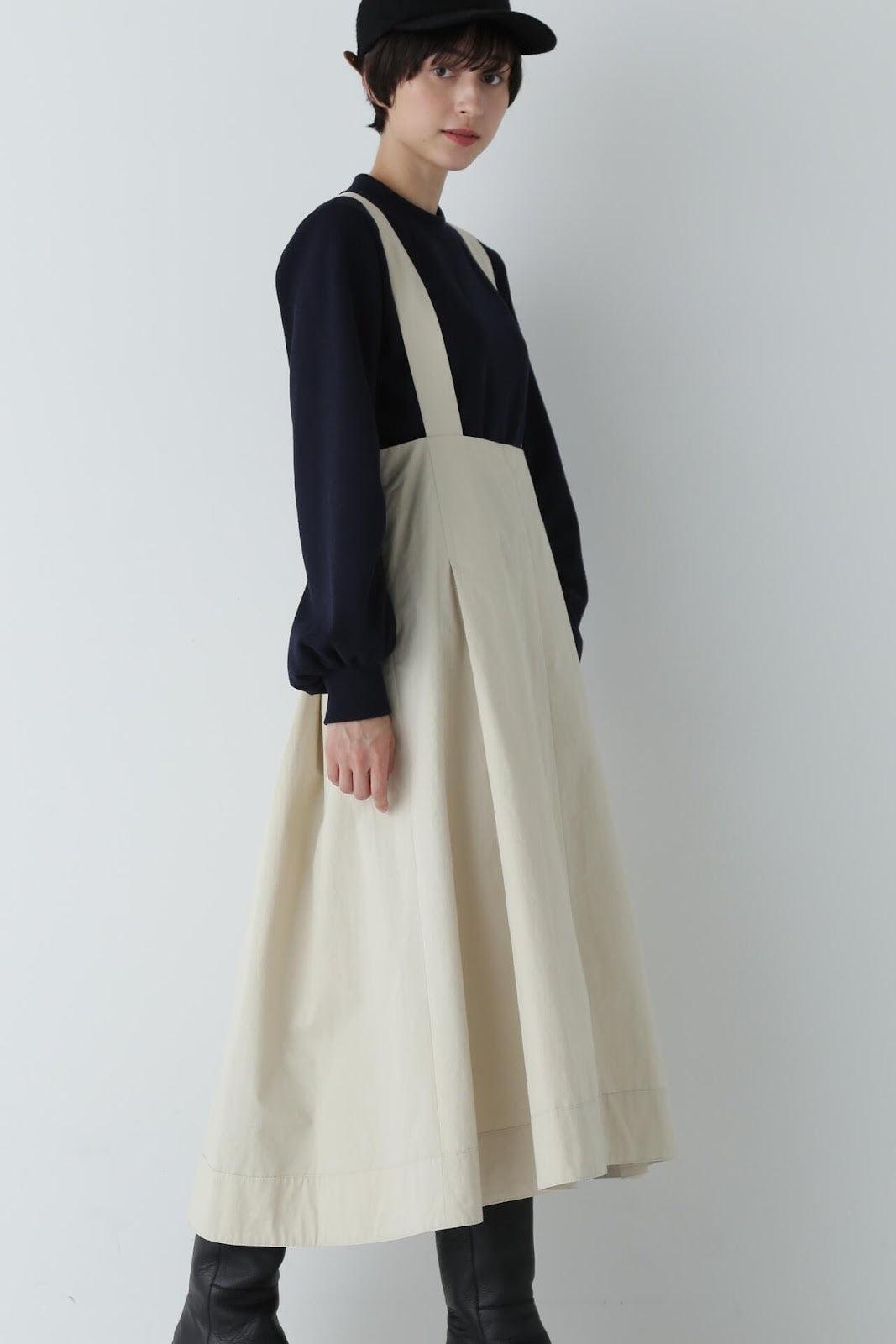 營造成人情調的吊帶喇叭裙 [設計要點] 這款喇叭裙採用了共生吊帶。大褶襉營造出奢華的體積感。裙襬前後留有空隙,便於不同身高的人搭配。面料採用高密度、緊密的天氣材料,染成復古風格,並經過水洗處理,呈現出獨特的水洗效果。這種面料可以一季又一季地使用,取決於你穿什麼作為內層。根據與內層搭配的單品不同,這種面料也可以無季節性地使用。