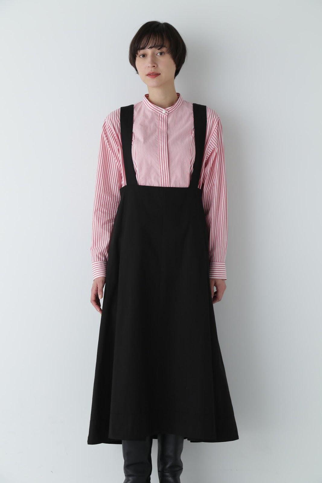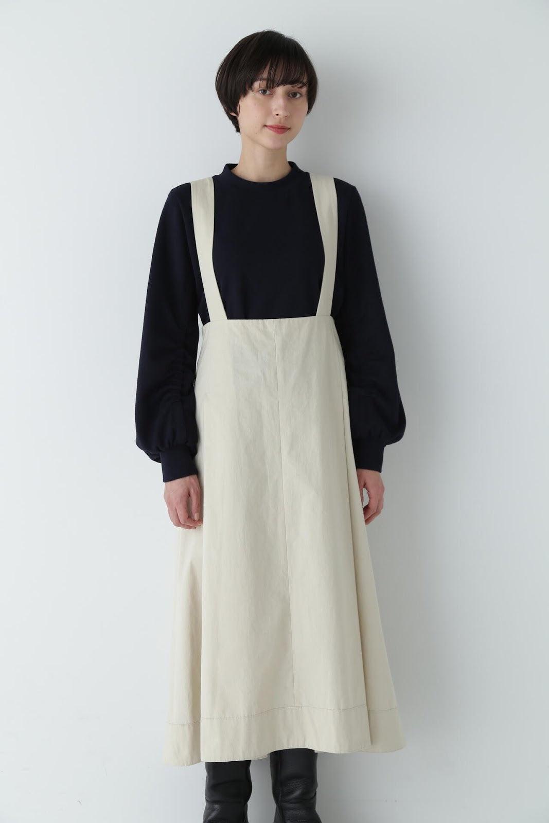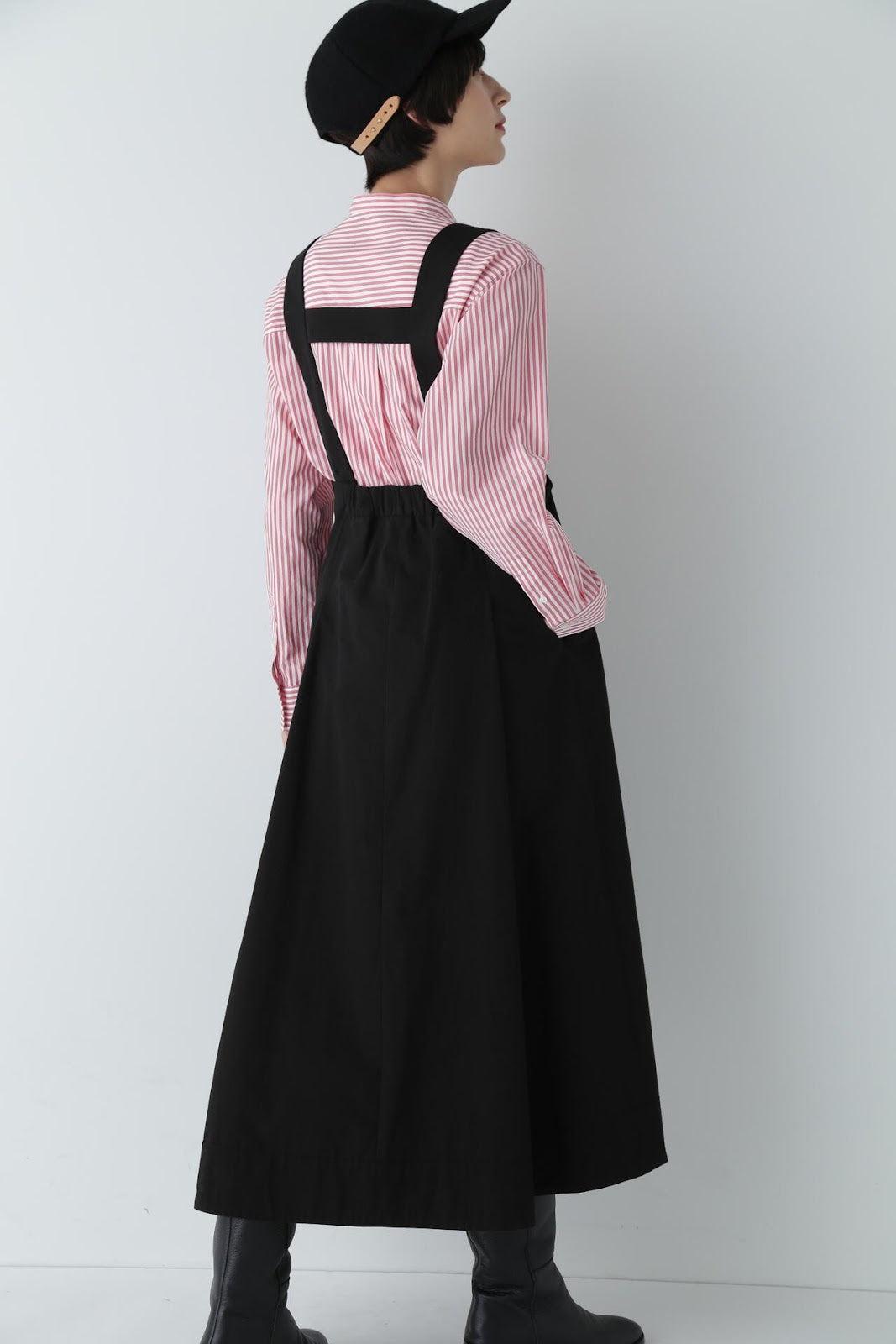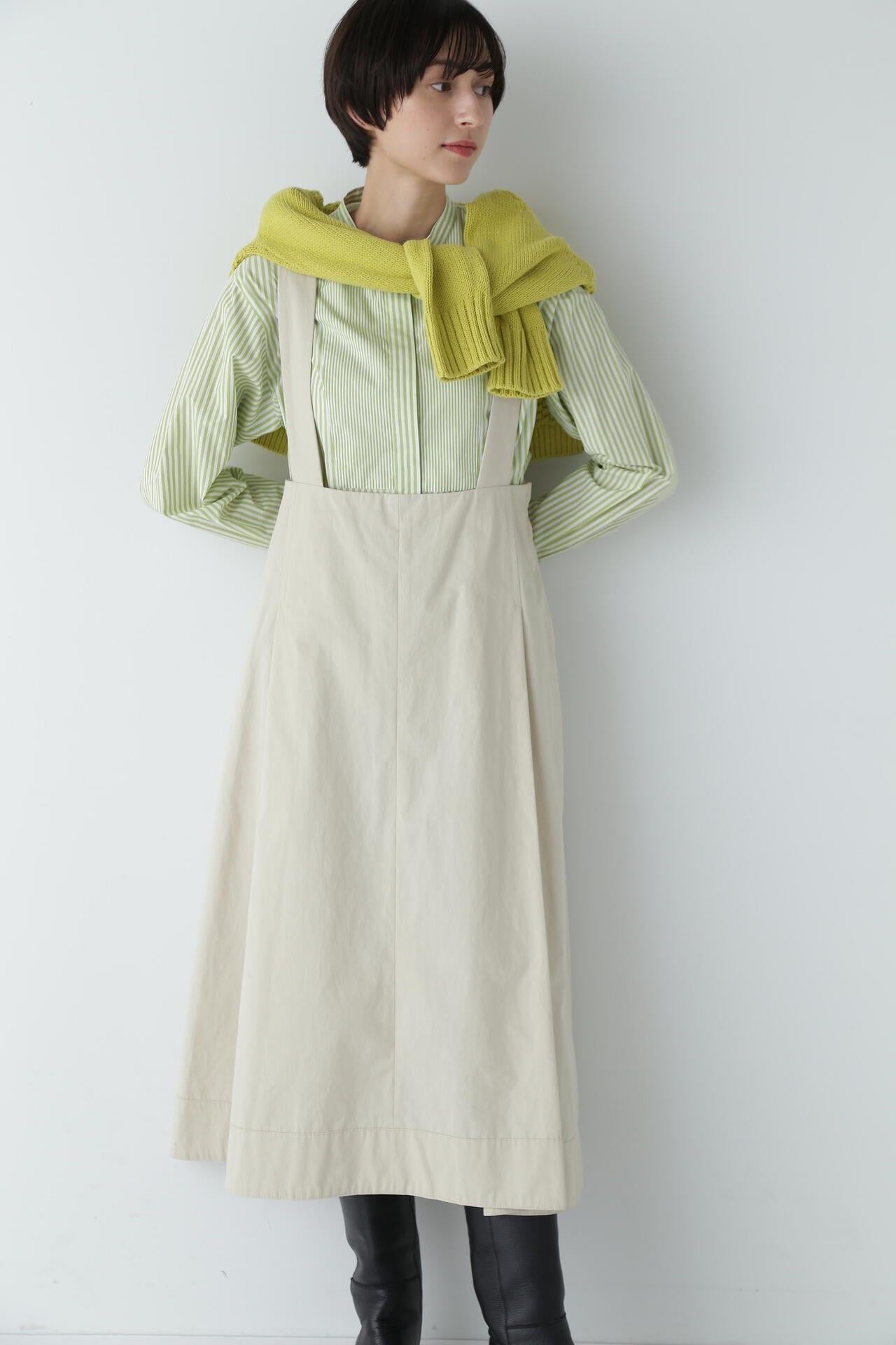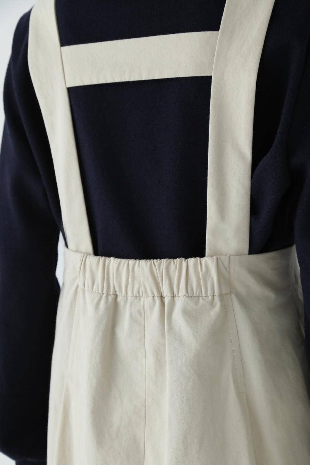營造成人情調的吊帶喇叭裙 [設計要點] 這款喇叭裙採用了共生吊帶。大褶襉營造出奢華的體積感。裙襬前後留有空隙,便於不同身高的人搭配。面料採用高密度、緊密的天氣材料,染成復古風格,並經過水洗處理,呈現出獨特的水洗效果。這種面料可以一季又一季地使用,取決於你穿什麼作為內層。根據與內層搭配的單品不同,這種面料也可以無季節性地使用。