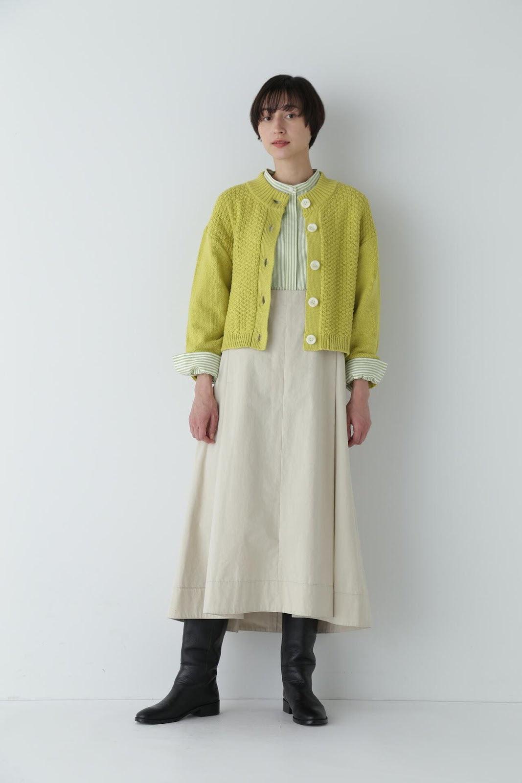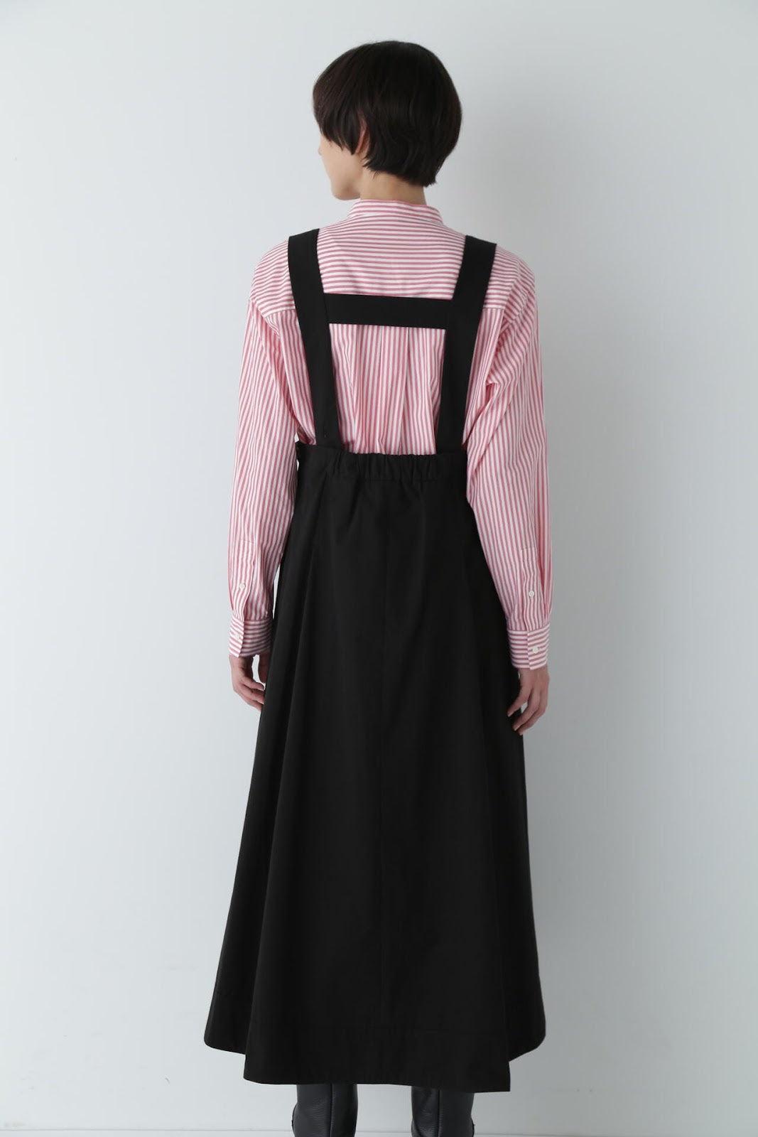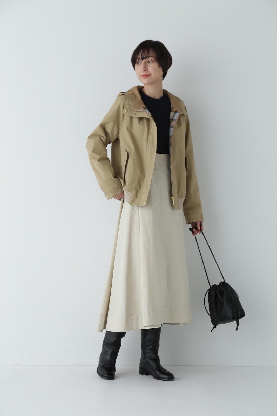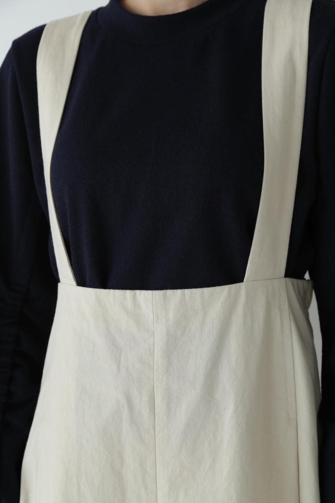營造成人情調的吊帶喇叭裙 [設計要點] 這款喇叭裙採用了共生吊帶。大褶襉營造出奢華的體積感。裙襬前後留有空隙,便於不同身高的人搭配。面料採用高密度、緊密的天氣材料,染成復古風格,並經過水洗處理,呈現出獨特的水洗效果。這種面料可以一季又一季地使用,取決於你穿什麼作為內層。根據與內層搭配的單品不同,這種面料也可以無季節性地使用。