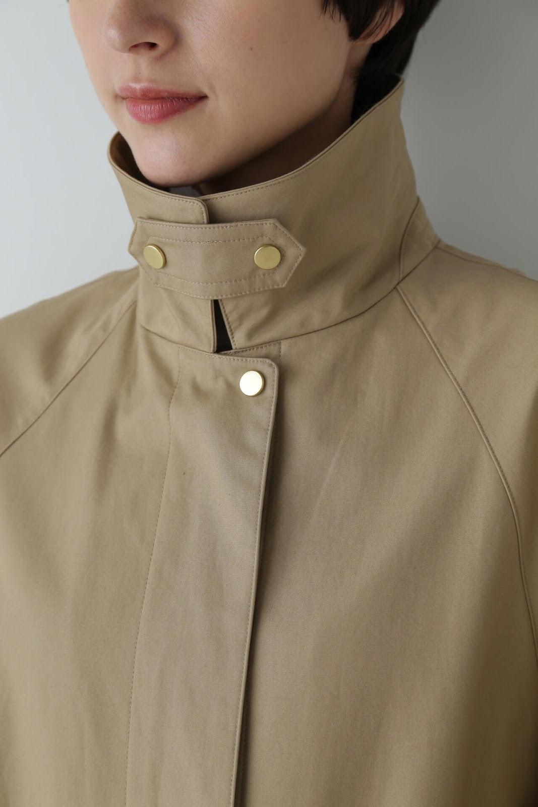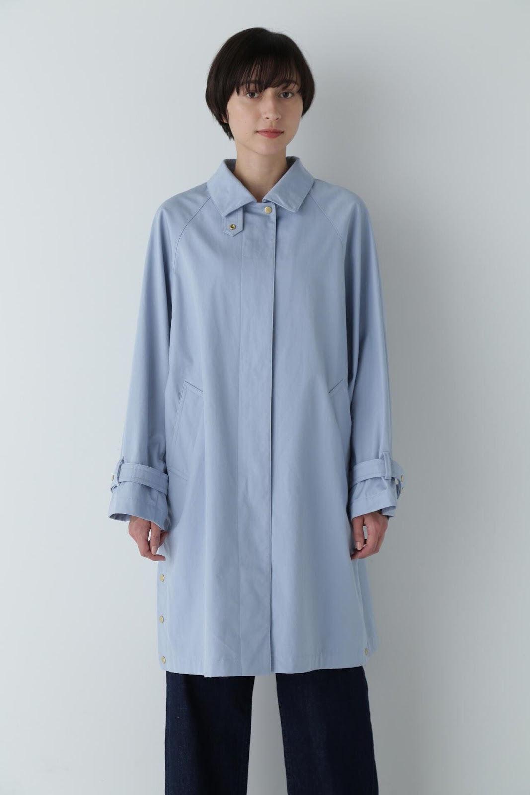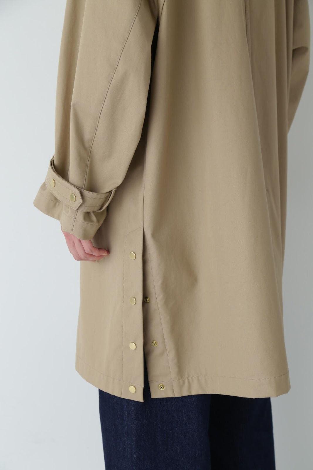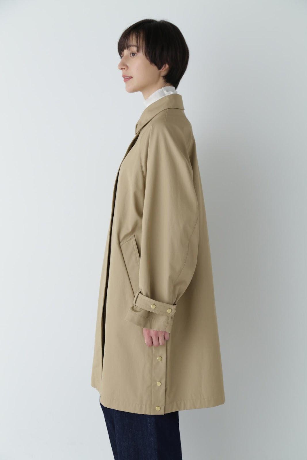 優雅的成人不鏽鋼領大衣,色彩柔和,如沐春風 [設計特色] 不鏽鋼領大衣,採用寬袖圍的插肩袖。可通過打開側面的圓點紐扣來安排開衩。後領的迷你腰帶可以收起,將其變為立領。正面由純棉寬布製成,背面由粘合材料與易穿的純棉針織布層壓而成。針織面料粘合在反面,以減少反彈。大衣的尺寸可以搭配過大的上衣,因此很容易與寒冷季節的冬季針織衫搭配穿著。同時還開發了連帽外套,如anorak blouson。