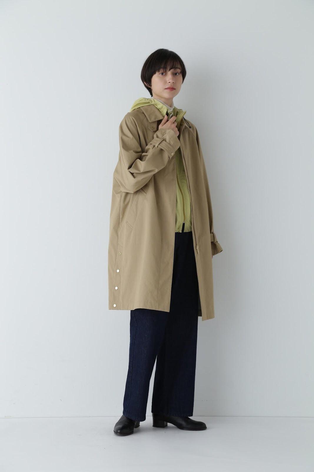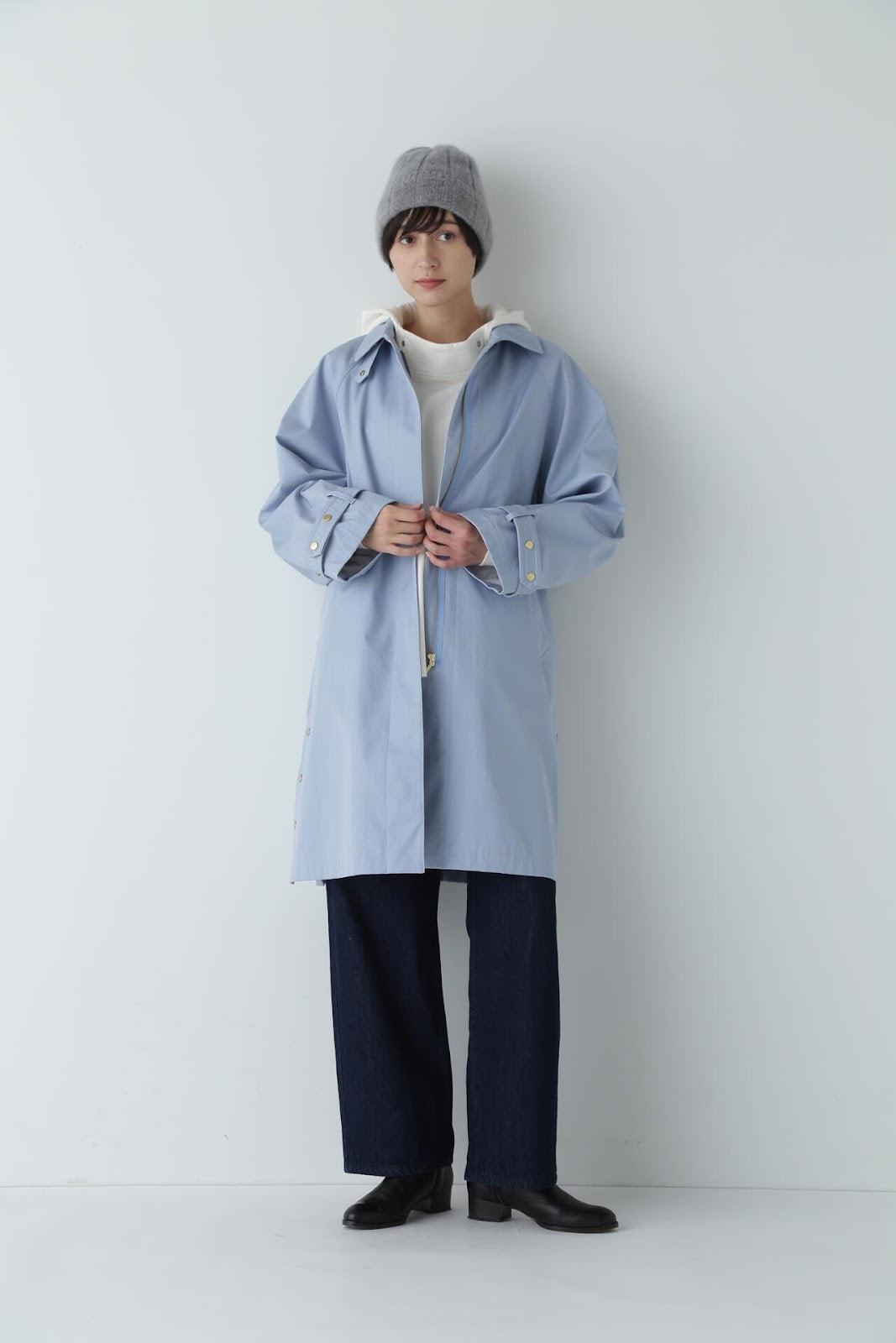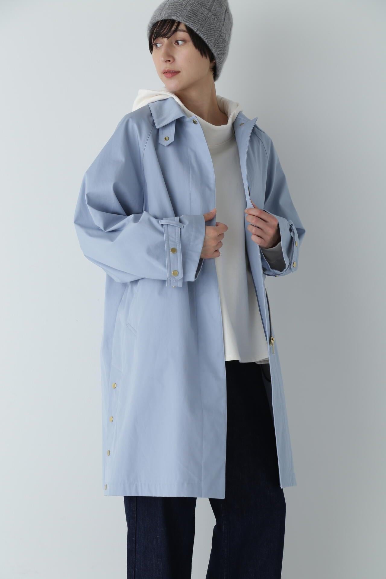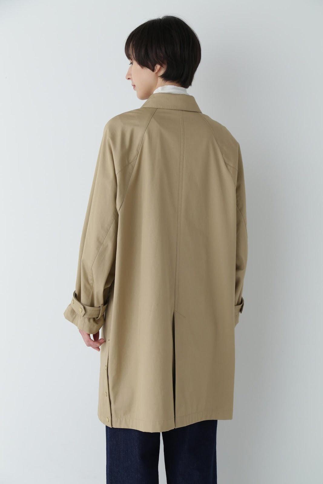 優雅的成人不鏽鋼領大衣,色彩柔和,如沐春風 [設計特色] 不鏽鋼領大衣,採用寬袖圍的插肩袖。可通過打開側面的圓點紐扣來安排開衩。後領的迷你腰帶可以收起,將其變為立領。正面由純棉寬布製成,背面由粘合材料與易穿的純棉針織布層壓而成。針織面料粘合在反面,以減少反彈。大衣的尺寸可以搭配過大的上衣,因此很容易與寒冷季節的冬季針織衫搭配穿著。同時還開發了連帽外套,如anorak blouson。