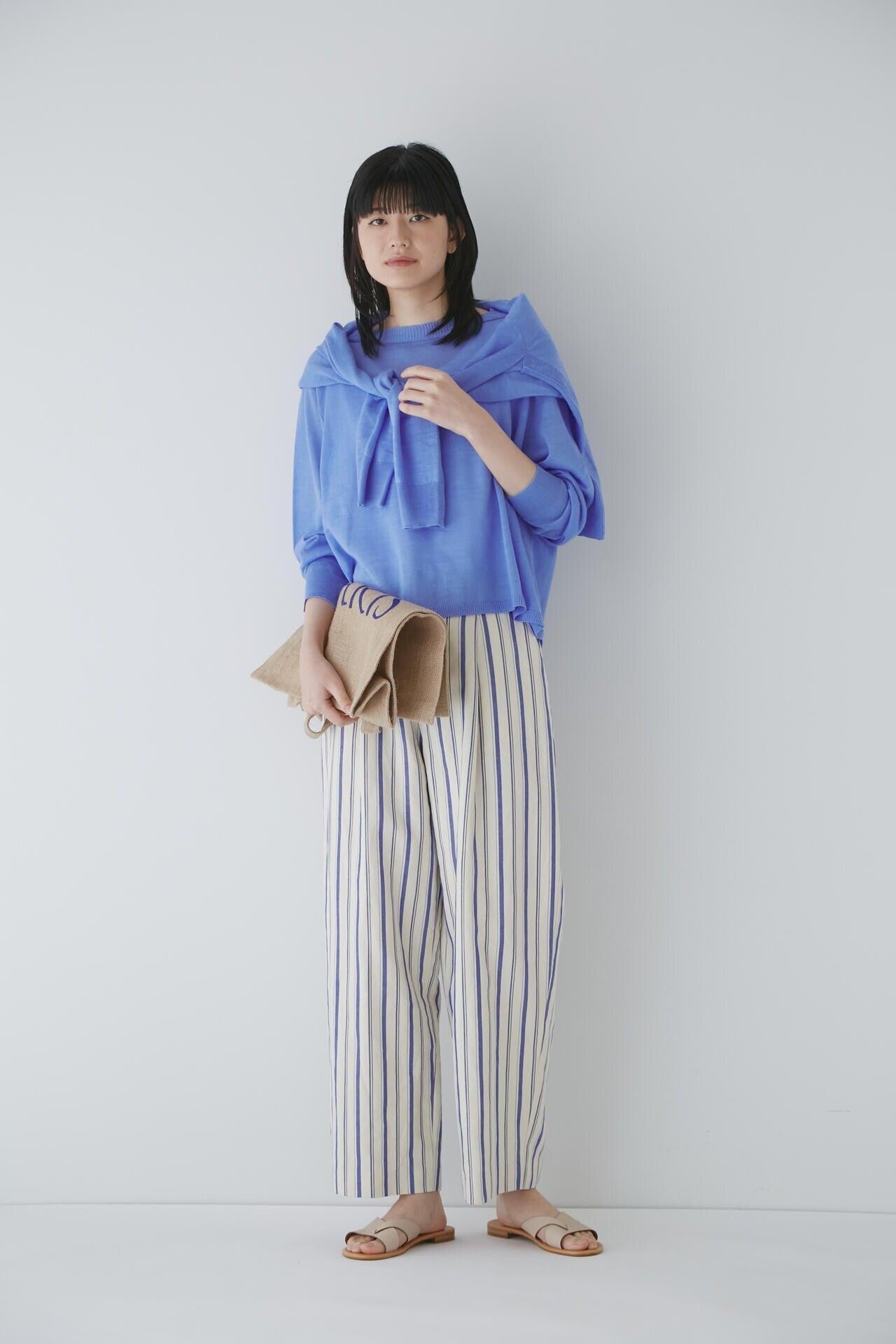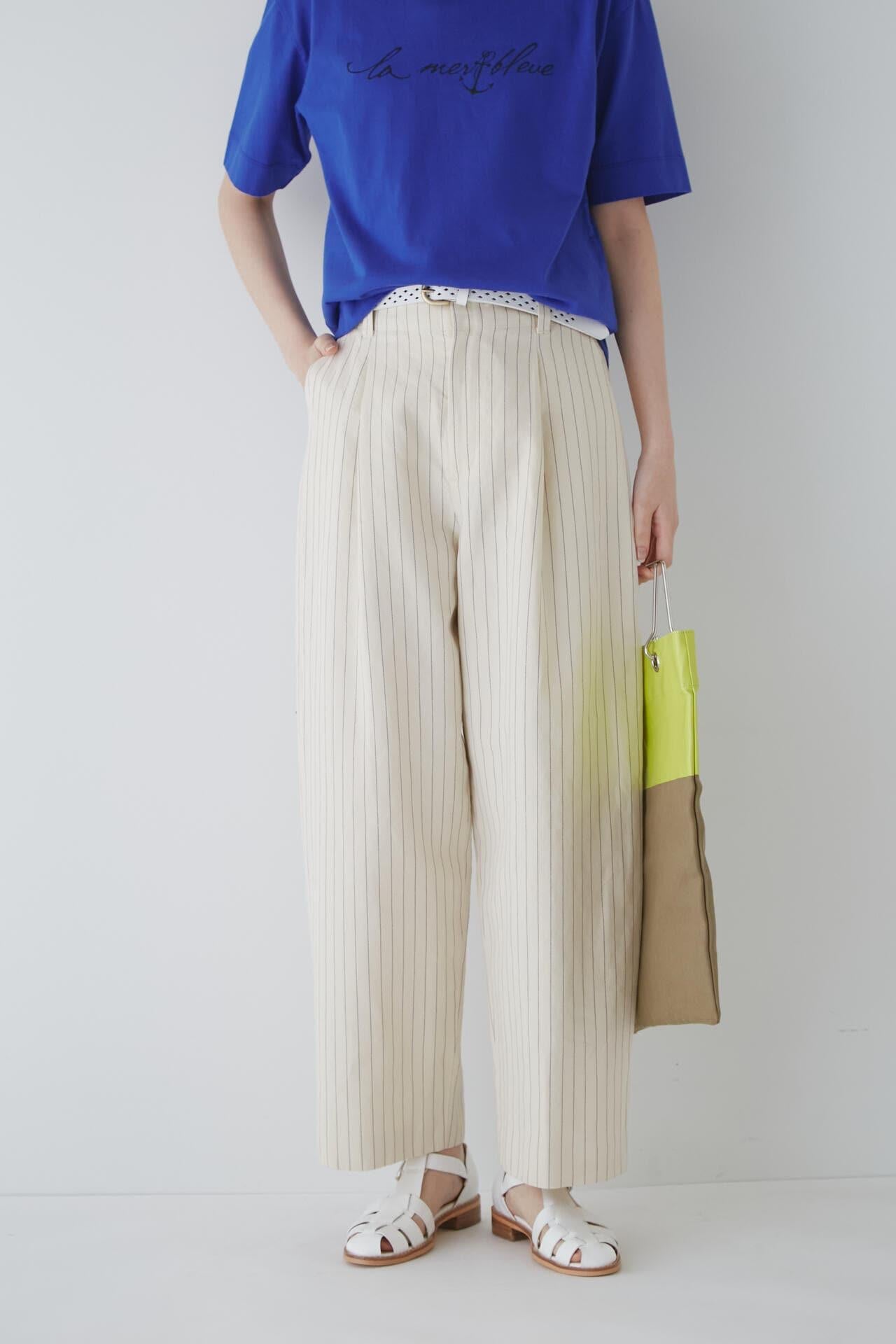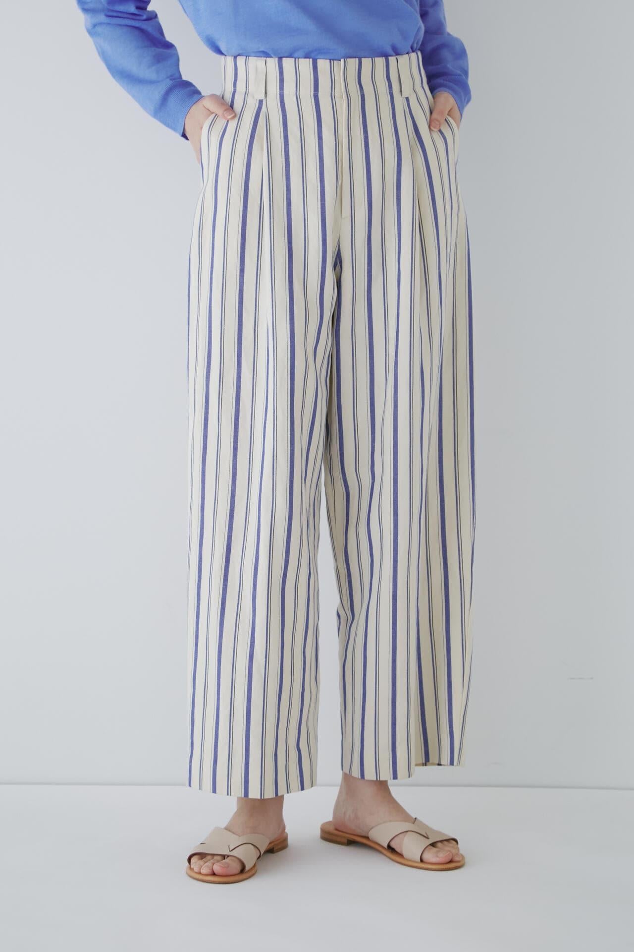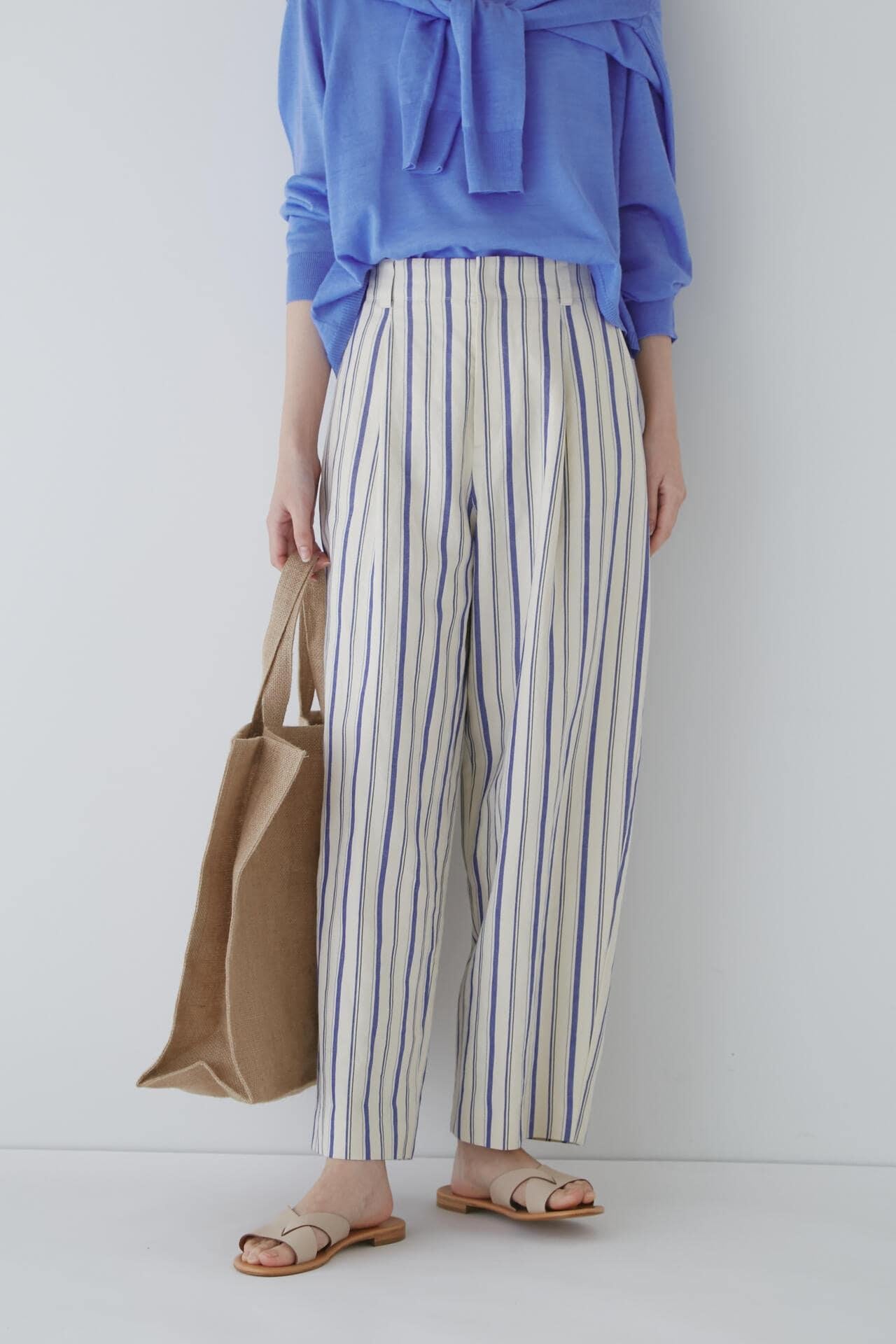舒適的繭型廓形長褲,採用柔軟的條紋面料 [設計特色] 採用條紋面料製作的繭型廓形長褲,特別柔軟。腰後皮帶上的海洋風格繫帶是這款長褲的一大亮點,並將其整齊地延續下去。有兩種不同表現形式的顏色可供選擇:蔚藍色基底上的紫色細條紋和蔚藍色基底上的清新藍色多條紋。面料採用獨創的條紋棉麻牛面料,具有細微的柔軟感,編織和整理效果甜美。建議搭配:可與同種面料製成的夾克衫搭配,或與麻質上衣搭配,打造今年非常流行的都市風格。