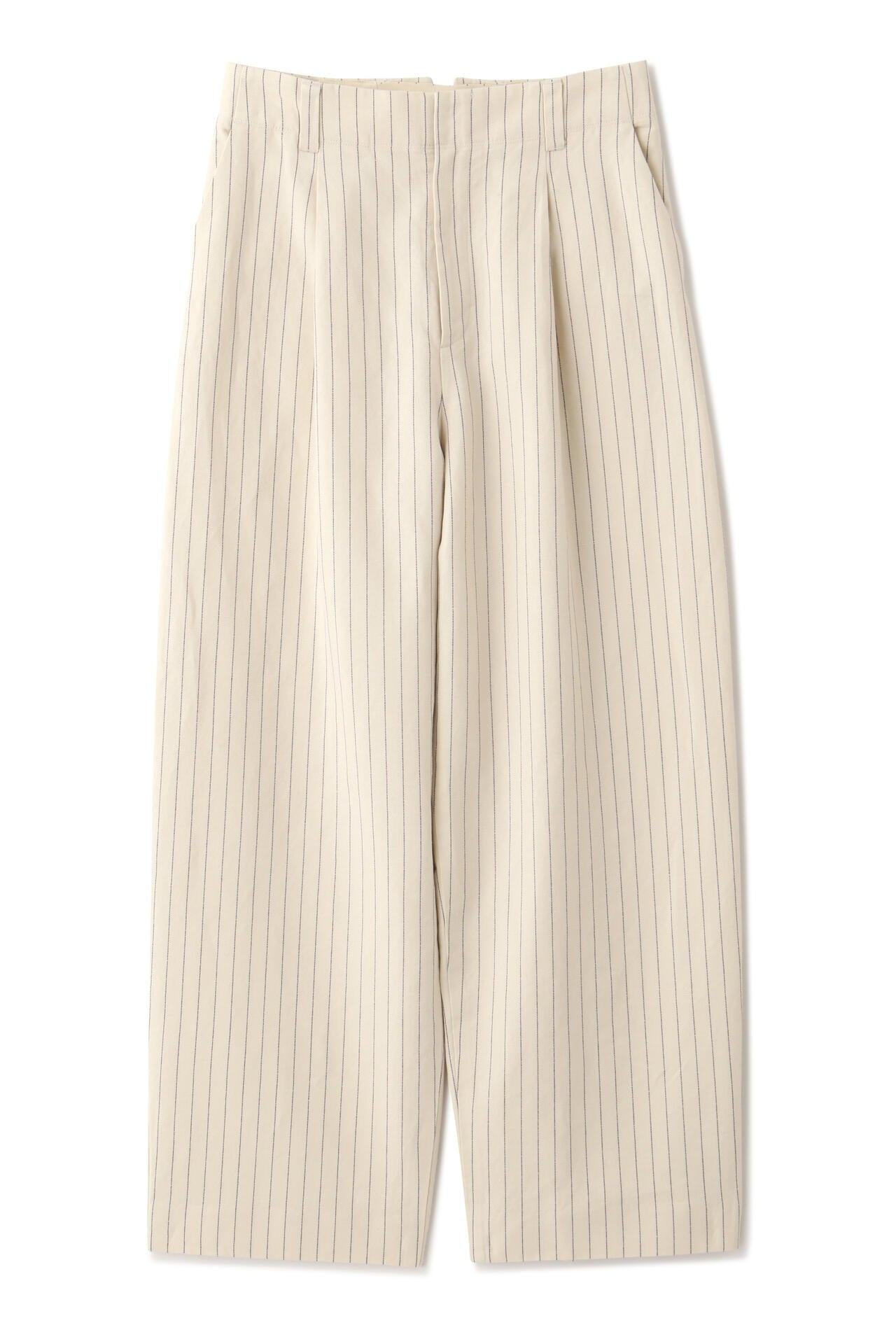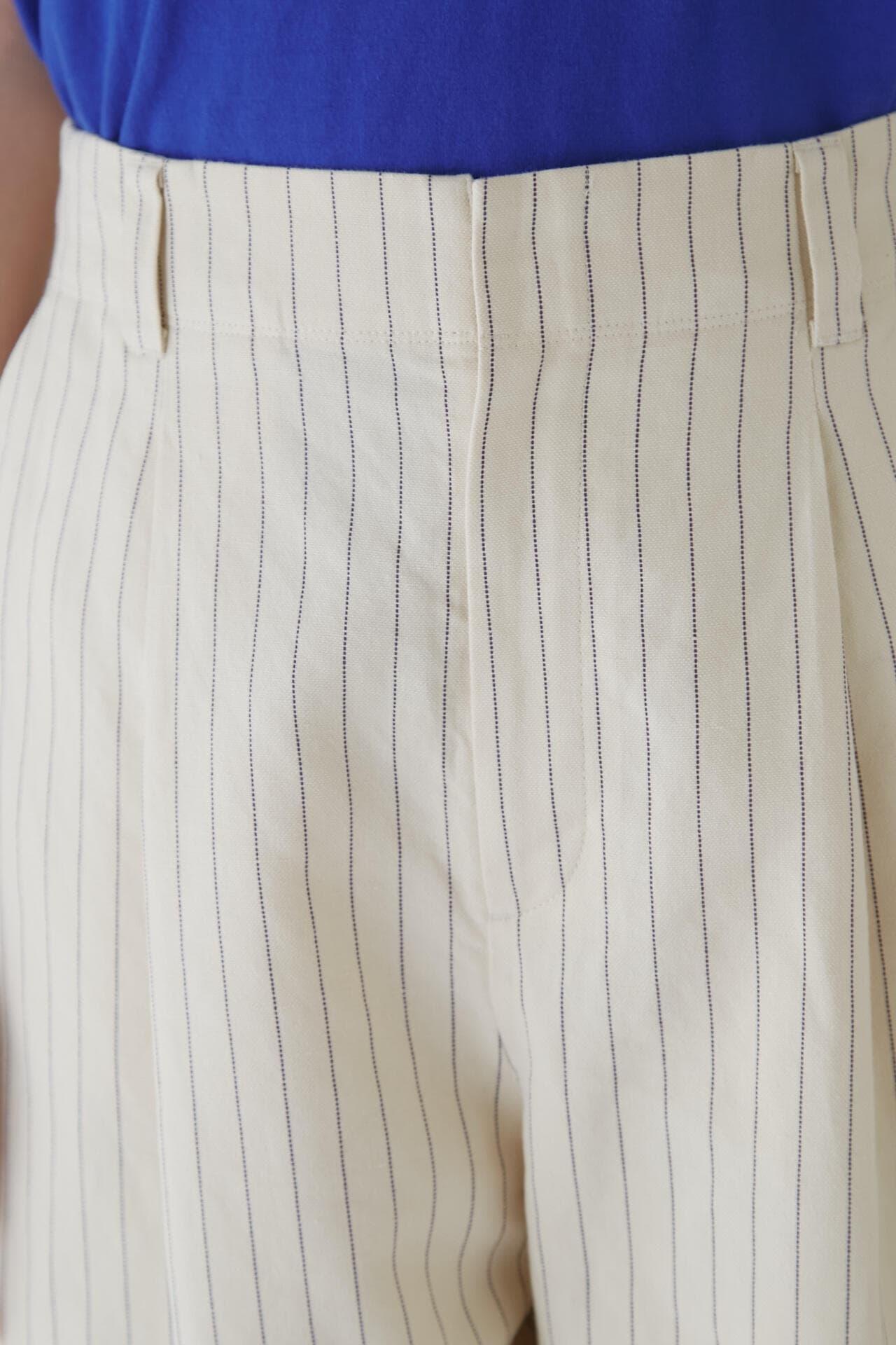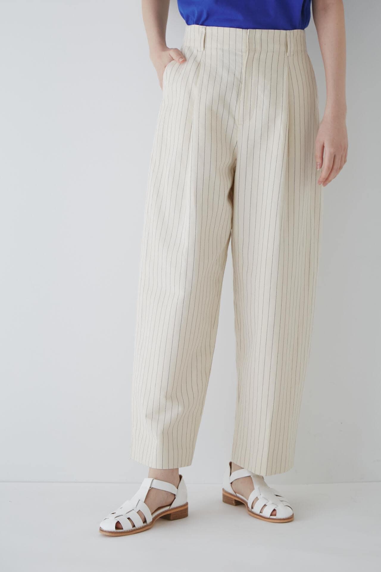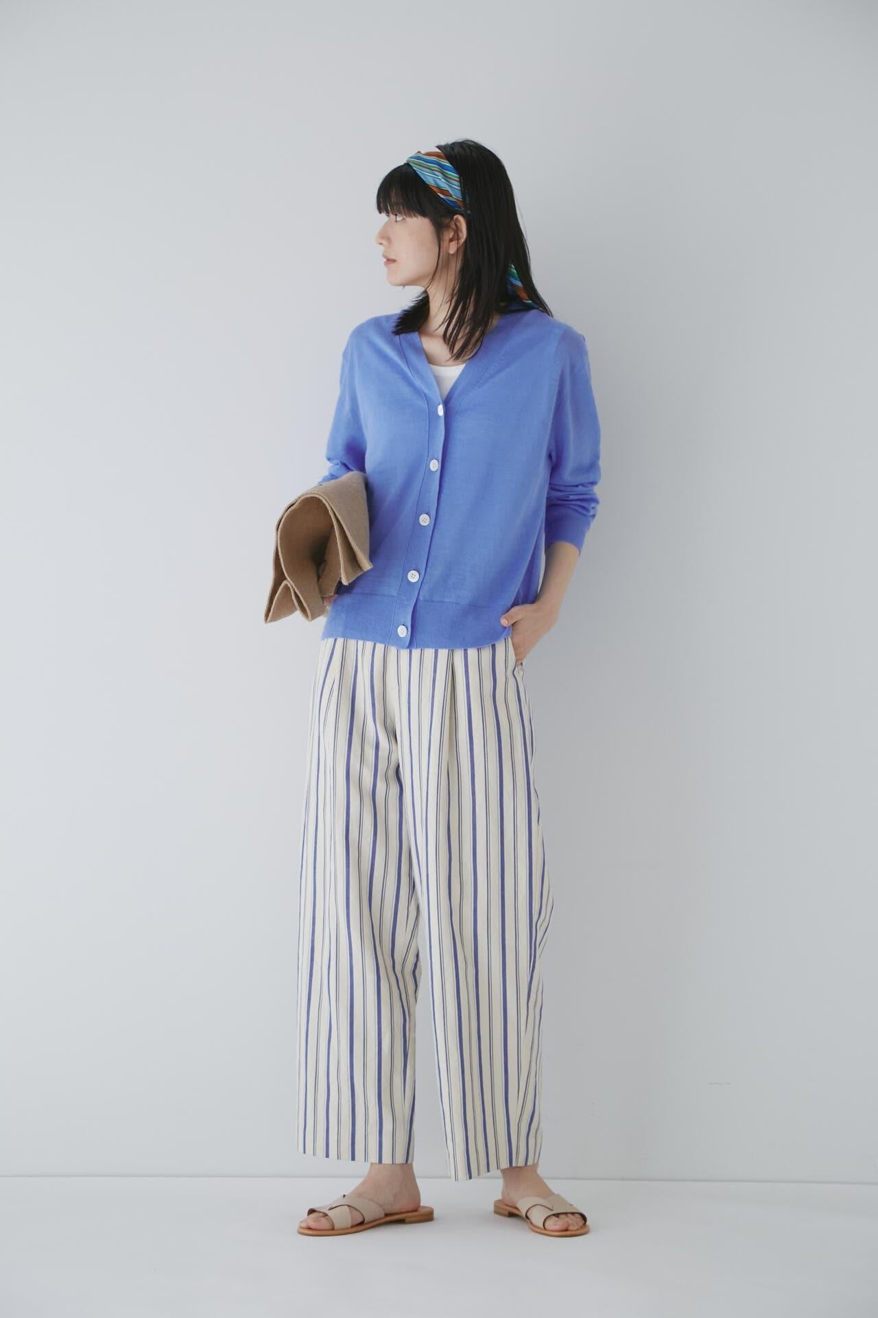 舒適的繭型廓形長褲,採用柔軟的條紋面料 [設計特色] 採用條紋面料製作的繭型廓形長褲,特別柔軟。腰後皮帶上的海洋風格繫帶是這款長褲的一大亮點,並將其整齊地延續下去。有兩種不同表現形式的顏色可供選擇:蔚藍色基底上的紫色細條紋和蔚藍色基底上的清新藍色多條紋。面料採用獨創的條紋棉麻牛面料,具有細微的柔軟感,編織和整理效果甜美。建議搭配:可與同種面料製成的夾克衫搭配,或與麻質上衣搭配,打造今年非常流行的都市風格。