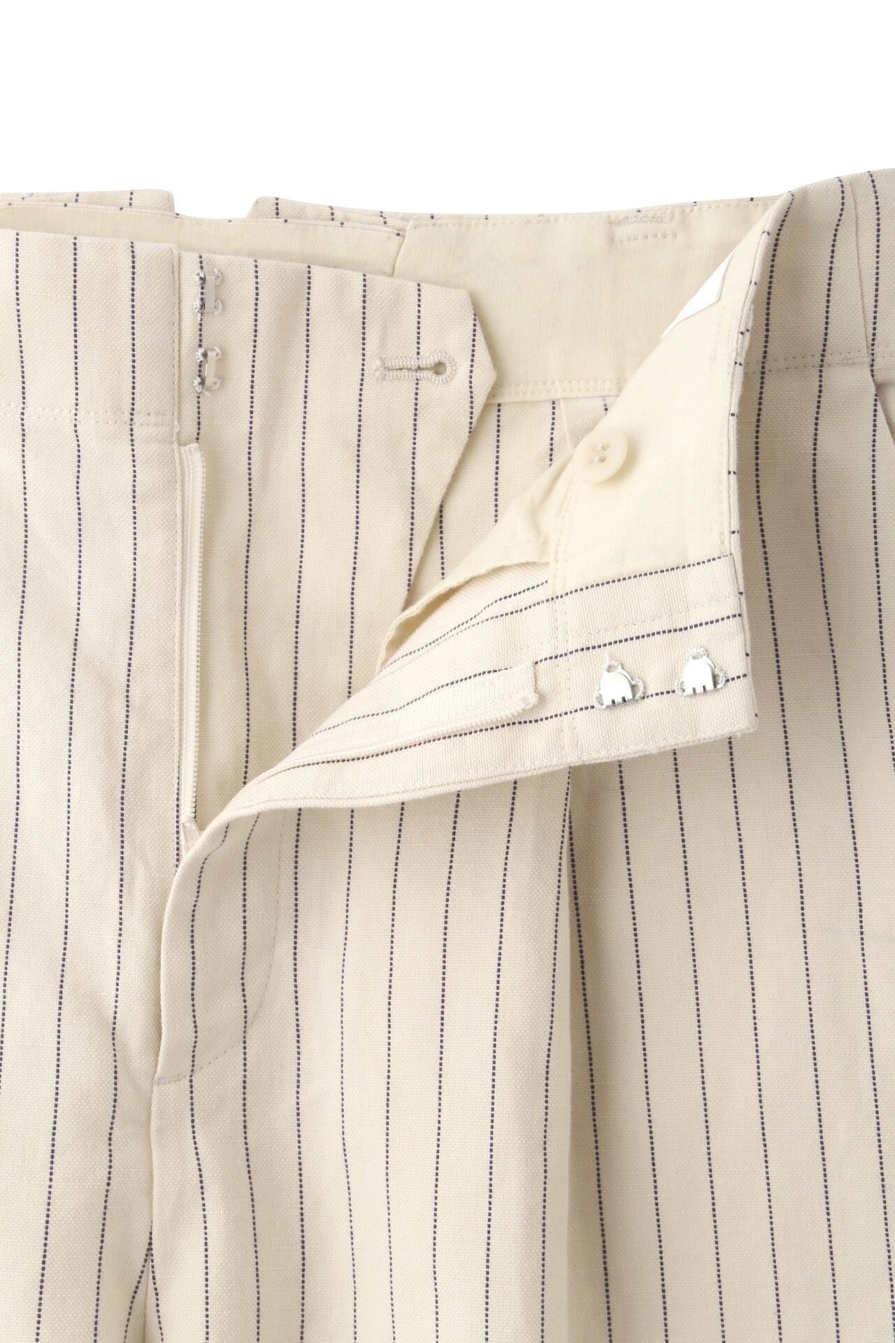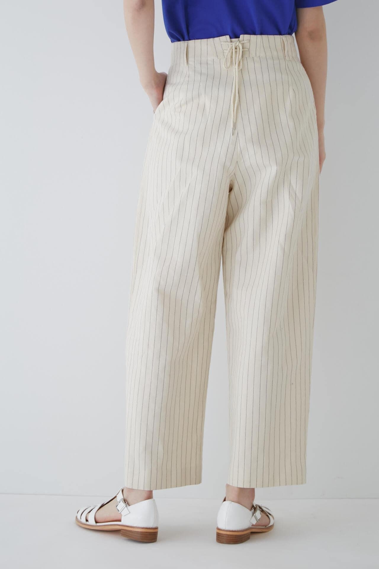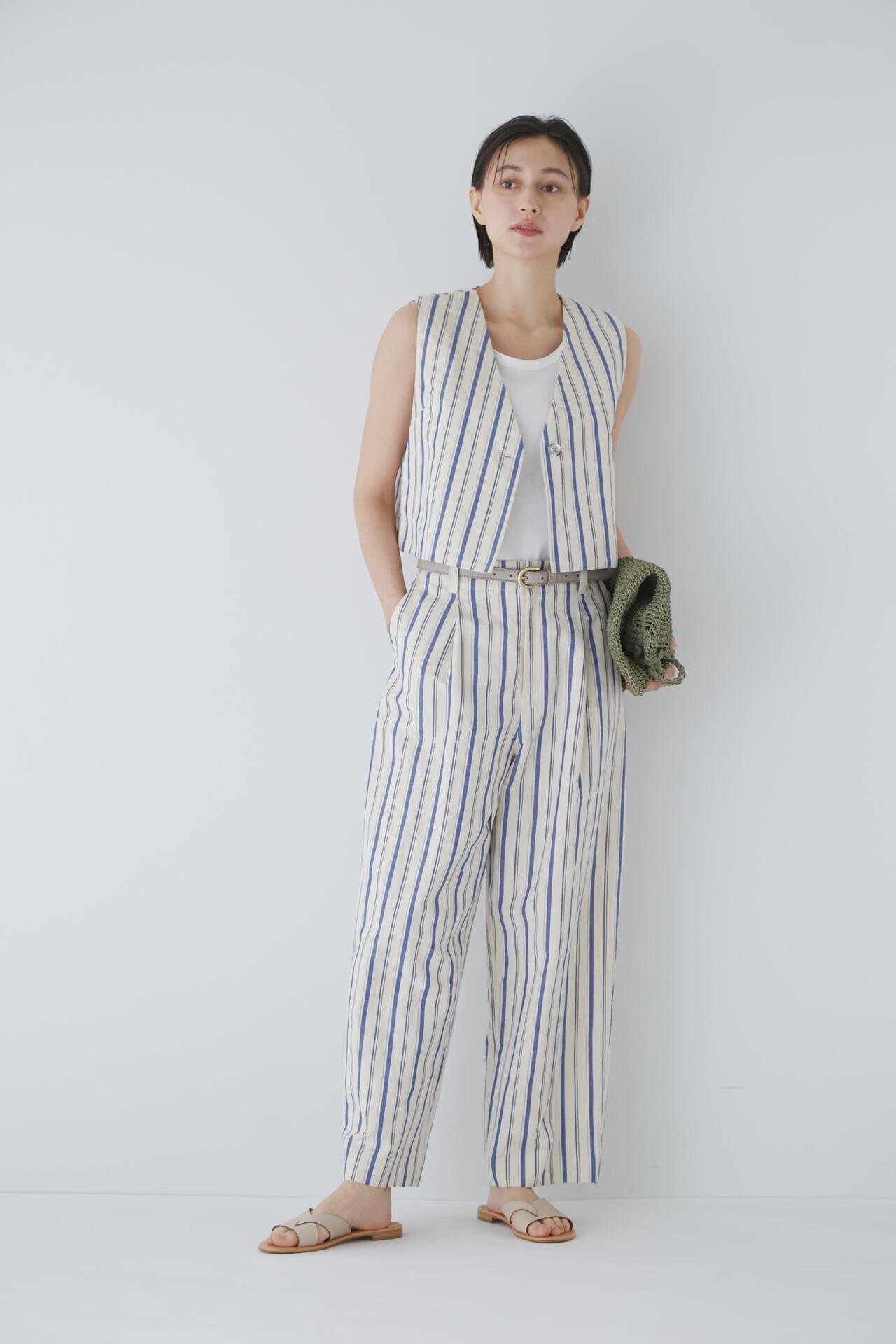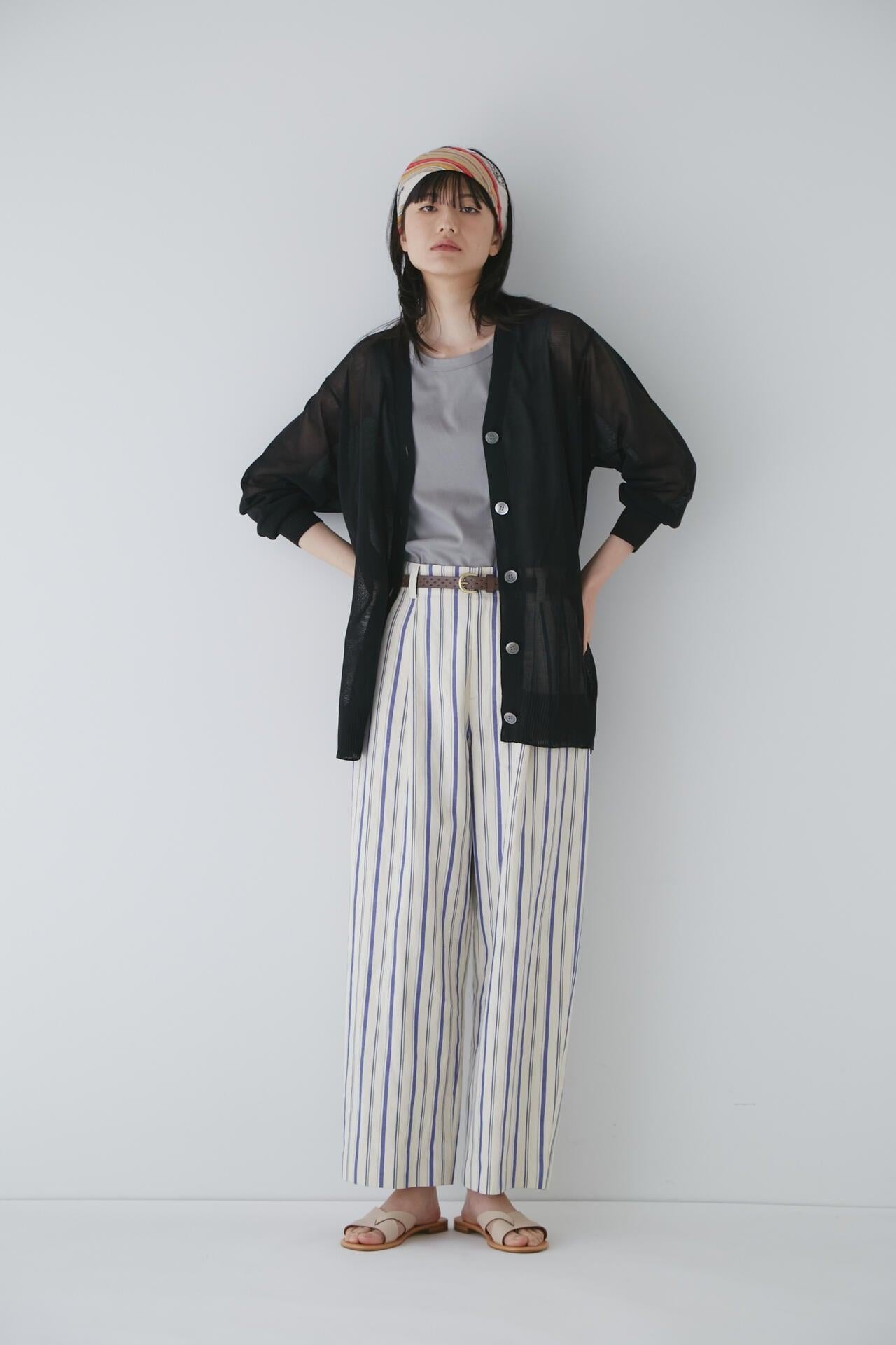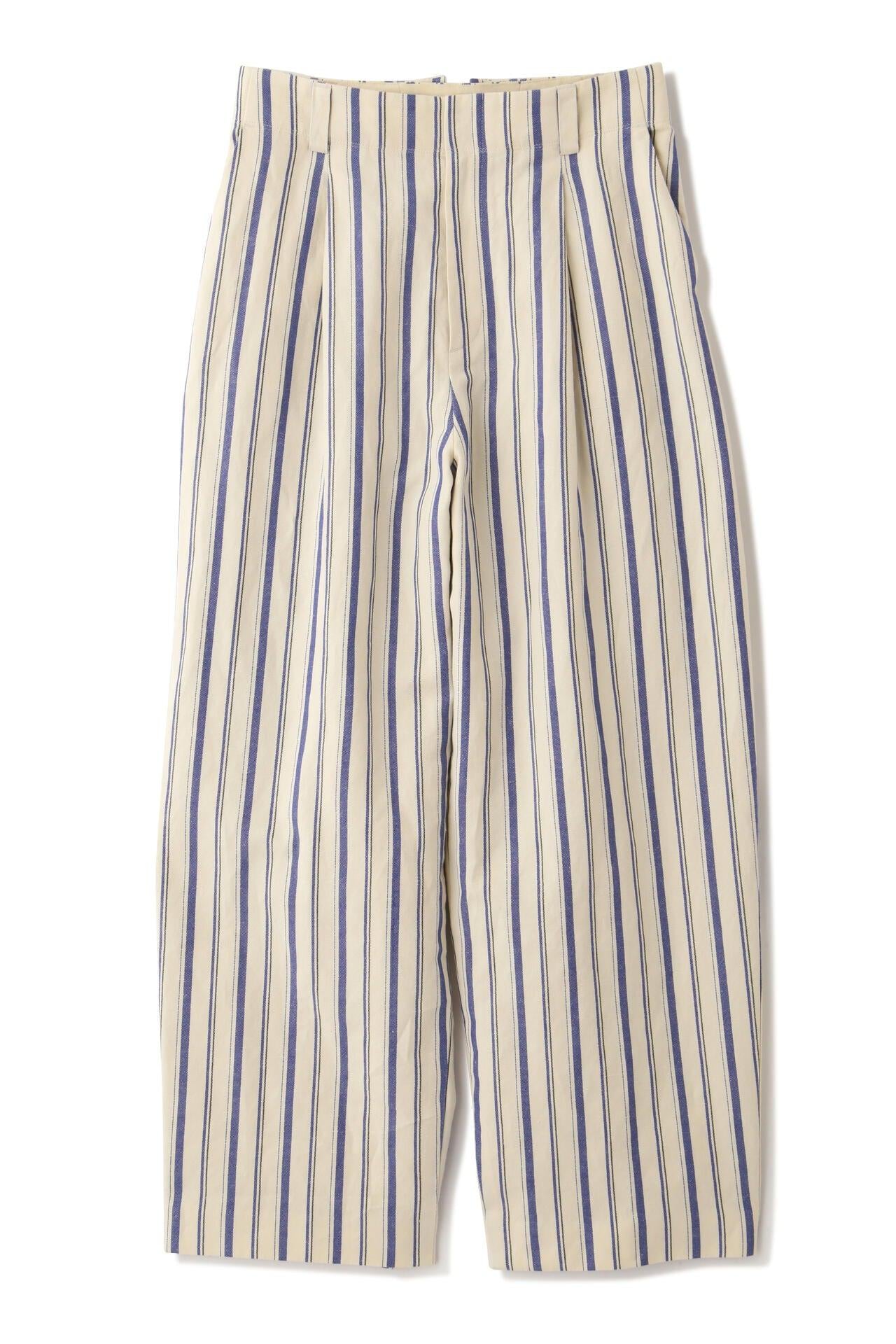 舒適的繭型廓形長褲,採用柔軟的條紋面料 [設計特色] 採用條紋面料製作的繭型廓形長褲,特別柔軟。腰後皮帶上的海洋風格繫帶是這款長褲的一大亮點,並將其整齊地延續下去。有兩種不同表現形式的顏色可供選擇:蔚藍色基底上的紫色細條紋和蔚藍色基底上的清新藍色多條紋。面料採用獨創的條紋棉麻牛面料,具有細微的柔軟感,編織和整理效果甜美。建議搭配:可與同種面料製成的夾克衫搭配,或與麻質上衣搭配,打造今年非常流行的都市風格。