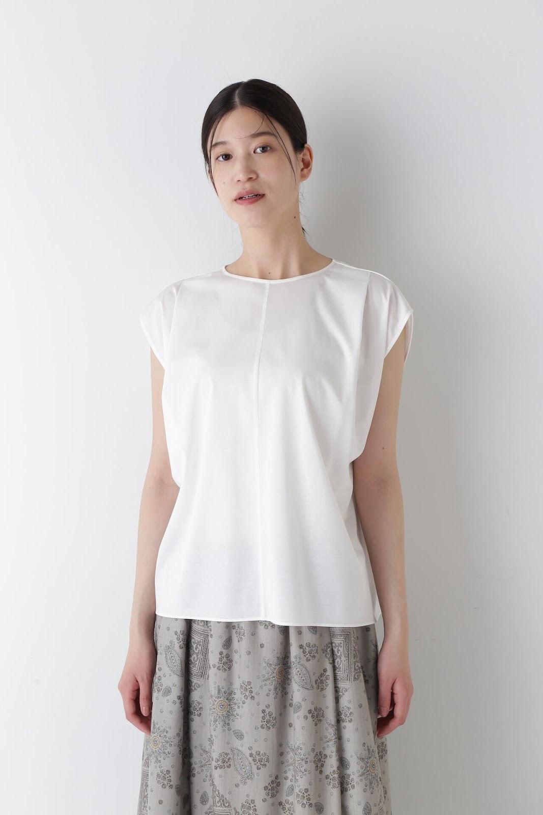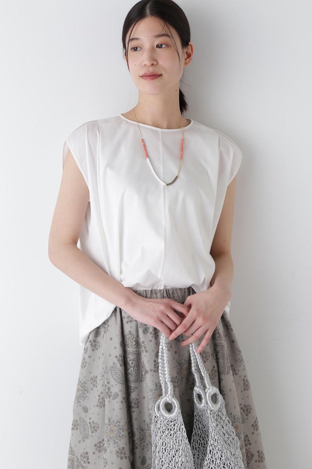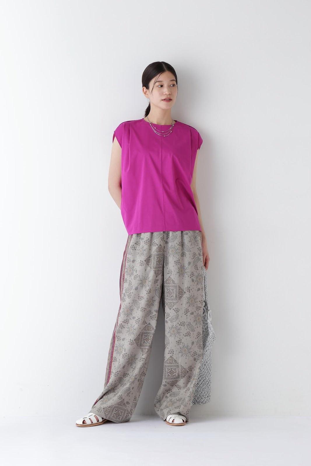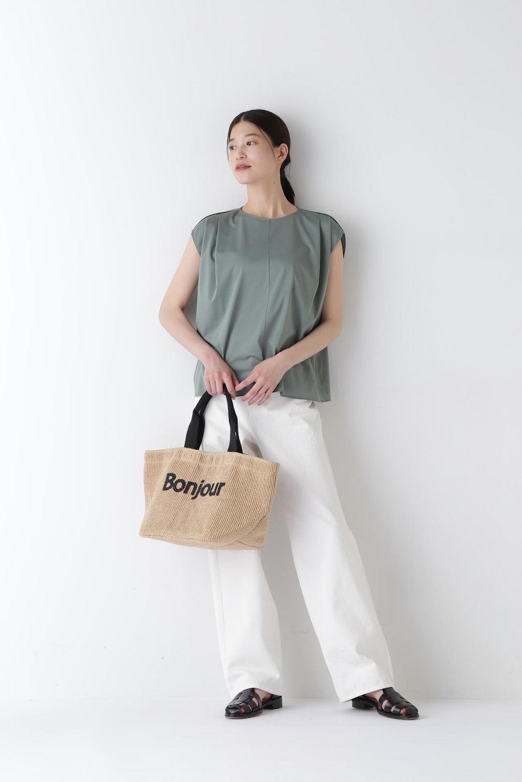 剪裁與縫製兼具女性魅力與舒適感 [設計要點] 這款剪裁與縫製相結合的套頭衫,深法式袖子,中間剪裁的多爾曼袖子看起來很細緻。面料採用全梭織工藝,乾淨利落。面料採用針織面料,既有梭織面料的手感,又保留了裁剪縫製服裝的舒適質感。該產品有三種顏色可供選擇:純白色、點彩粉色和淺綠色。裁剪縫製的面料給人留下了美好的印象,因此建議用於辦公室場景。此外,它也是搭配圖案或彩色下裝的完美單品,例如同期推出的摩洛哥印花長褲。