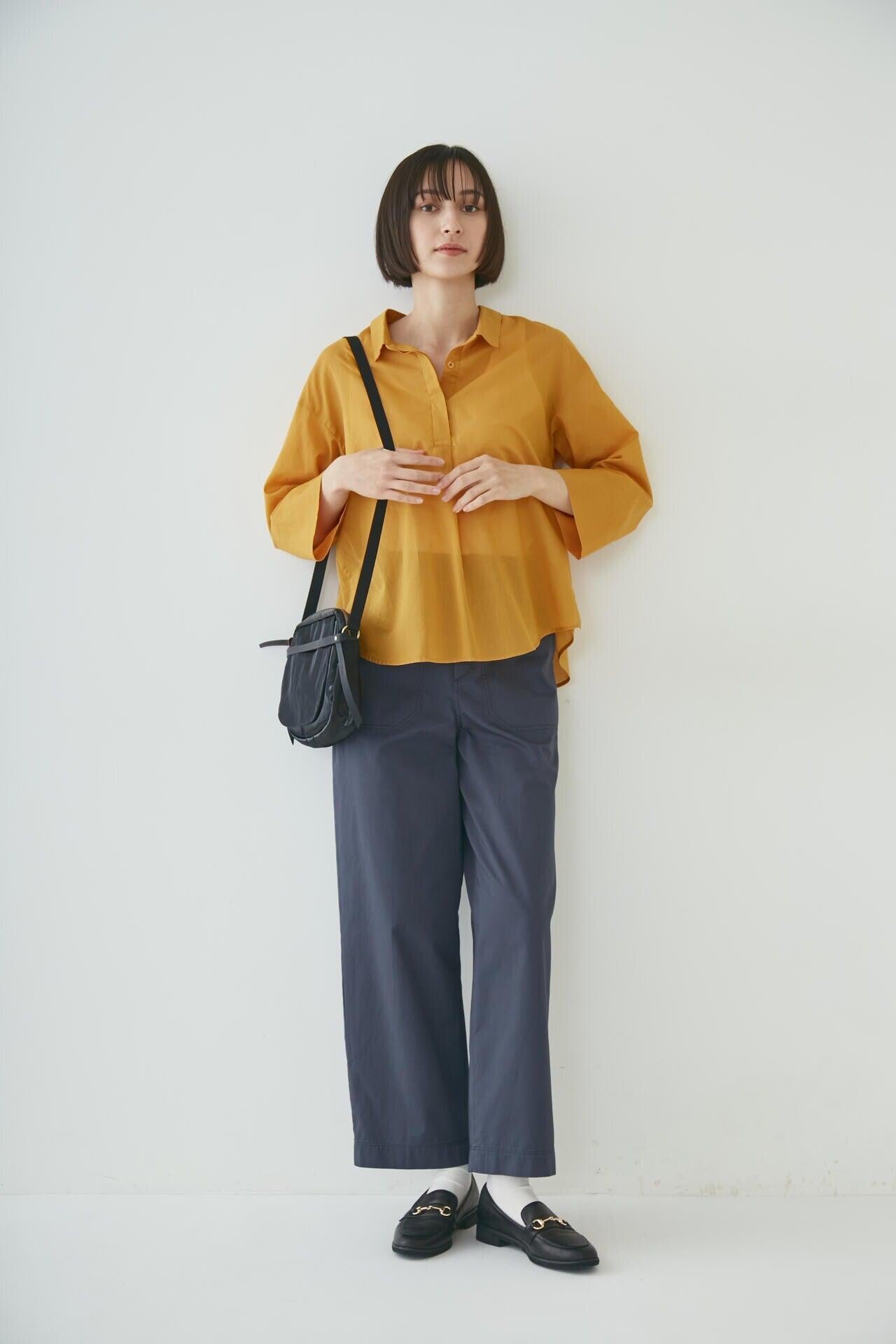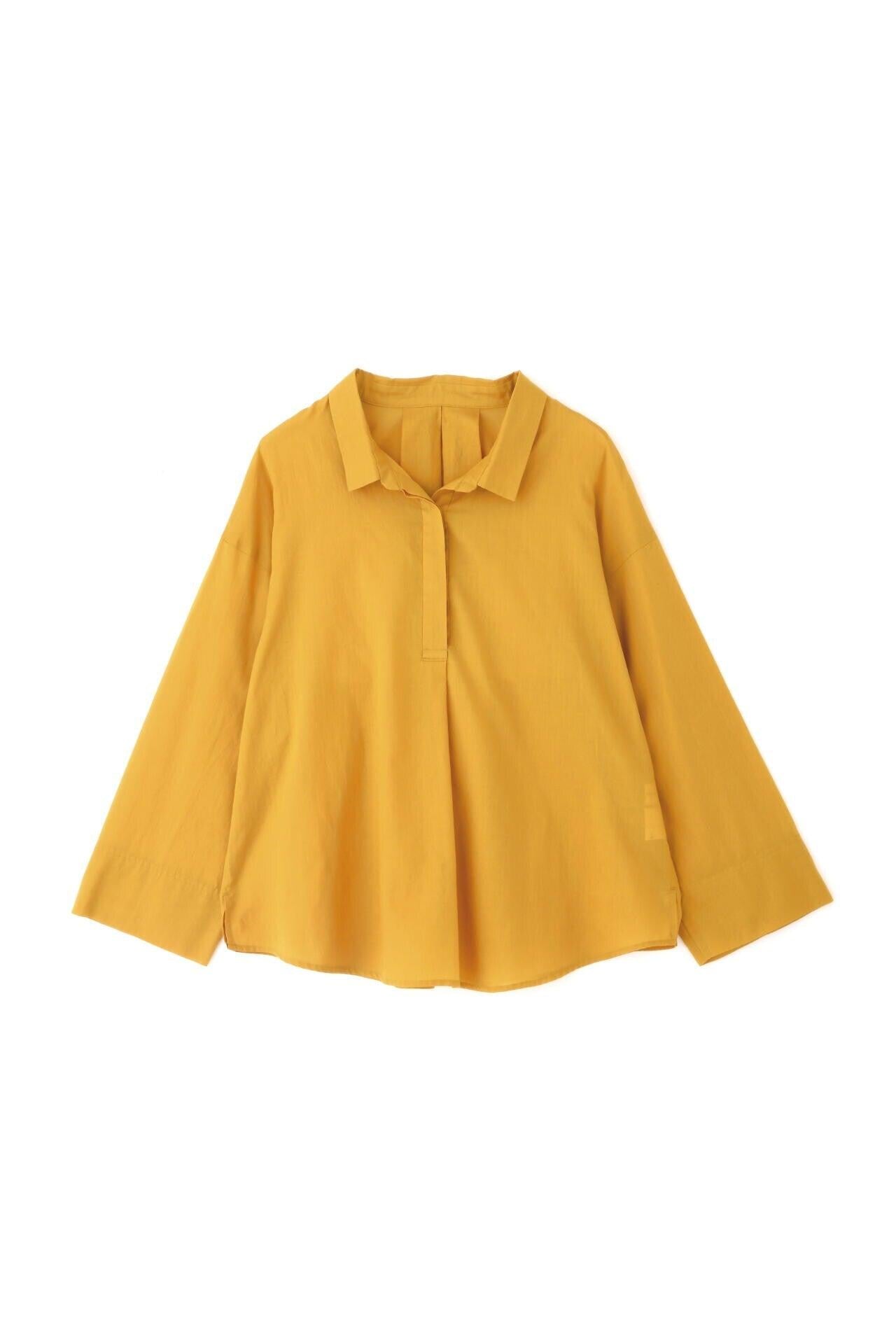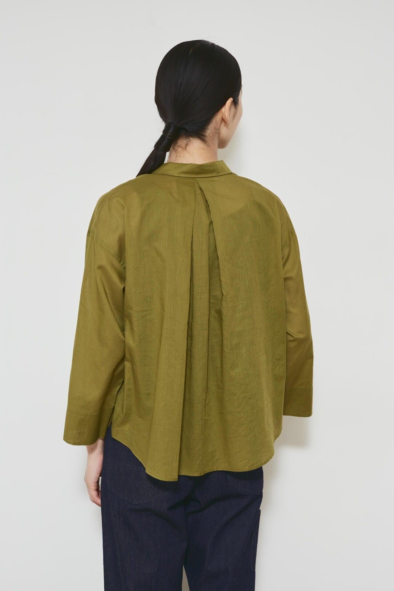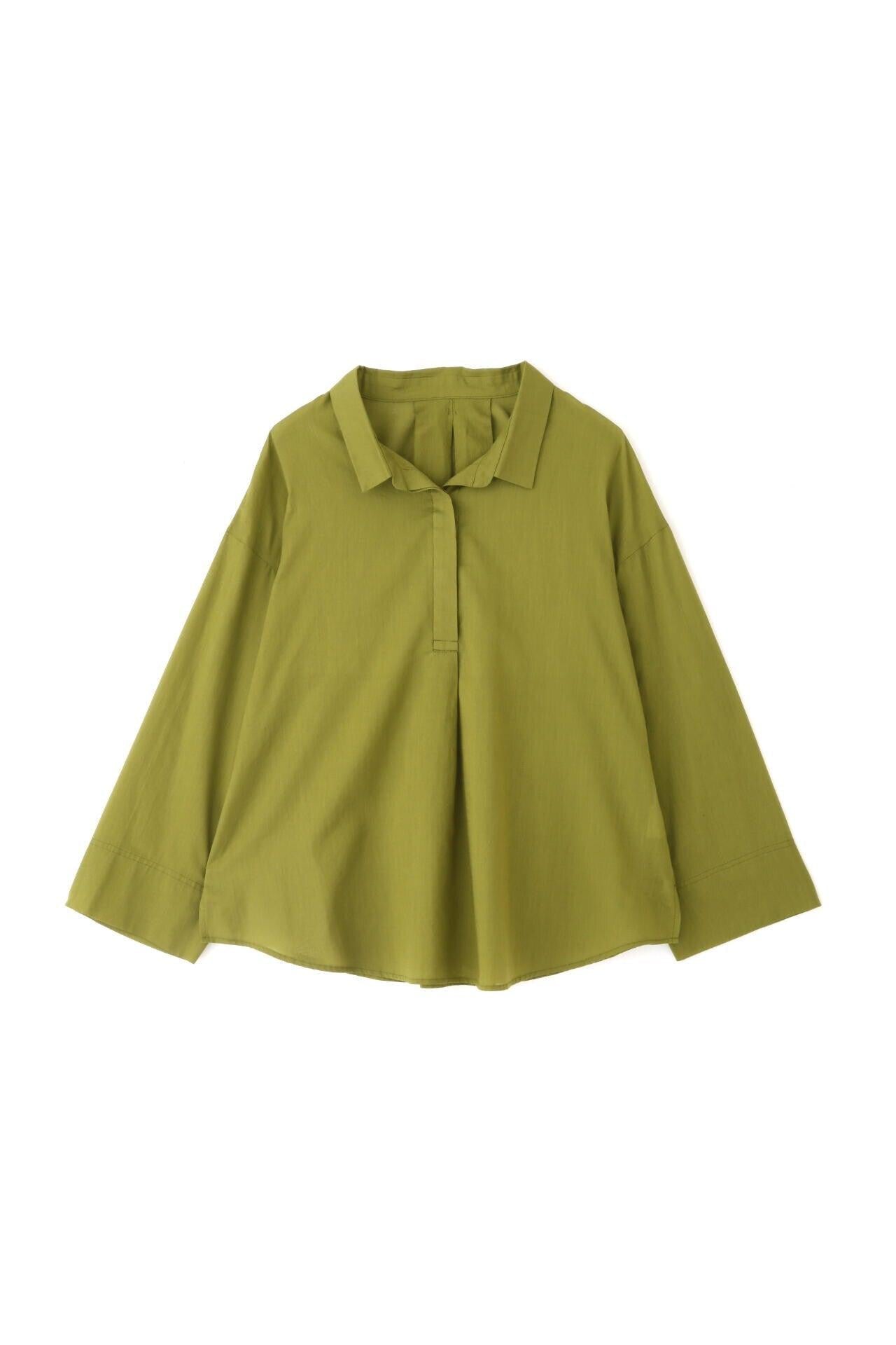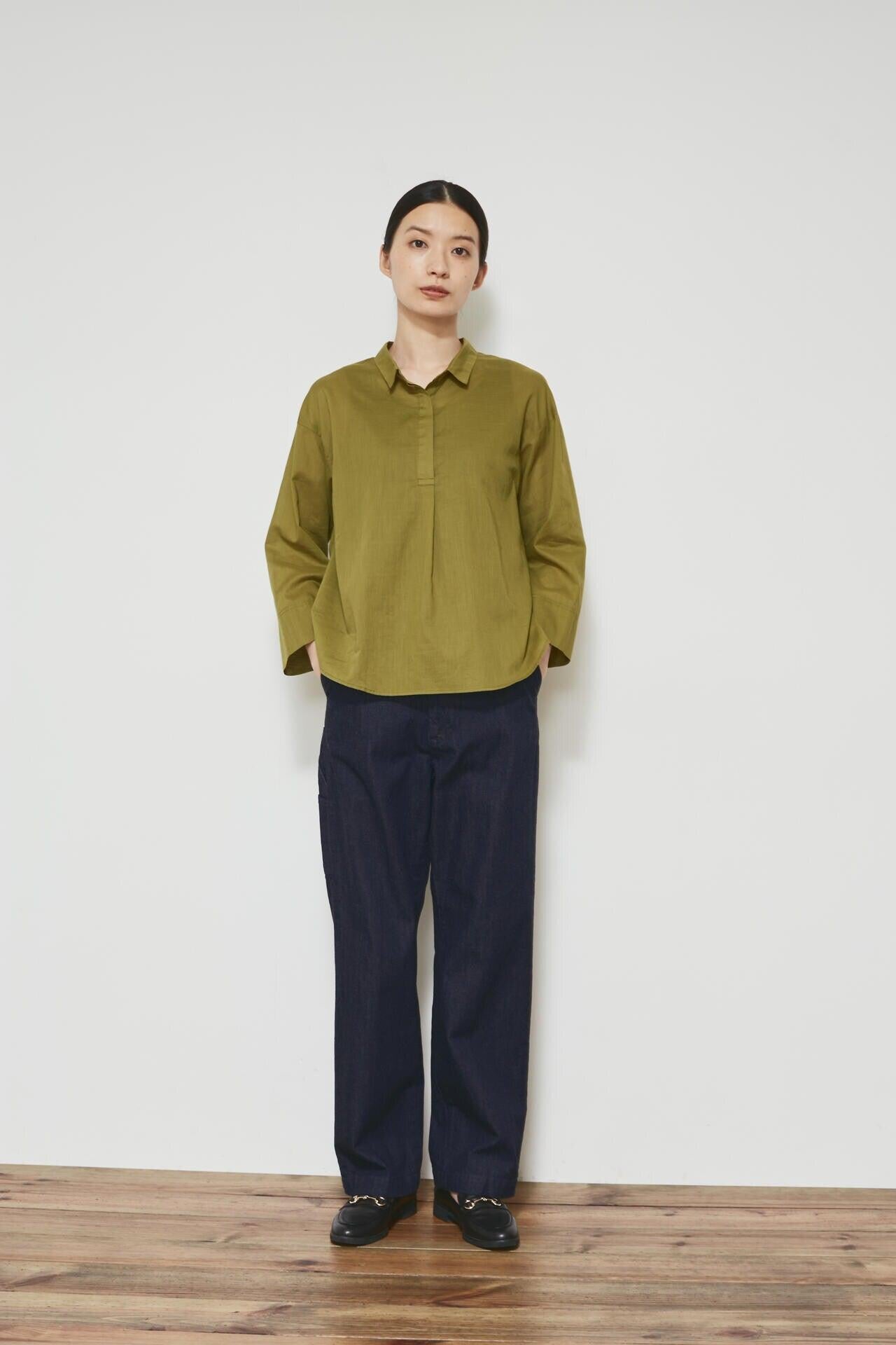 植物色系 Skipper 上衣 [設計要點] 稍微寬鬆的衣領和寬鬆的輪廓是設計的重點。袖口採用深翻處理,即使將袖子翻回也有細微差別。面料採用優質棉紗 80 支紗織成,並使用從香川縣昭島橄欖葉中提取的染料進行染色。長度和設計使其易於與任何下裝搭配。上衣的顏色非常醒目,非常適合搭配基本色的下裝。