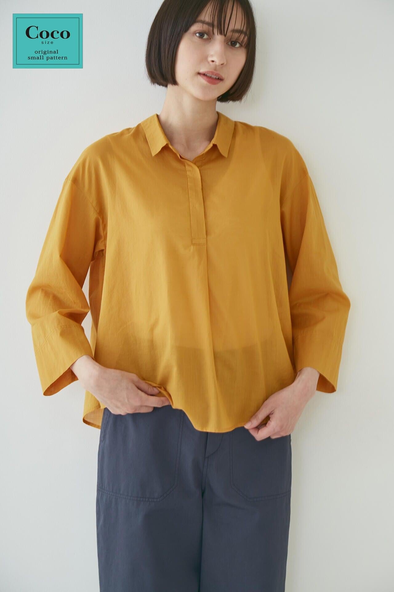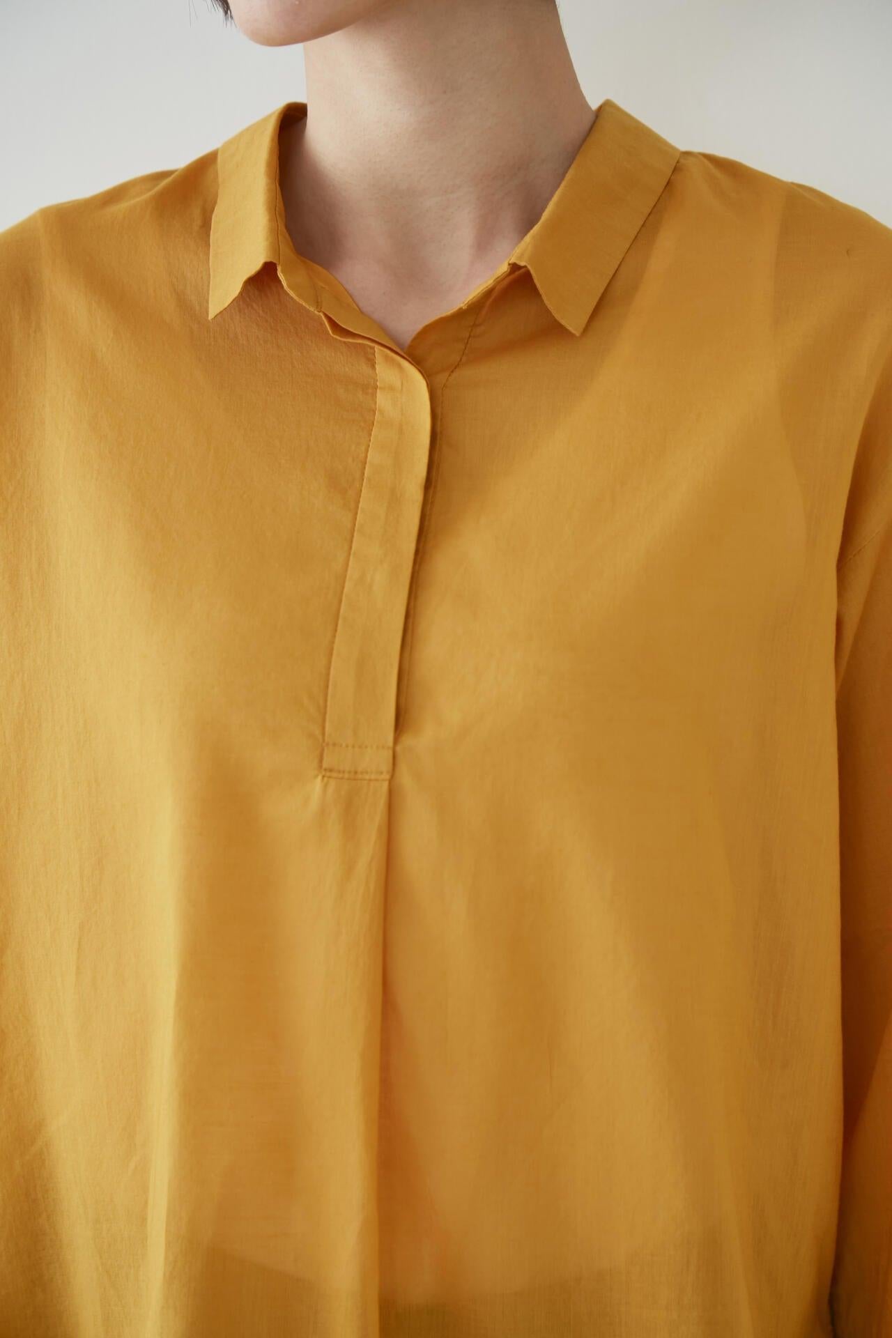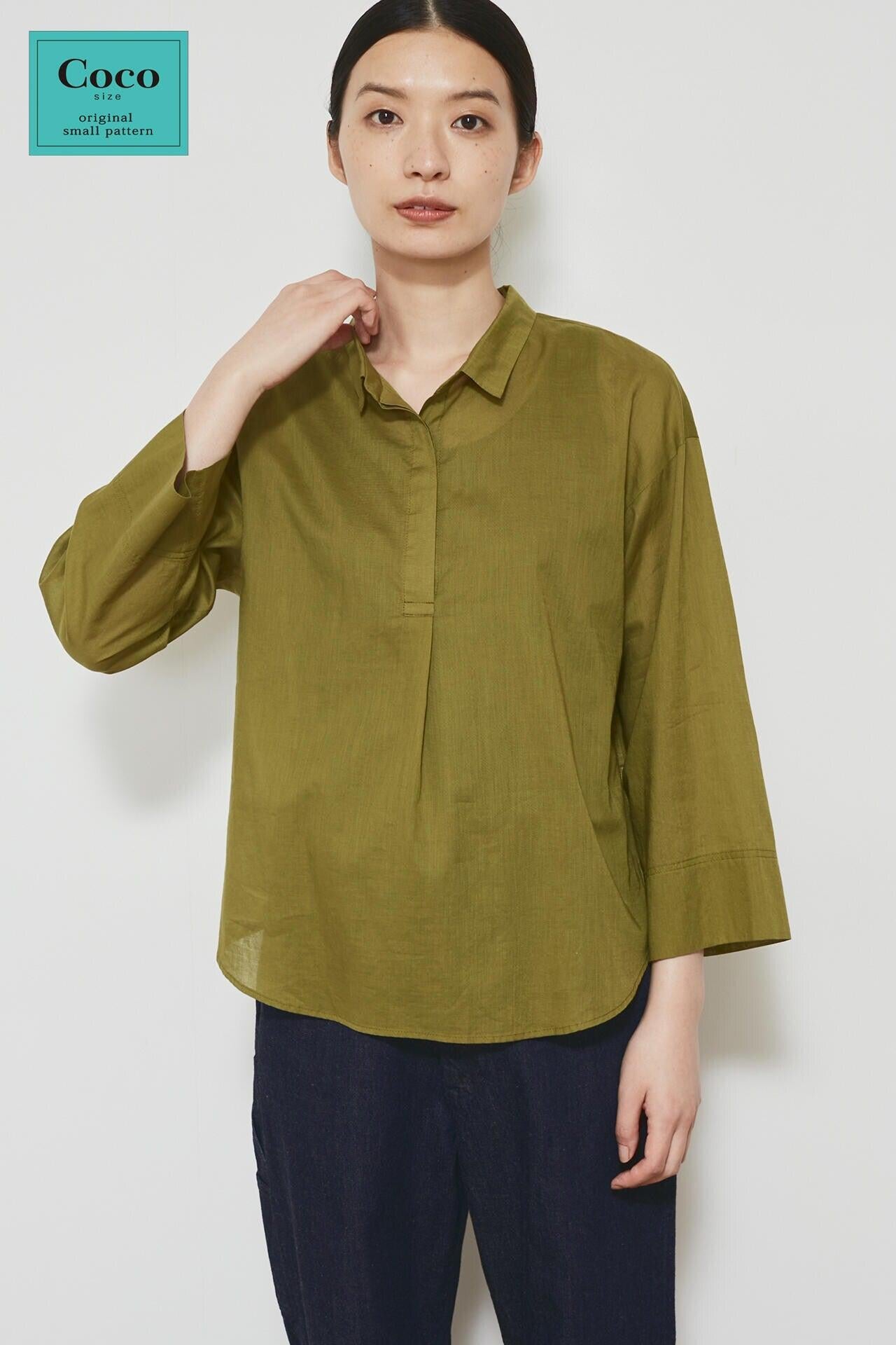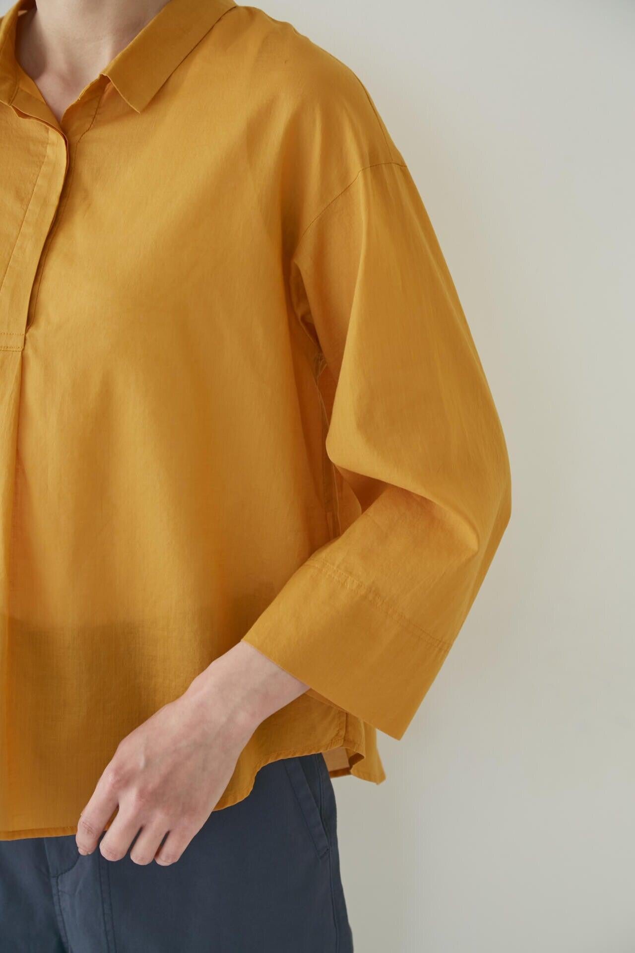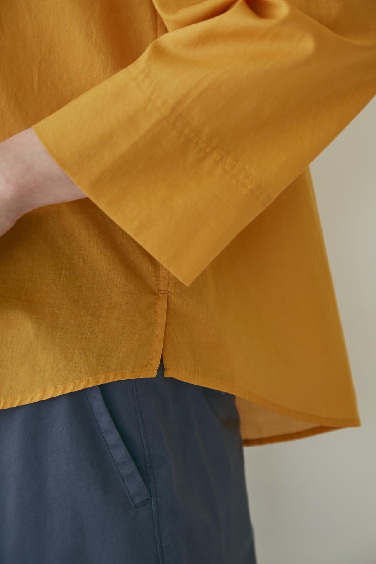 植物色系 Skipper 上衣 [設計要點] 稍微寬鬆的衣領和寬鬆的輪廓是設計的重點。袖口採用深翻處理,即使將袖子翻回也有細微差別。面料採用優質棉紗 80 支紗織成,並使用從香川縣昭島橄欖葉中提取的染料進行染色。長度和設計使其易於與任何下裝搭配。上衣的顏色非常醒目,非常適合搭配基本色的下裝。