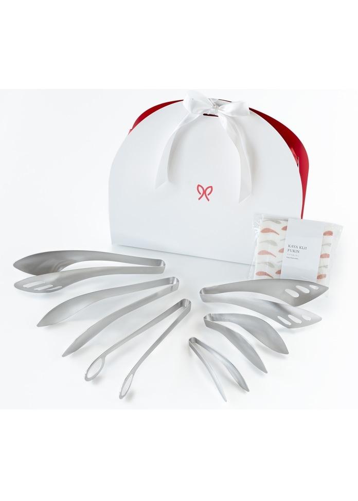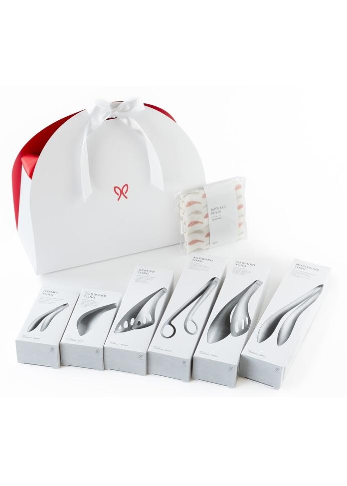 產品尺寸:Toriwake 夾鉗/長約 14.7 厘米 x 高約 4.5 厘米,Moritsuke 夾鉗/長約 25 厘米 x 高約 3.8 厘米,Yubisaki 服務器夾鉗/長約 21 厘米 x 高約 5.2 厘米,Agedashi 夾鉗/長約 23 厘米 x 高約 4 厘米,Gashiri 夾鉗(也可舀醬汁)/長約 25.7 厘米 x 高約 4.5 厘米。25.7 厘米長 x 4.9 厘米高,米飯鉗/約 13.5 厘米長 x 2.5 厘米高,Kaya 織物洗碗巾/約 30 x 30 厘米,