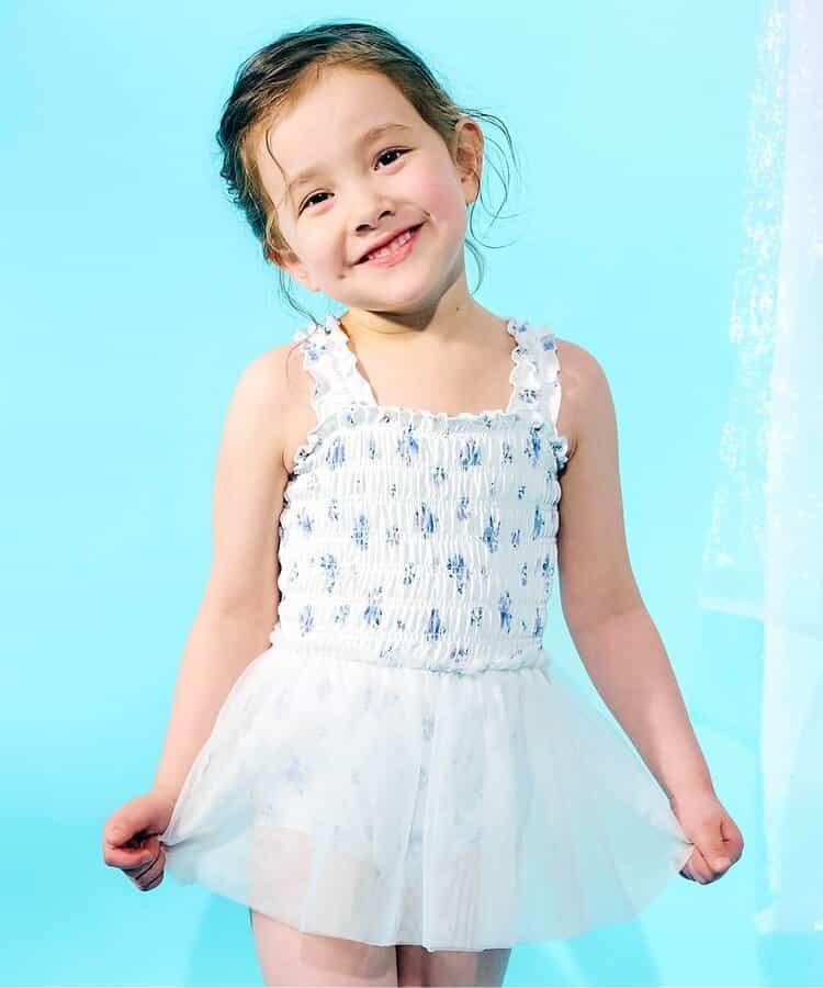 腰間薄紗設計的泳裝是眾人矚目的焦點。