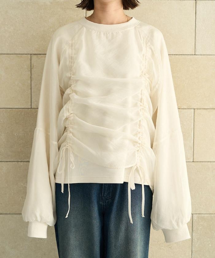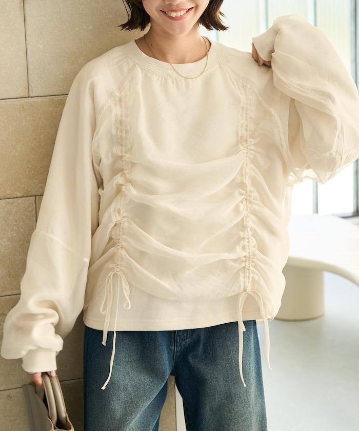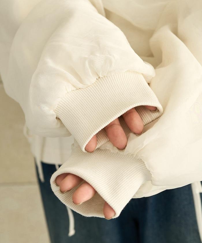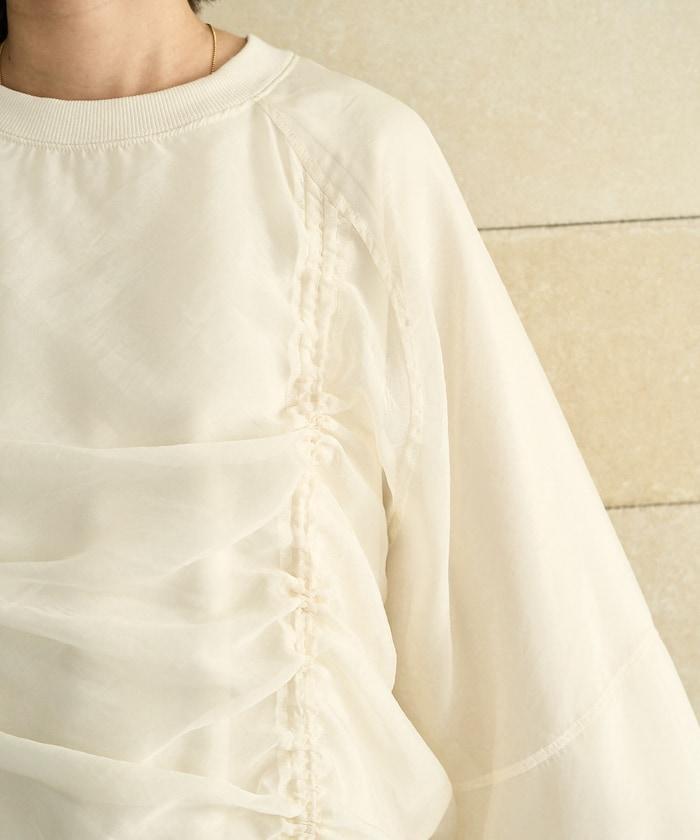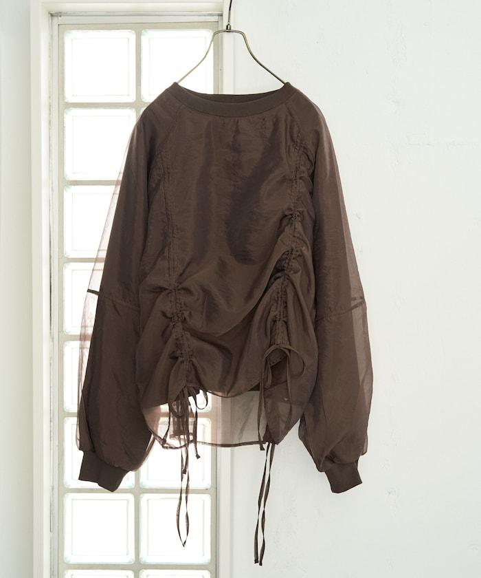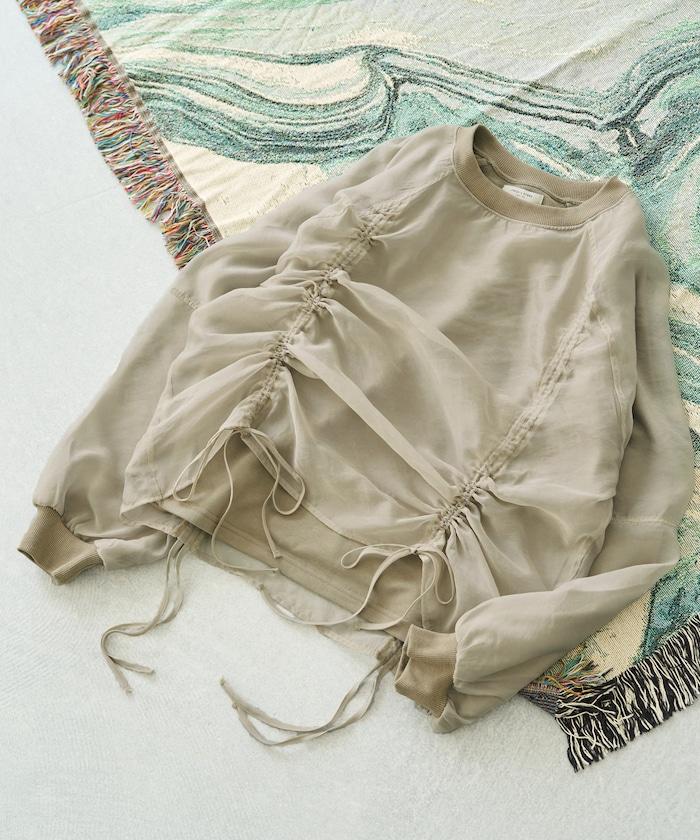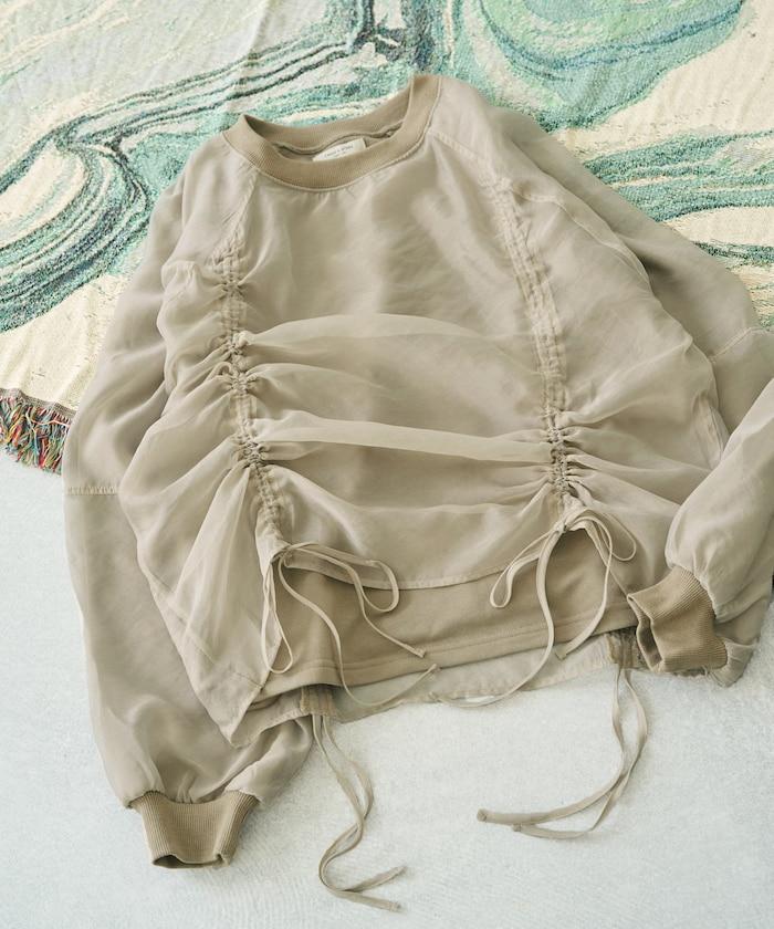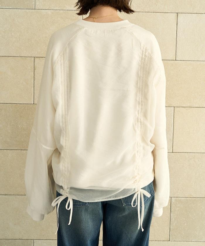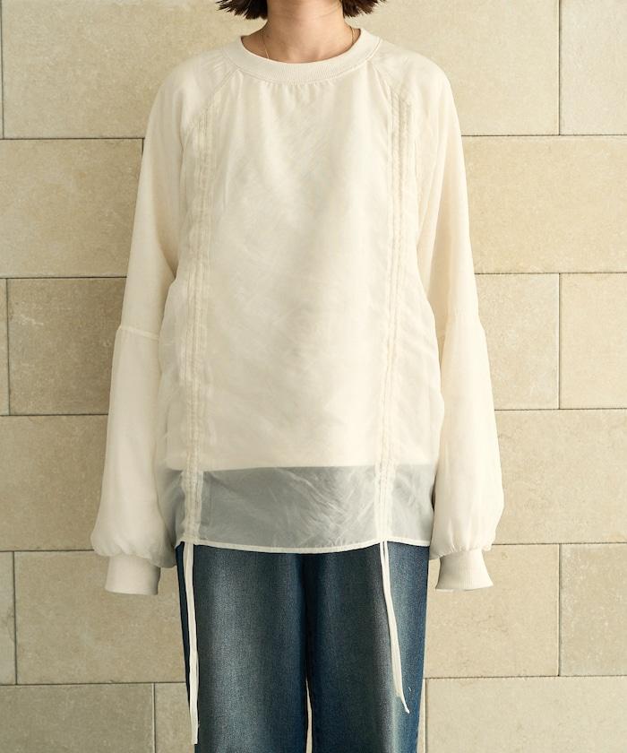 這款套頭衫採用透明歐根紗層疊設計,皺褶的褶皺賦予其立體感,單穿也很好看!
