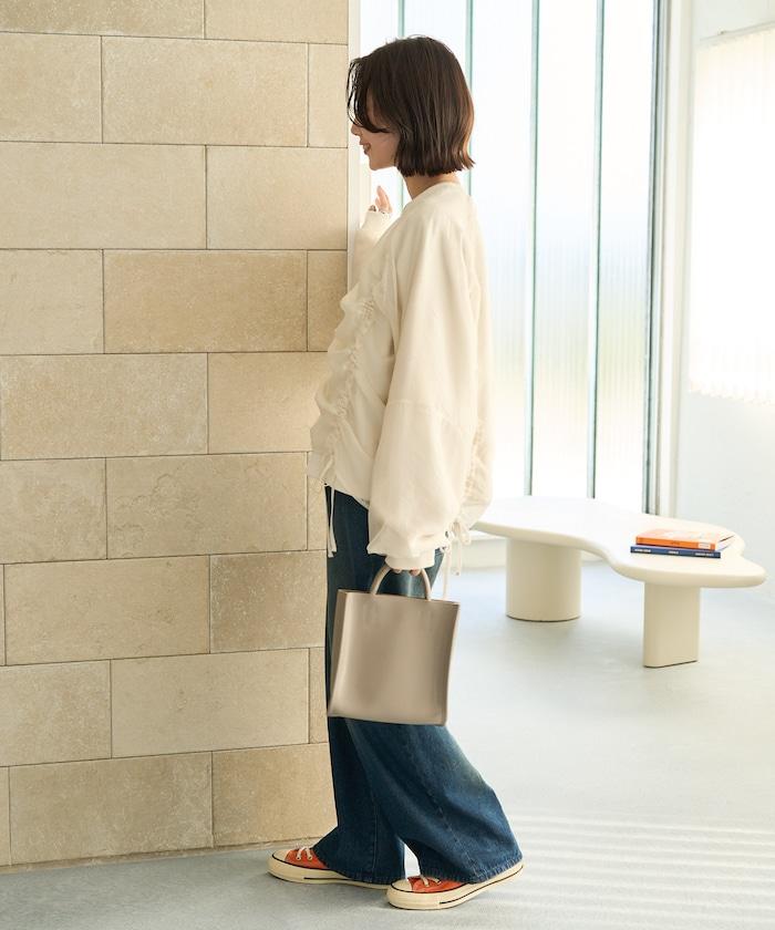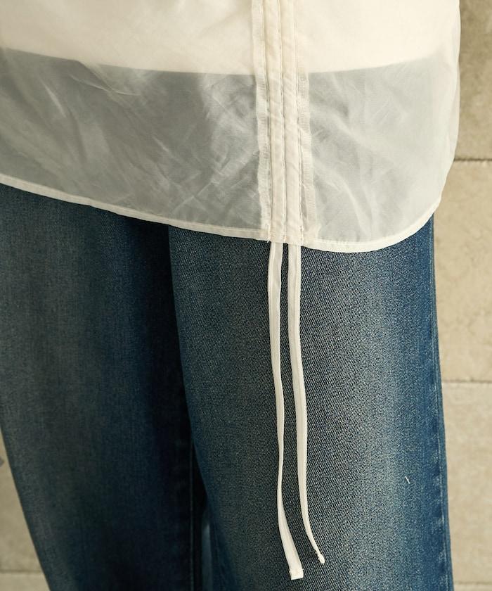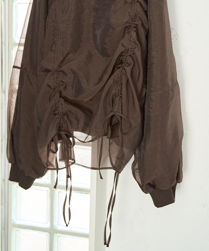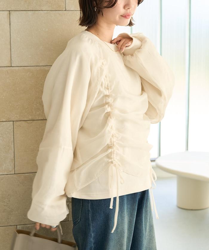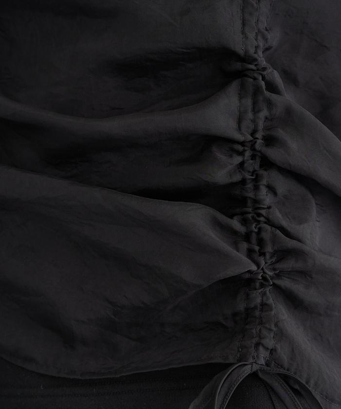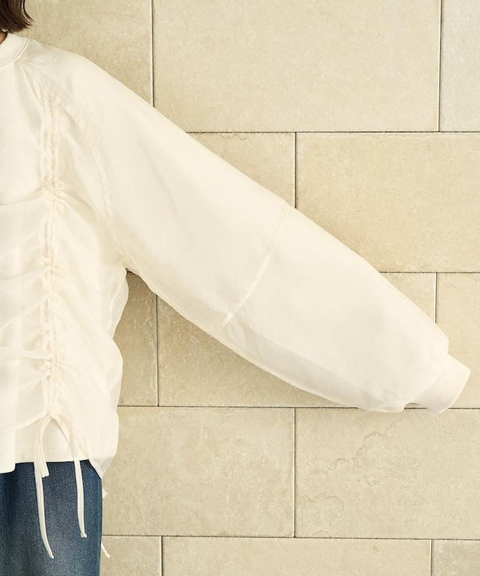 前後抽繩設計使衣服呈現出聚攏的皺褶輪廓,富有立體感。