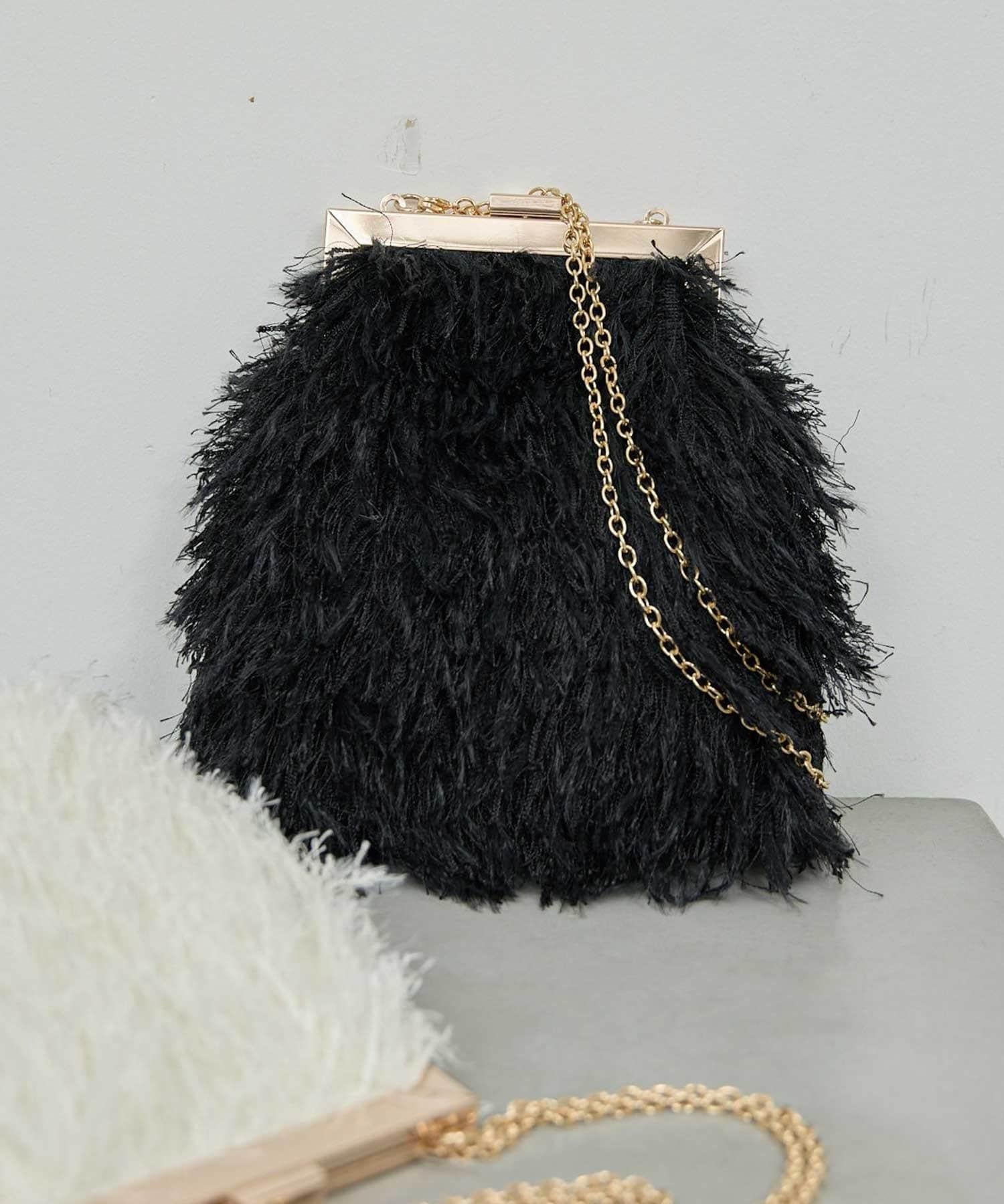 這款鏈條肩絨毛包採用奢華的絨毛材料製成,絨毛很長。
