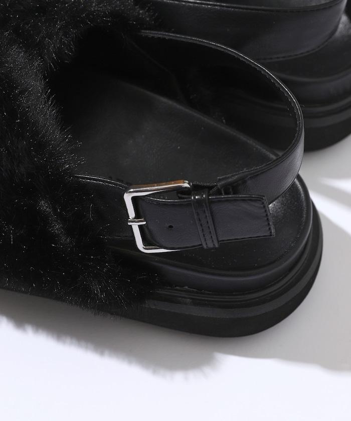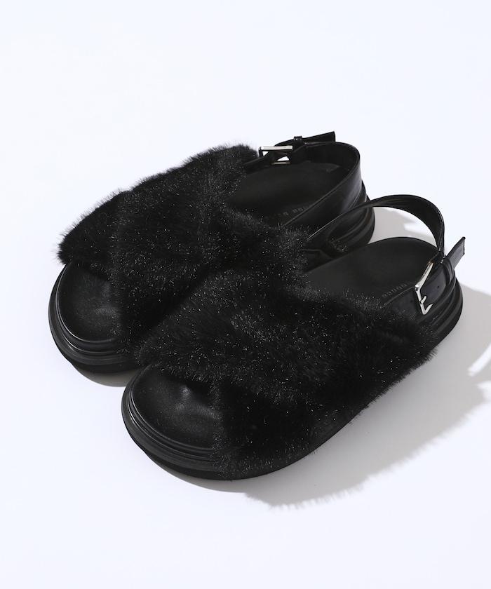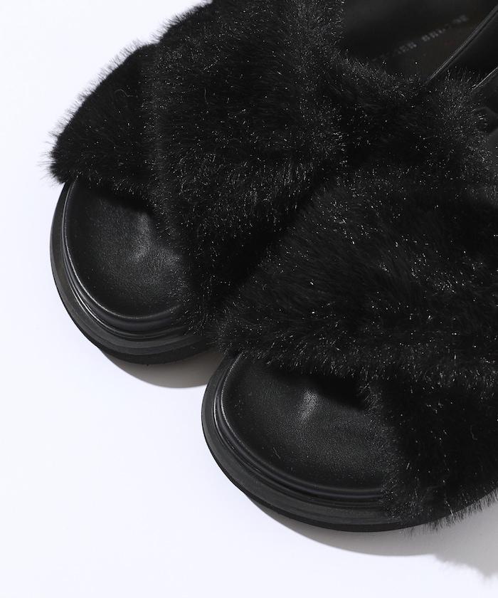 仿皮草涼鞋,交叉設計增加了腳部的體積感。
