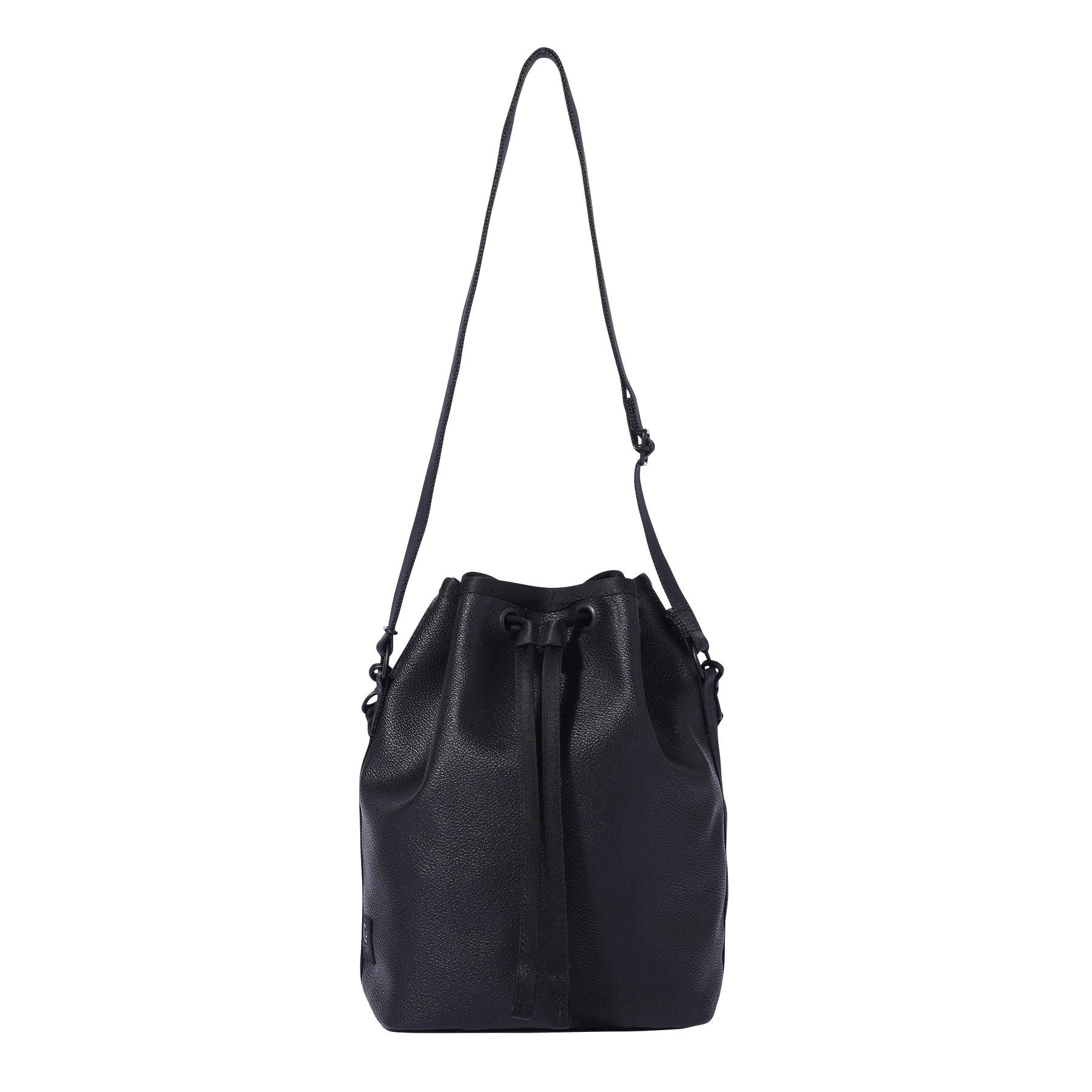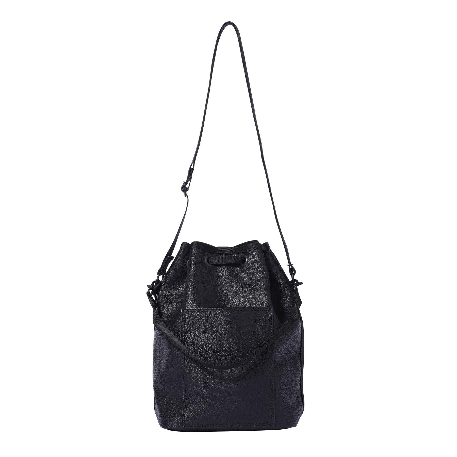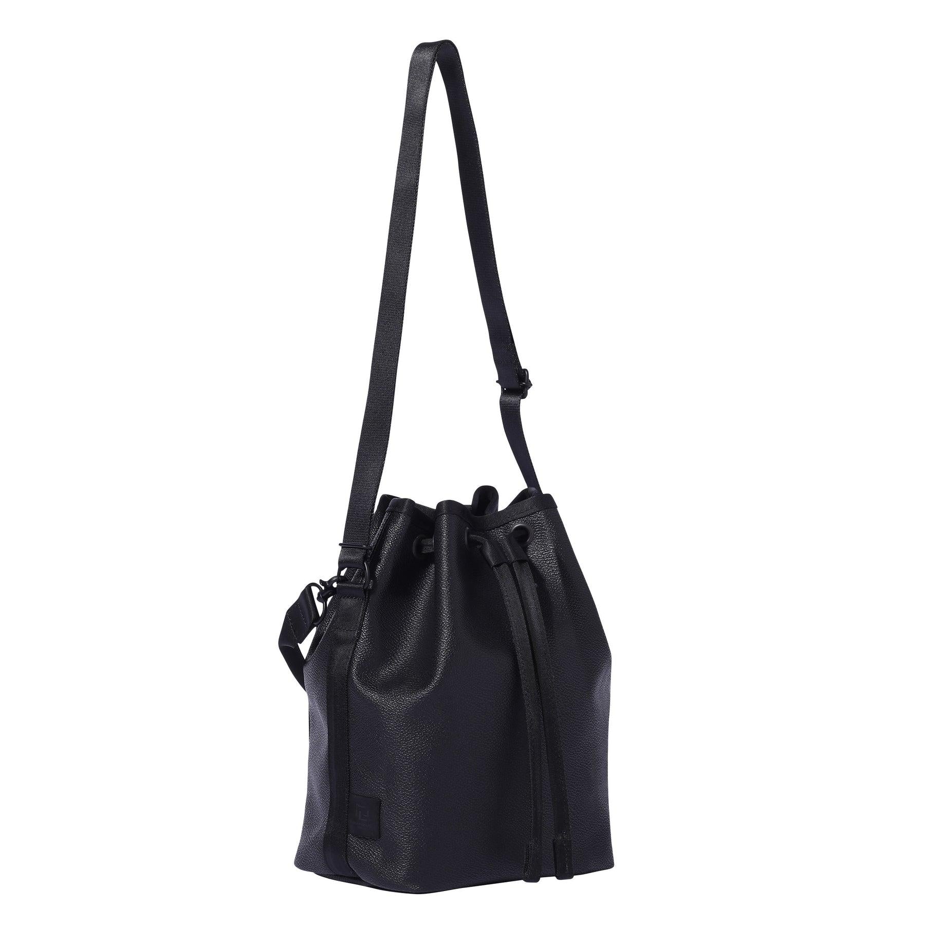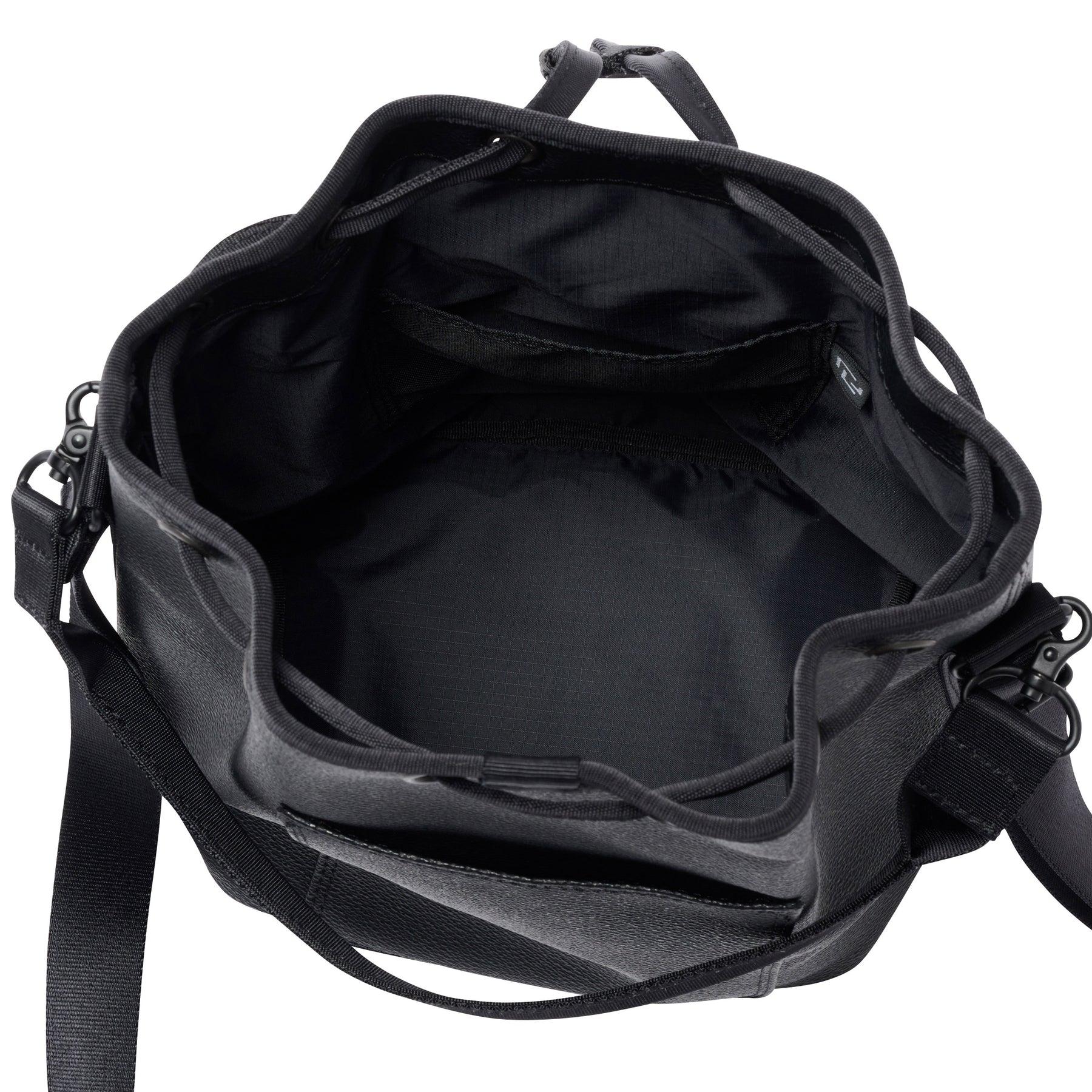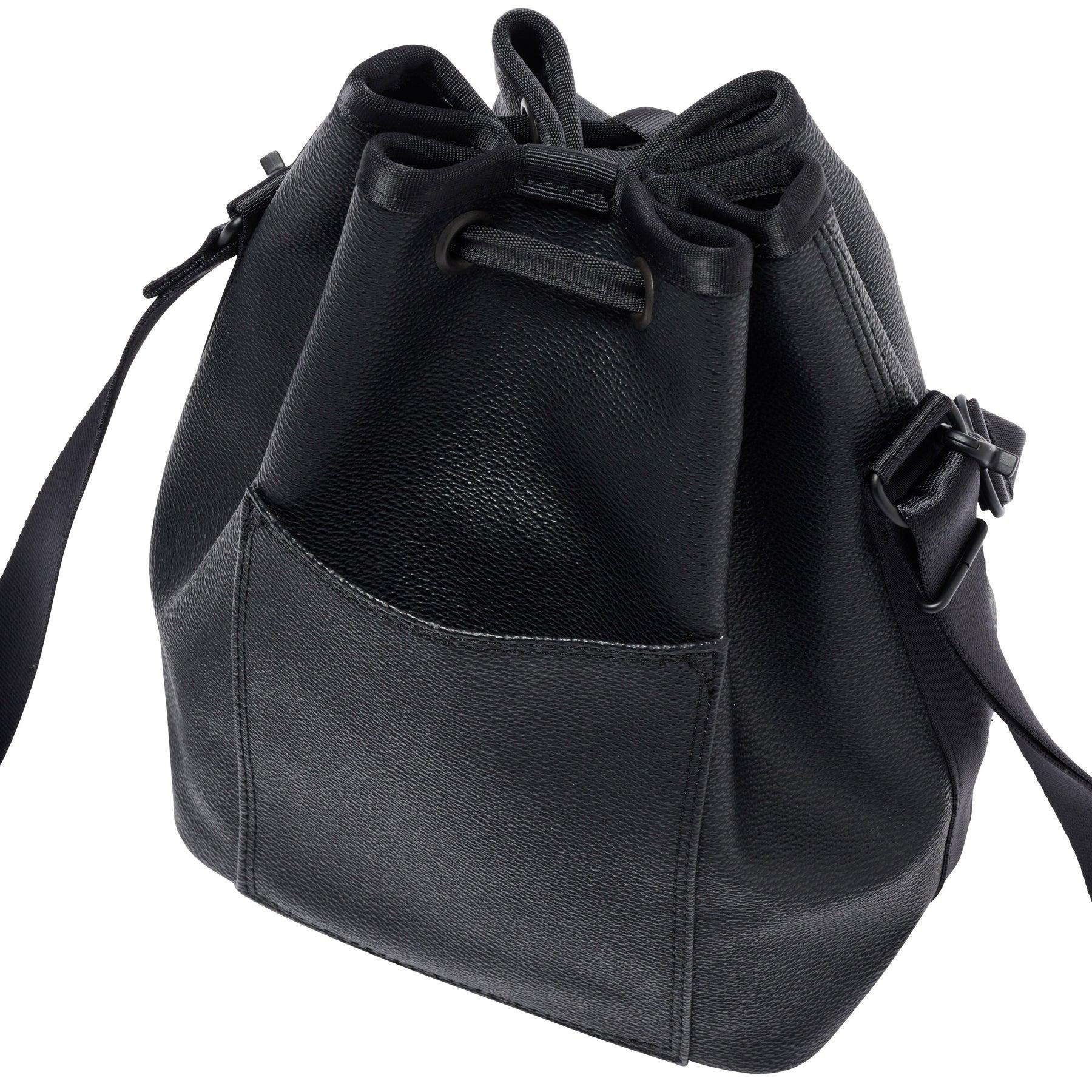 這款雙向包帶有抽繩圖案,可通過手帶手提,也可通過可調節肩帶斜背。背面配有一個插袋,用於存放手機。包身由 PVC 織物製成,表面有粒麵皮革風格的壓花處理。該系列雖然外觀奢華,但重量輕,易於攜帶。